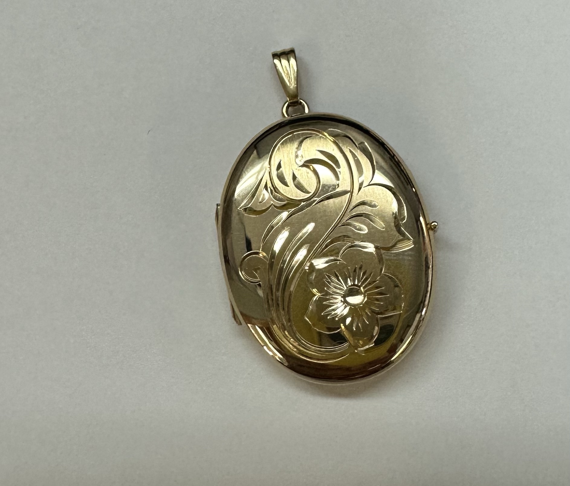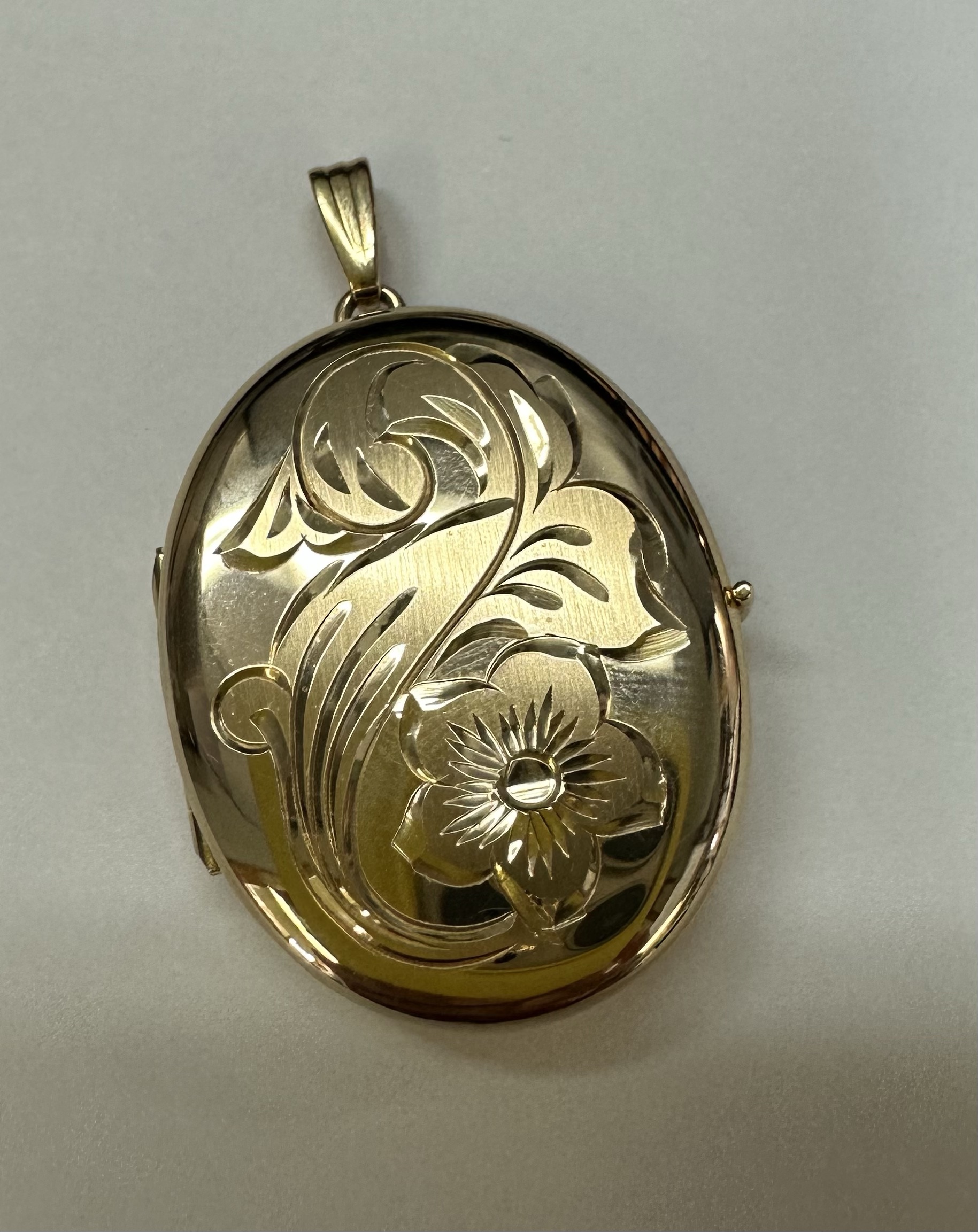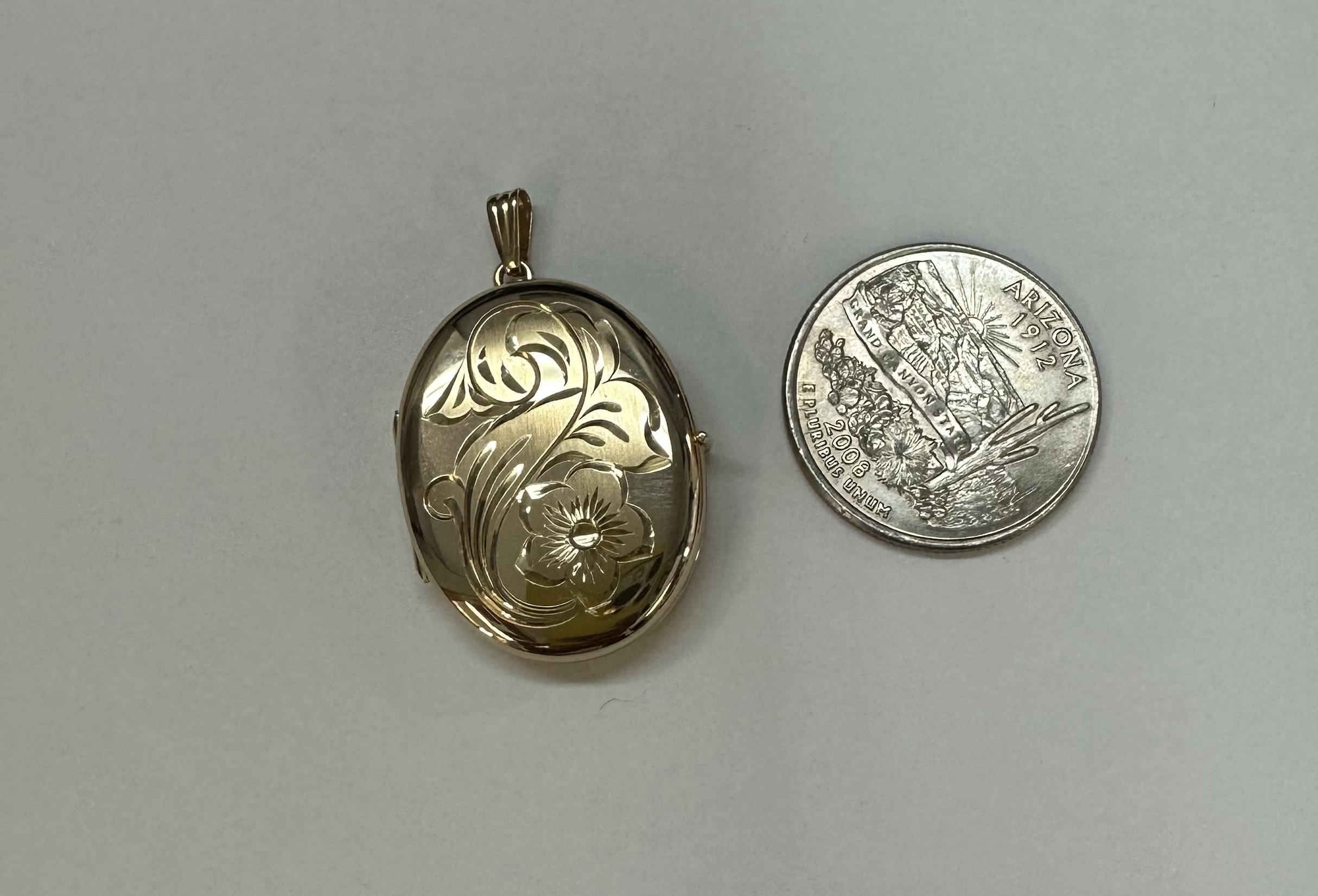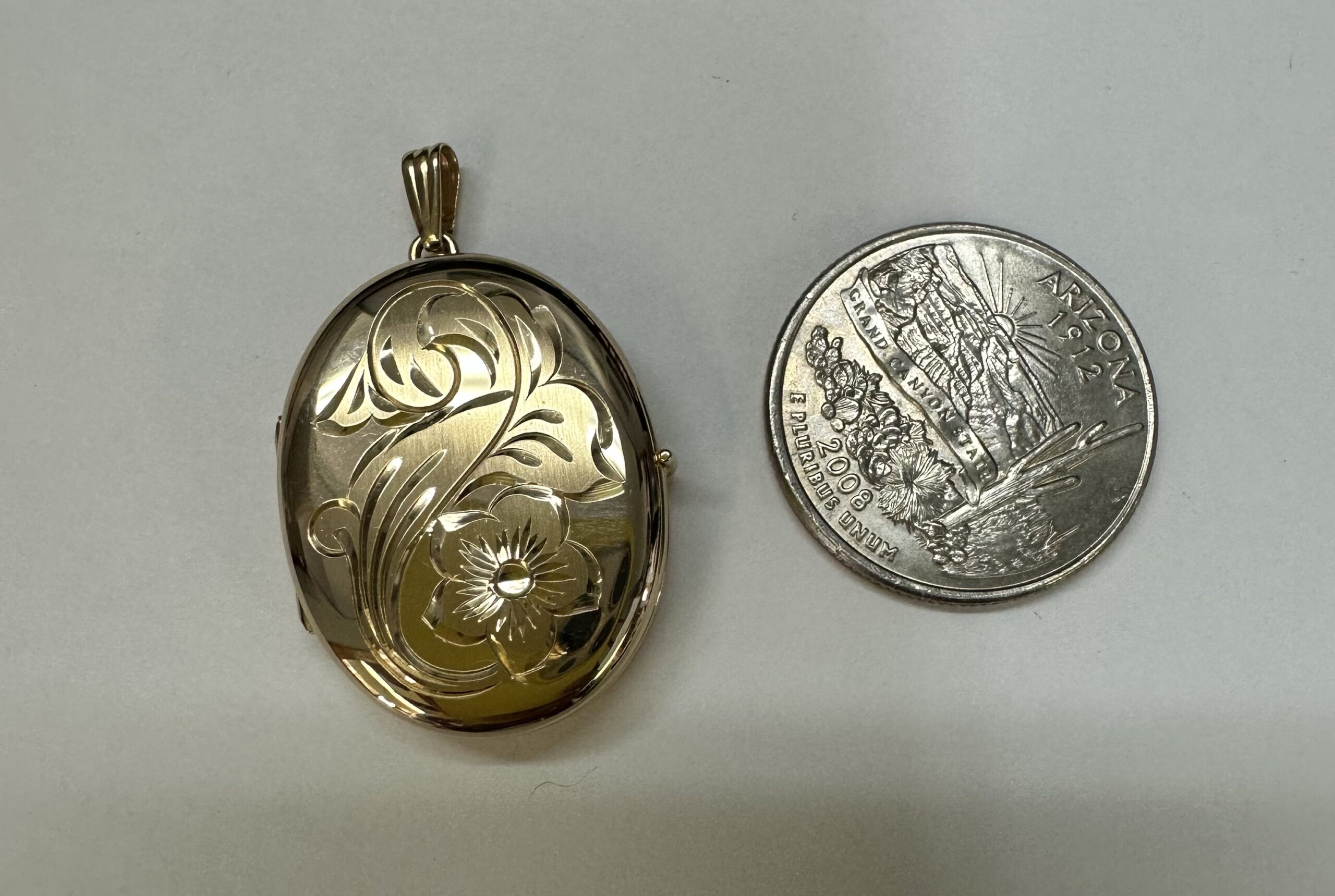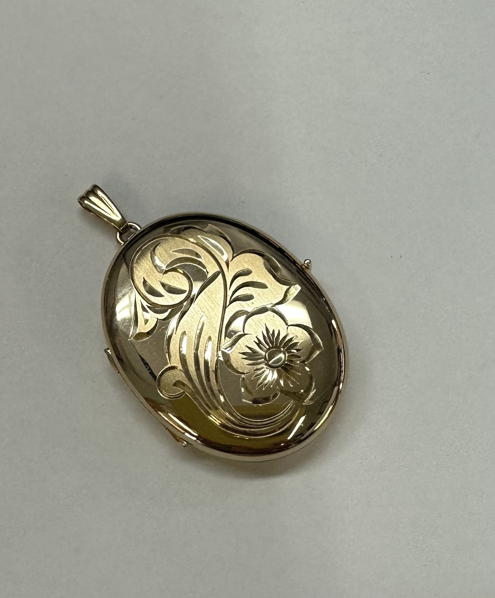 Antique one-of-a-kind 14k yellow gold oval shaped 9 picture locket, with floral motif engraving on the front. This locket has an entire weight of 8.3 grams. This locket measures 1 1/2” in length and just under 2” in width.