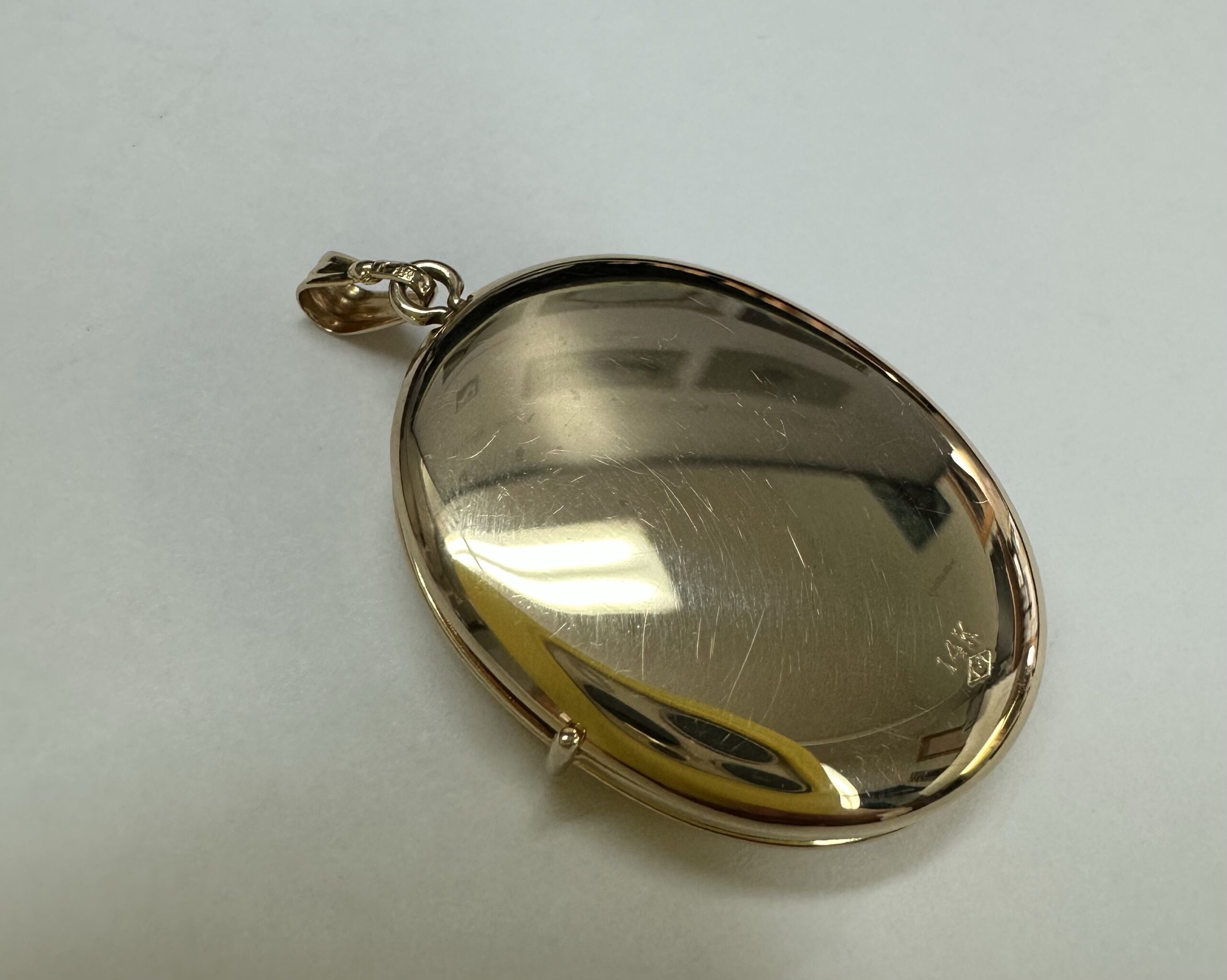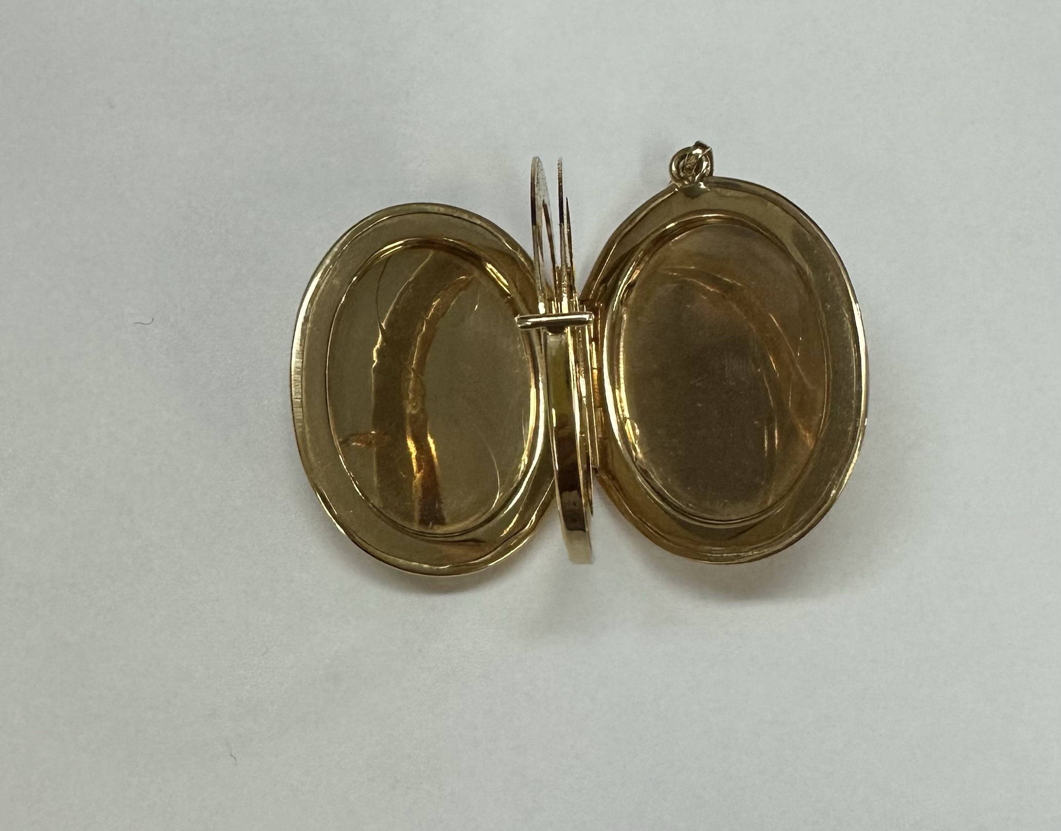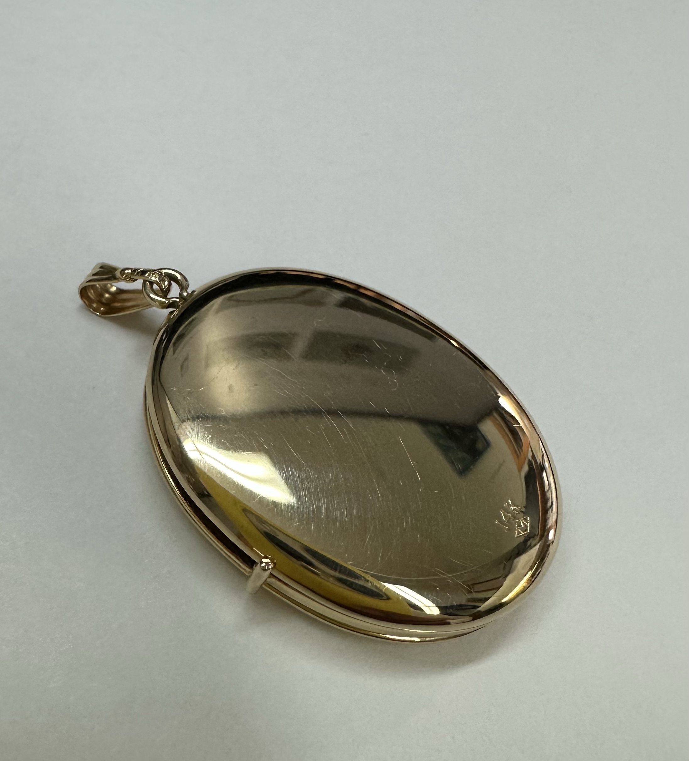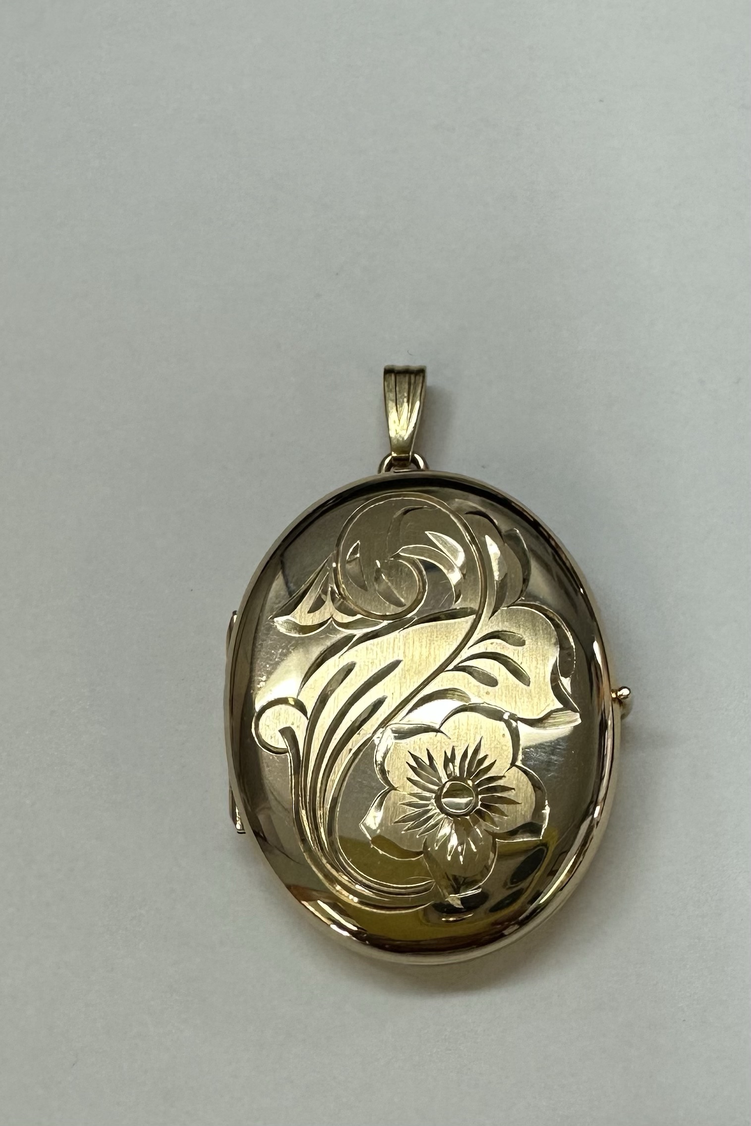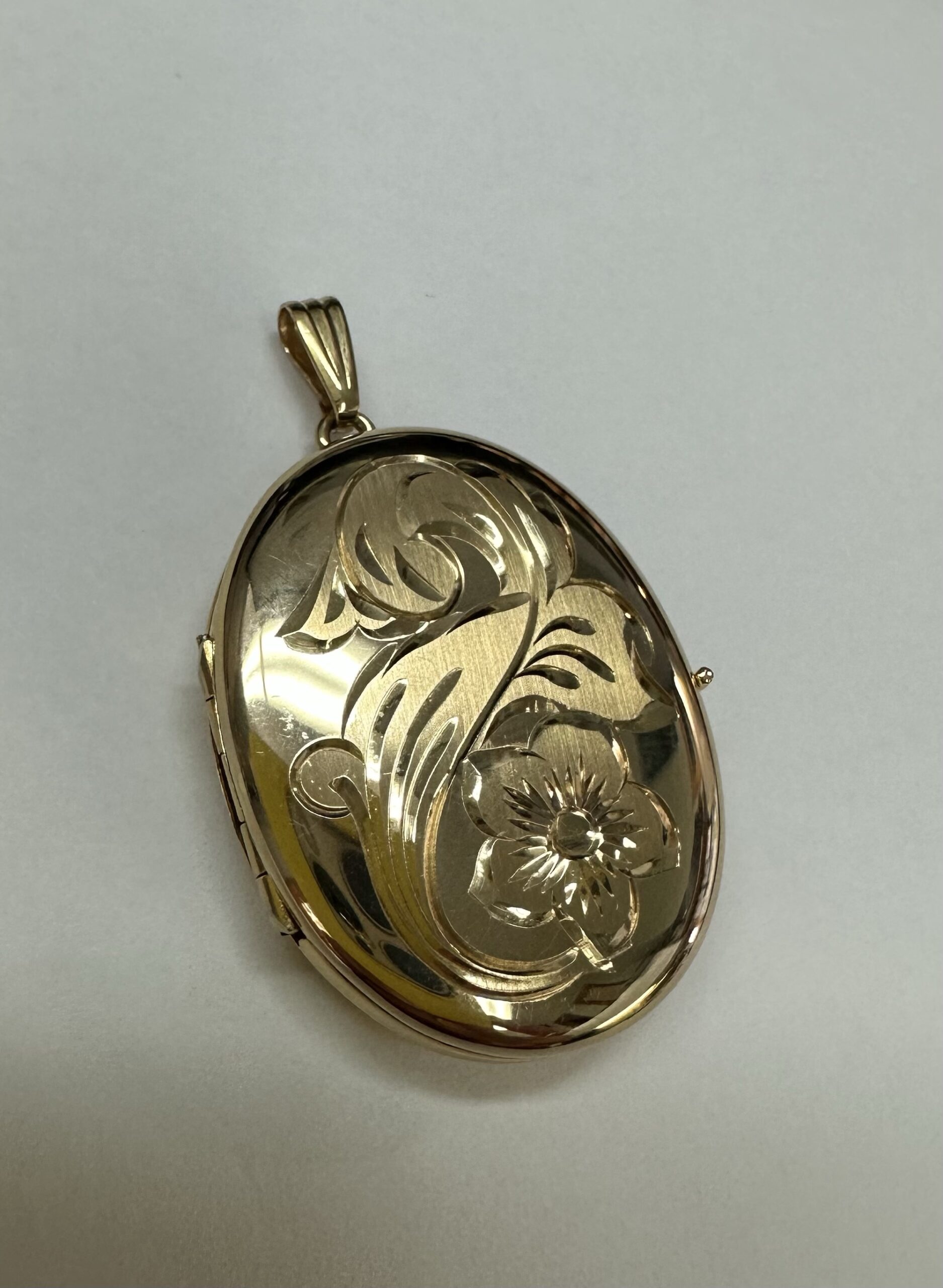 Antique one-of-a-kind 14k yellow gold oval shaped 9 picture locket, with floral motif engraving on the front. This locket has an entire weight of 8.3 grams. This locket measures 1 1/2” in length and just under 2” in width.