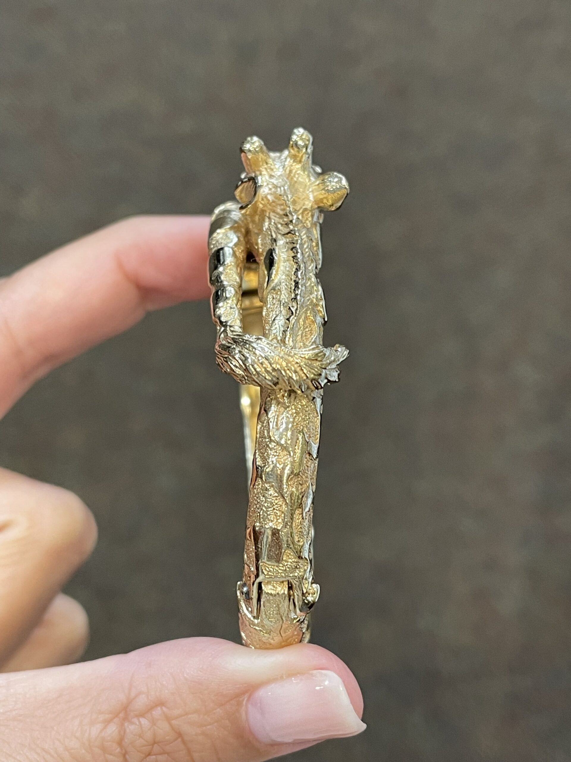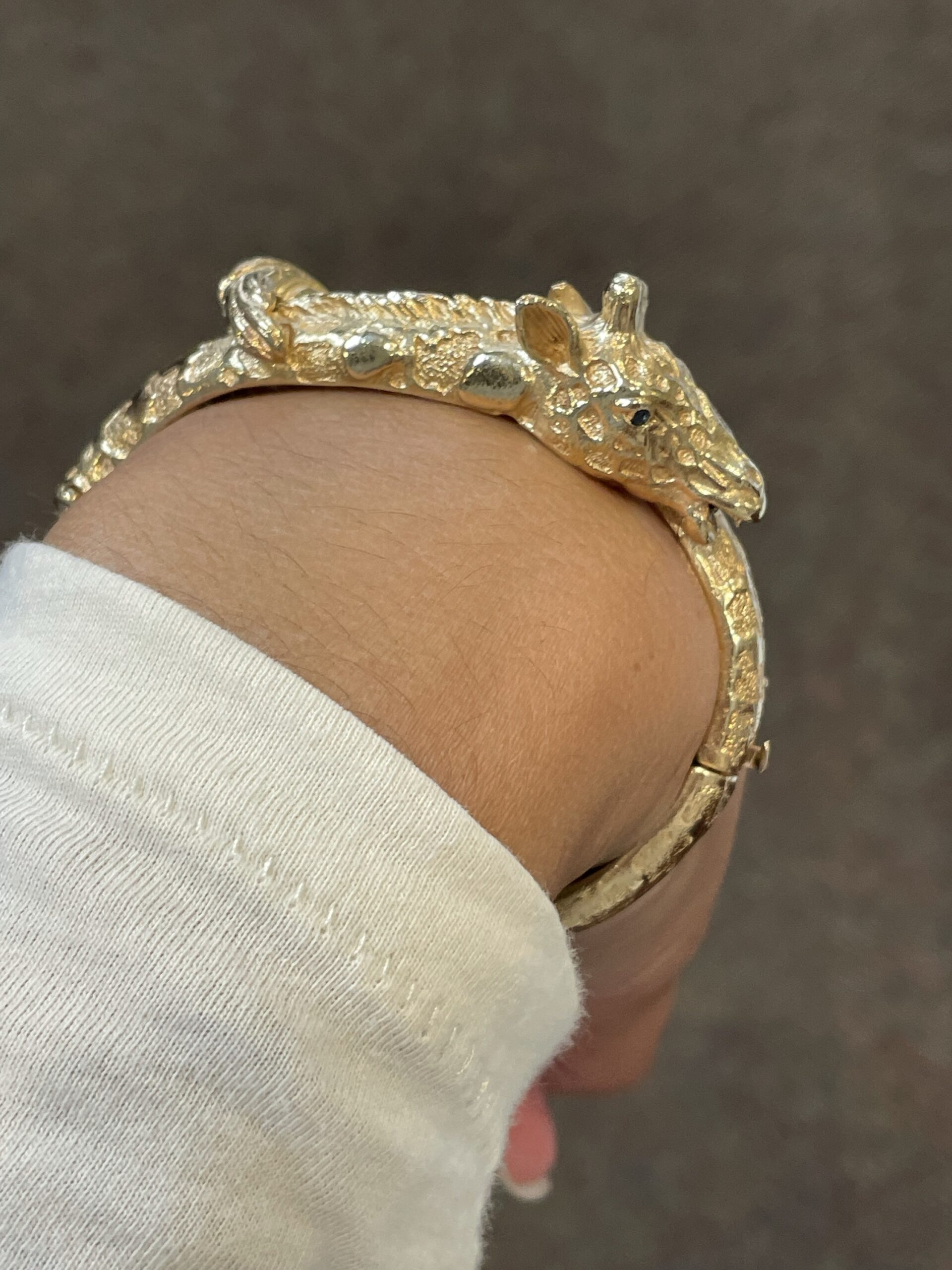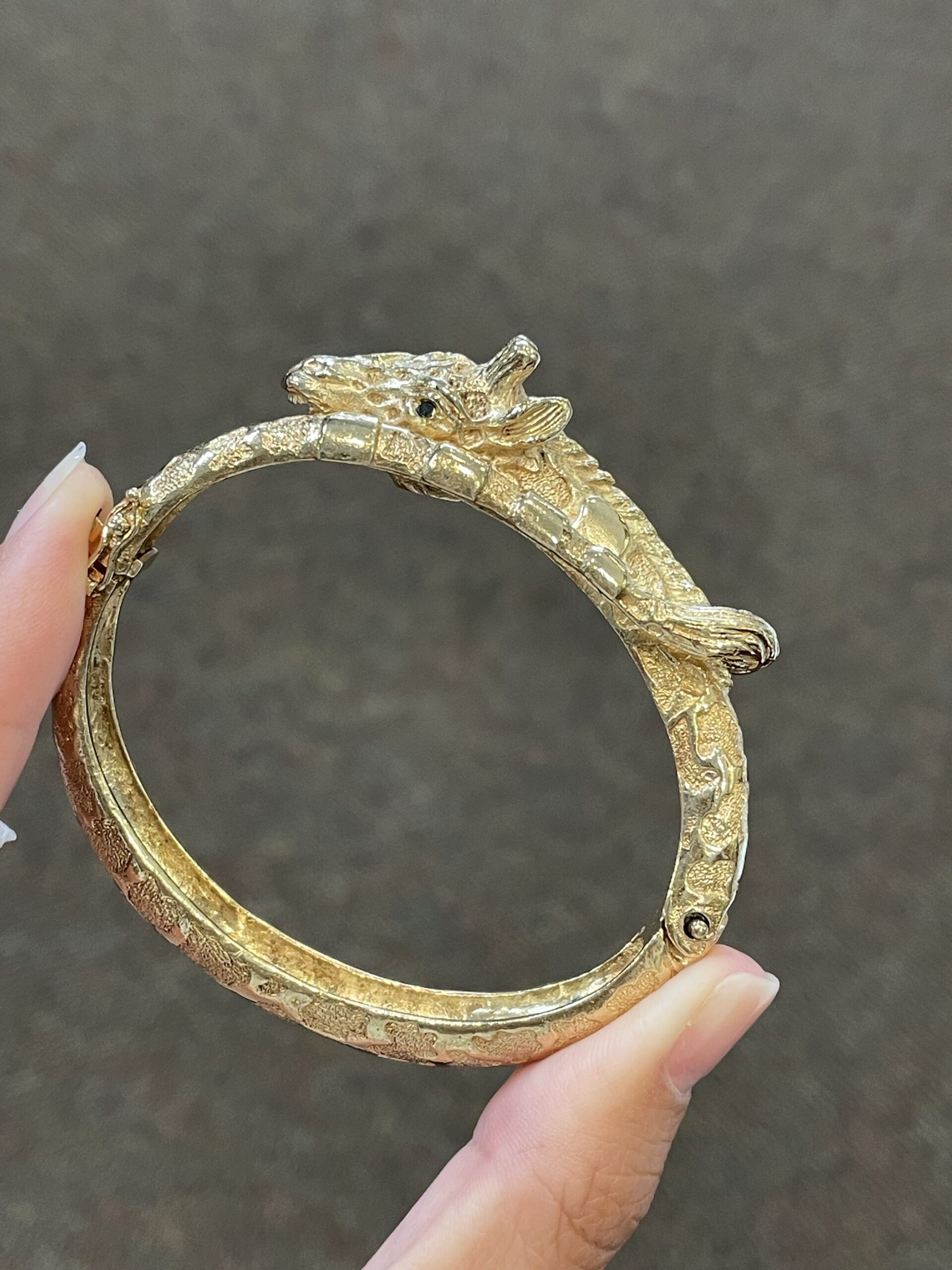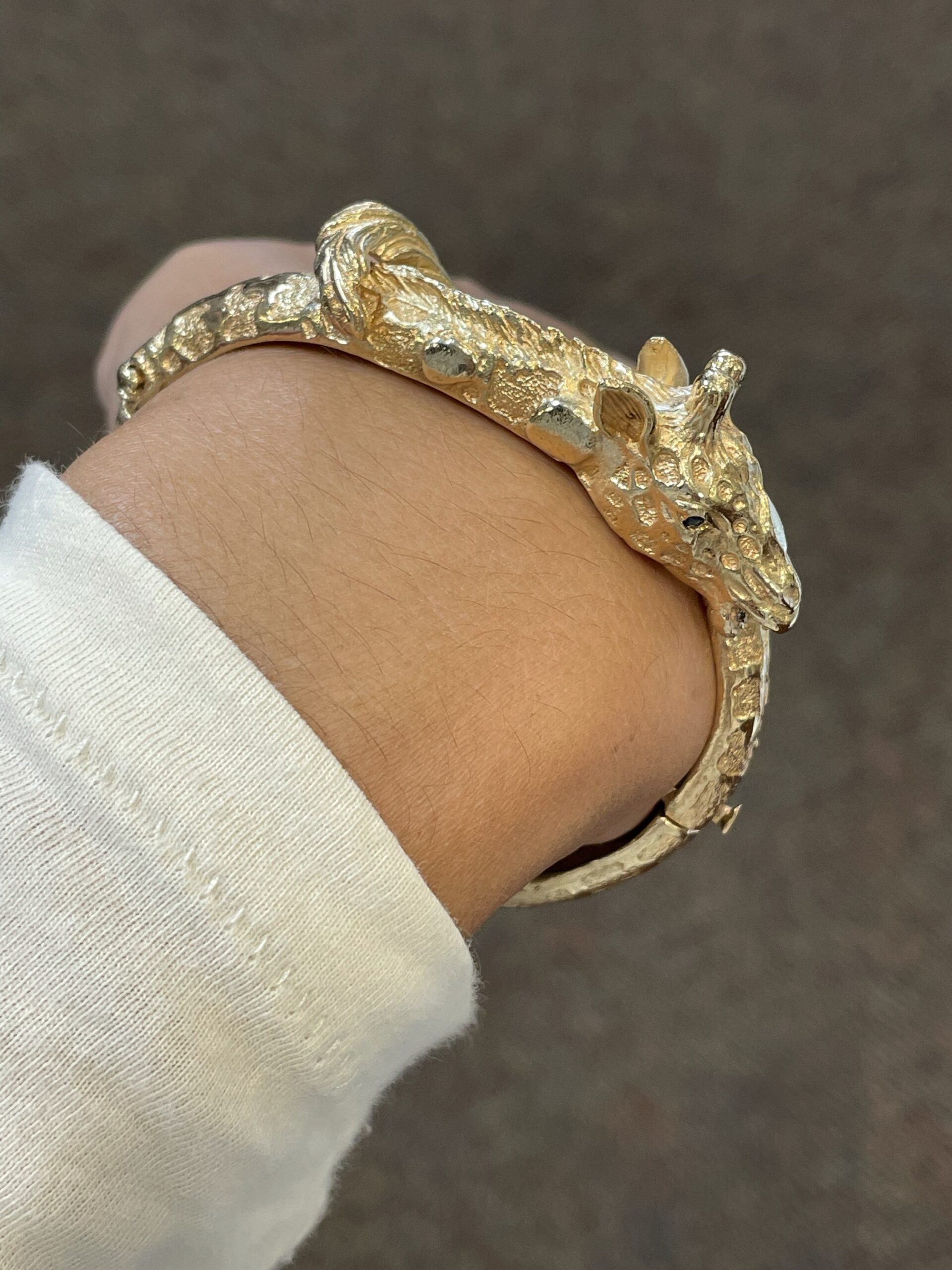 Antique 14k yellow gold oval shaped, hinged, carved Giraffe bangle bracelet. This bracelet weighs a whopping 53.8 grams. The realistic retail of this weight should be $6,000!