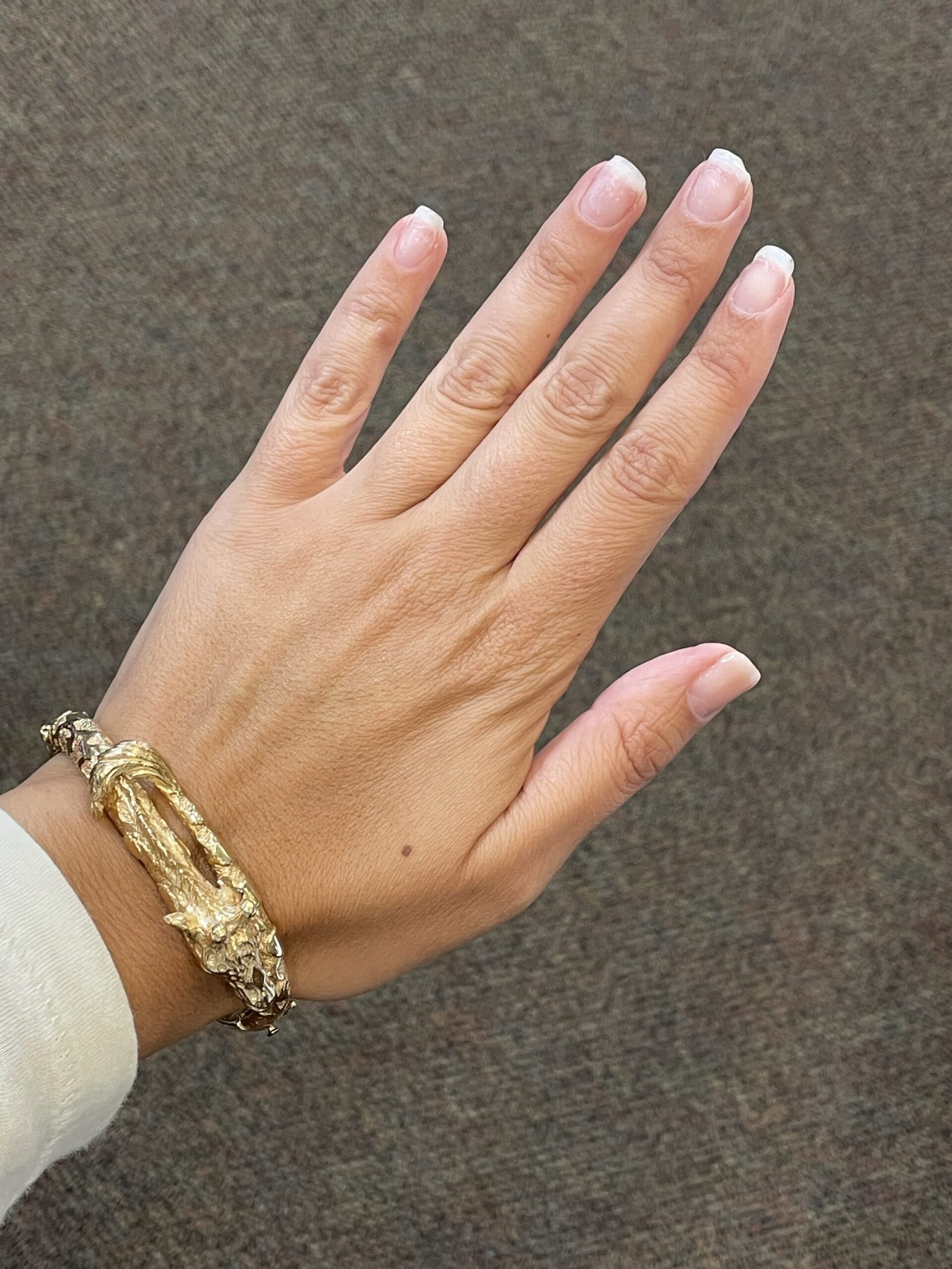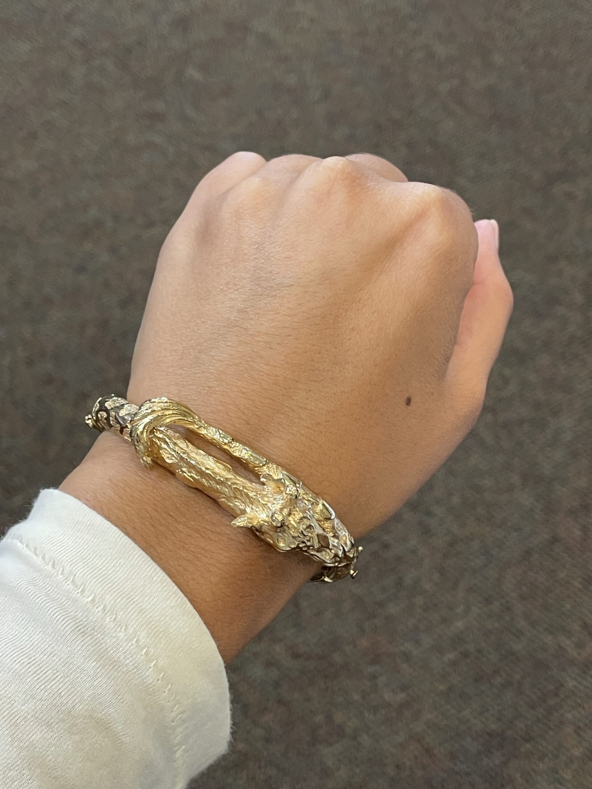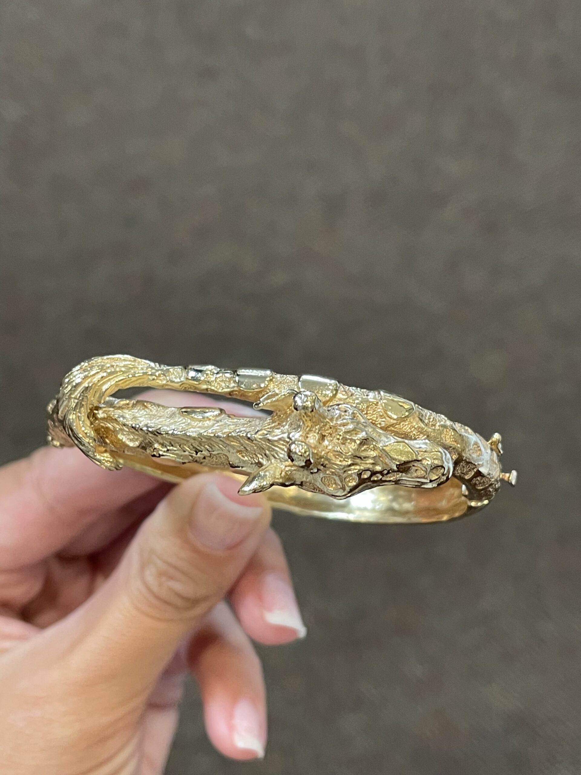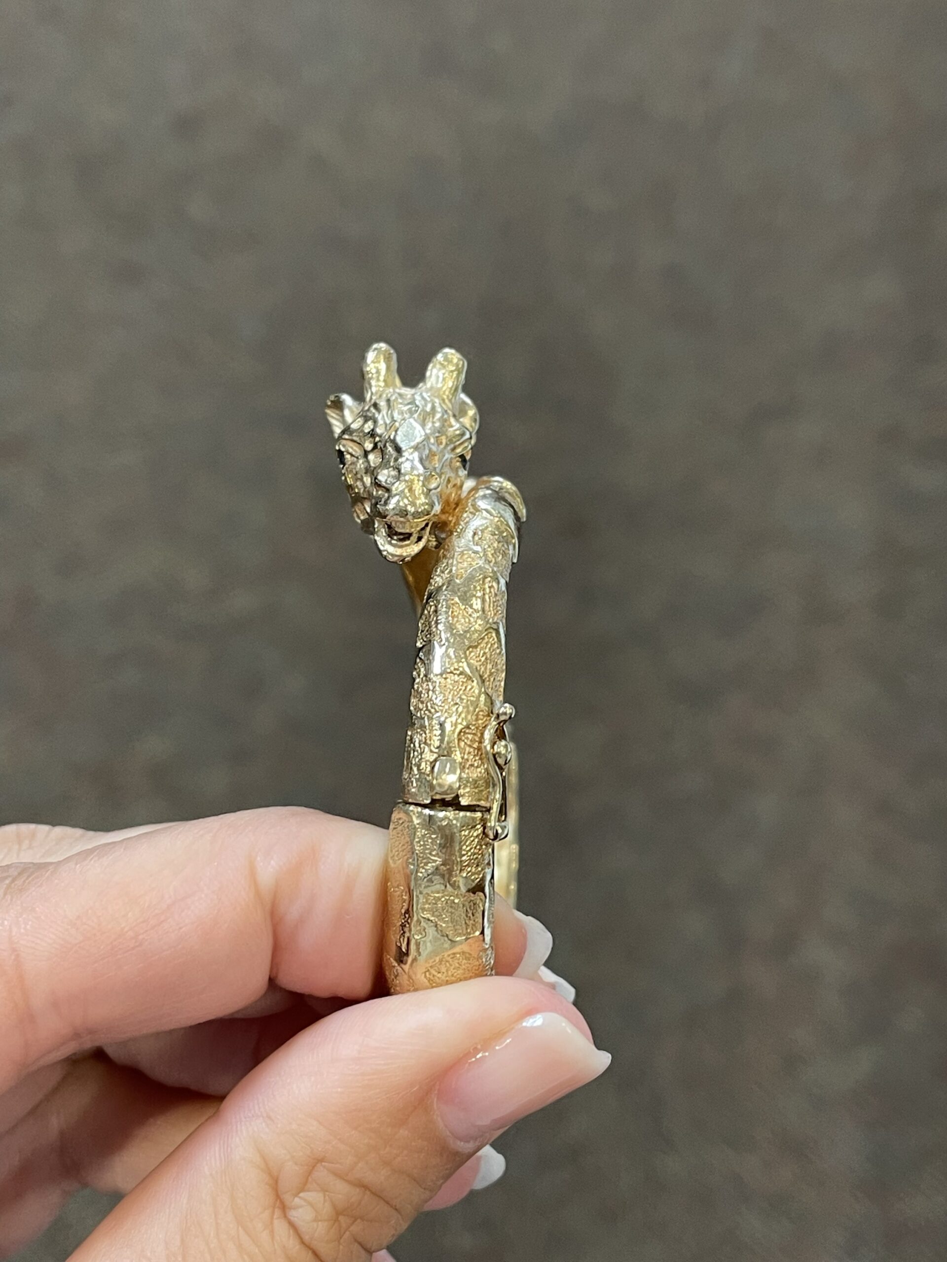 Antique 14k yellow gold oval shaped, hinged, carved Giraffe bangle bracelet. This bracelet weighs a whopping 53.8 grams. The realistic retail of this weight should be $6,000!