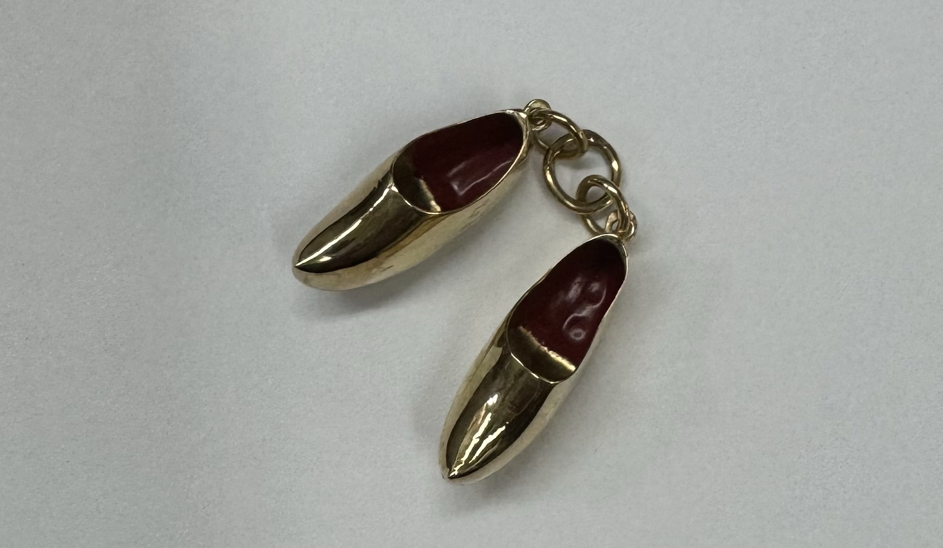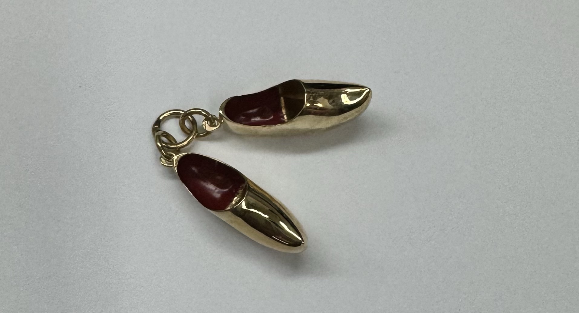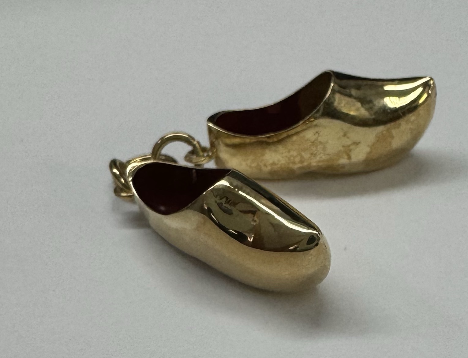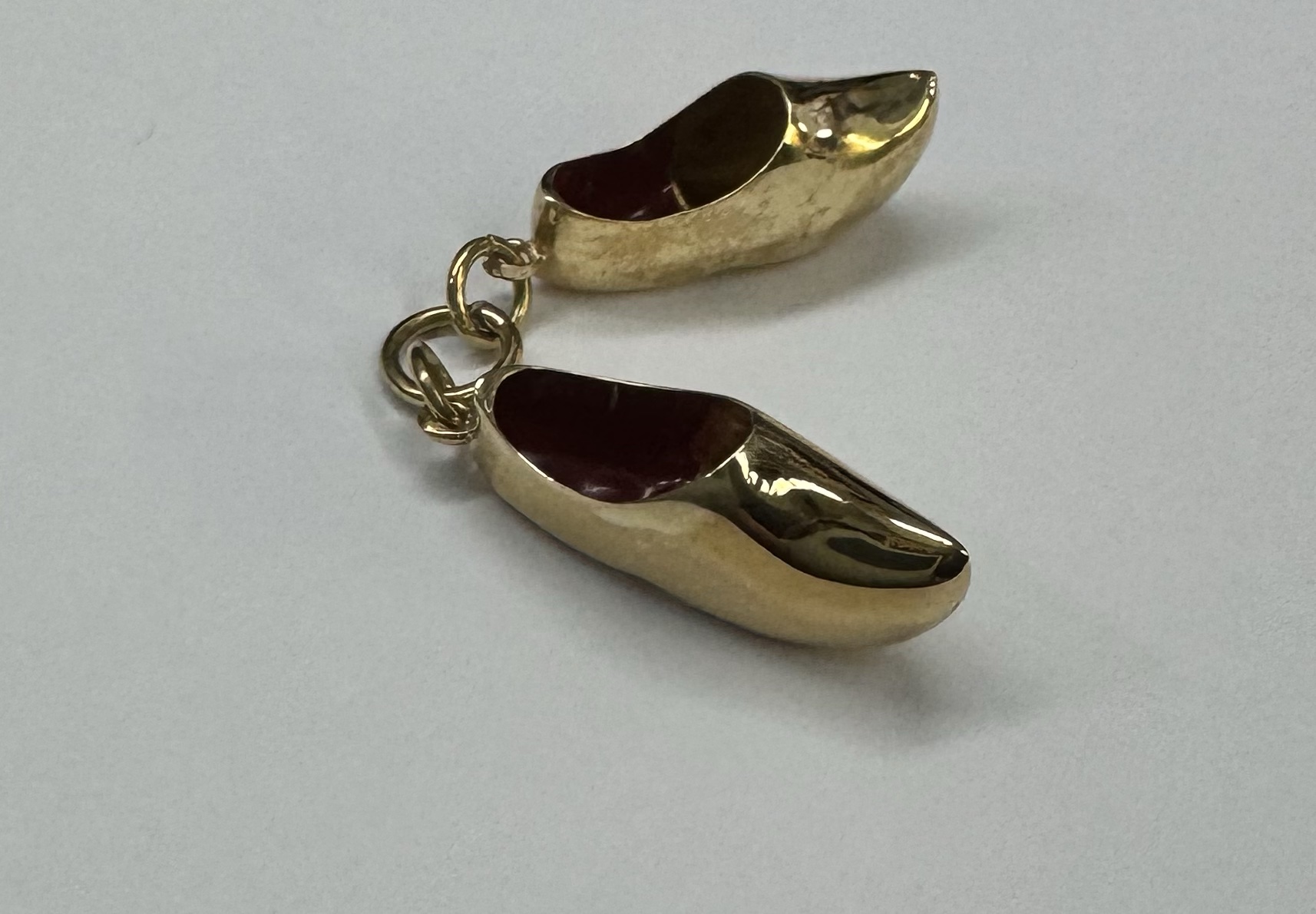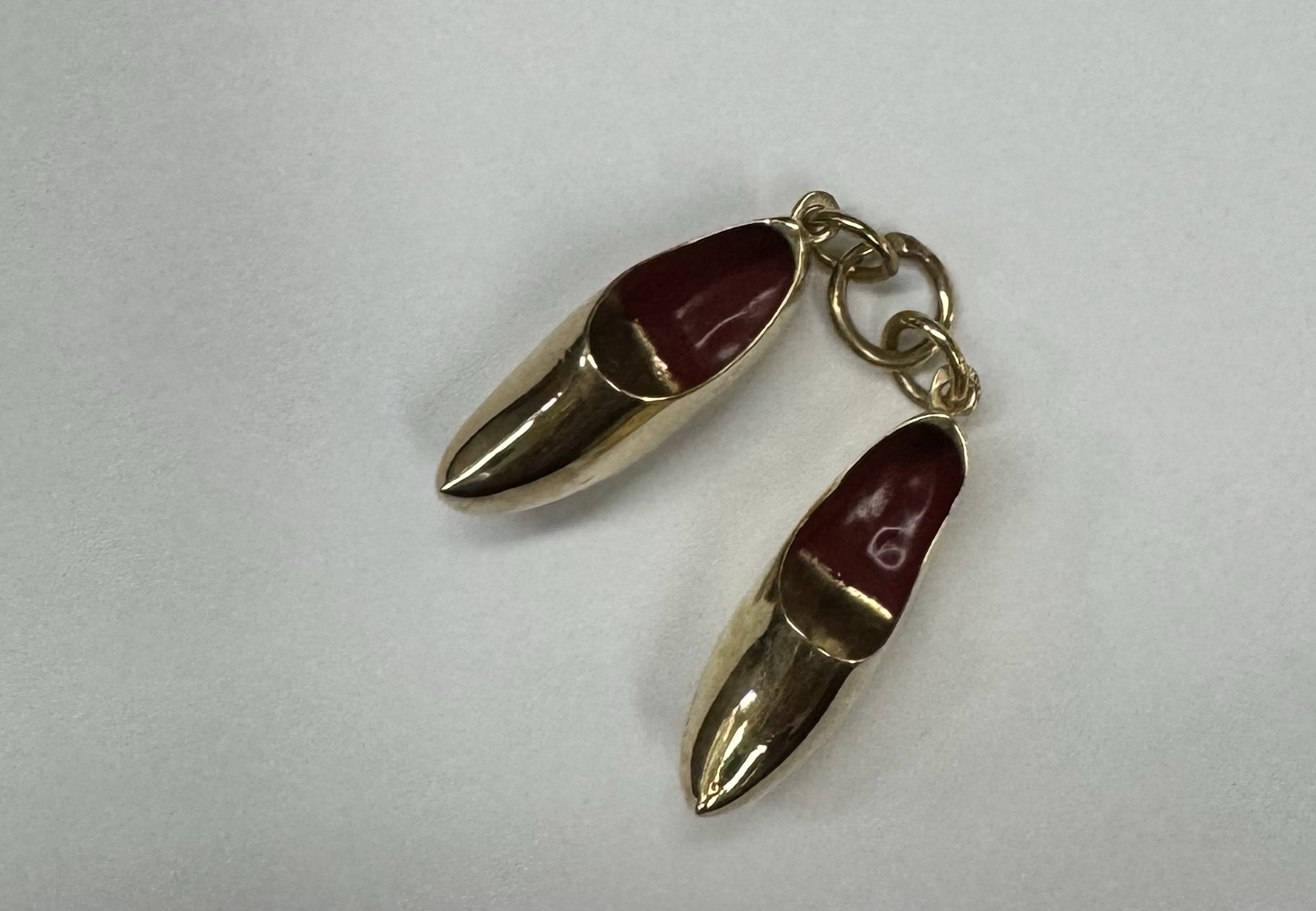 Antique 14k yellow gold clog charm with red enamel details. This charm has an entire weight of 2.1 grams.