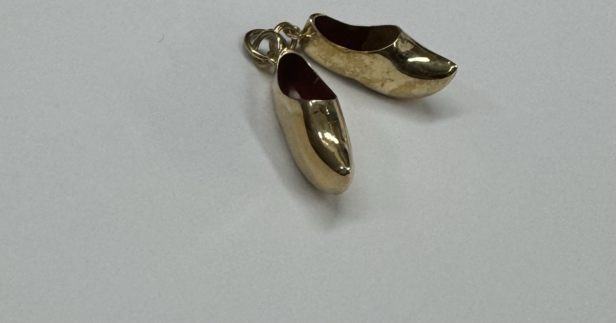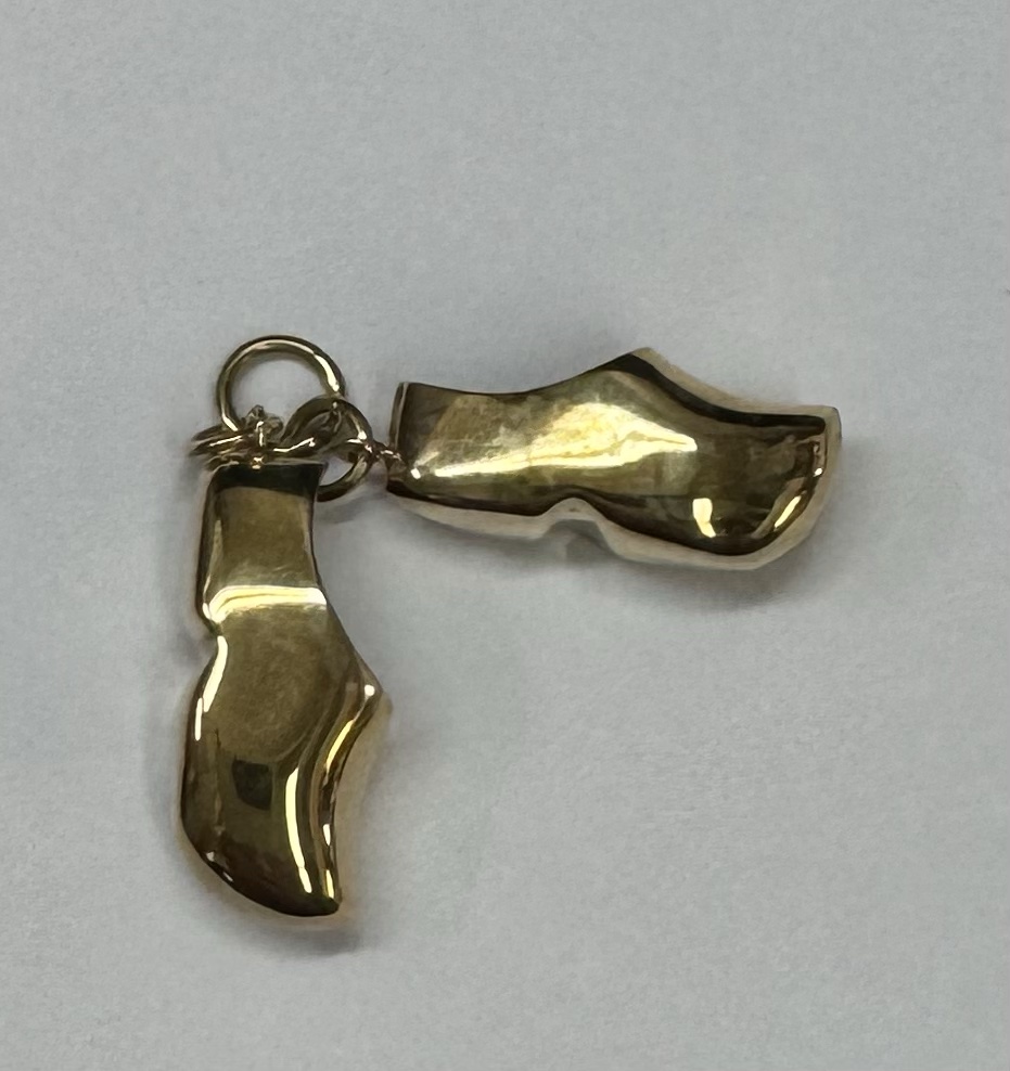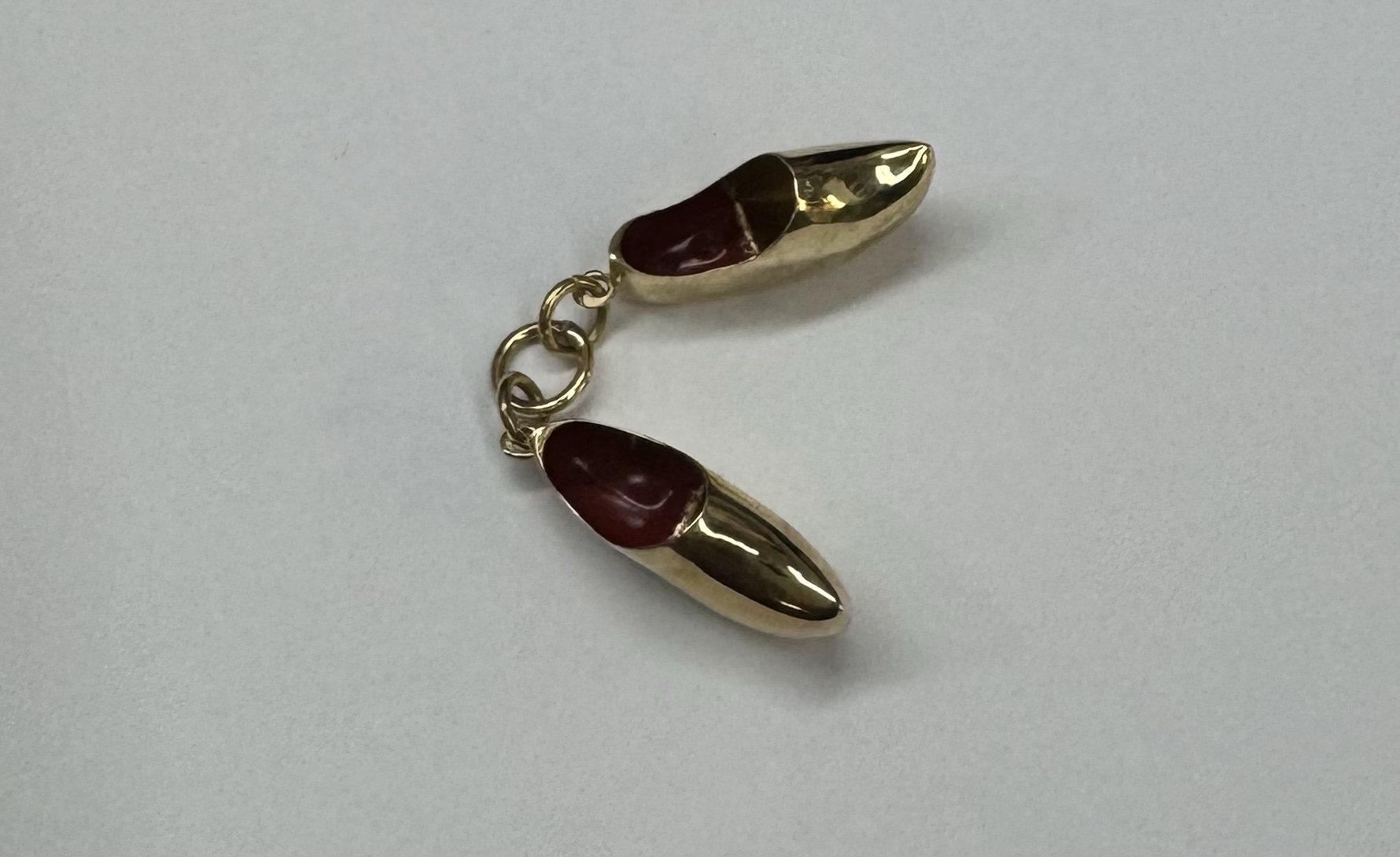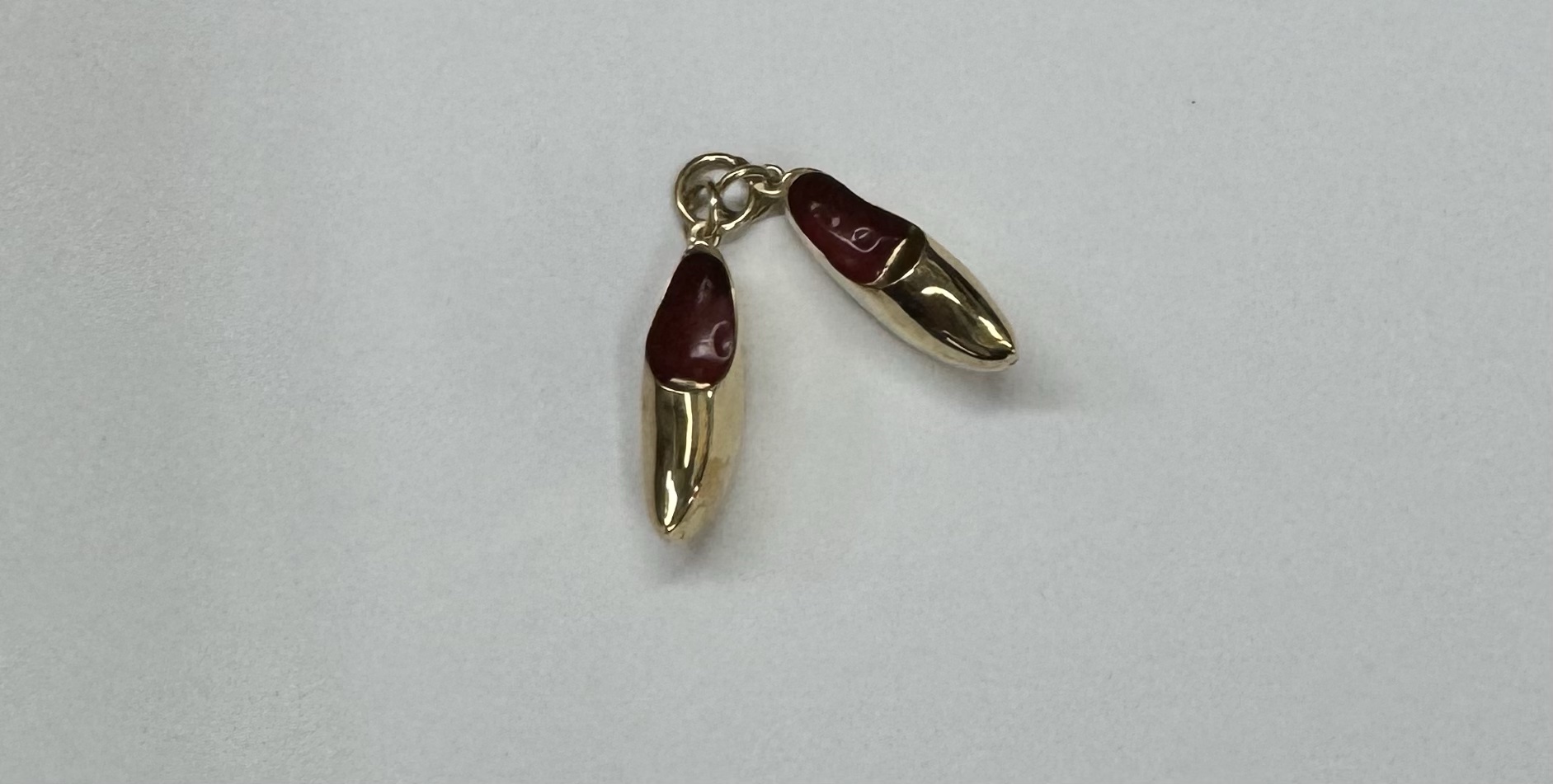 Antique 14k yellow gold clog charm with red enamel details. This charm has an entire weight of 2.1 grams.