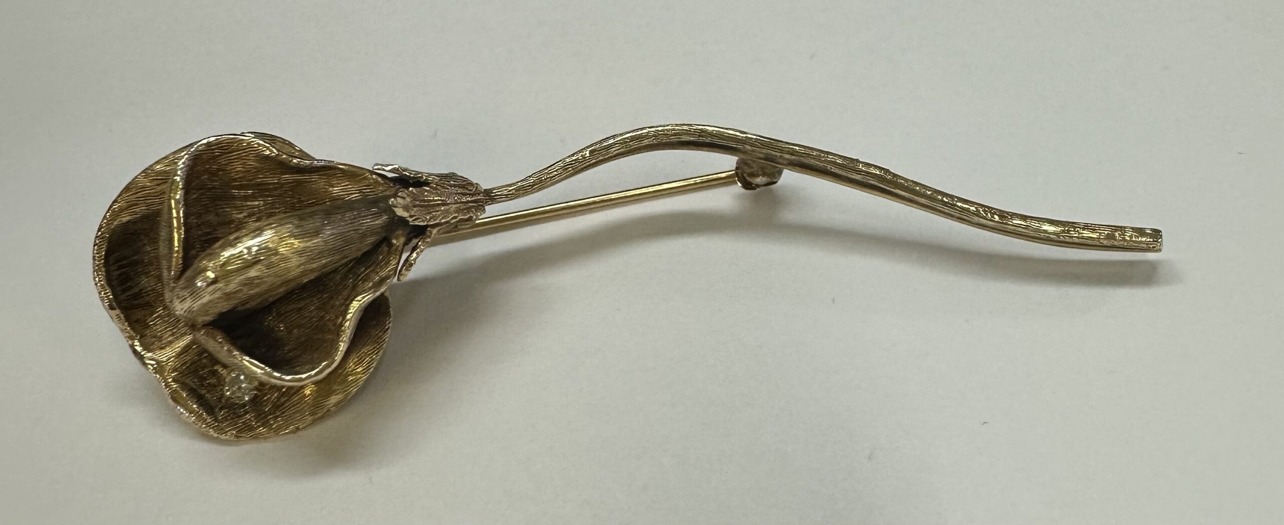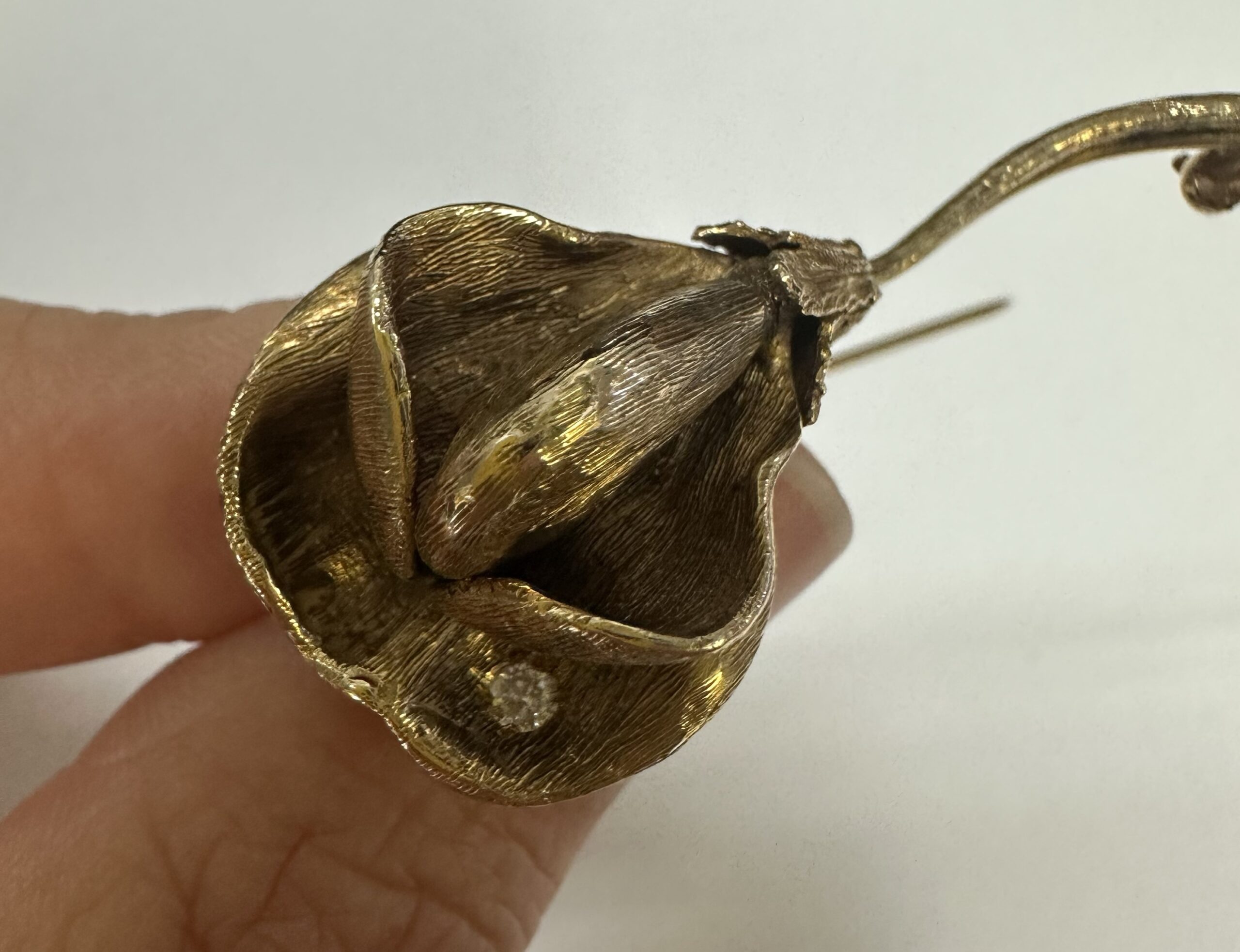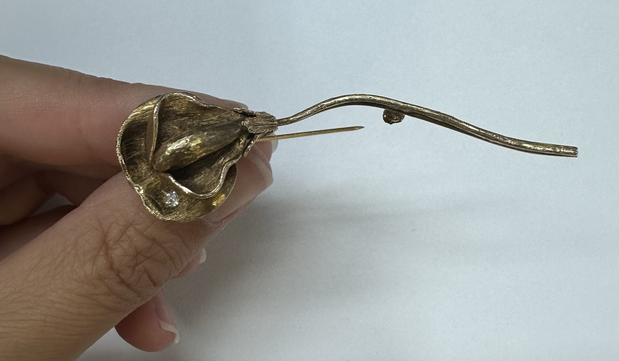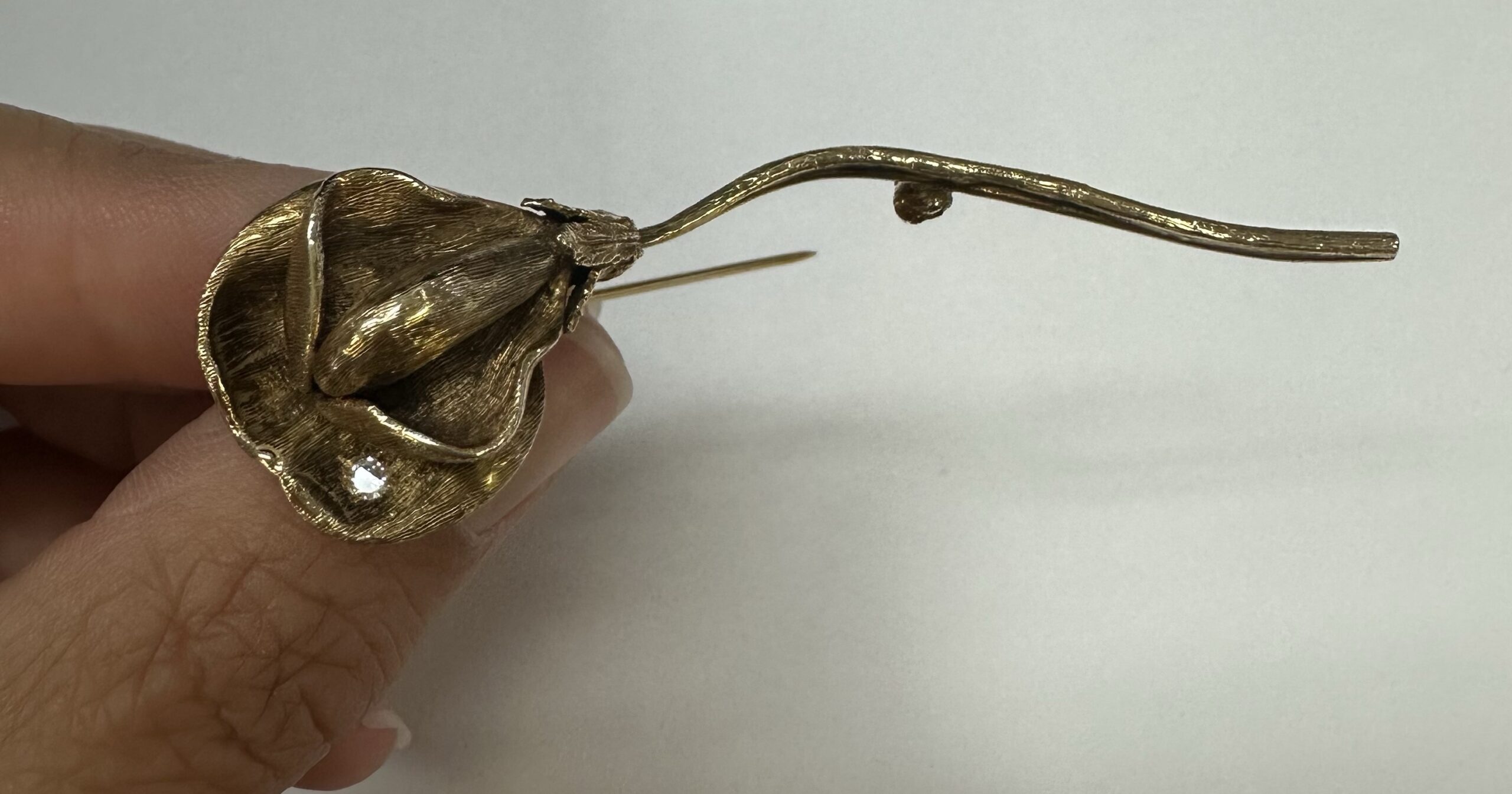 Antique 14k yellow gold flower brooch with genuine diamond accent. This brooch has an entire weight of 12.0 grams. This brooch measures 2.5″ in length and 1″ in width.