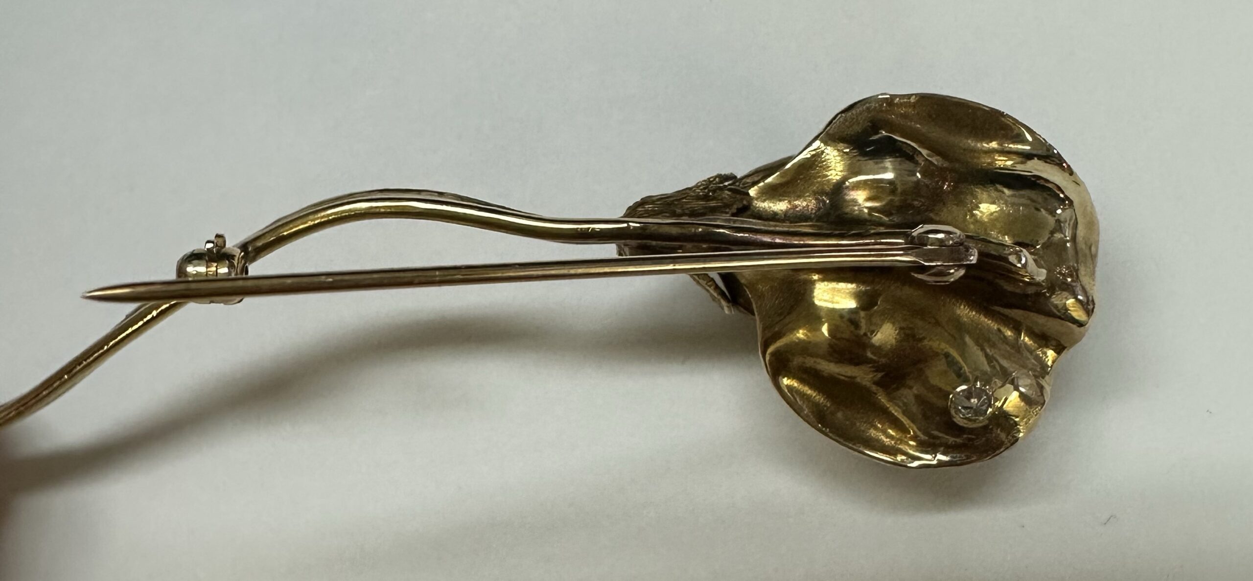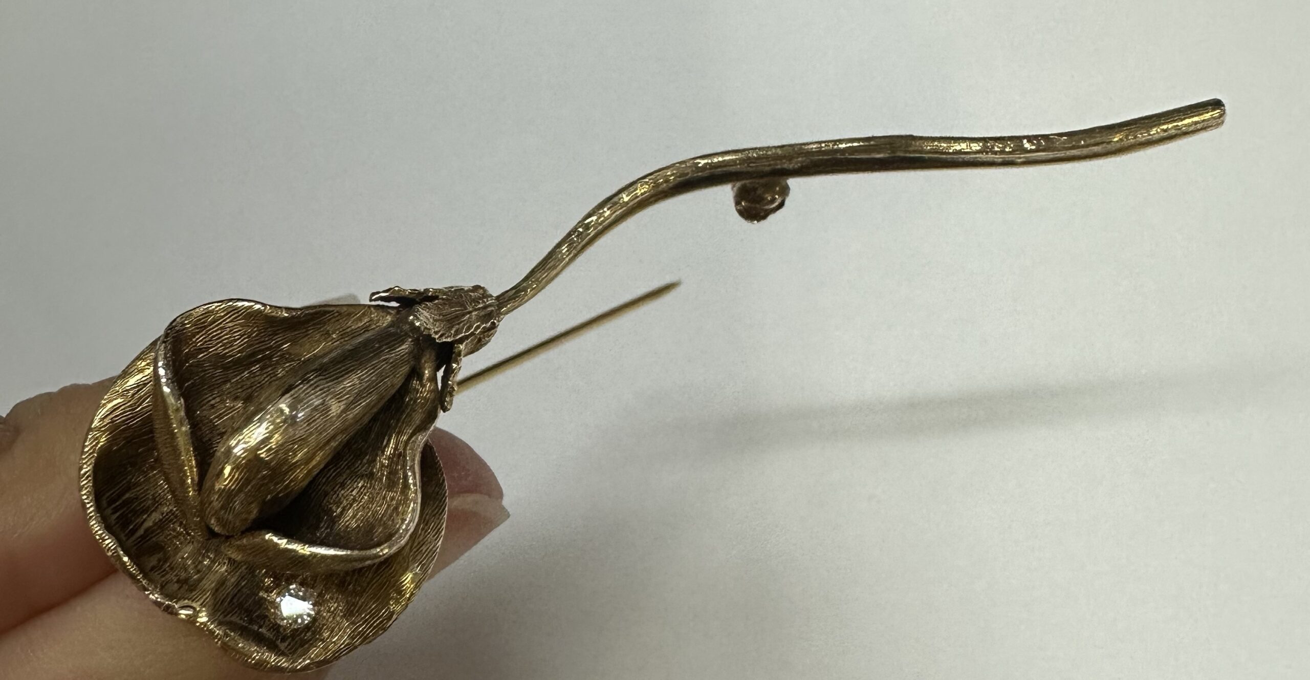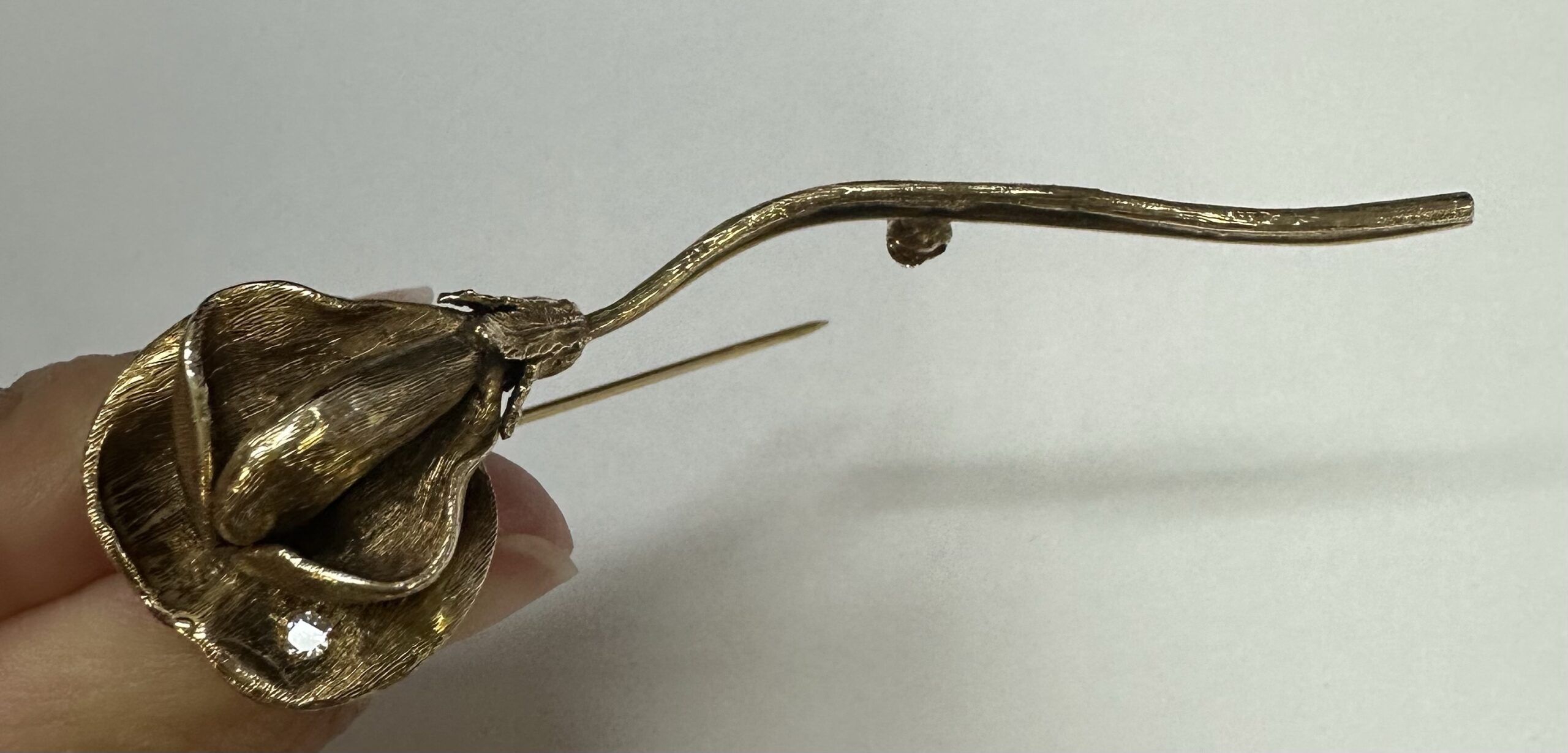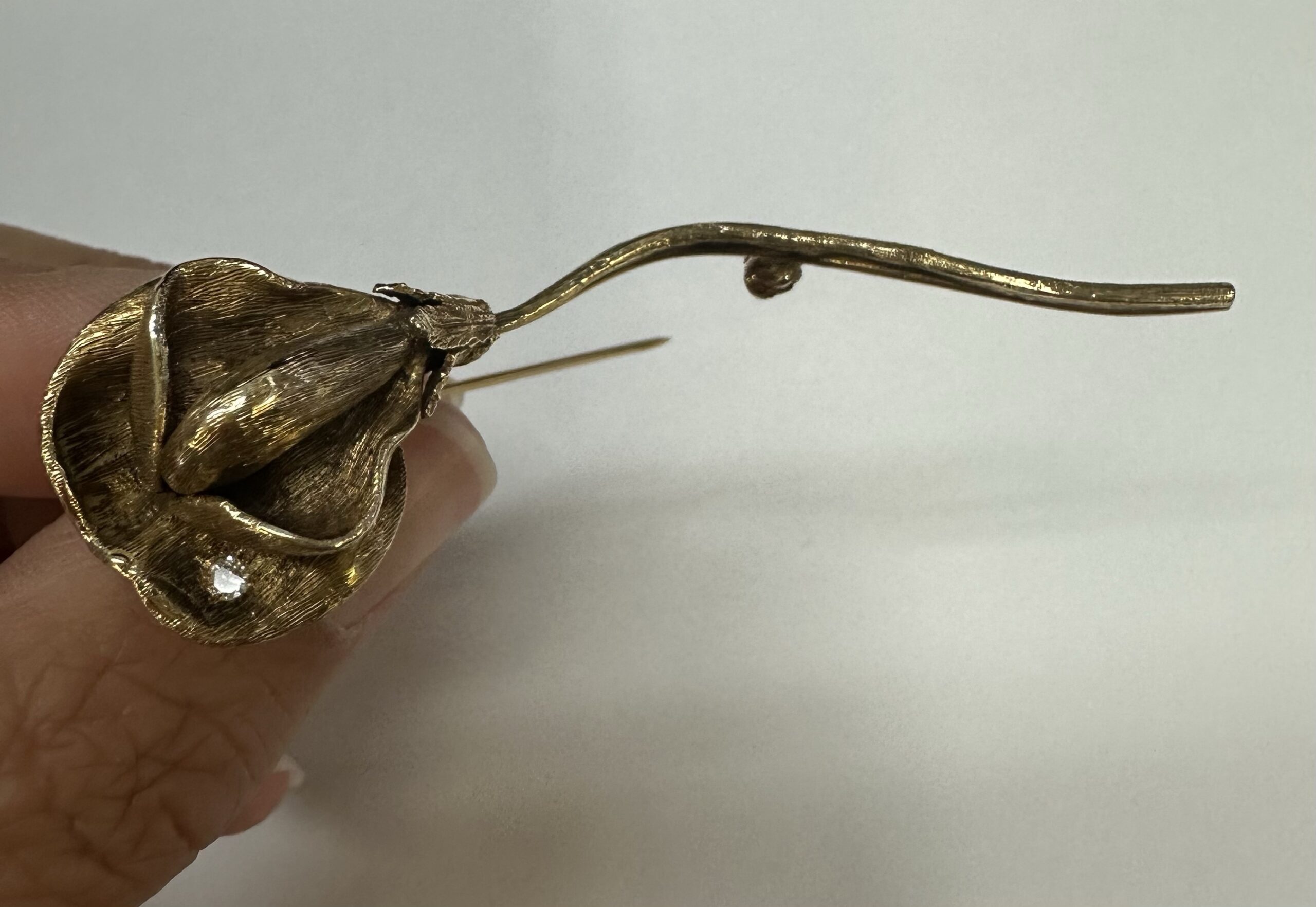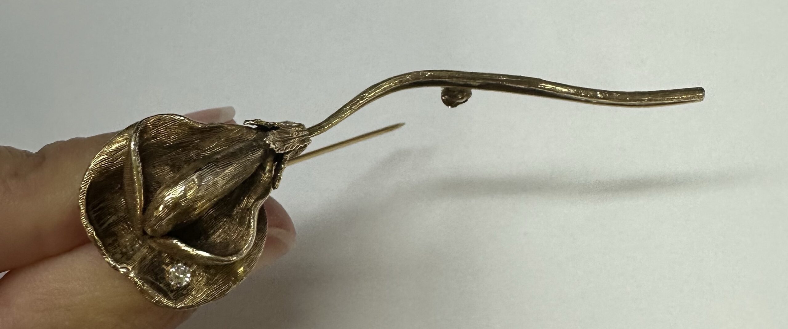 Antique 14k yellow gold flower brooch with genuine diamond accent. This brooch has an entire weight of 12.0 grams. This brooch measures 2.5″ in length and 1″ in width.