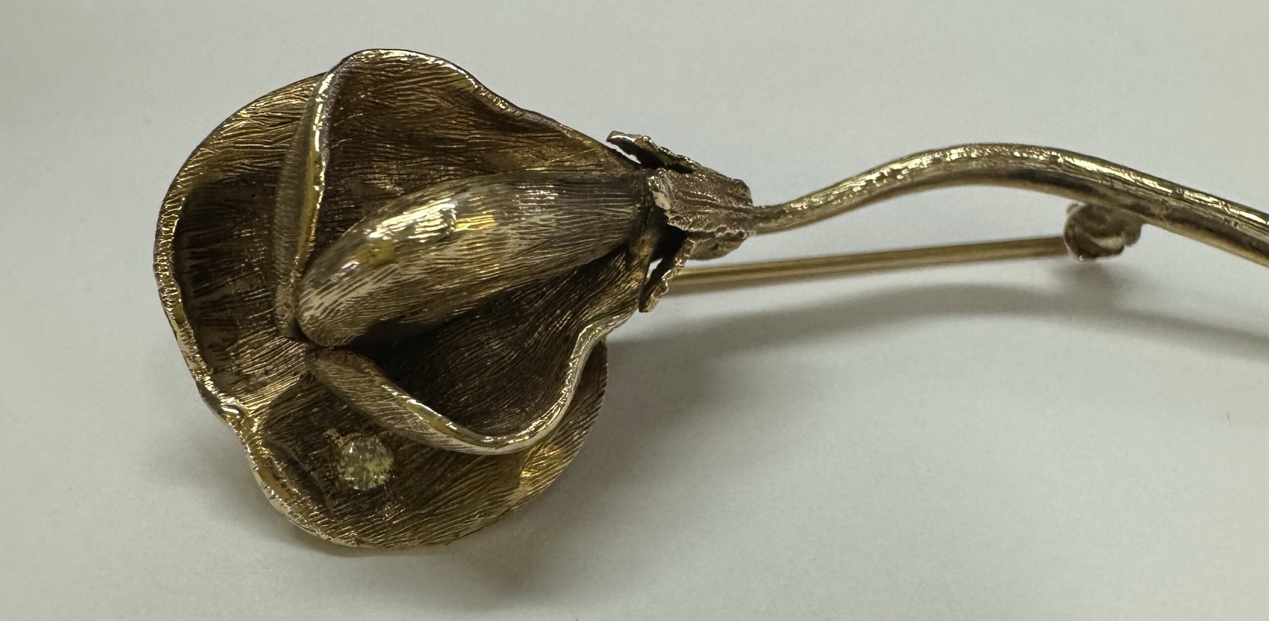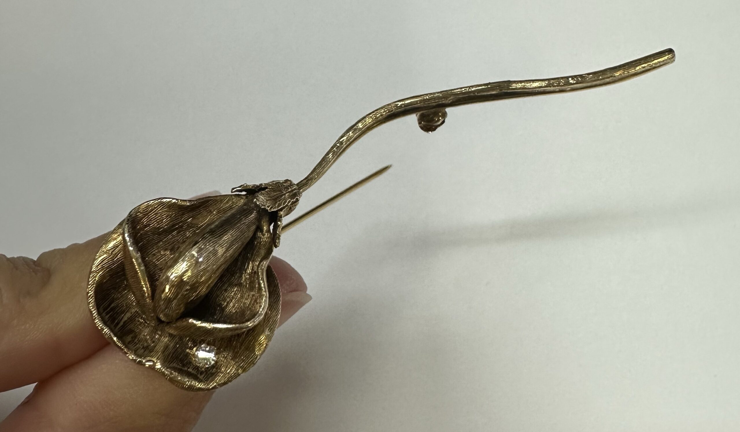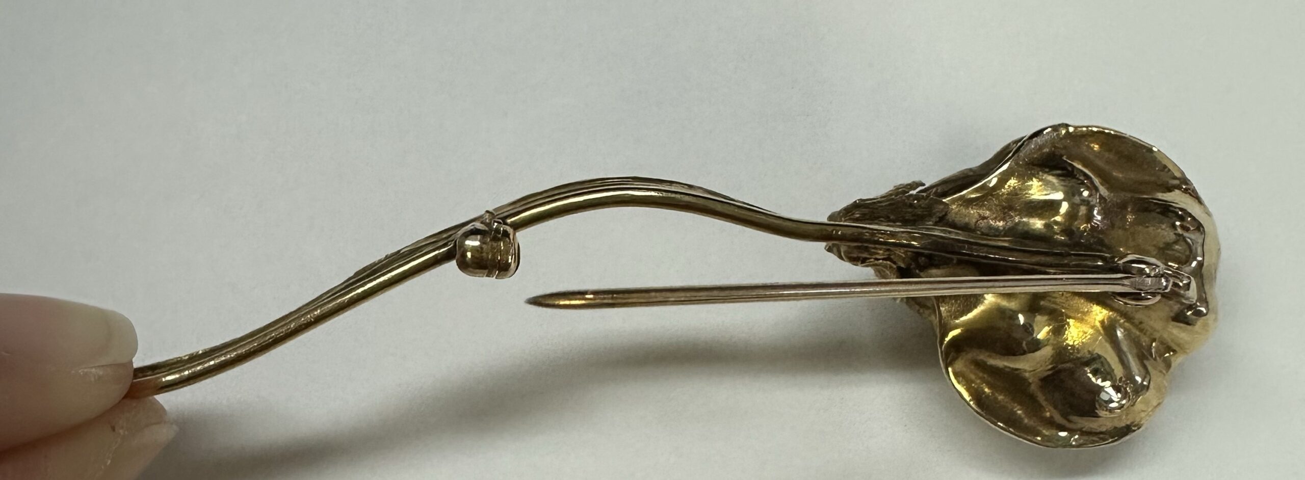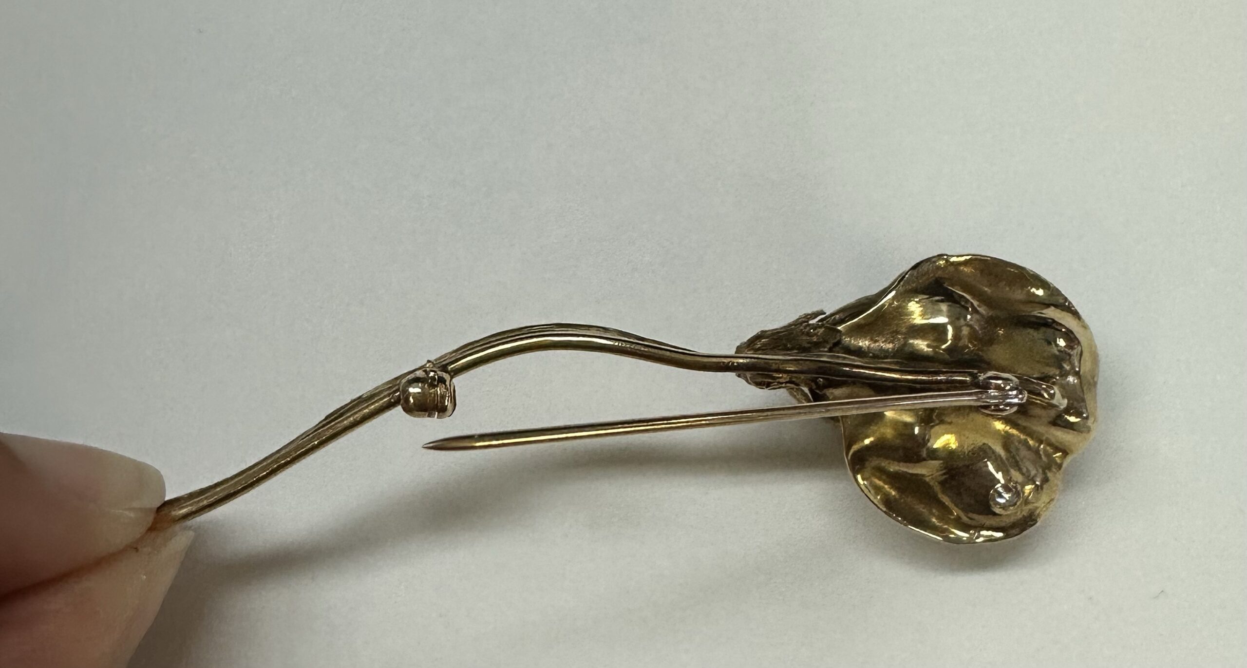 Antique 14k yellow gold flower brooch with genuine diamond accent. This brooch has an entire weight of 12.0 grams. This brooch measures 2.5″ in length and 1″ in width.