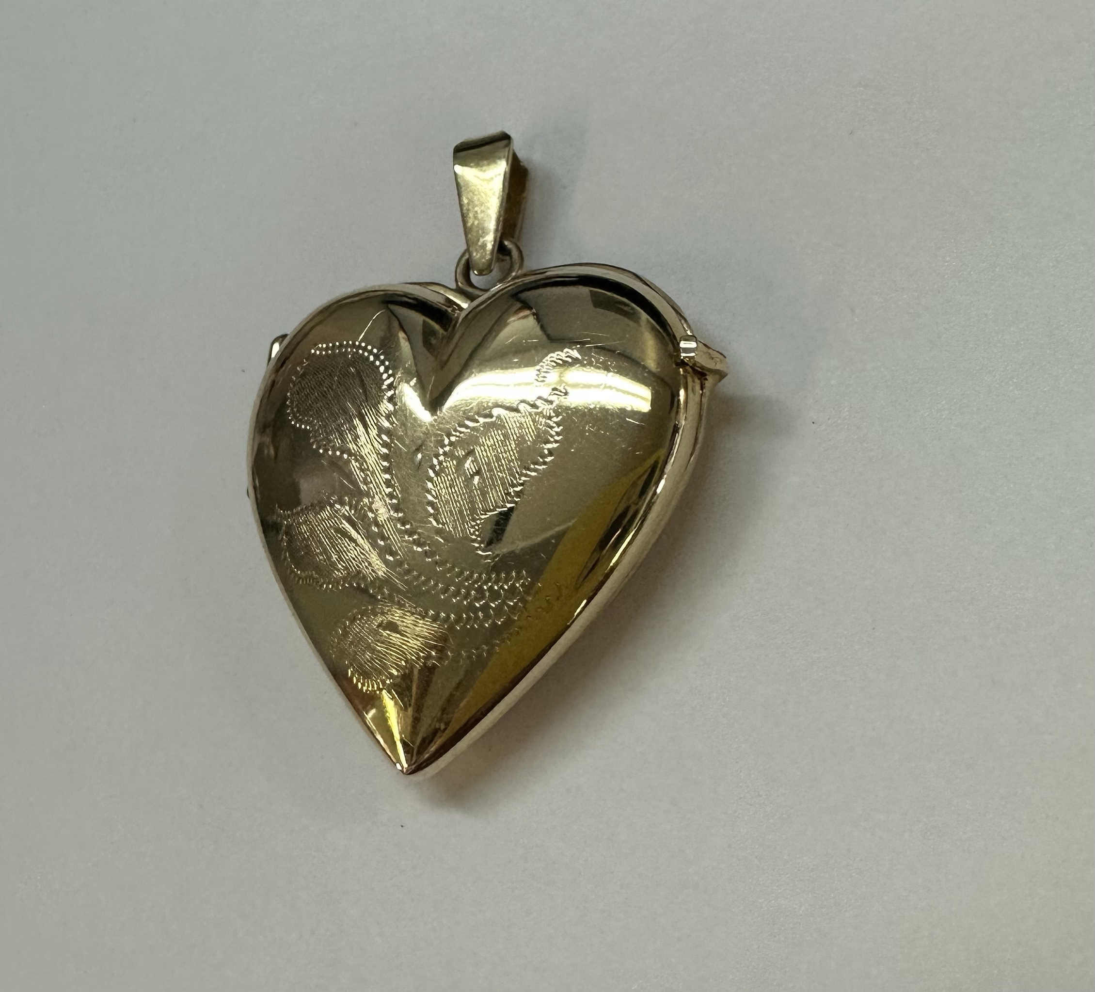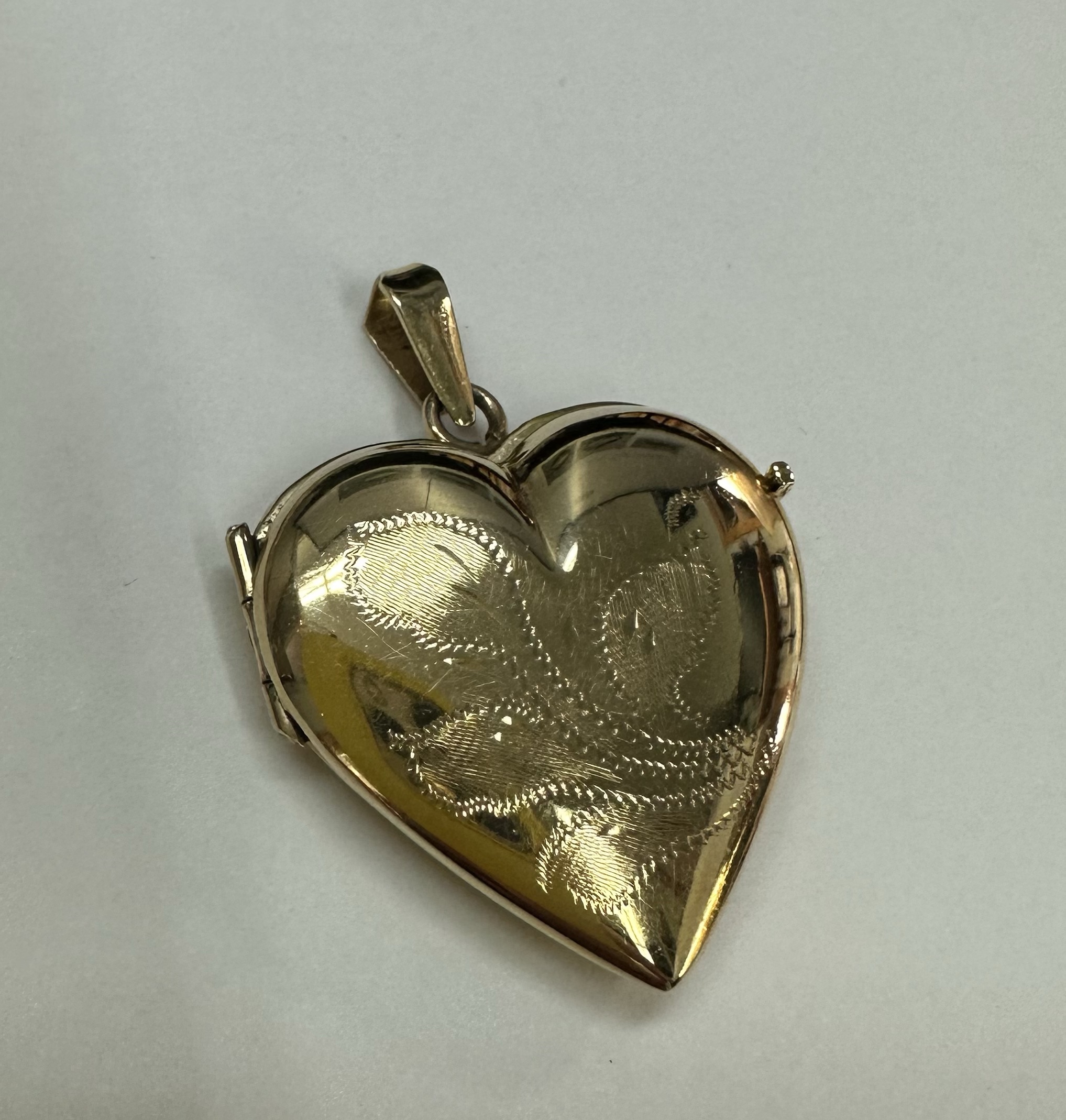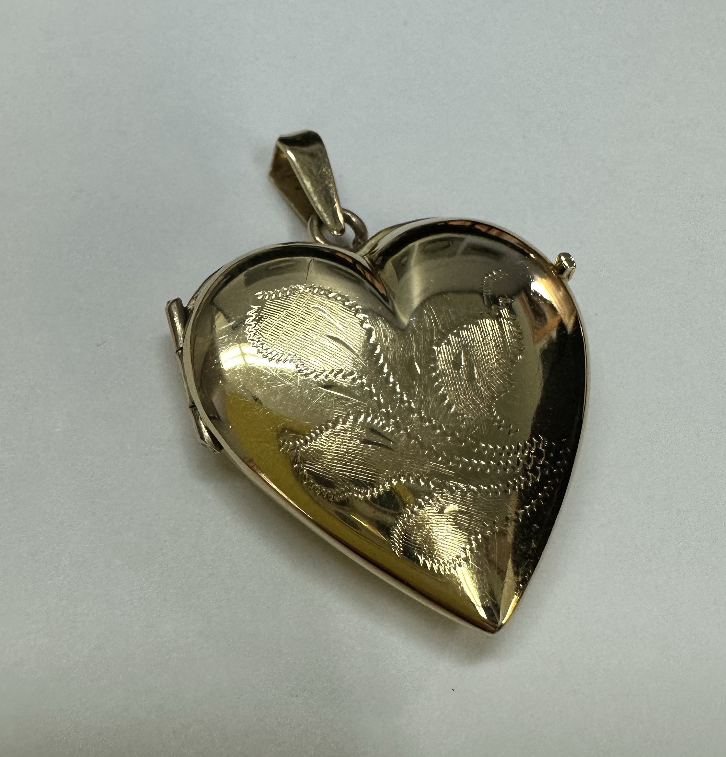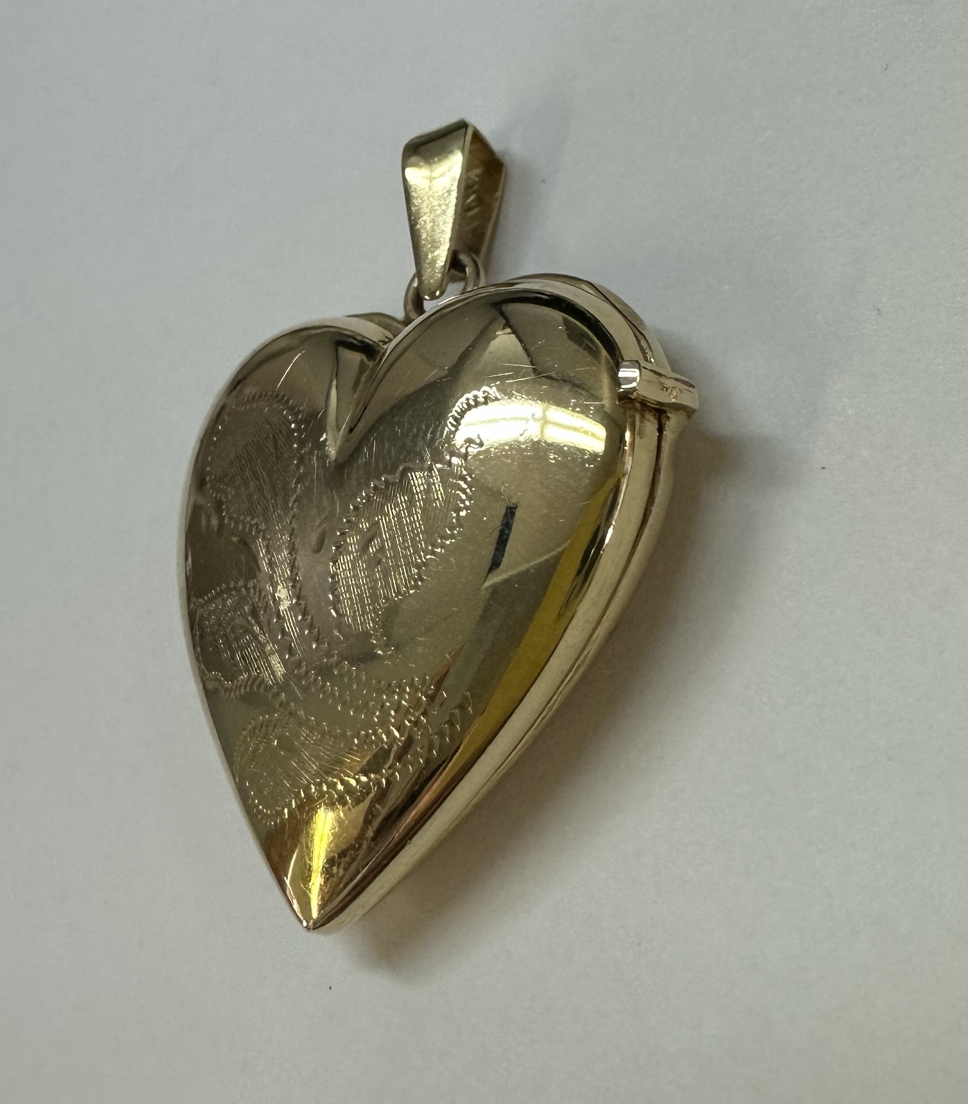 Antique one-of-a-kind 14k yellow gold engraved 2 picture locket. This locket measures approximately 1 3/4″ x 1 1/4″, and it has an entire weight of 10.1 grams.