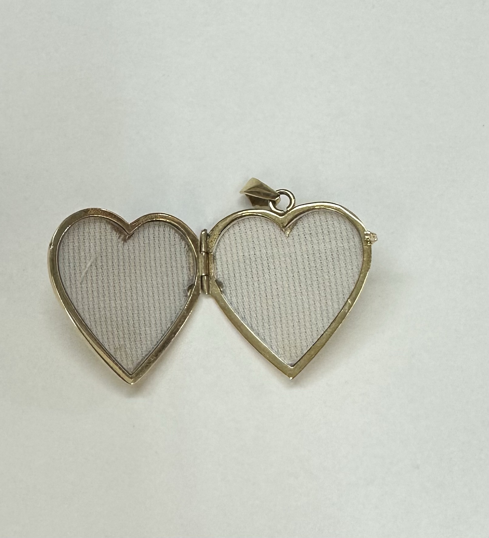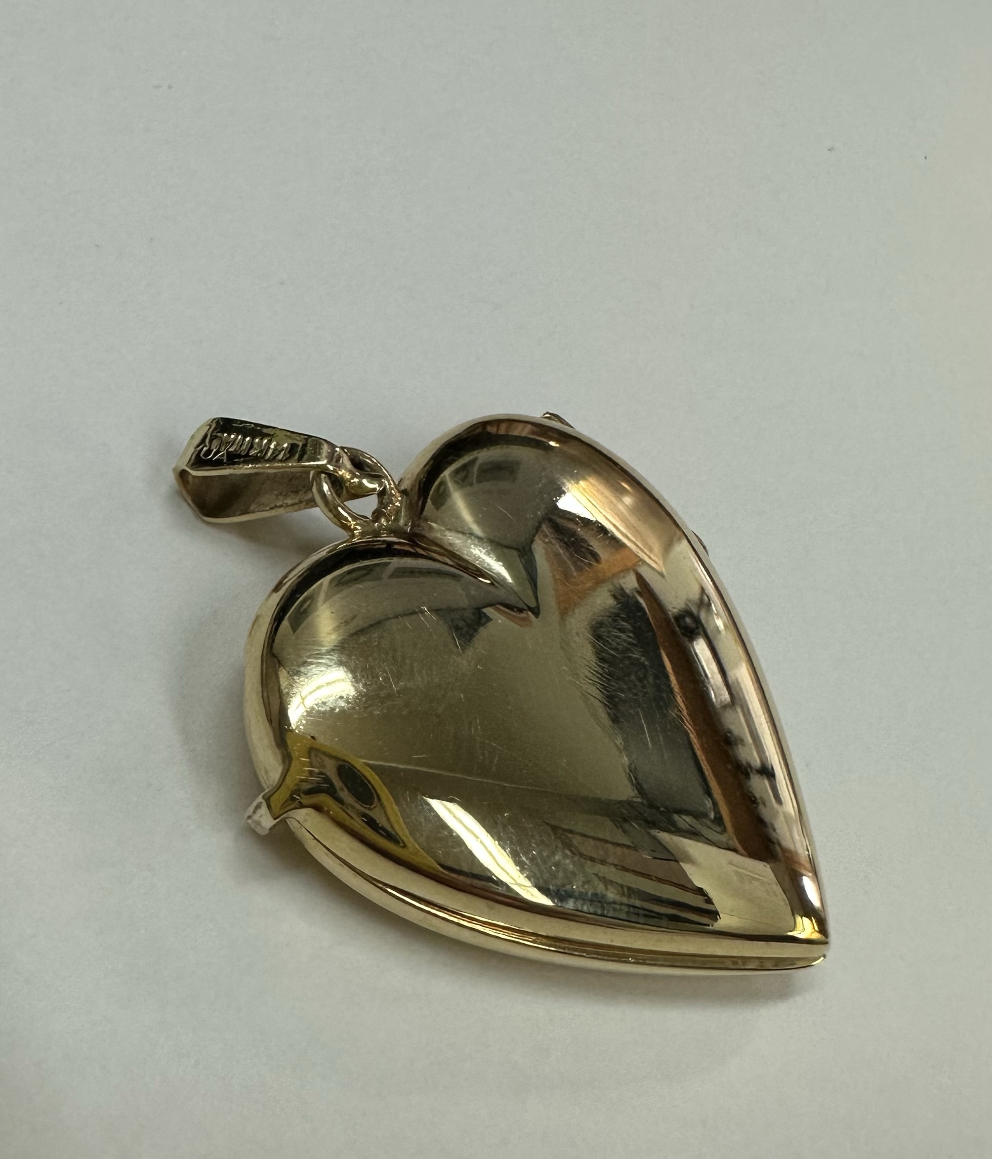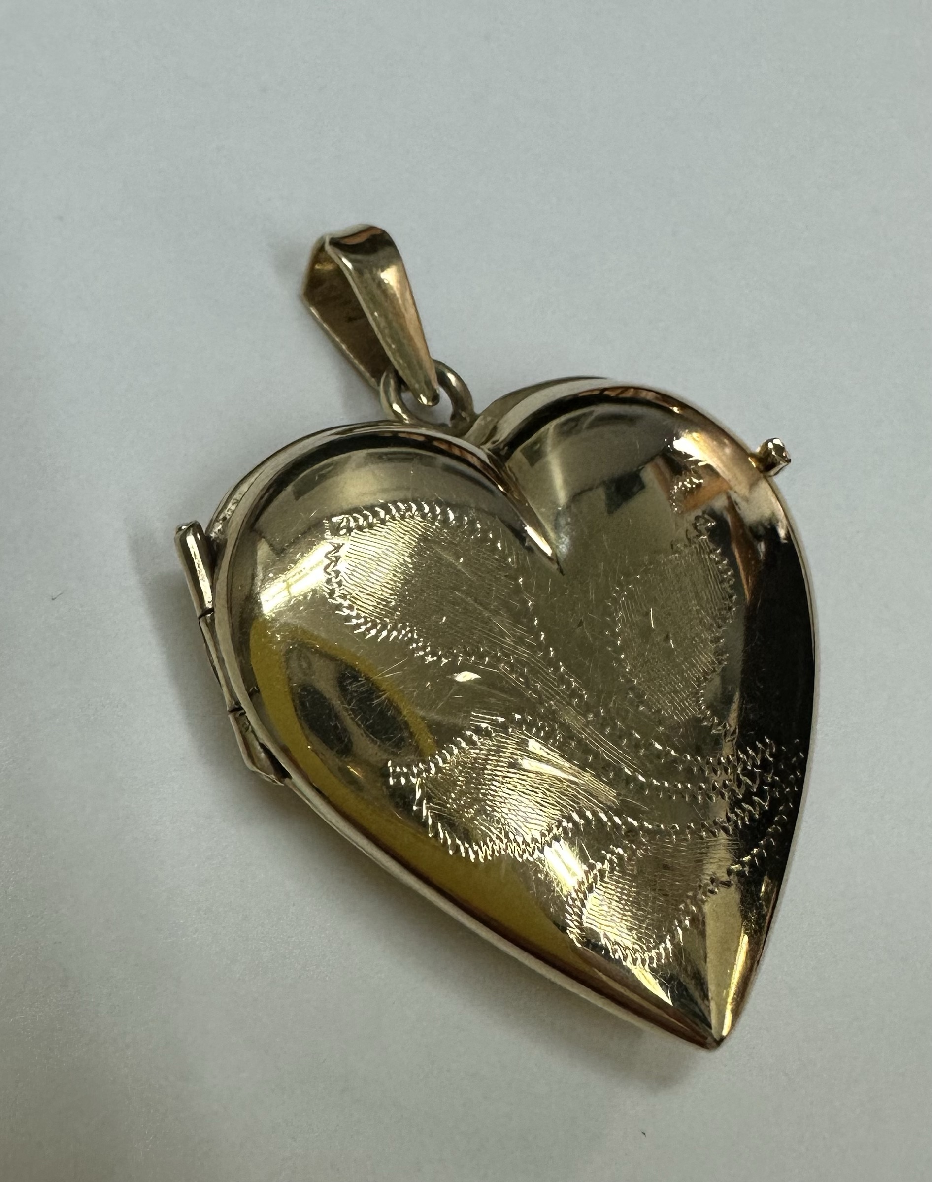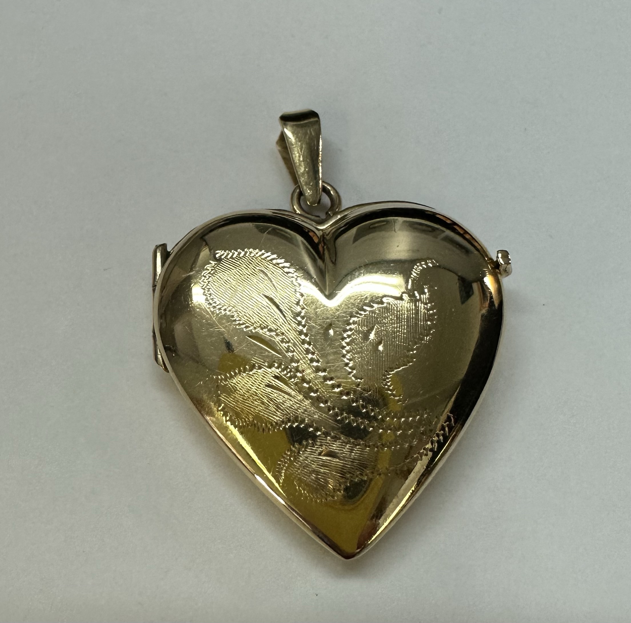 Antique one-of-a-kind 14k yellow gold engraved 2 picture locket. This locket measures approximately 1 3/4″ x 1 1/4″, and it has an entire weight of 10.1 grams.