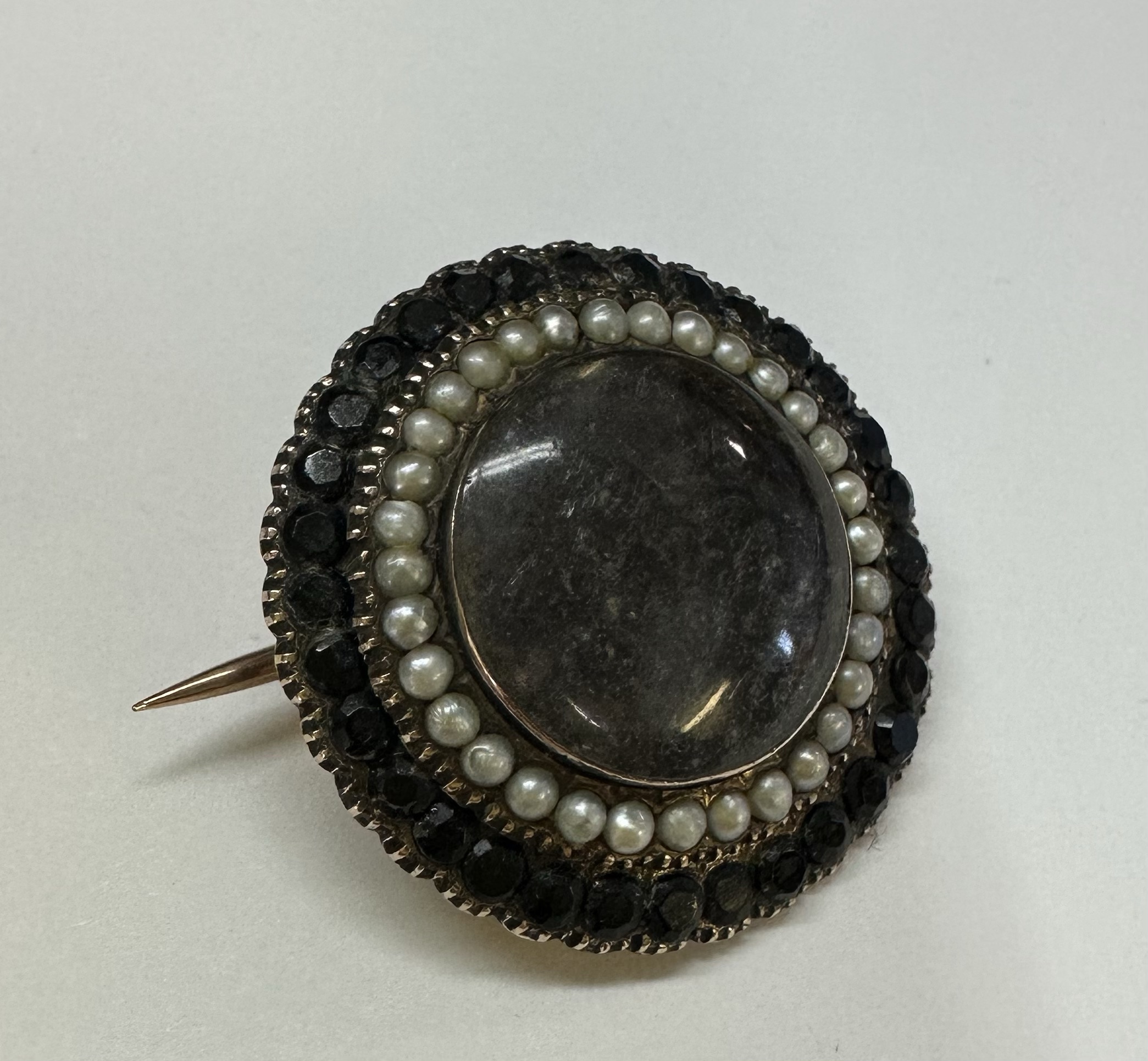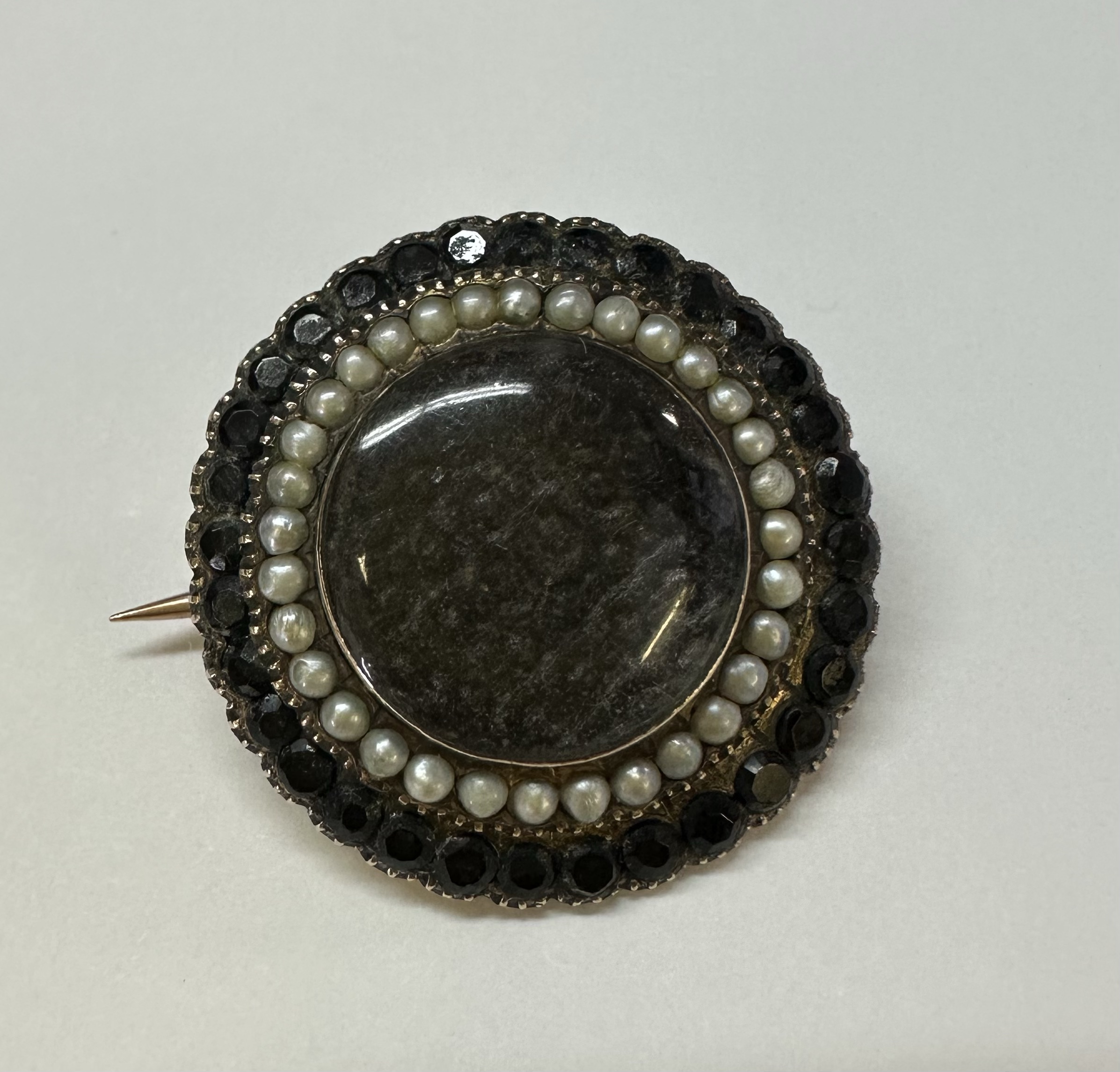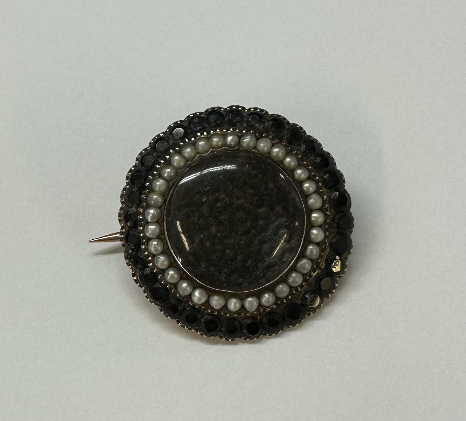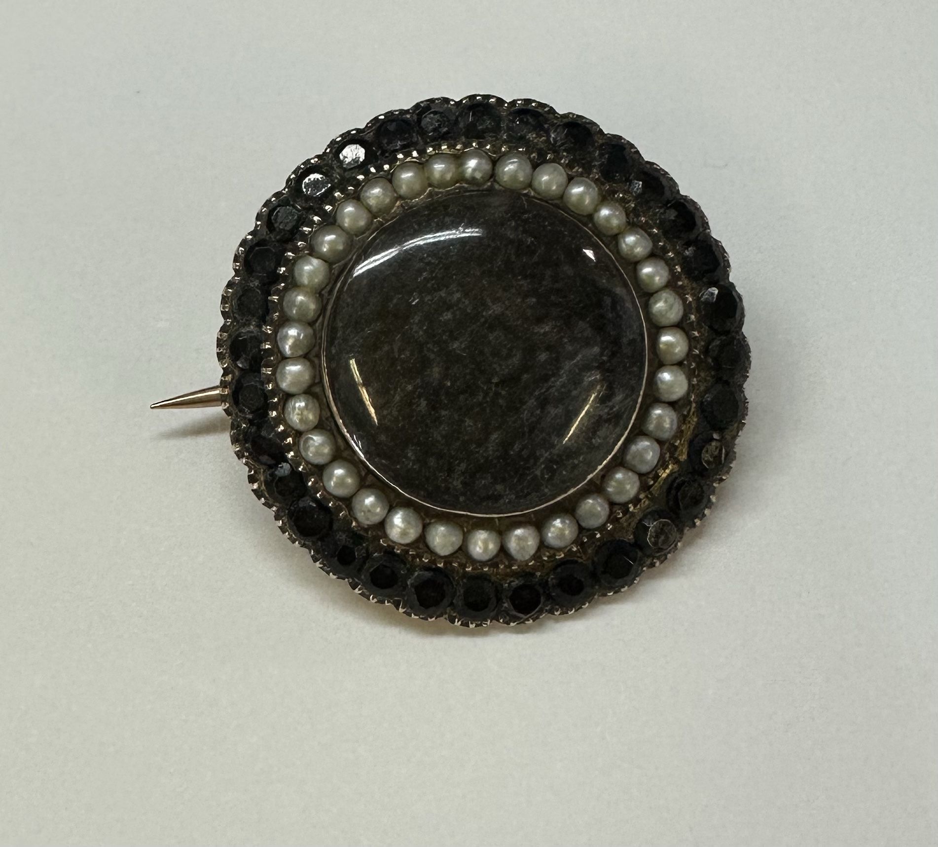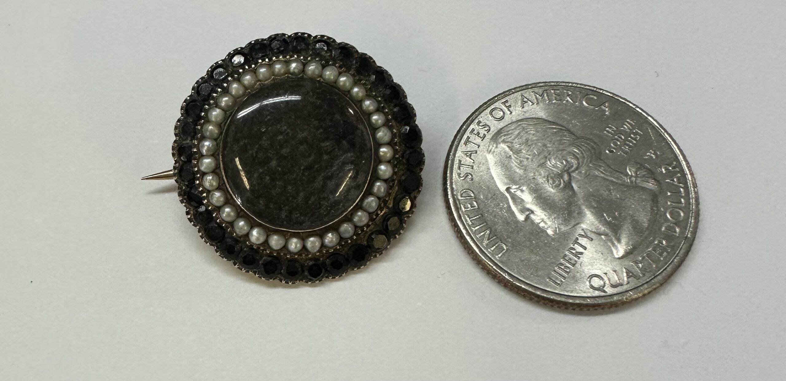 Antique gold filled round memorial hair locket brooch with hidden pendant loop, accented by genuine Onyx gemstones & seed pearls. This brooch also contains hair fragments. This brooch has an entire weight of 7.0 grams.