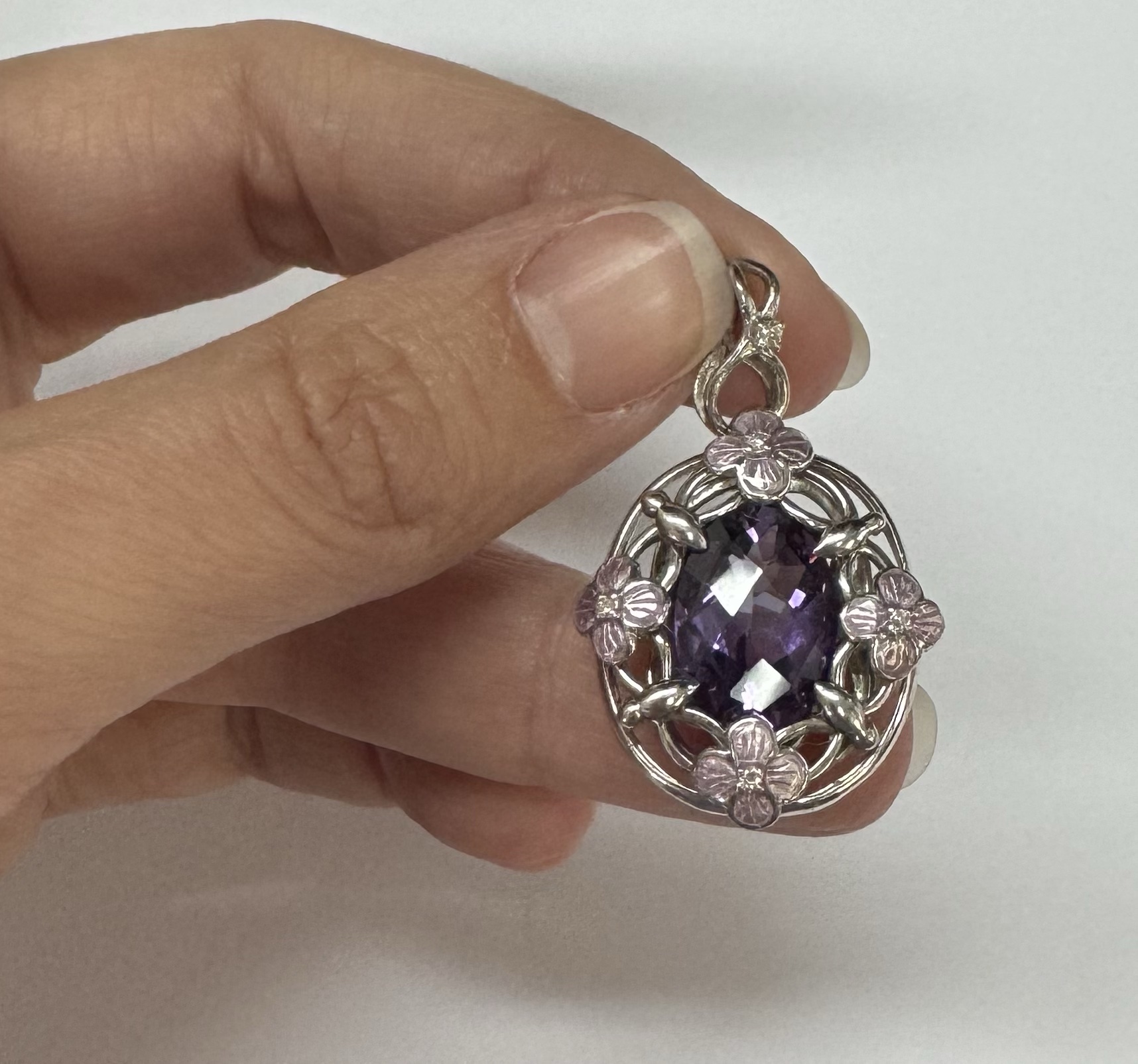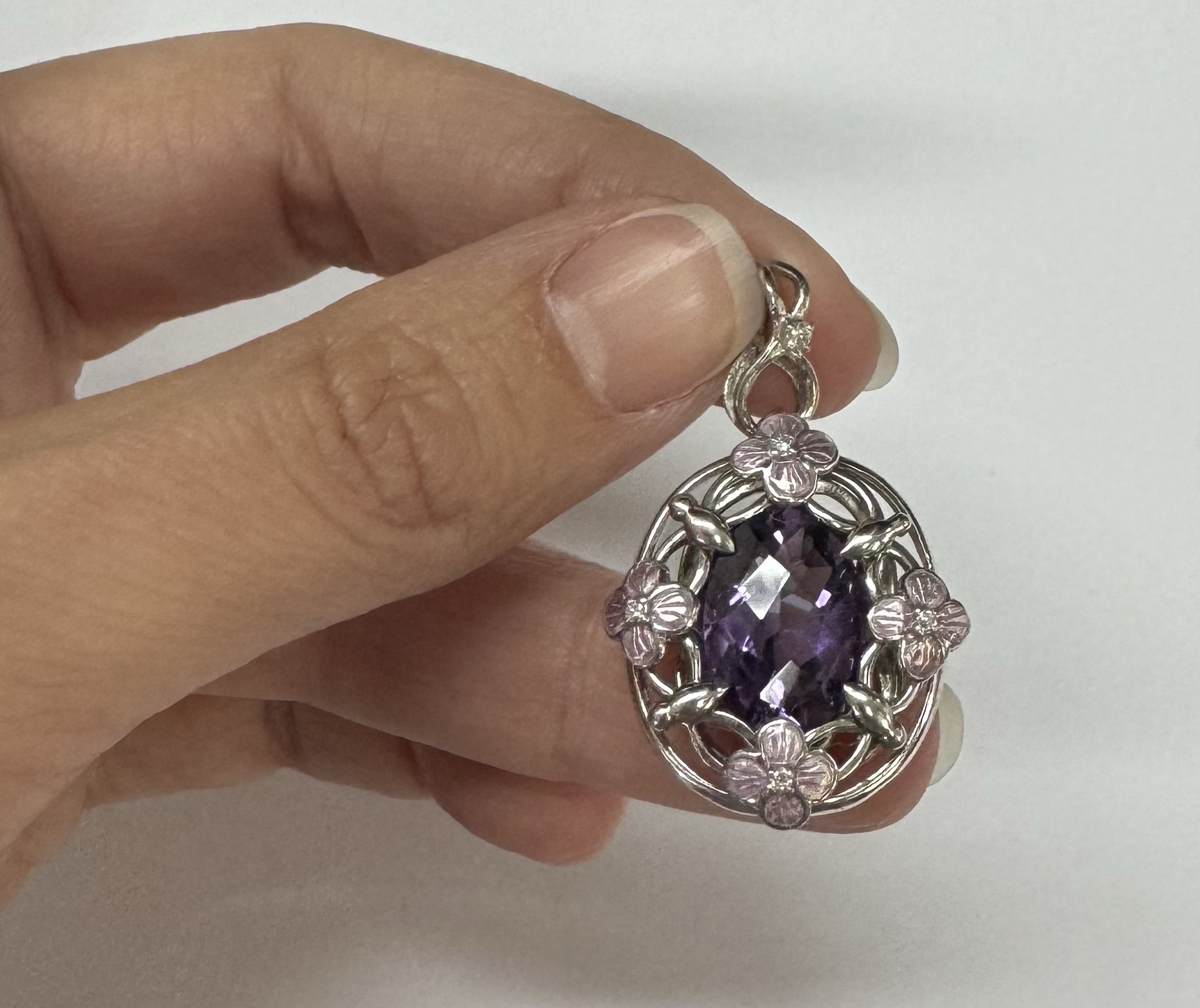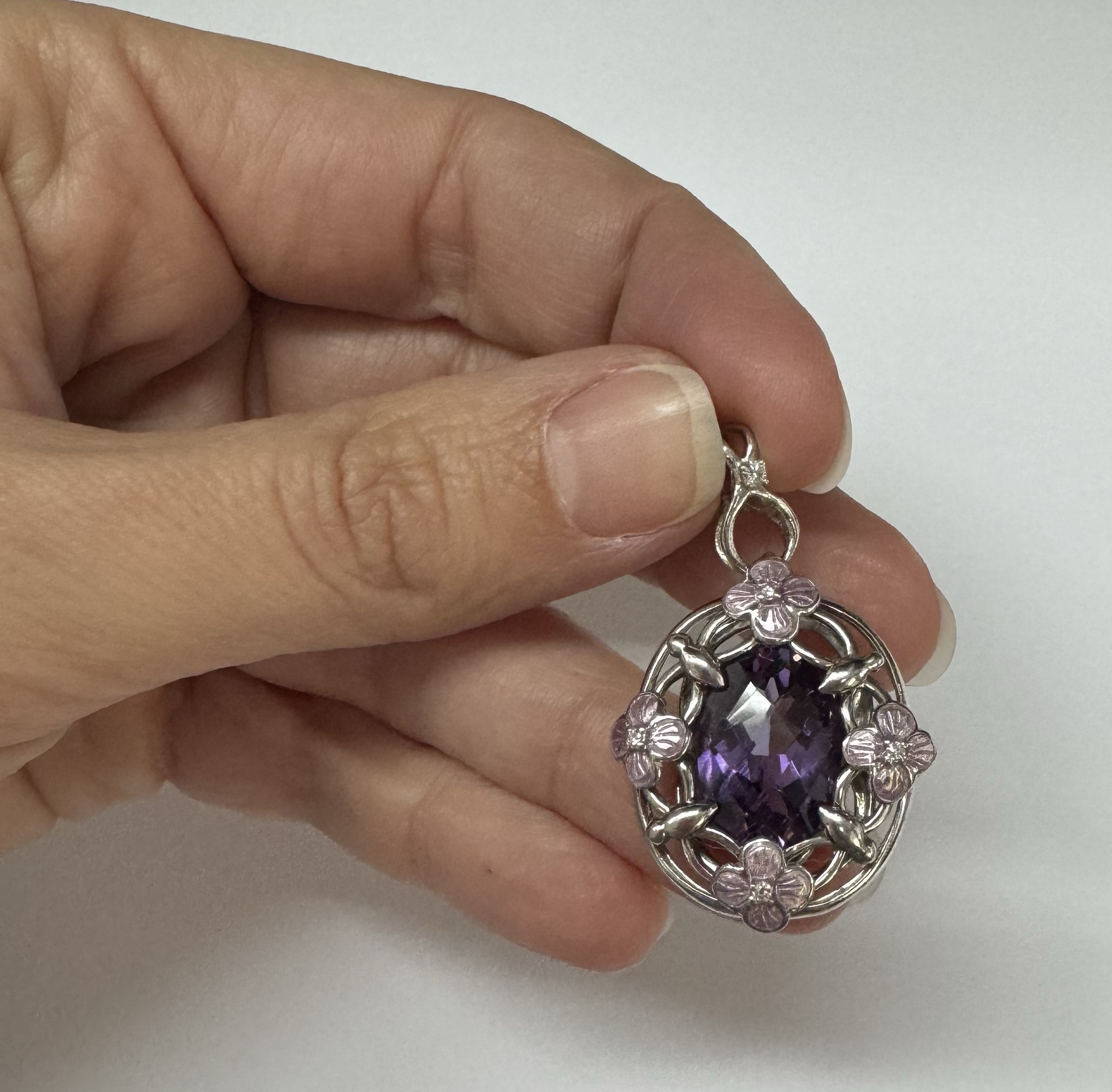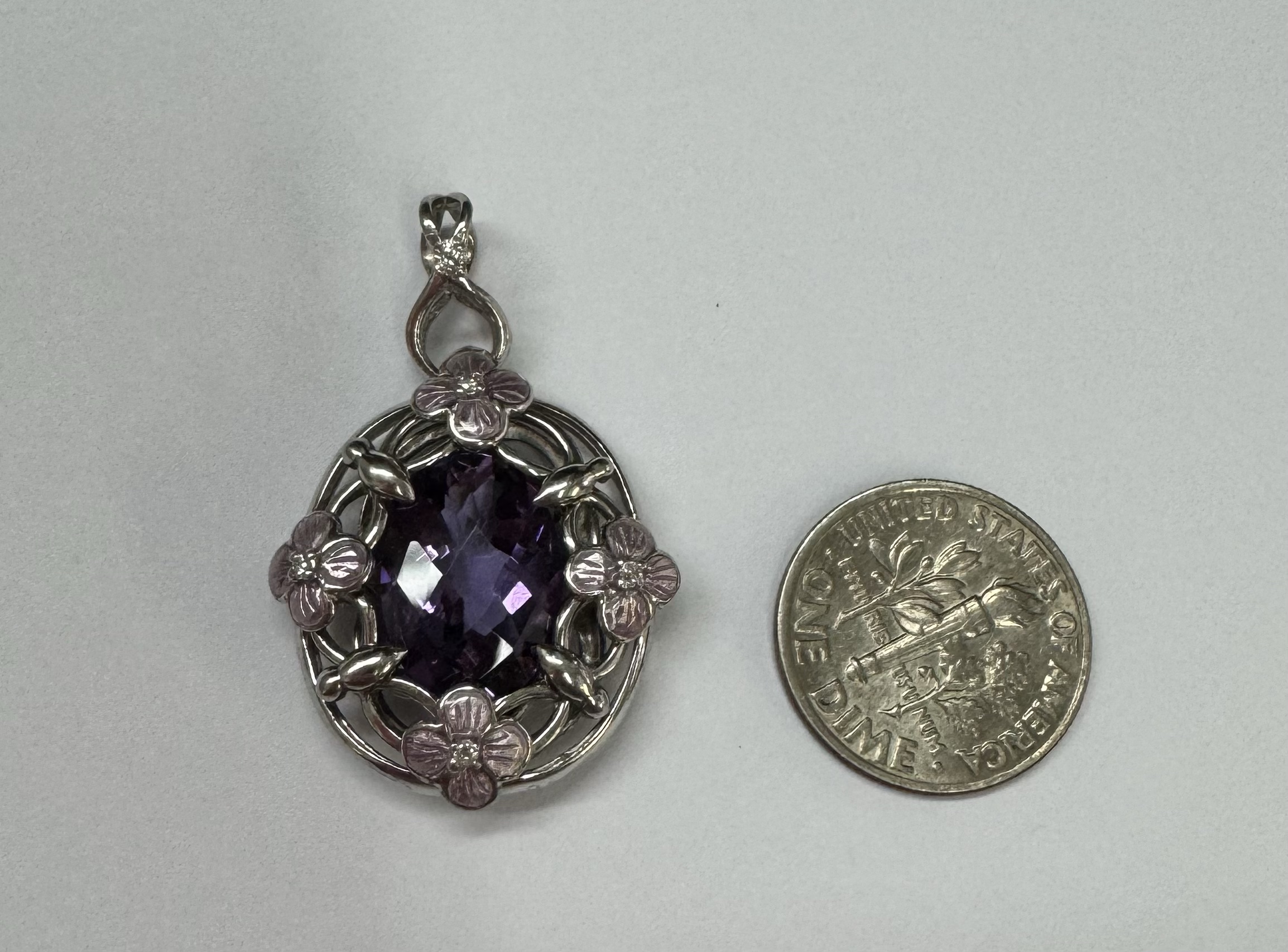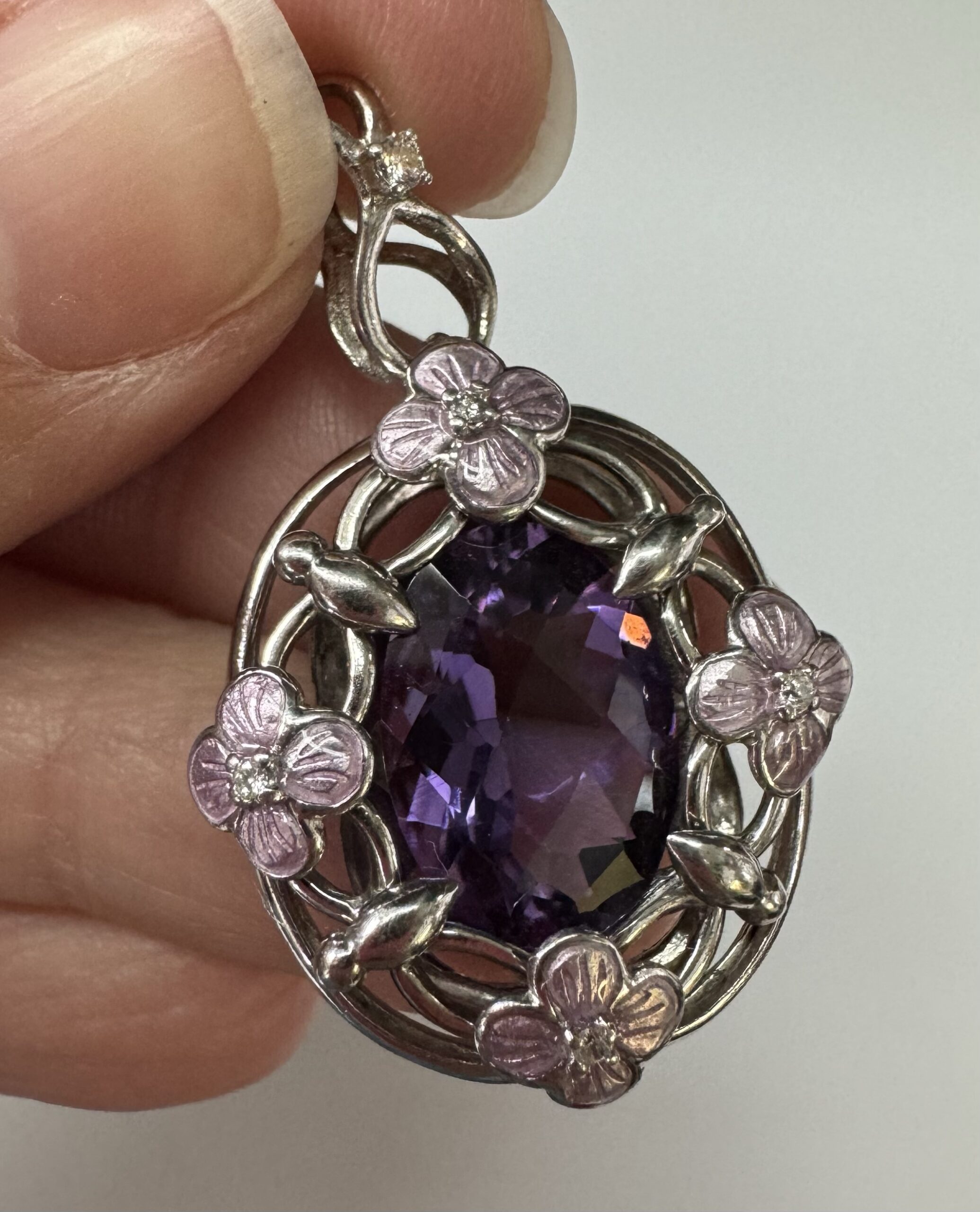 One-of-a-kind antique Sterling Silver genuine oval shaped, faceted Amethyst pendant of an openwork motif, with genuine Diamond accents & enameled flowers & birds. This pendant has an entire weight of 6.6 grams.