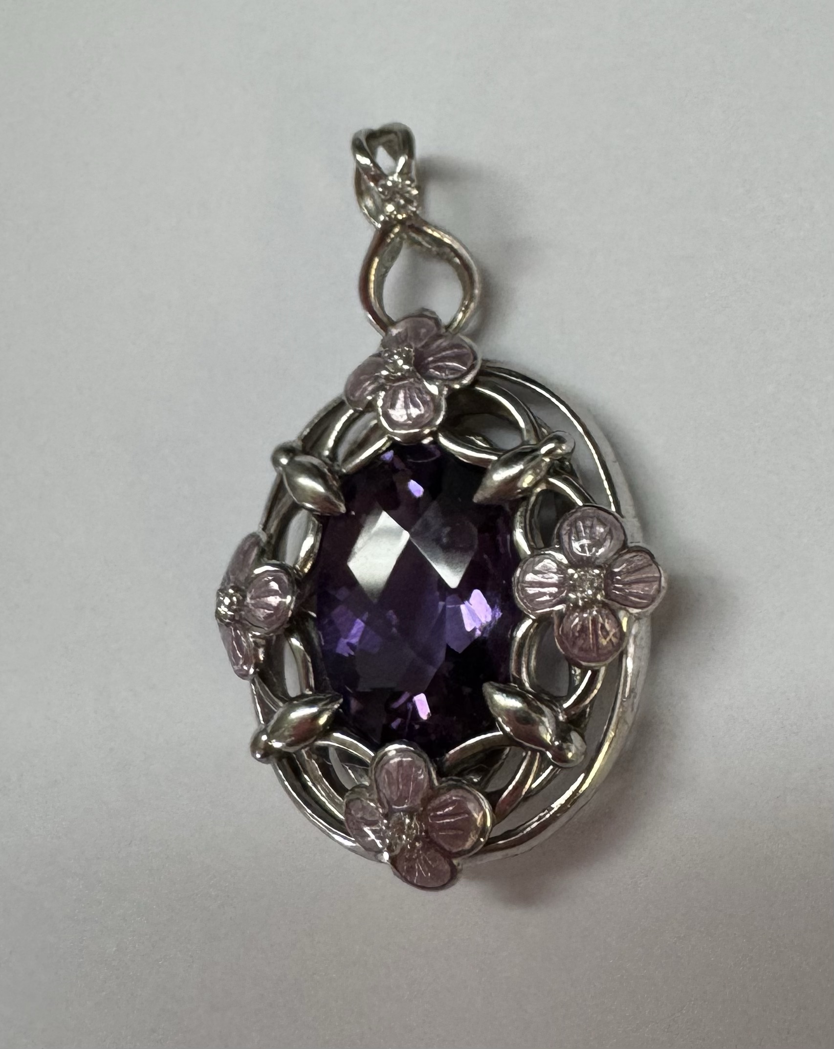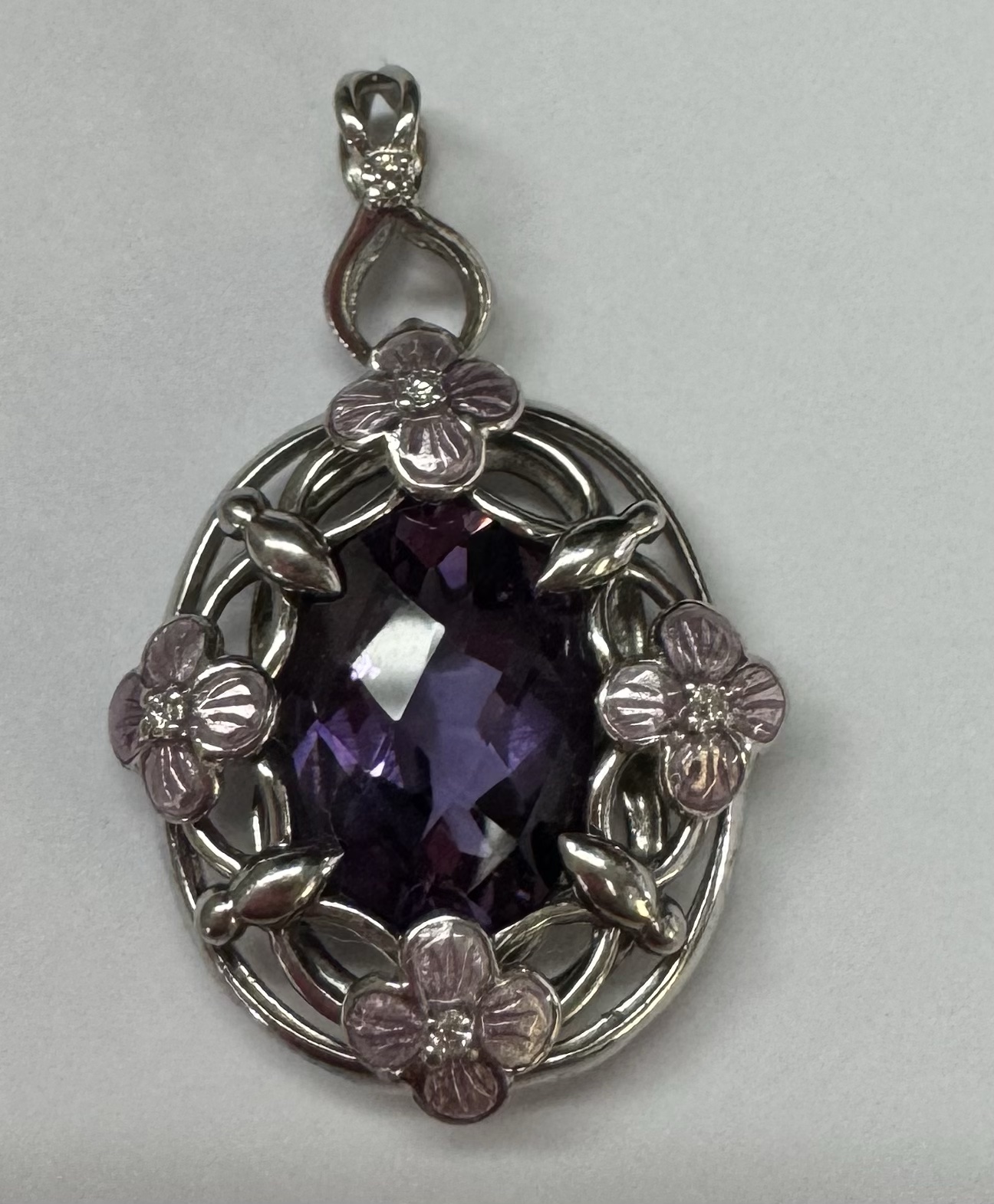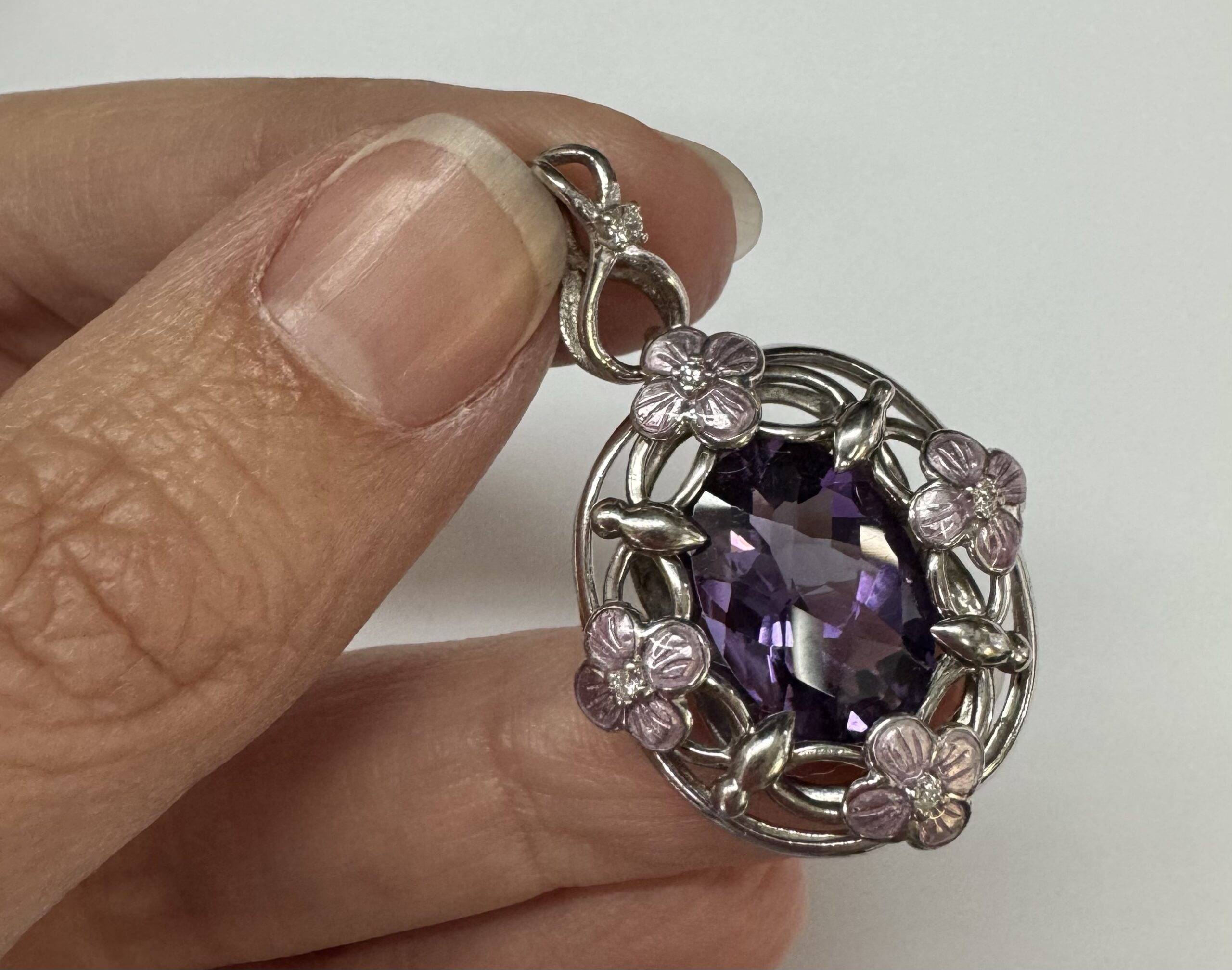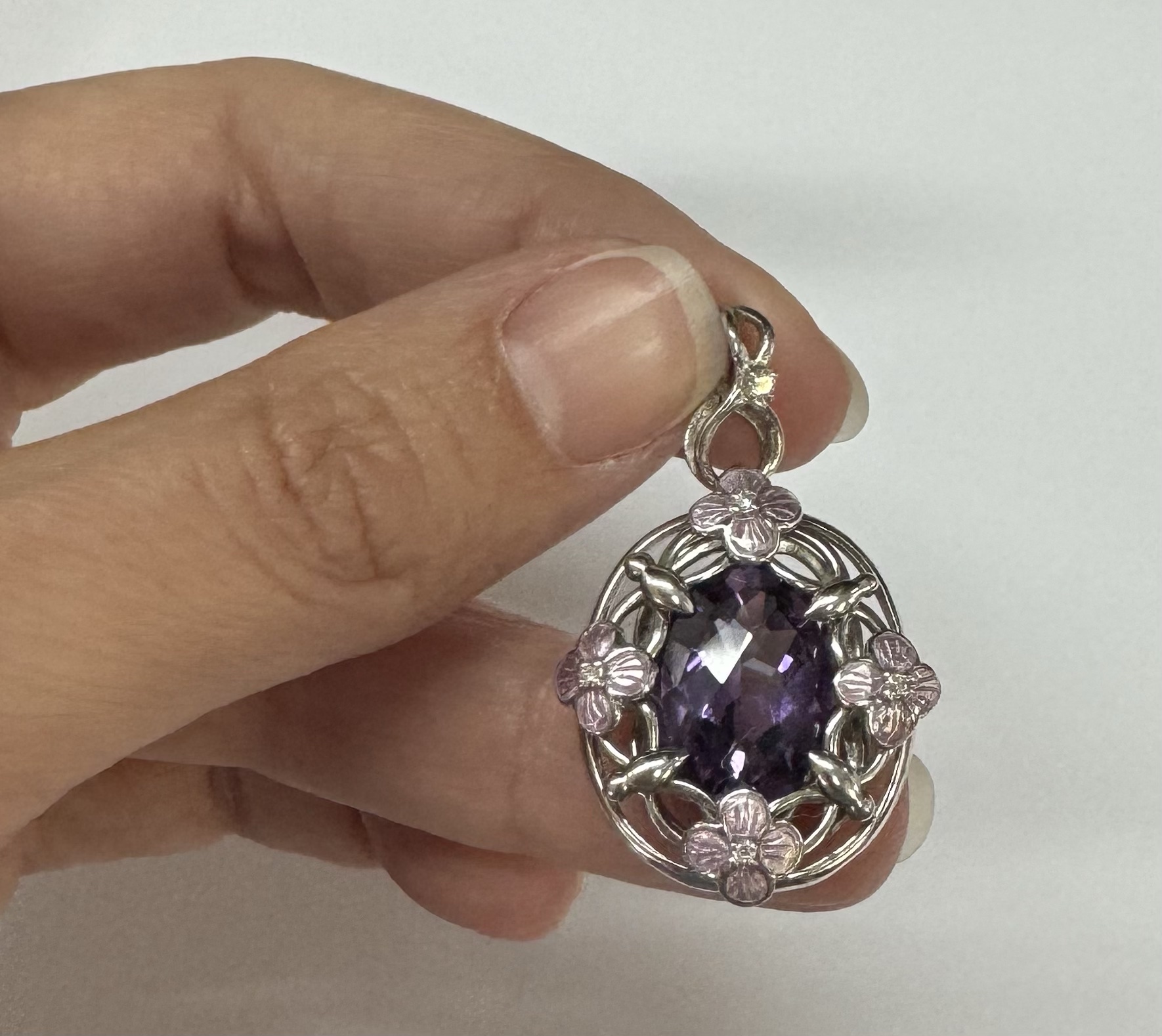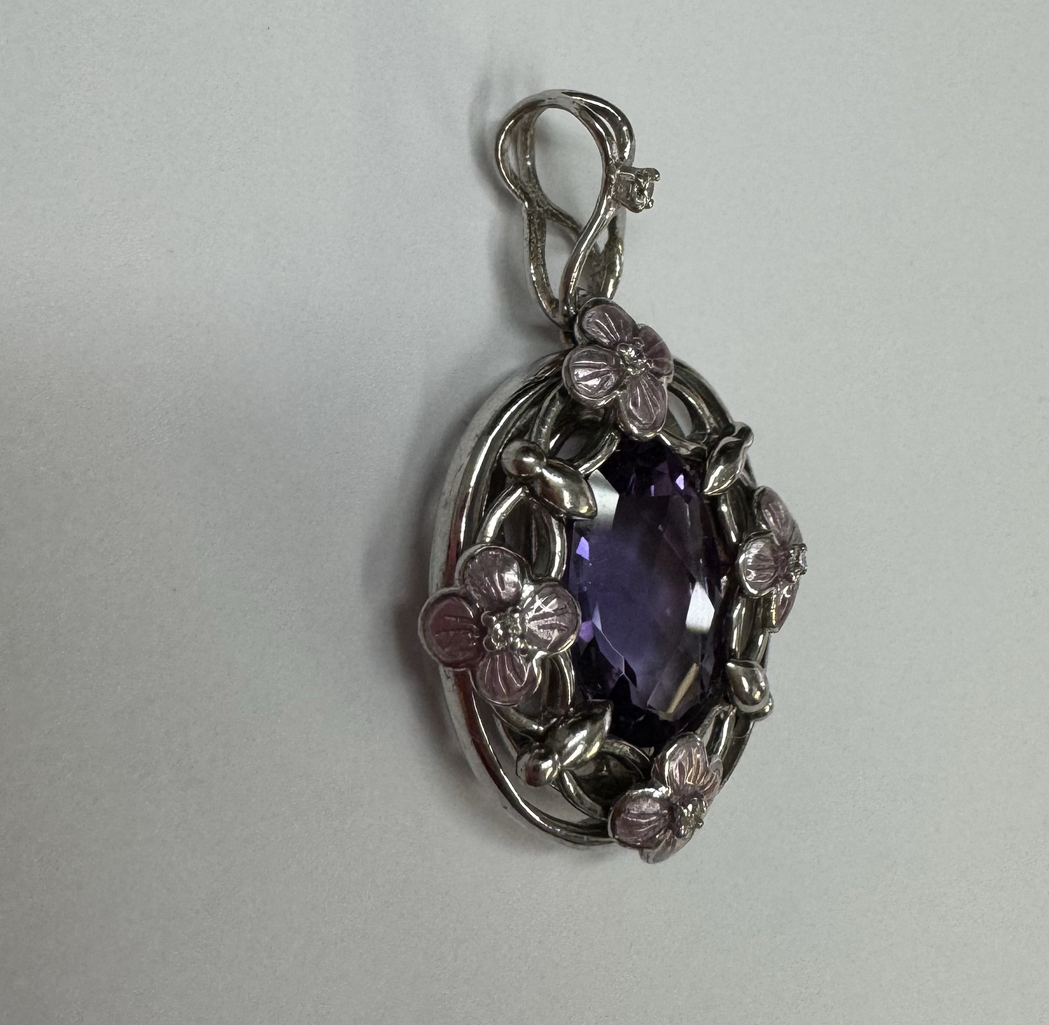 One-of-a-kind antique Sterling Silver genuine oval shaped, faceted Amethyst pendant of an openwork motif, with genuine Diamond accents & enameled flowers & birds. This pendant has an entire weight of 6.6 grams.