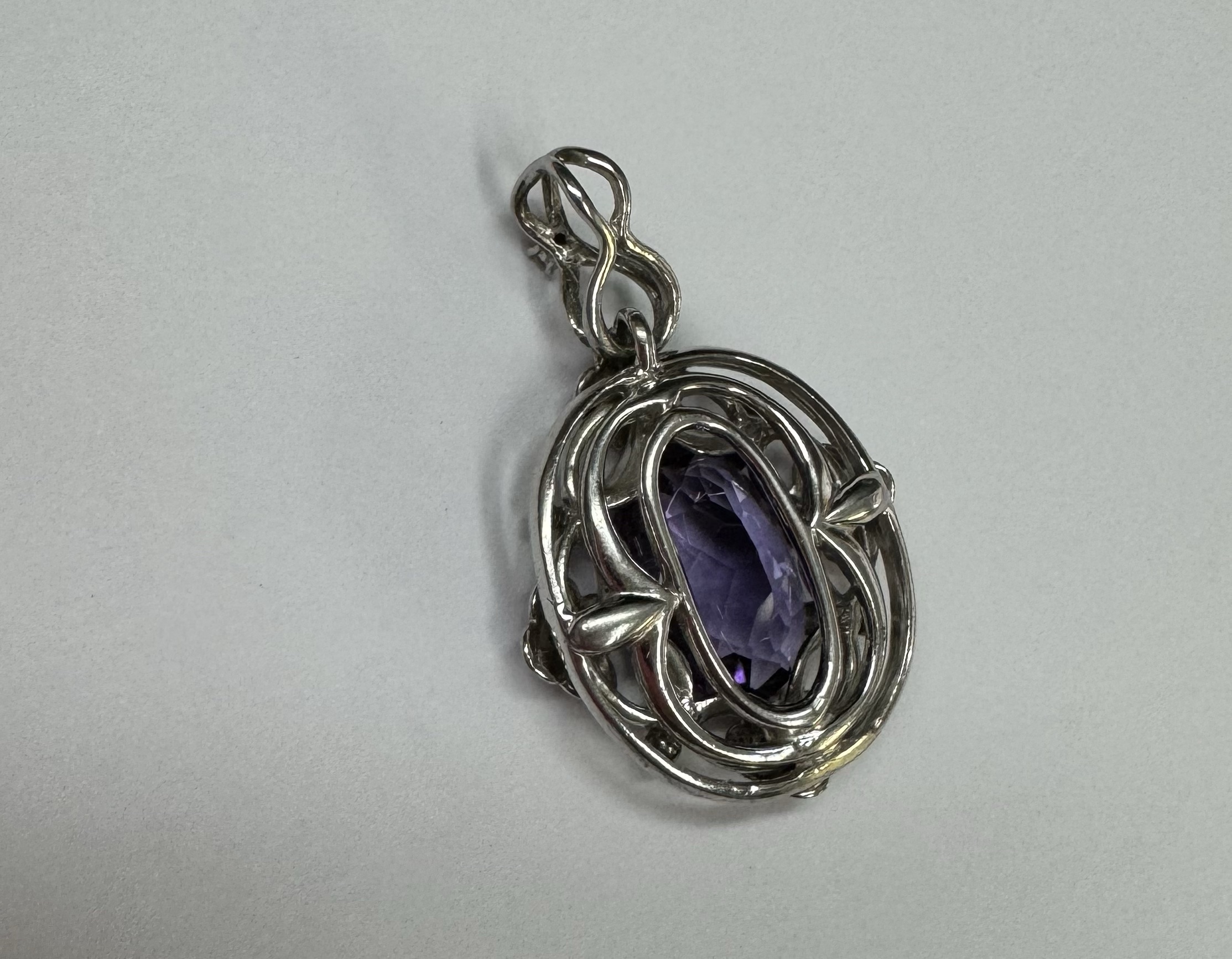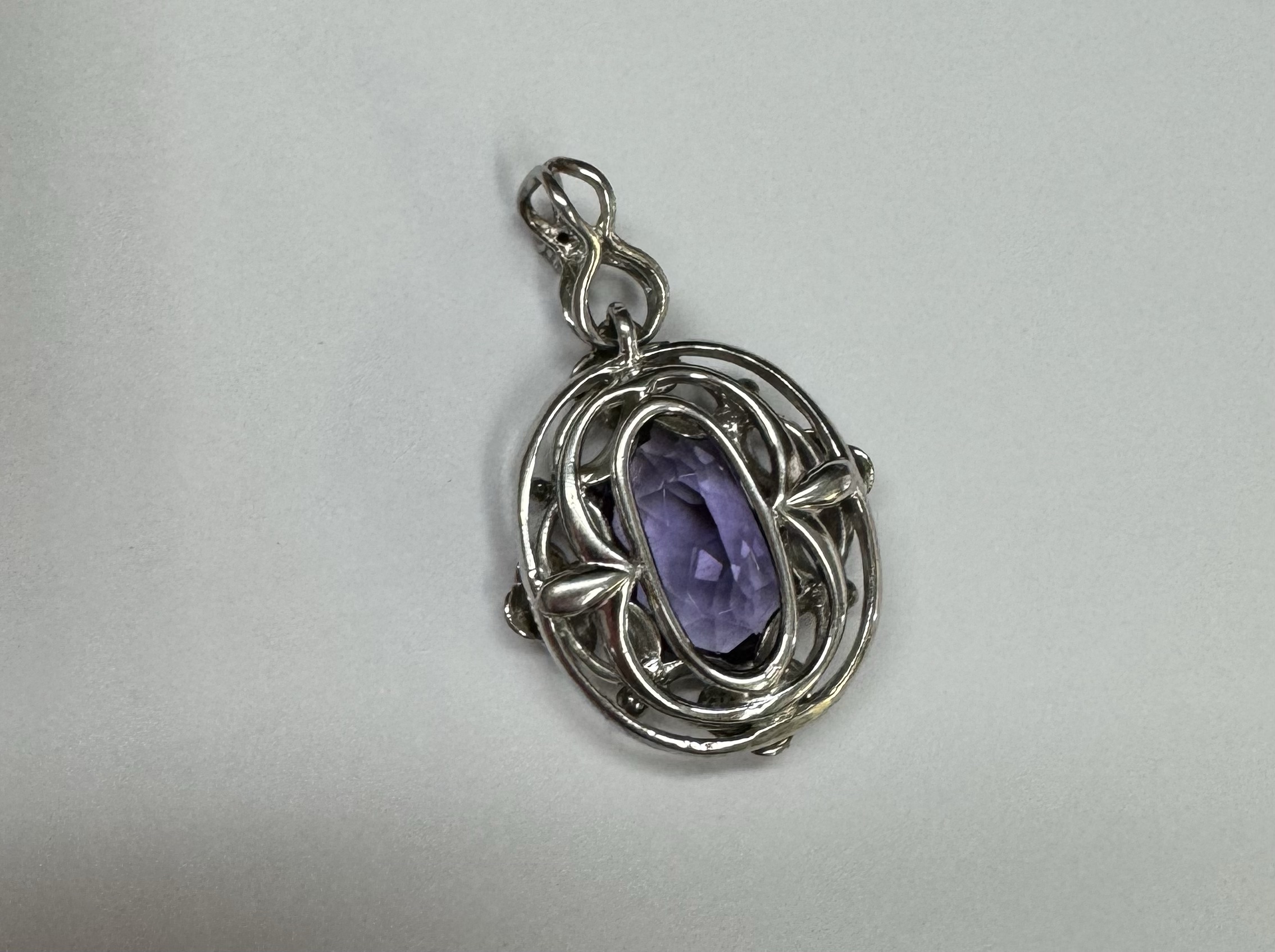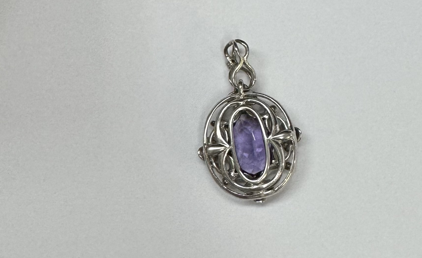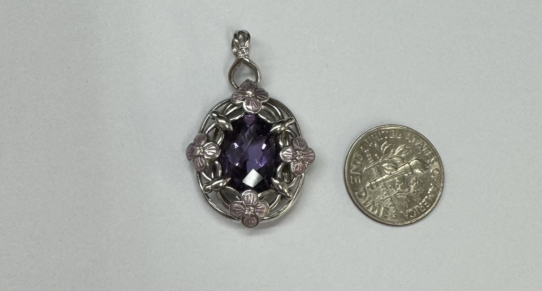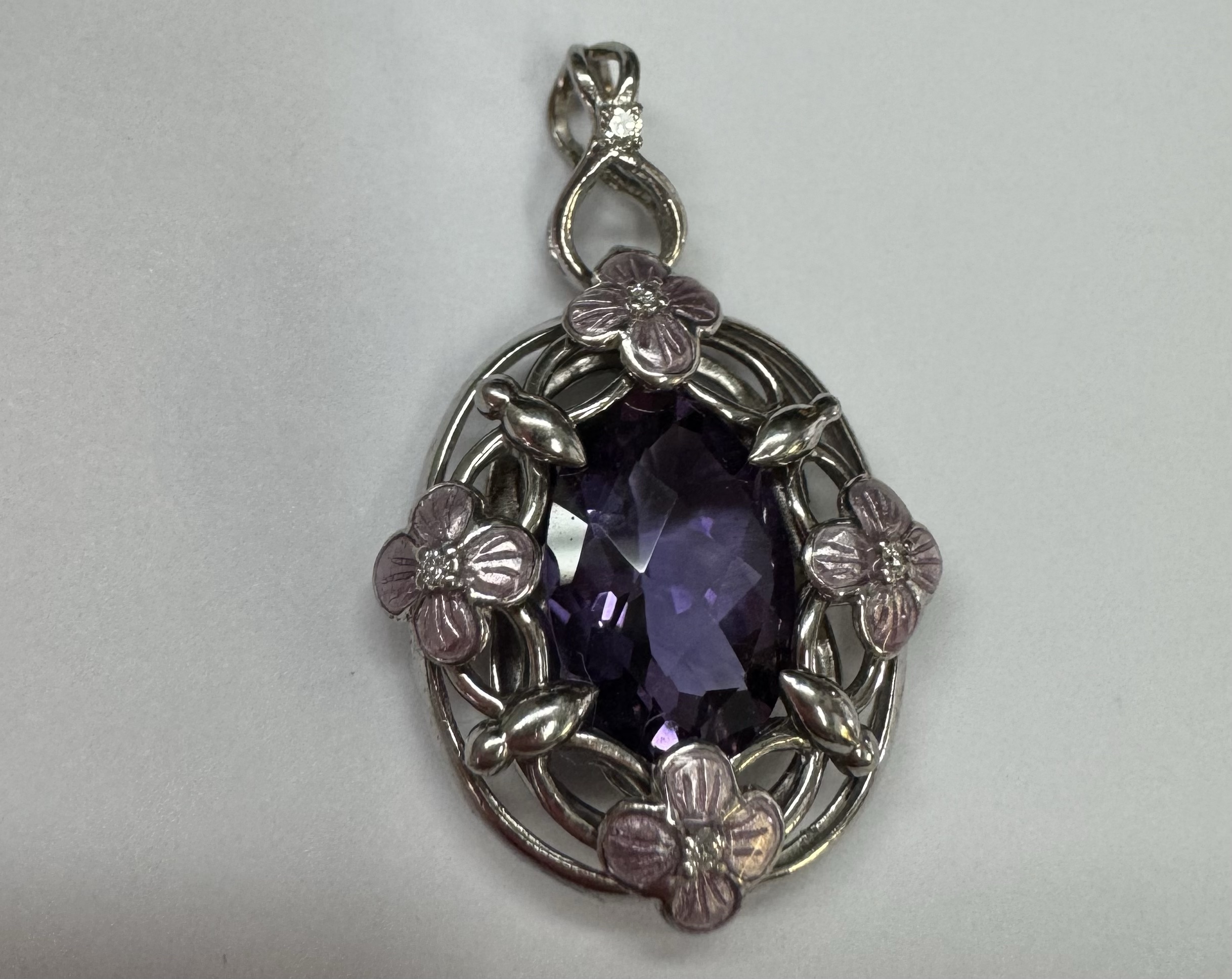 One-of-a-kind antique Sterling Silver genuine oval shaped, faceted Amethyst pendant of an openwork motif, with genuine Diamond accents & enameled flowers & birds. This pendant has an entire weight of 6.6 grams.