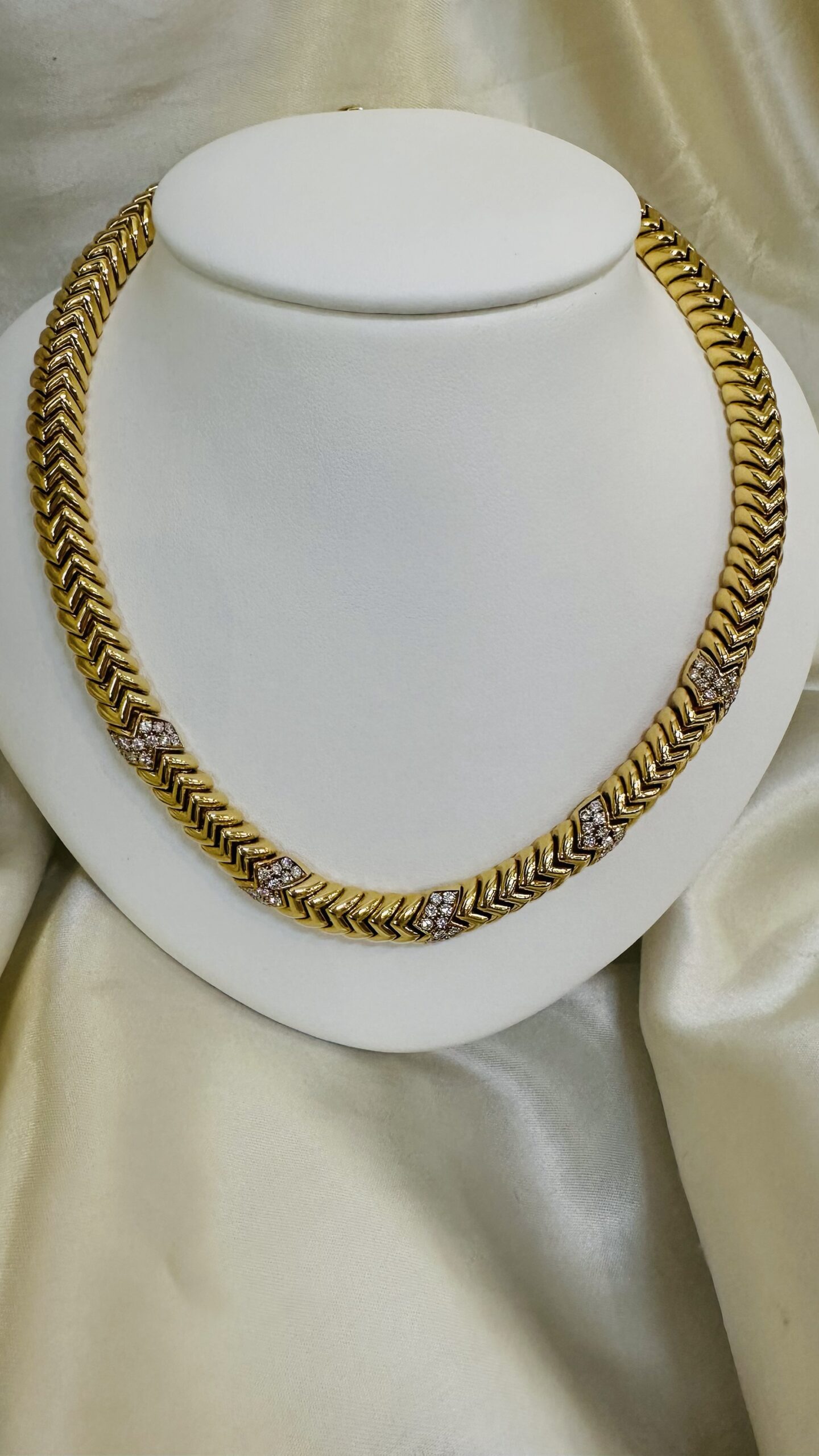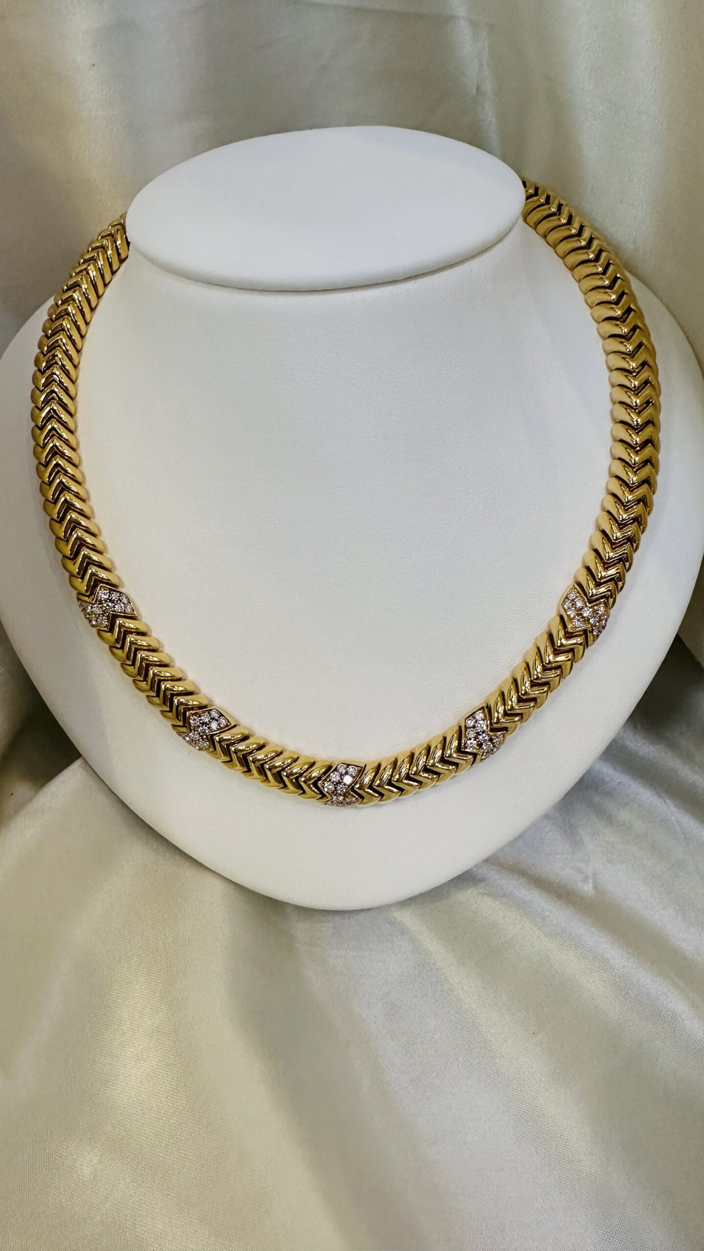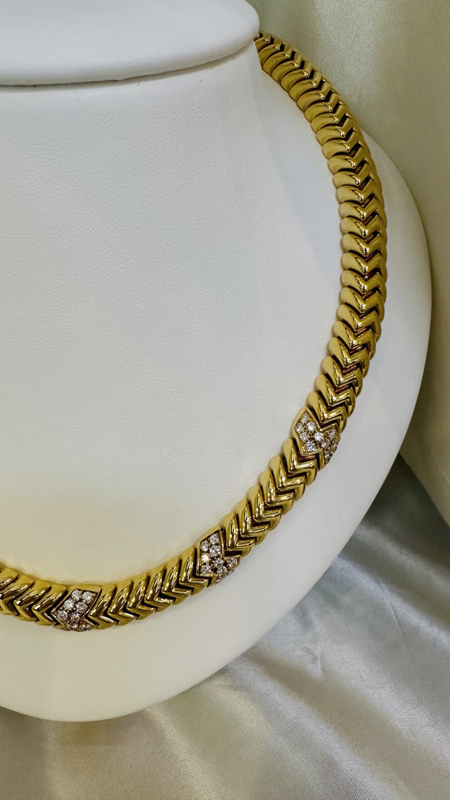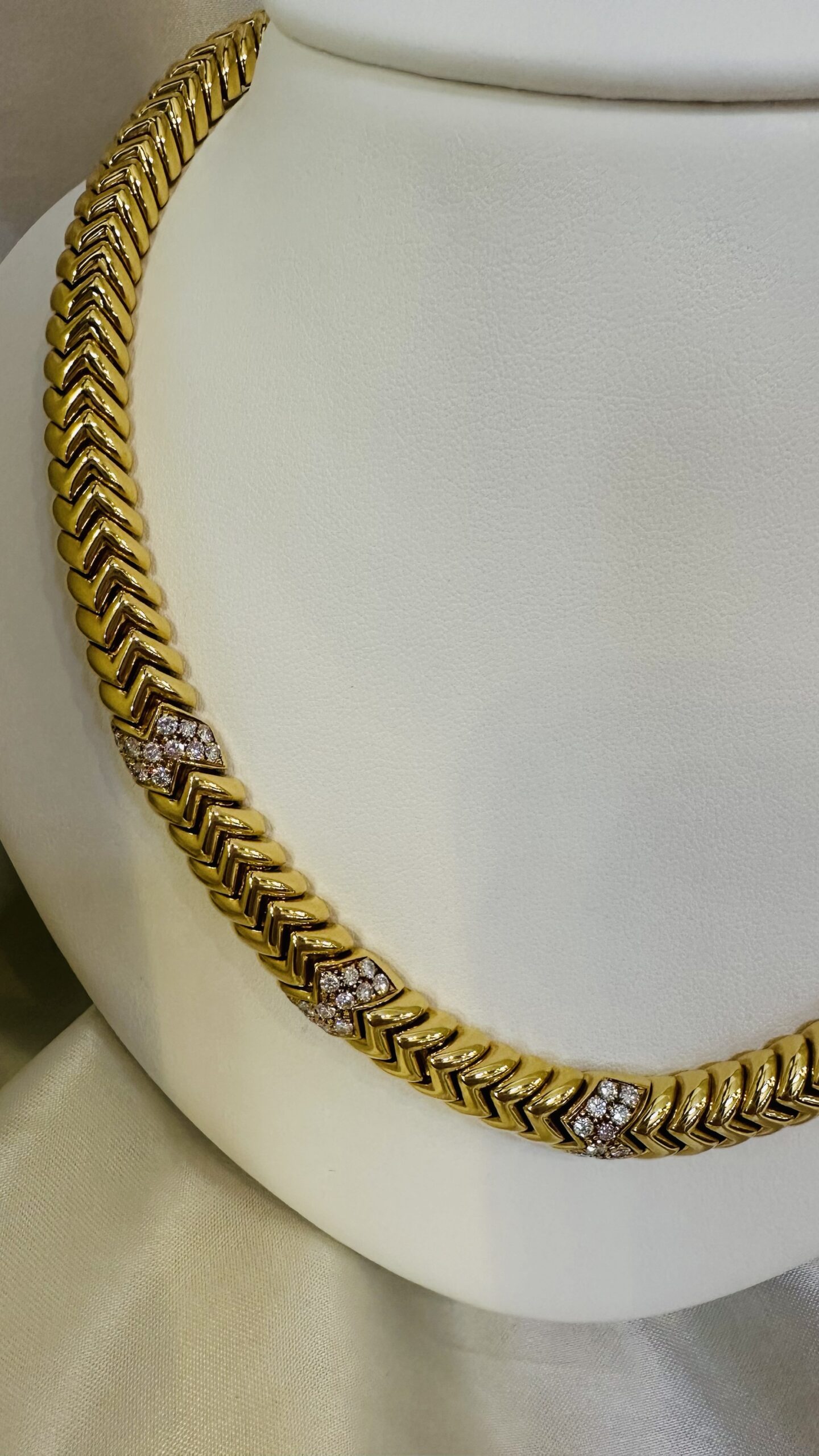 Authentic like-new (pre-owned but in excellent condition) Bulgari “Spiga” genuine diamond necklace made of 18k yellow gold. This necklace contains 60 genuine Round Brilliant Cut diamonds which have a total combined weight of 1.80 carats. These diamonds average G-H in color and VS in clarity. These diamonds are nicely proportioned and well finished. This necklace measures approximately 17.5″ in length and it has an entire weight of 131.8 grams! This piece is accompanied by the original box and an appraisal for insurance. This piece sells for $40,000 and up elsewhere.