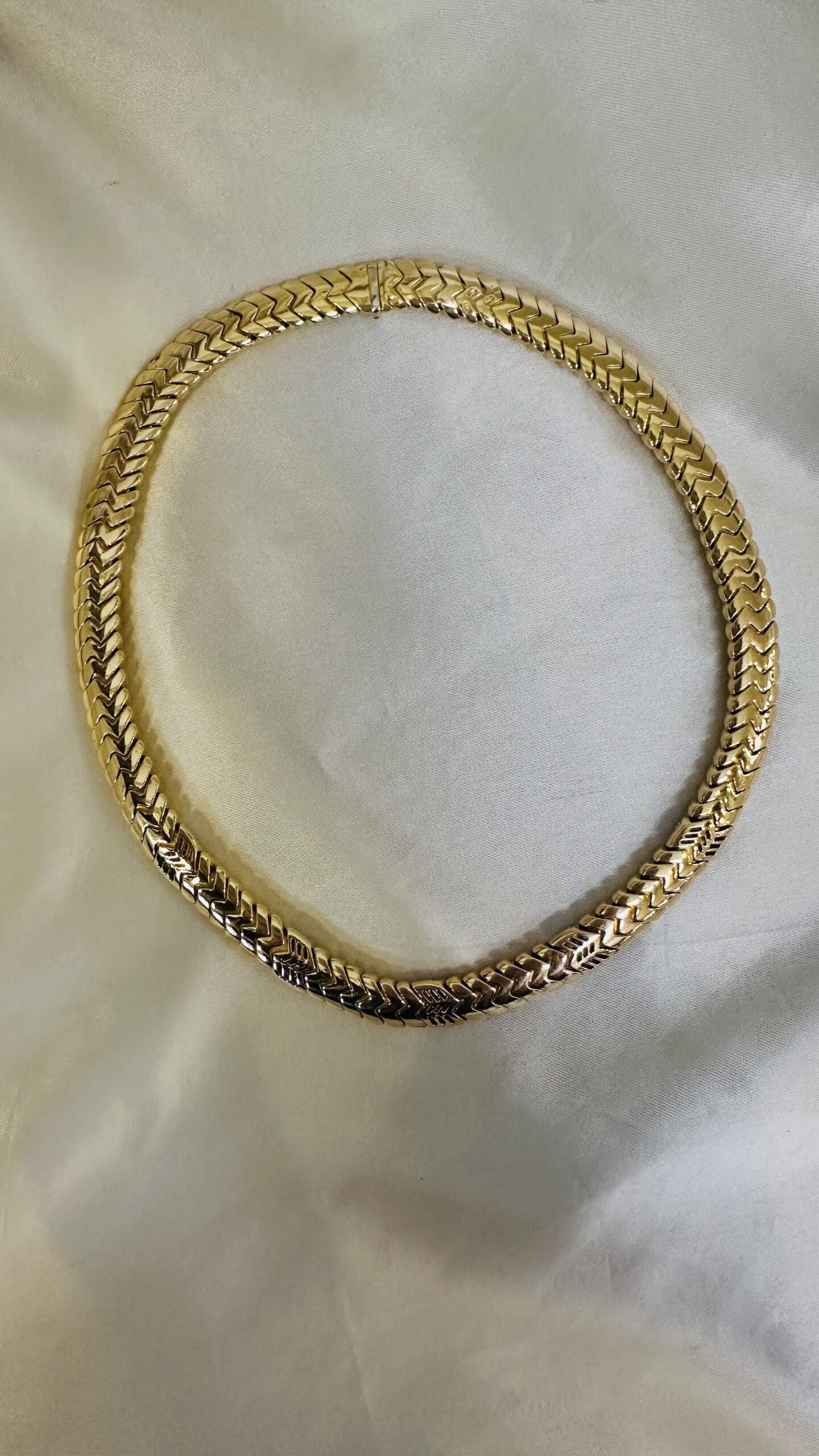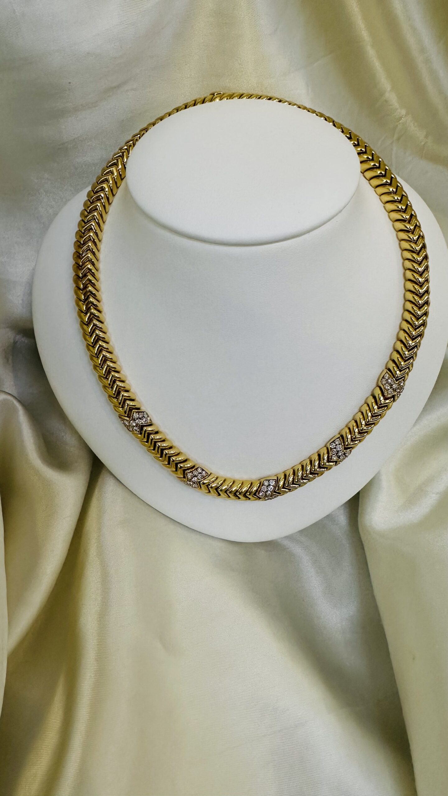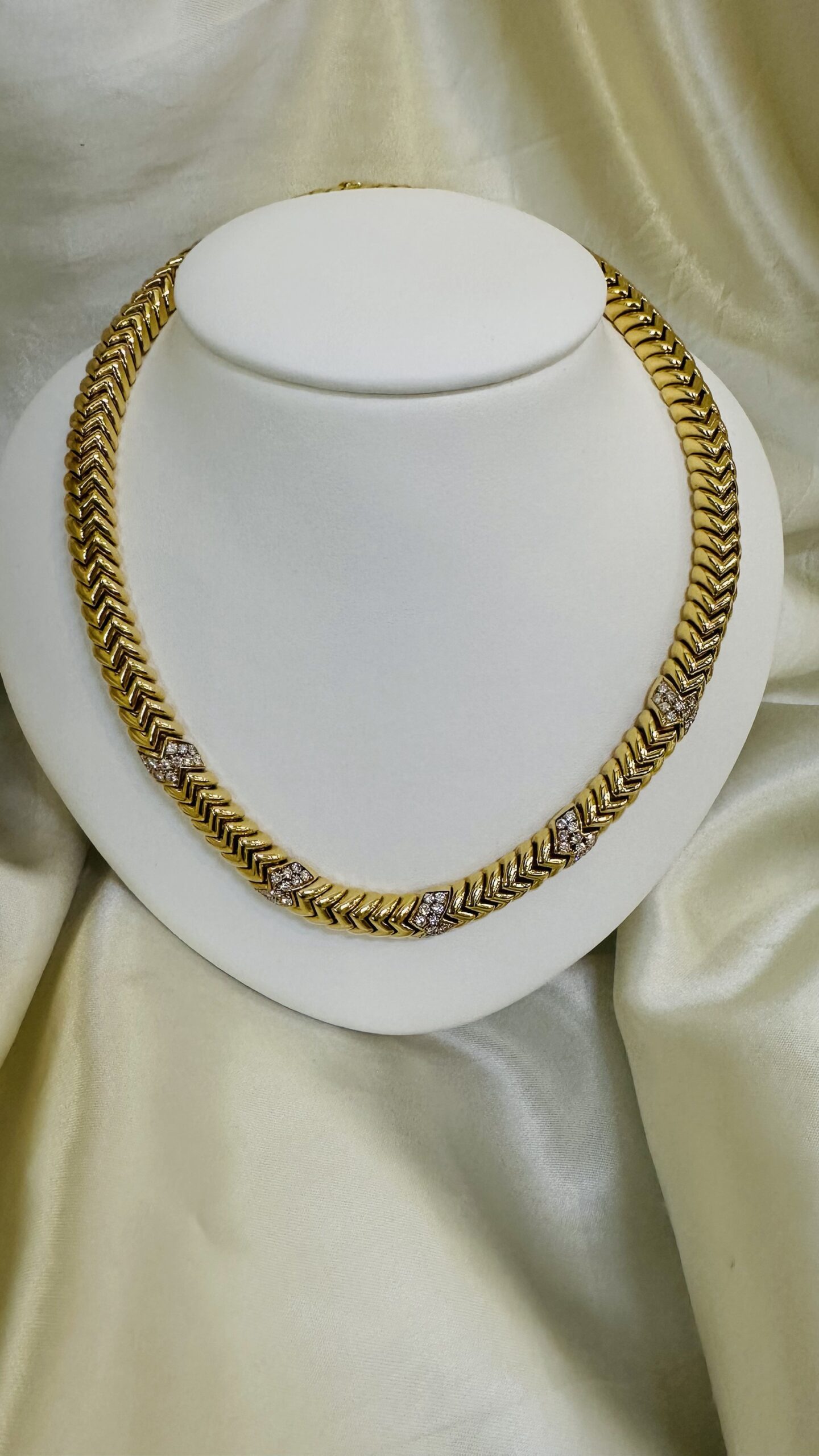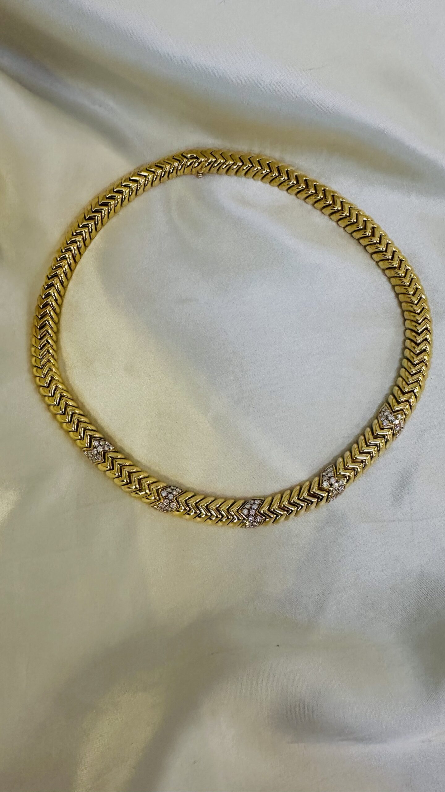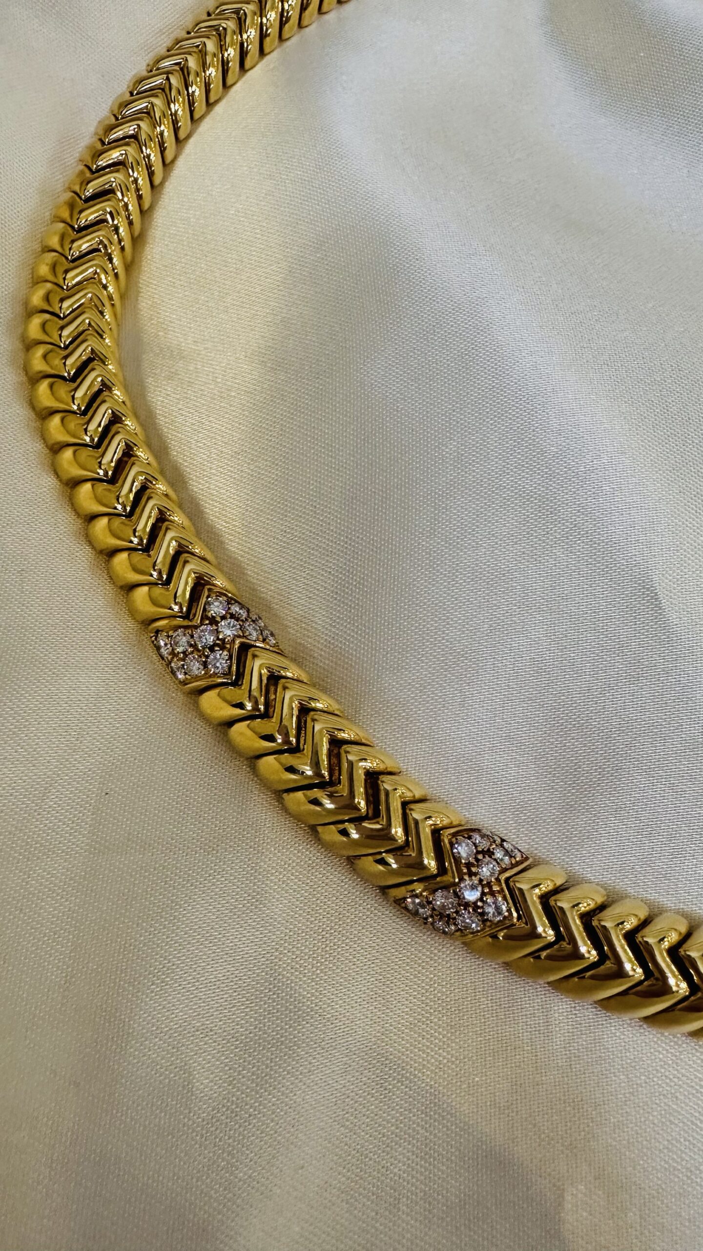 Authentic like-new (pre-owned but in excellent condition) Bulgari “Spiga” genuine diamond necklace made of 18k yellow gold. This necklace contains 60 genuine Round Brilliant Cut diamonds which have a total combined weight of 1.80 carats. These diamonds average G-H in color and VS in clarity. These diamonds are nicely proportioned and well finished. This necklace measures approximately 17.5″ in length and it has an entire weight of 131.8 grams! This piece is accompanied by the original box and an appraisal for insurance. This piece sells for $40,000 and up elsewhere.