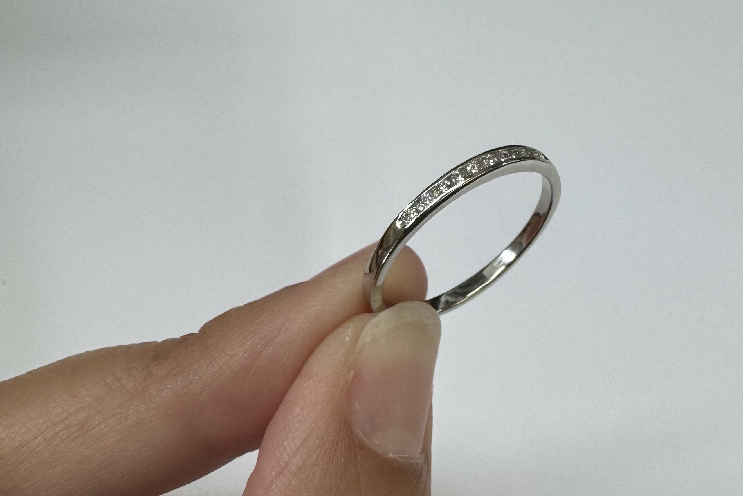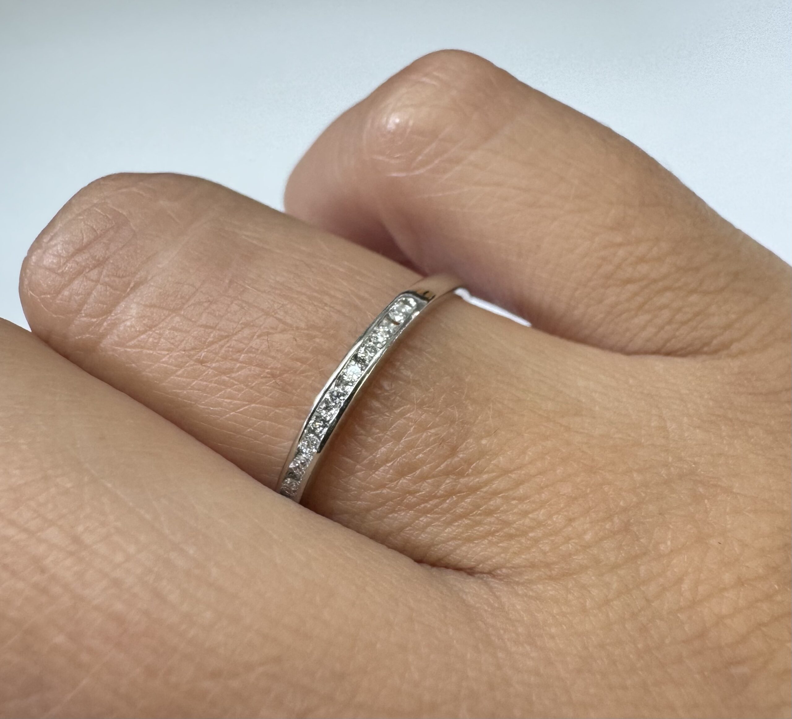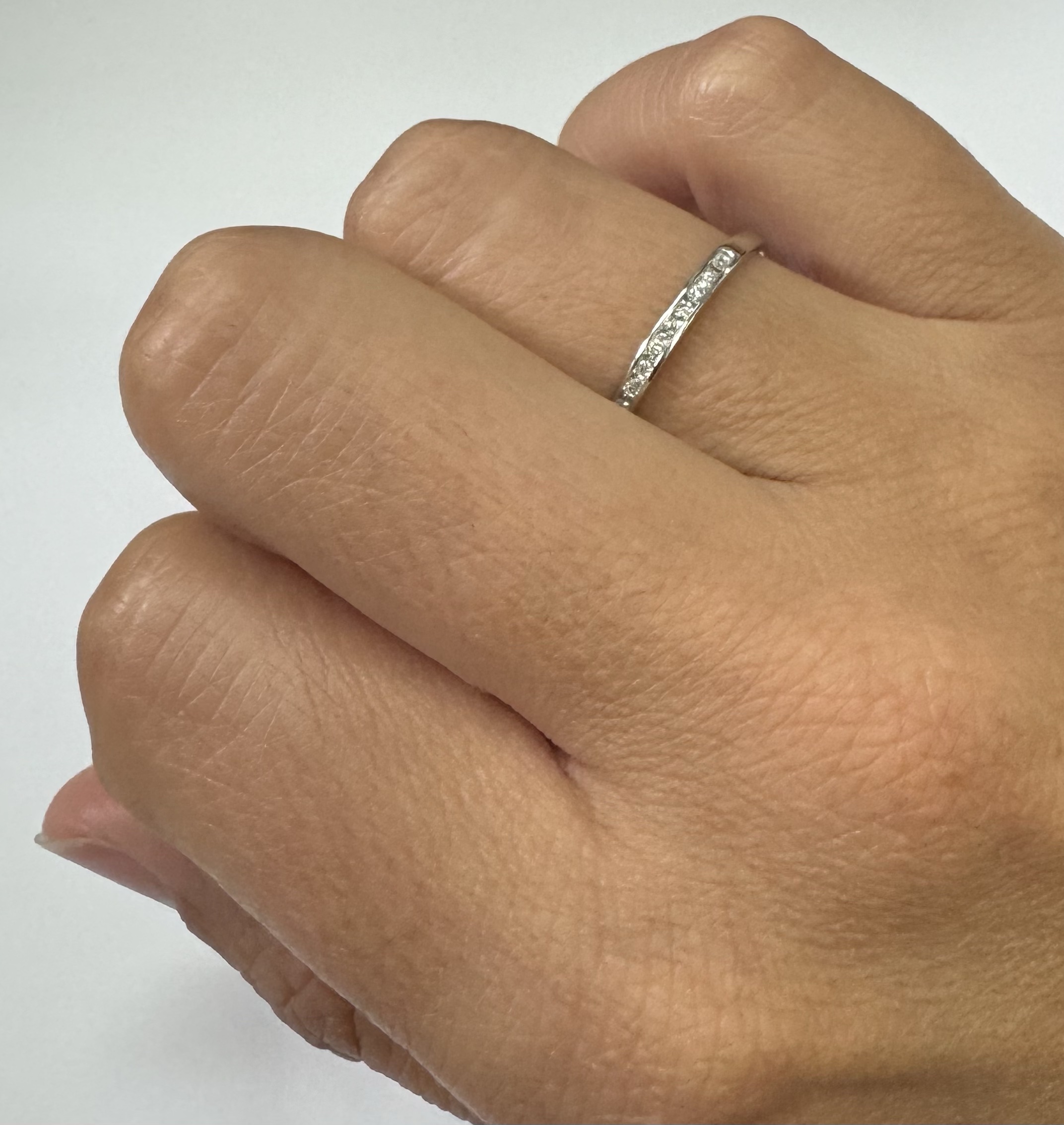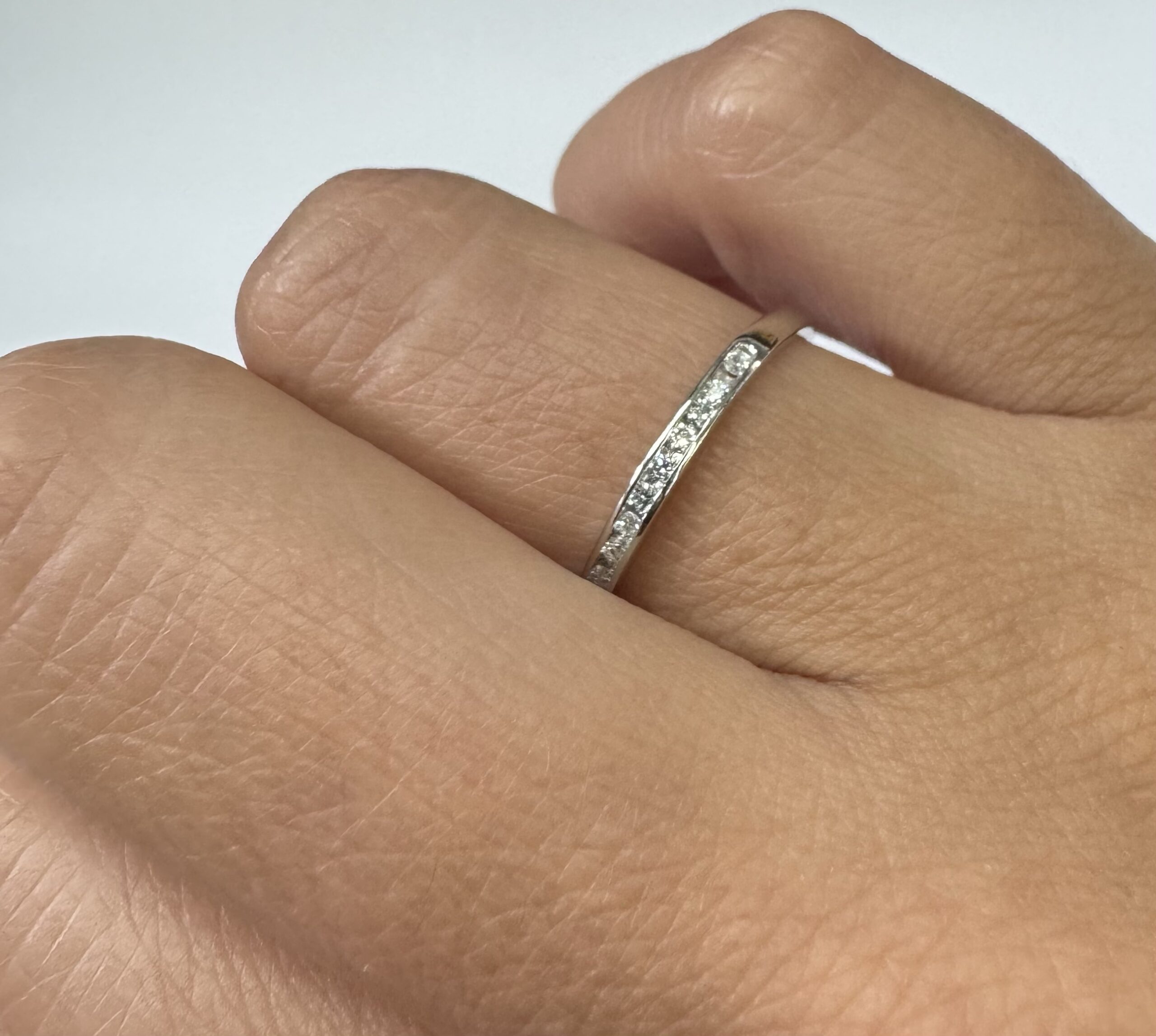 Custom made delicate channel set Platinum genuine .10 cttw Round Brilliant Cut diamond band. These diamonds average J in color and SI2 in clarity. This ring has an entire weight of 2.8 gems.