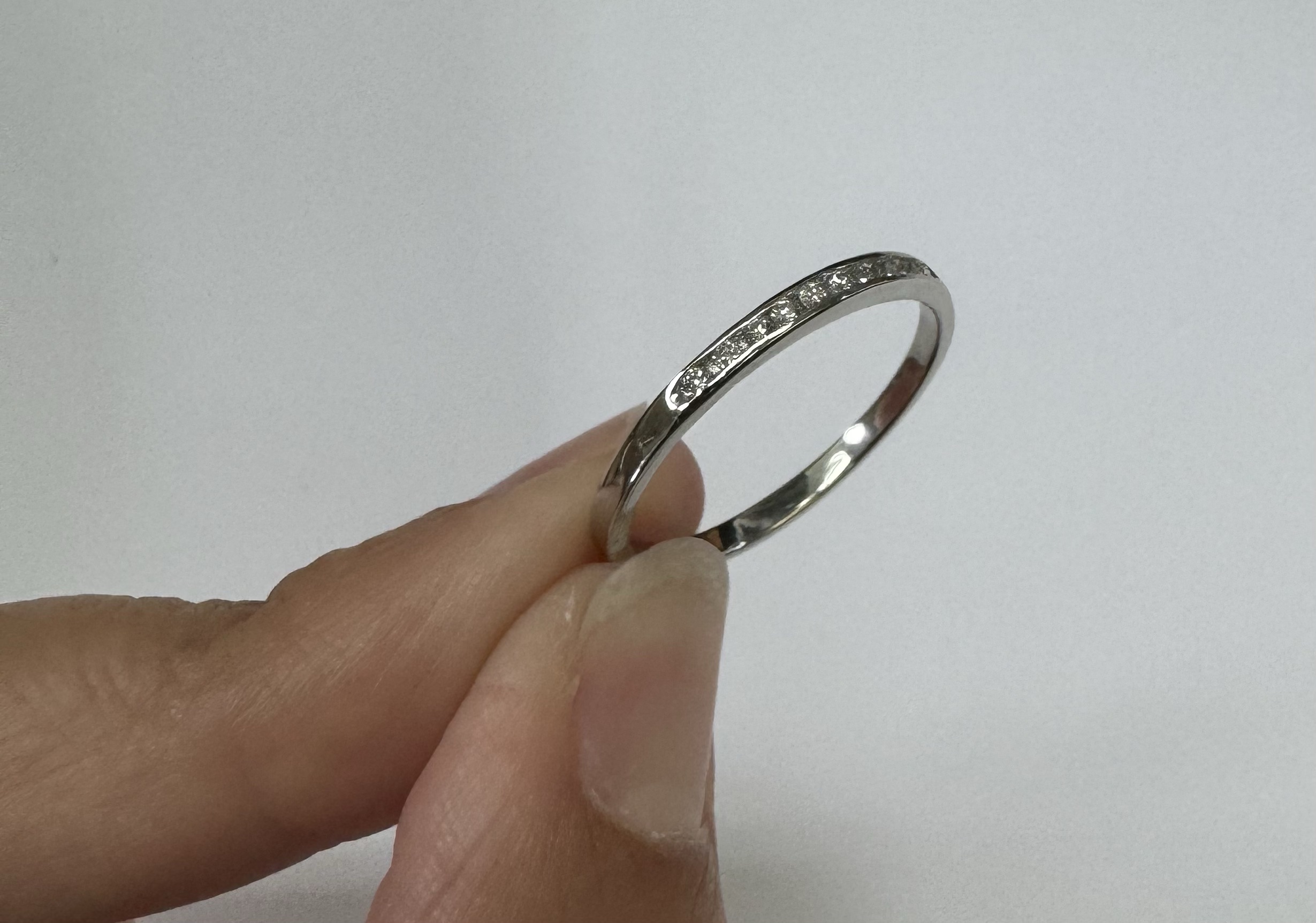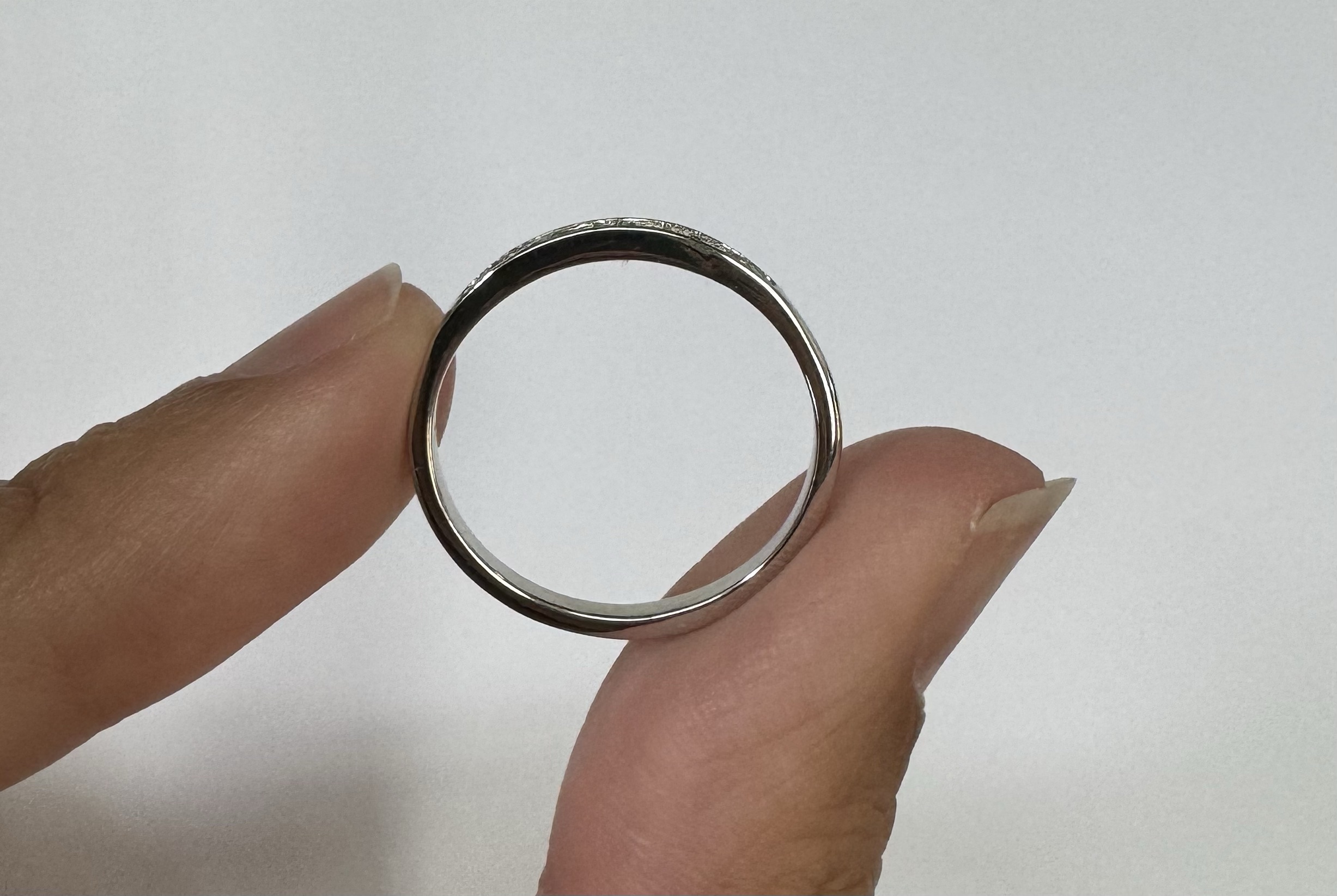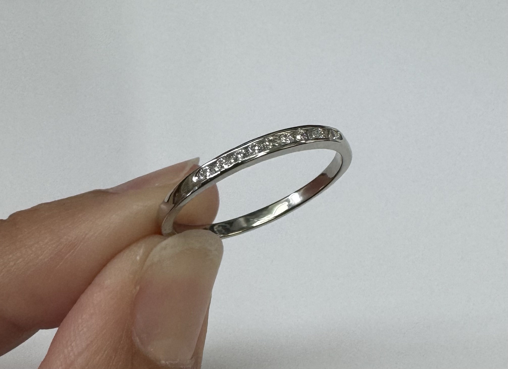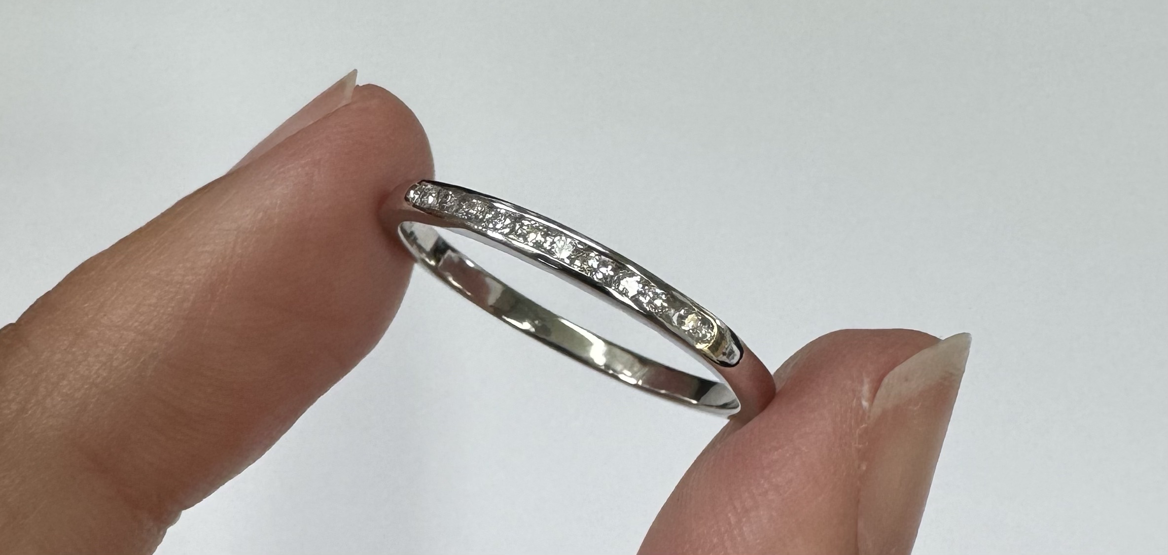 Custom made delicate channel set Platinum genuine .10 cttw Round Brilliant Cut diamond band. These diamonds average J in color and SI2 in clarity. This ring has an entire weight of 2.8 gems.