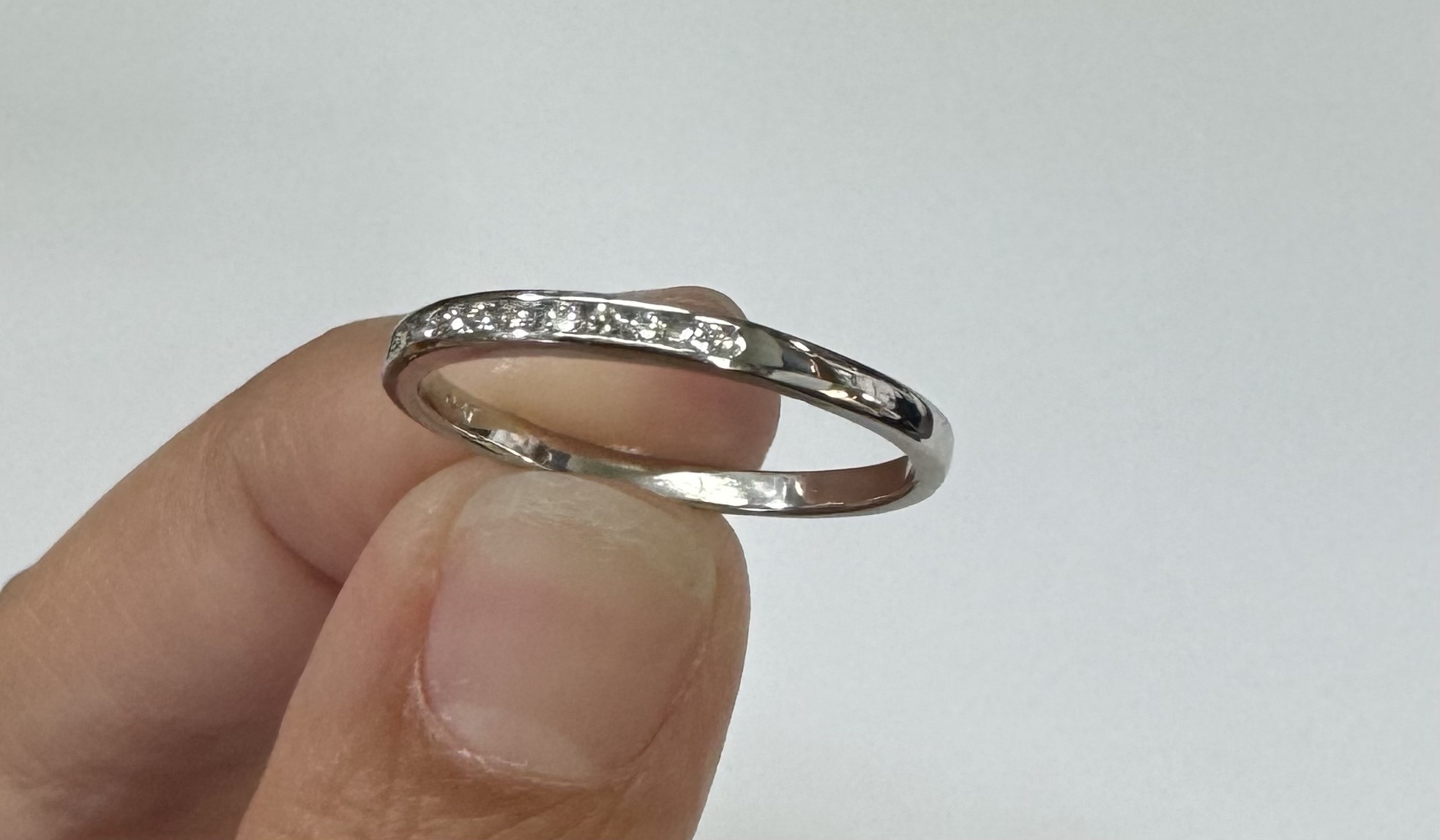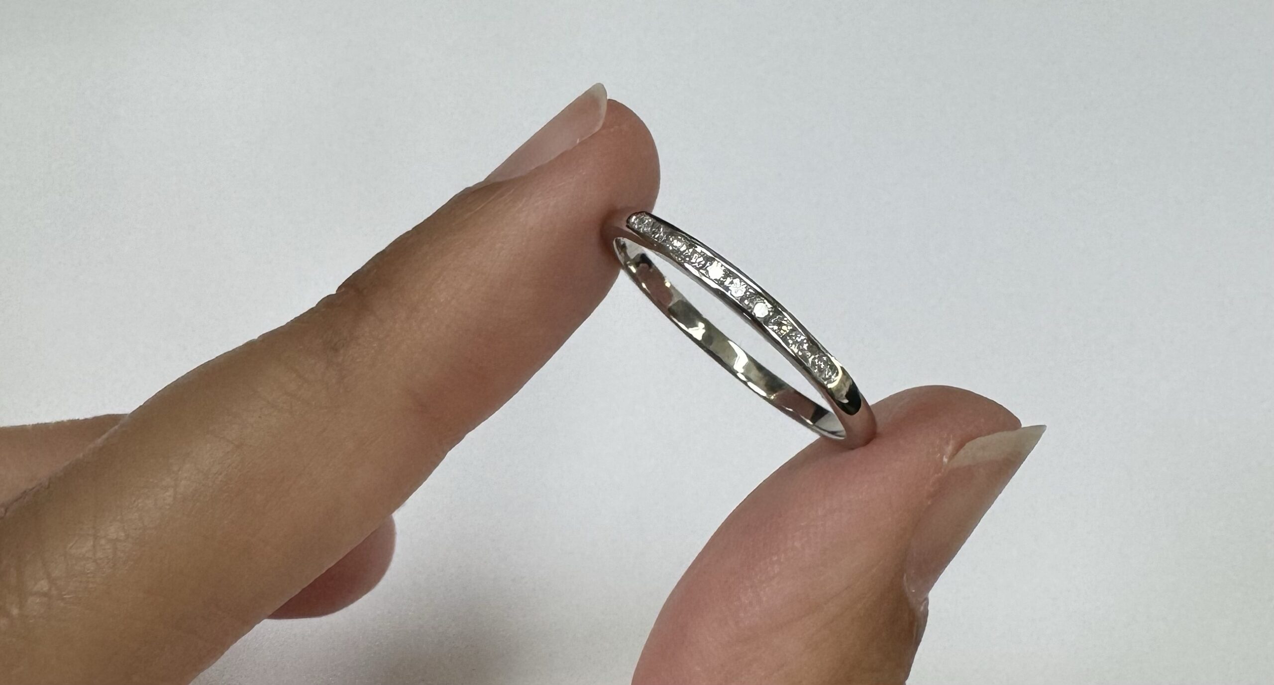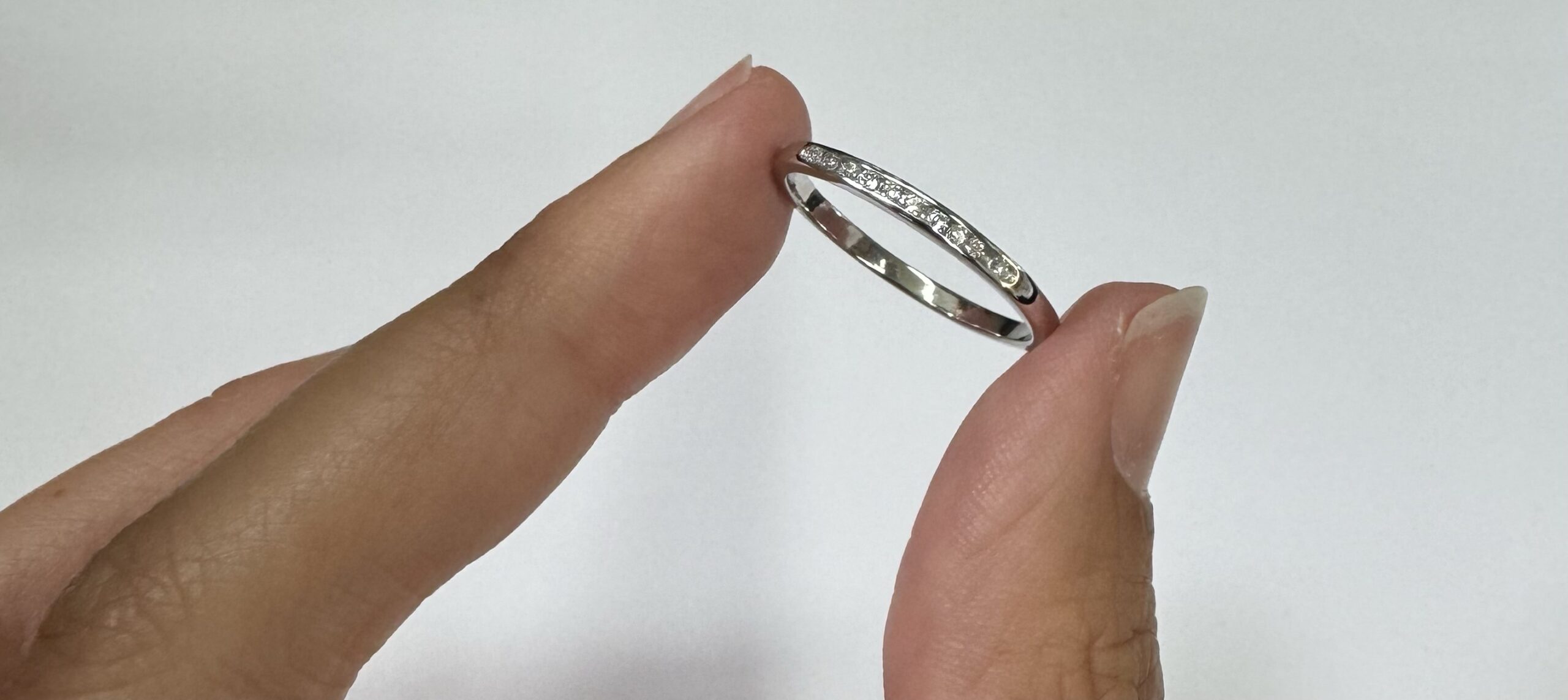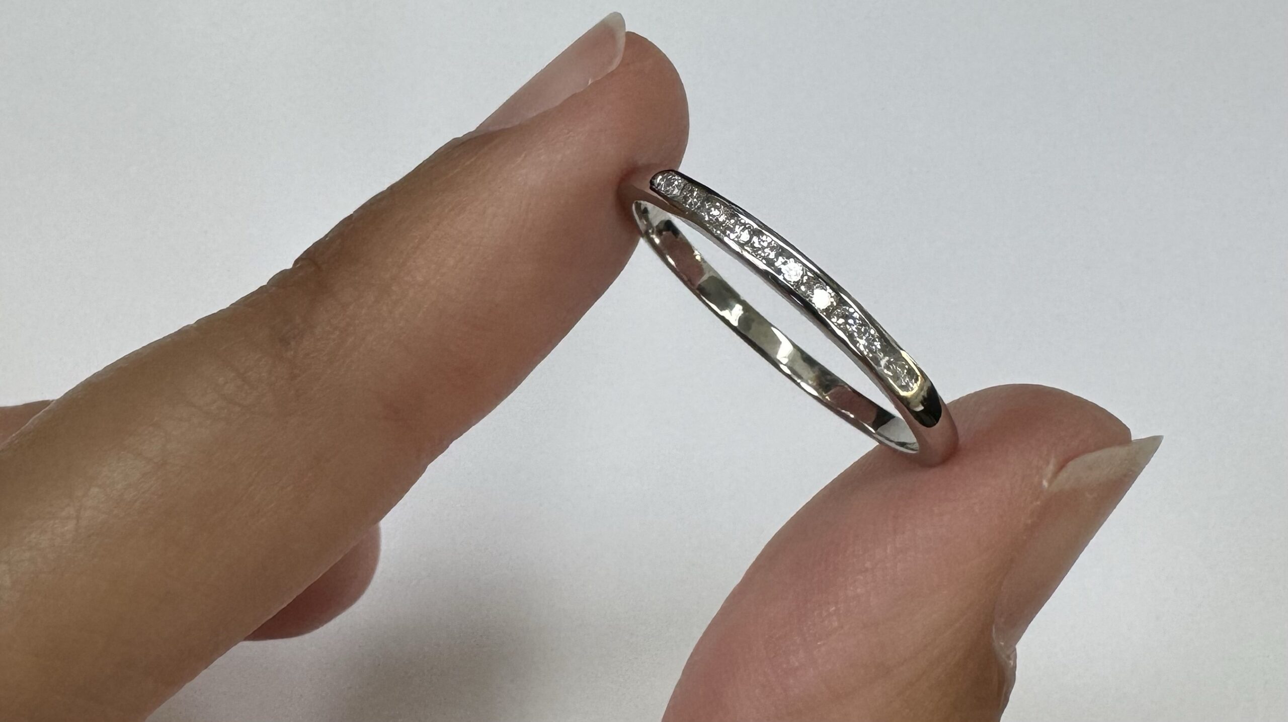 Custom made delicate channel set Platinum genuine .10 cttw Round Brilliant Cut diamond band. These diamonds average J in color and SI2 in clarity. This ring has an entire weight of 2.8 gems.
