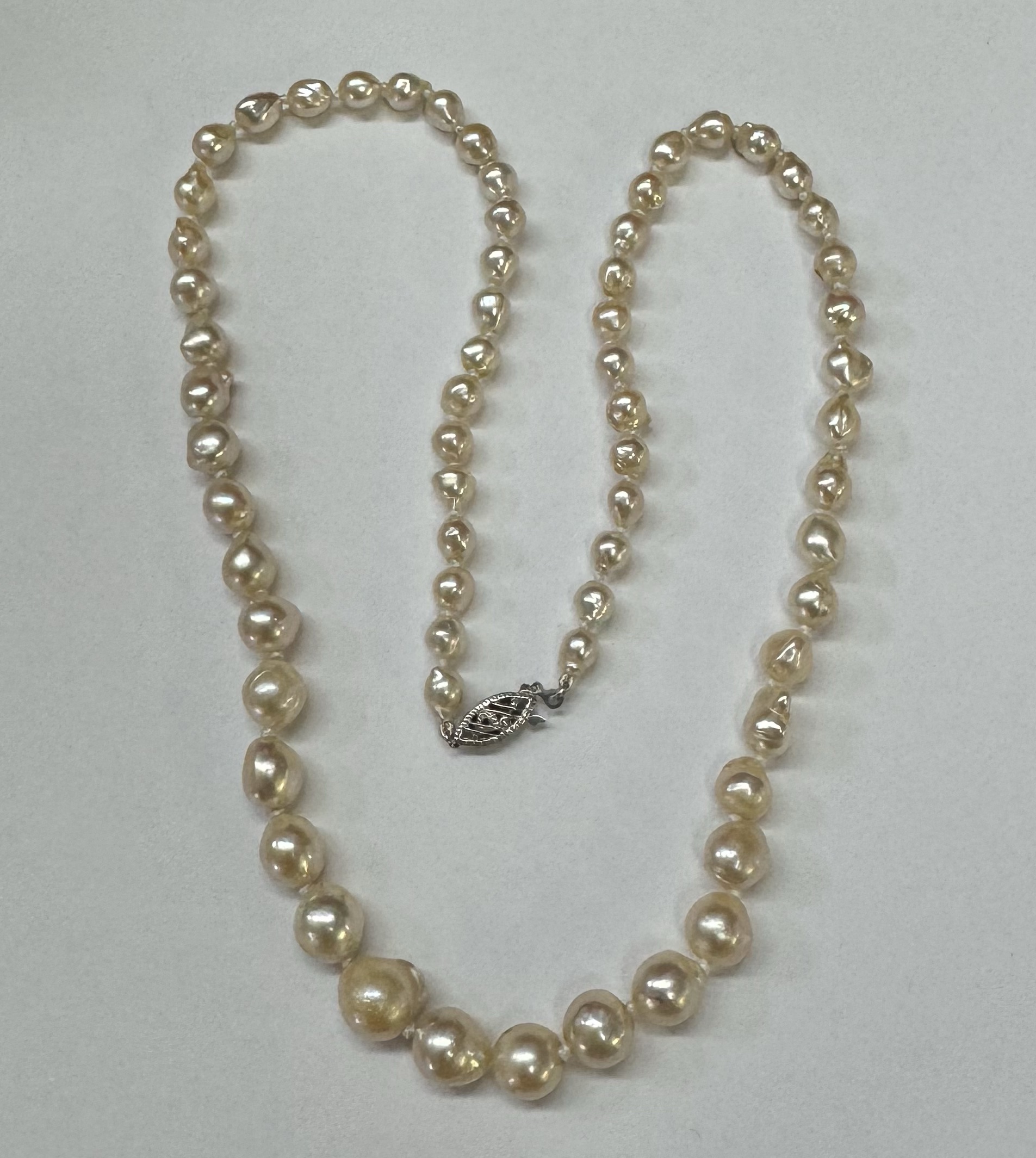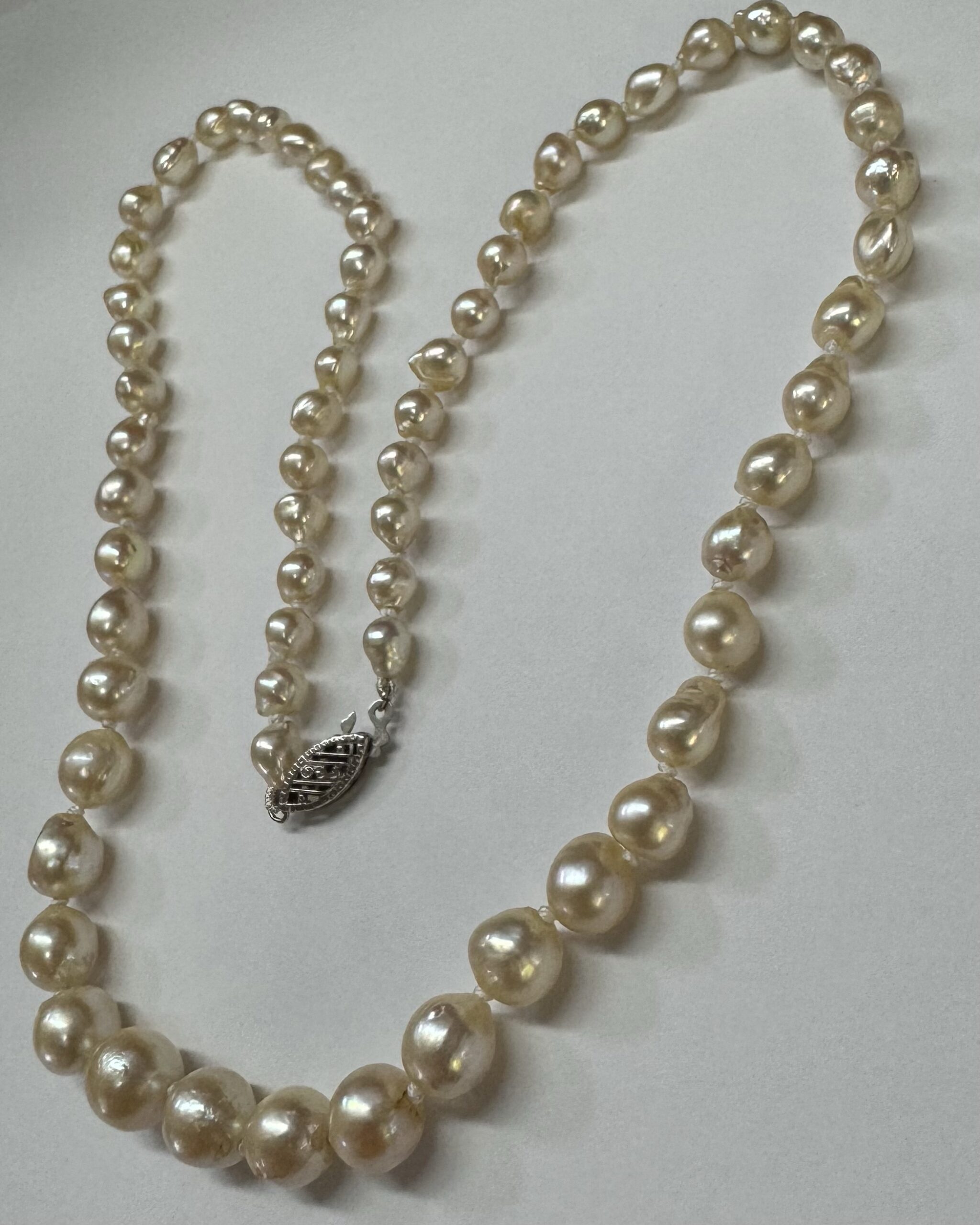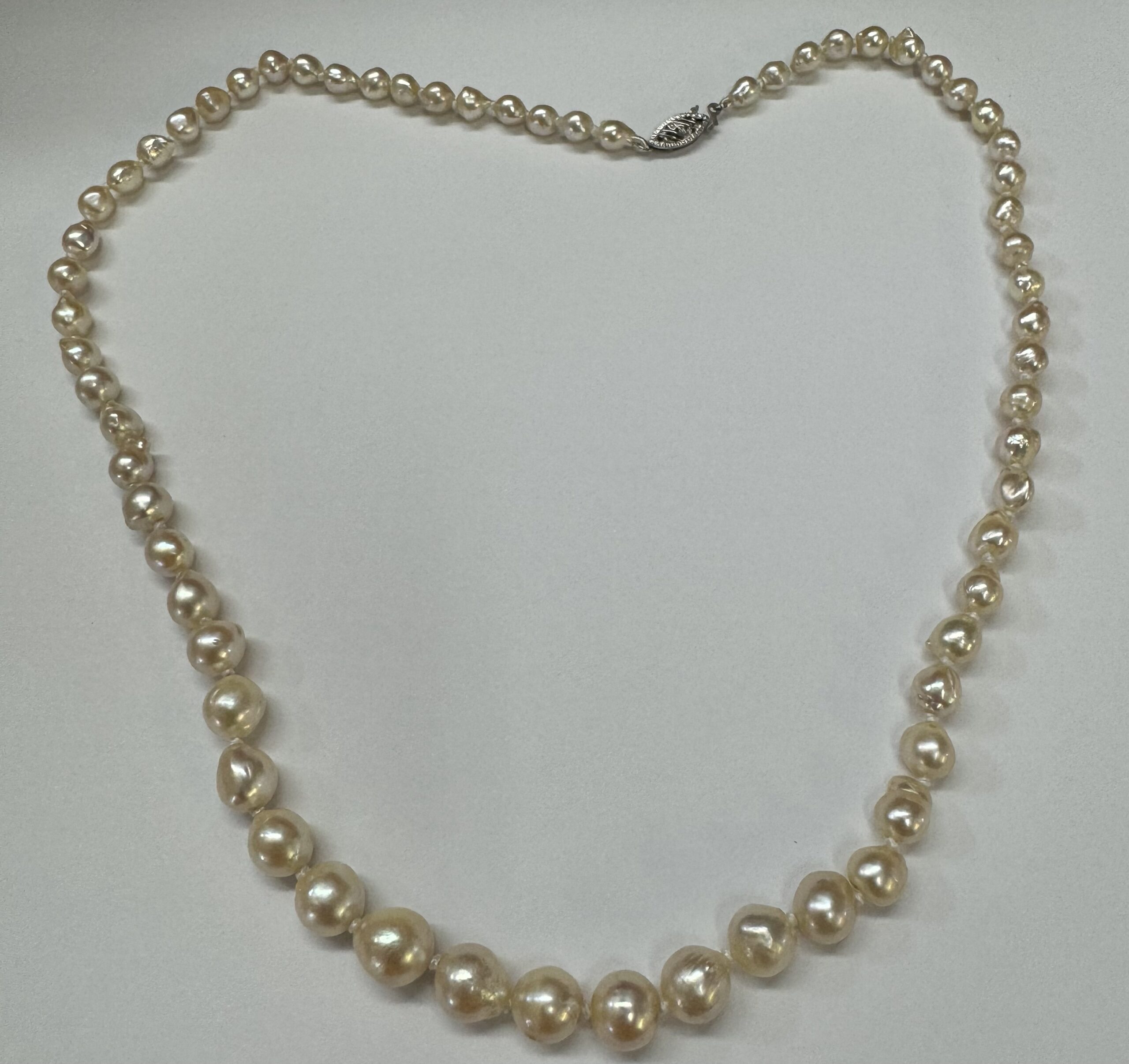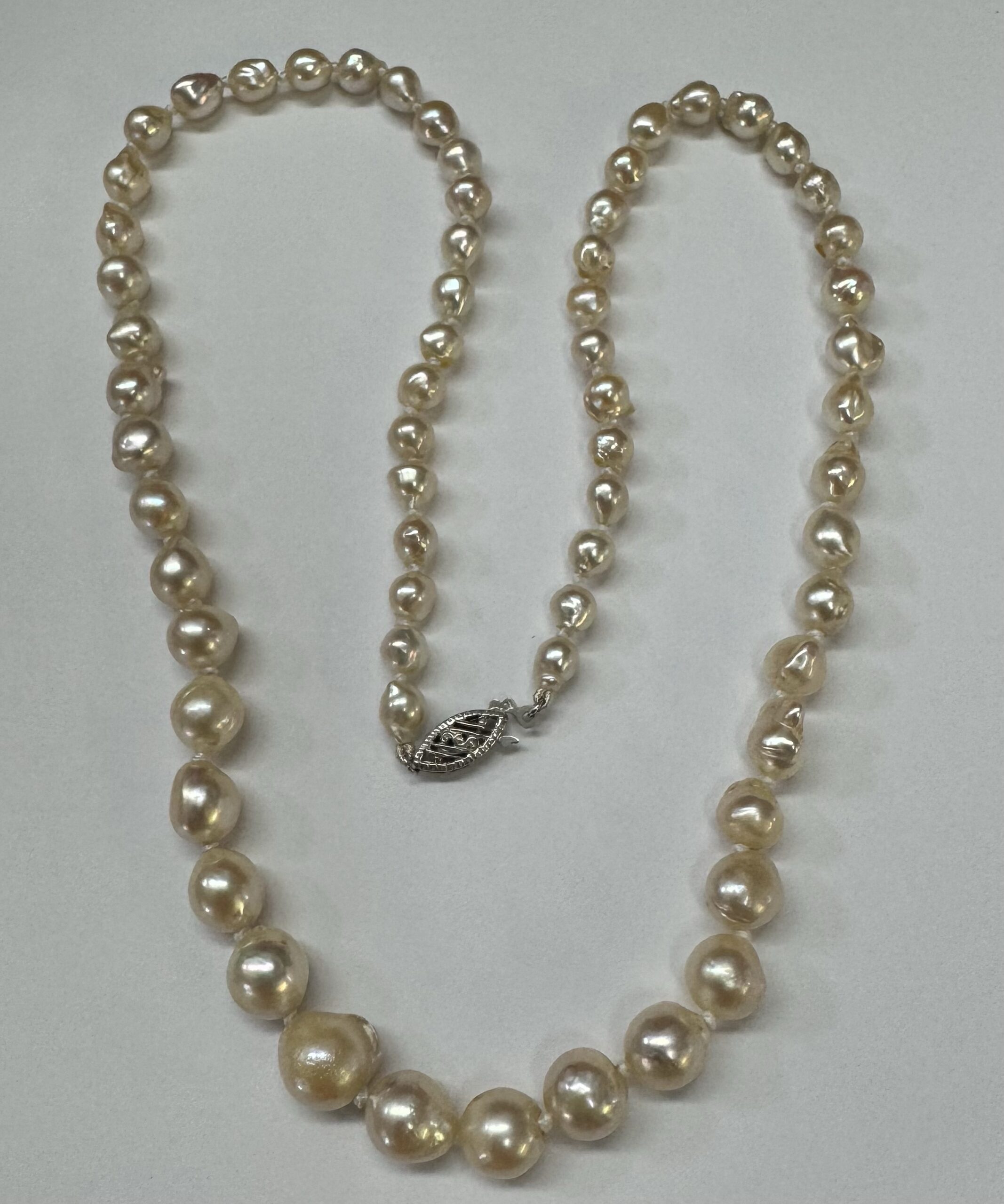 A graduated strand of freshwater baroque pearls ranging from 4.3-9 mm in size, terminated by a 10k white gold filigree clasp, 18”. Only one like this available.