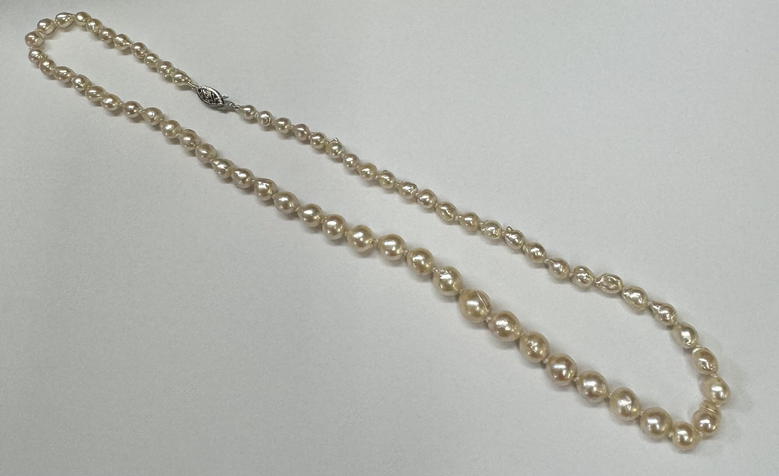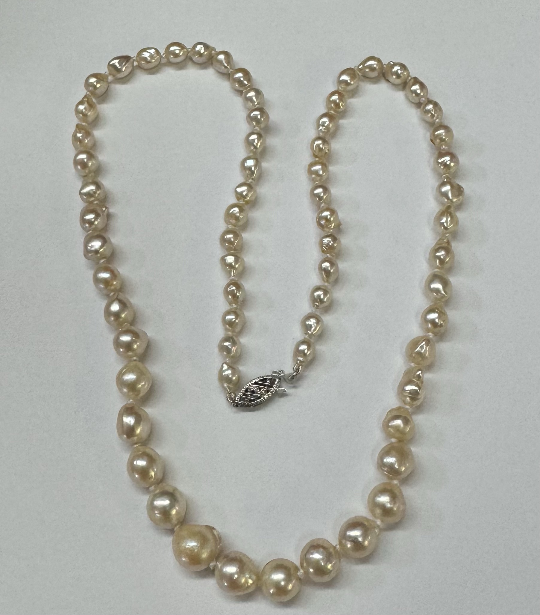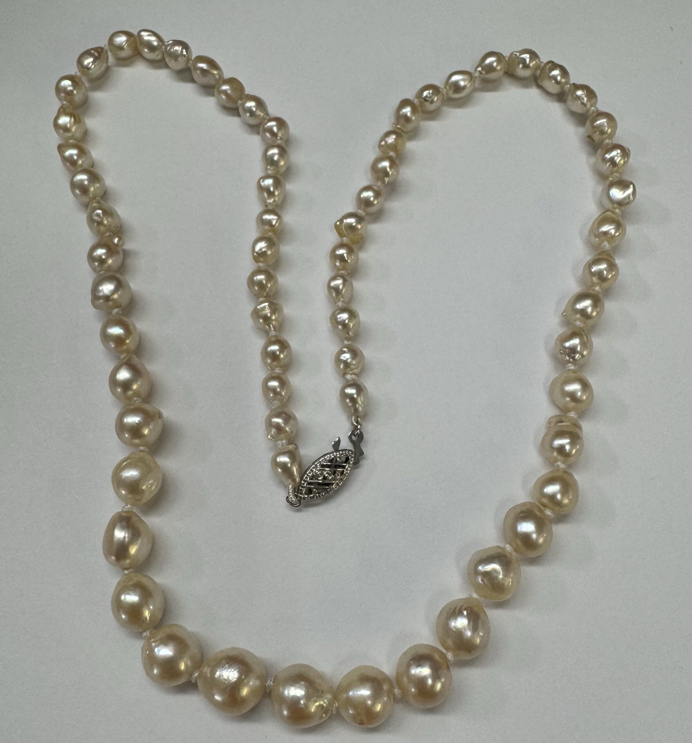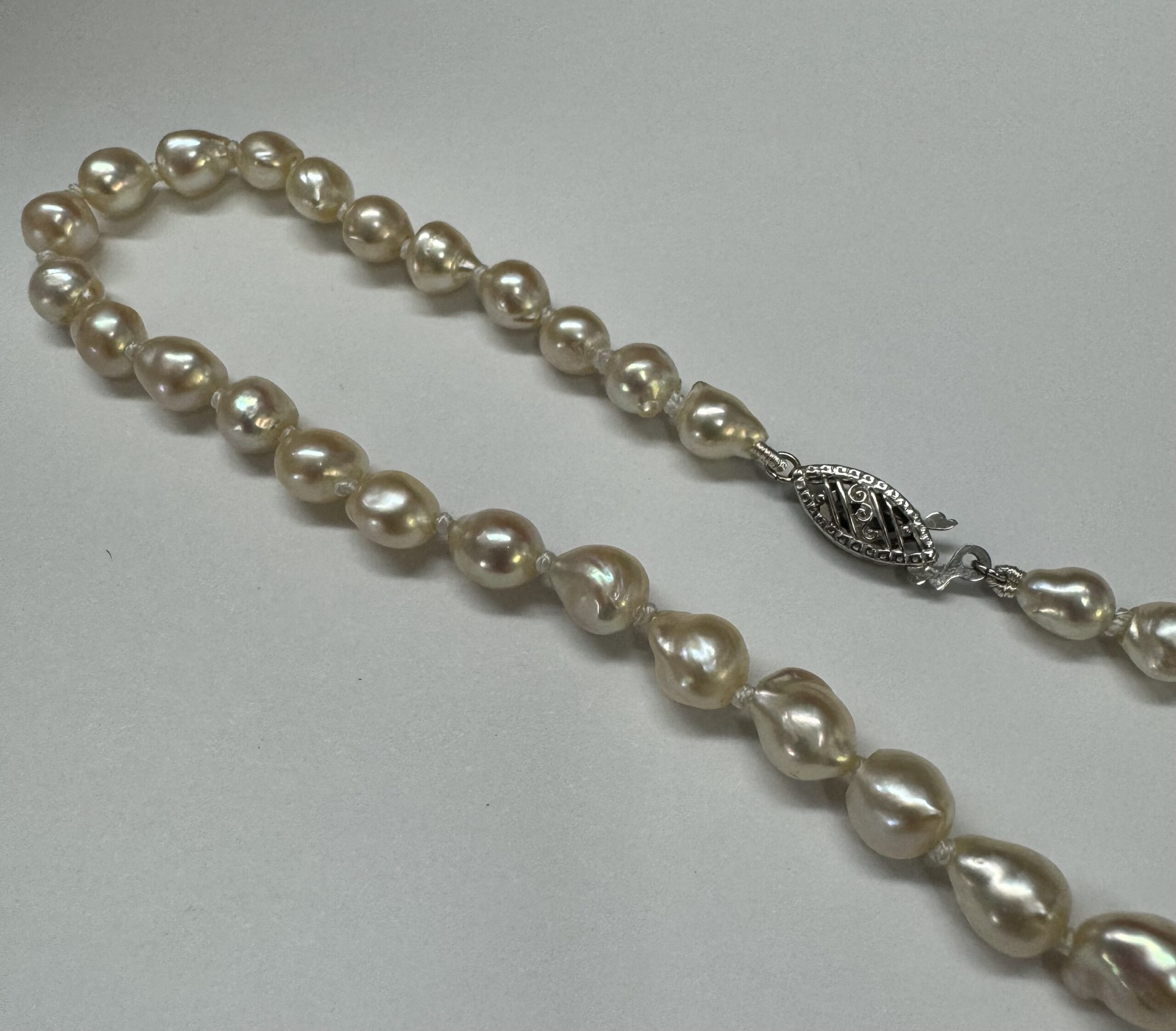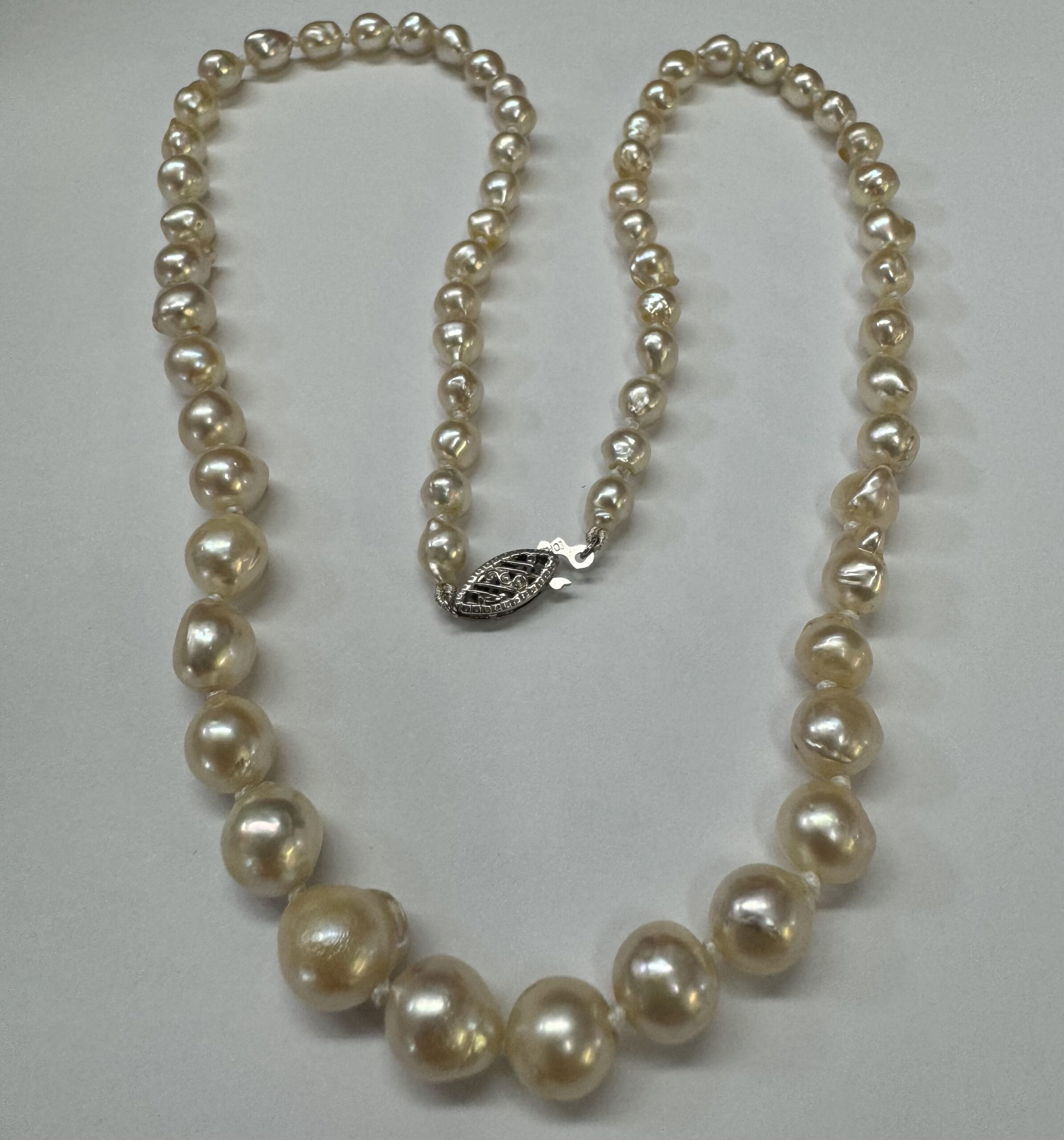 A graduated strand of freshwater baroque pearls ranging from 4.3-9 mm in size, terminated by a 10k white gold filigree clasp, 18”. Only one like this available.