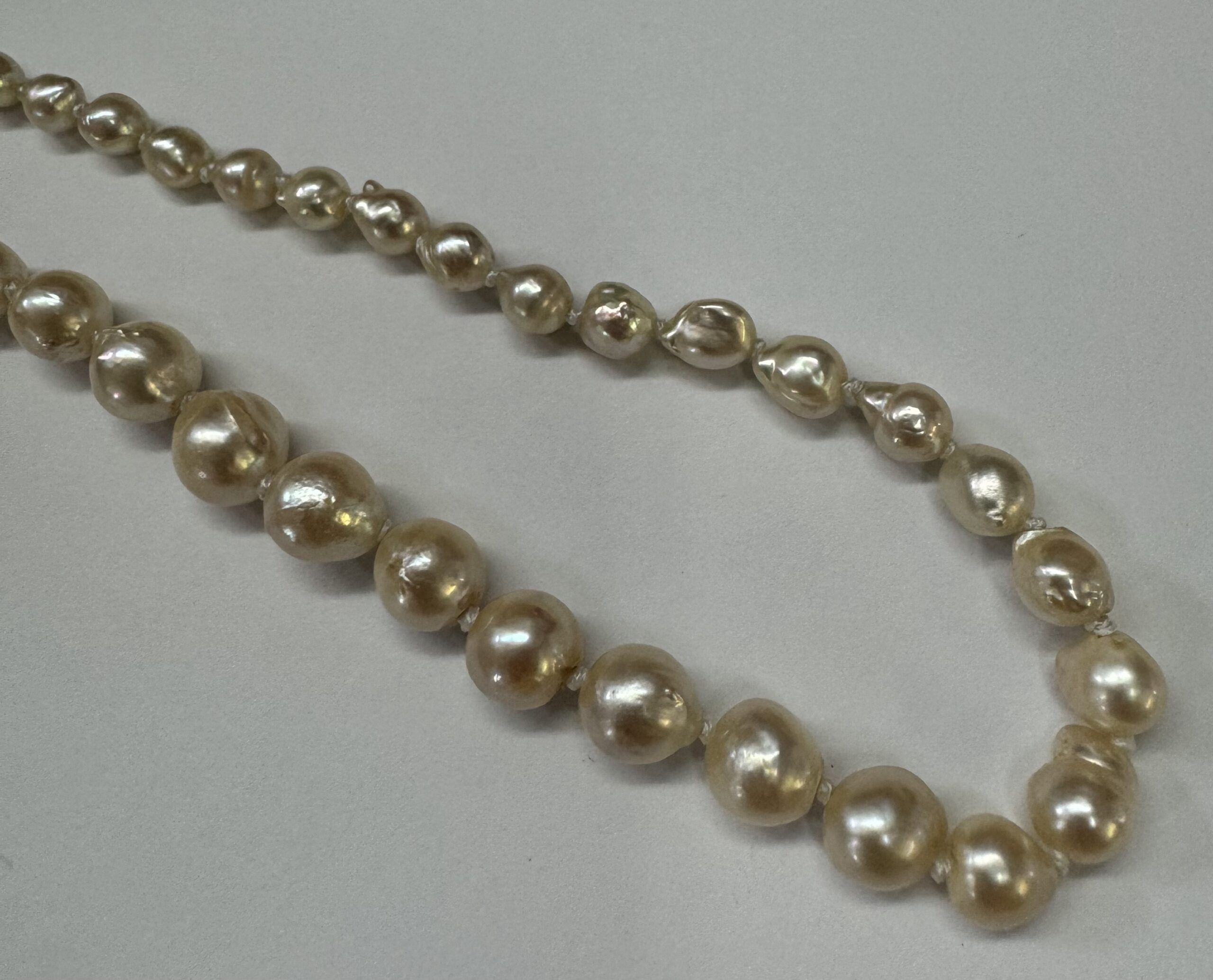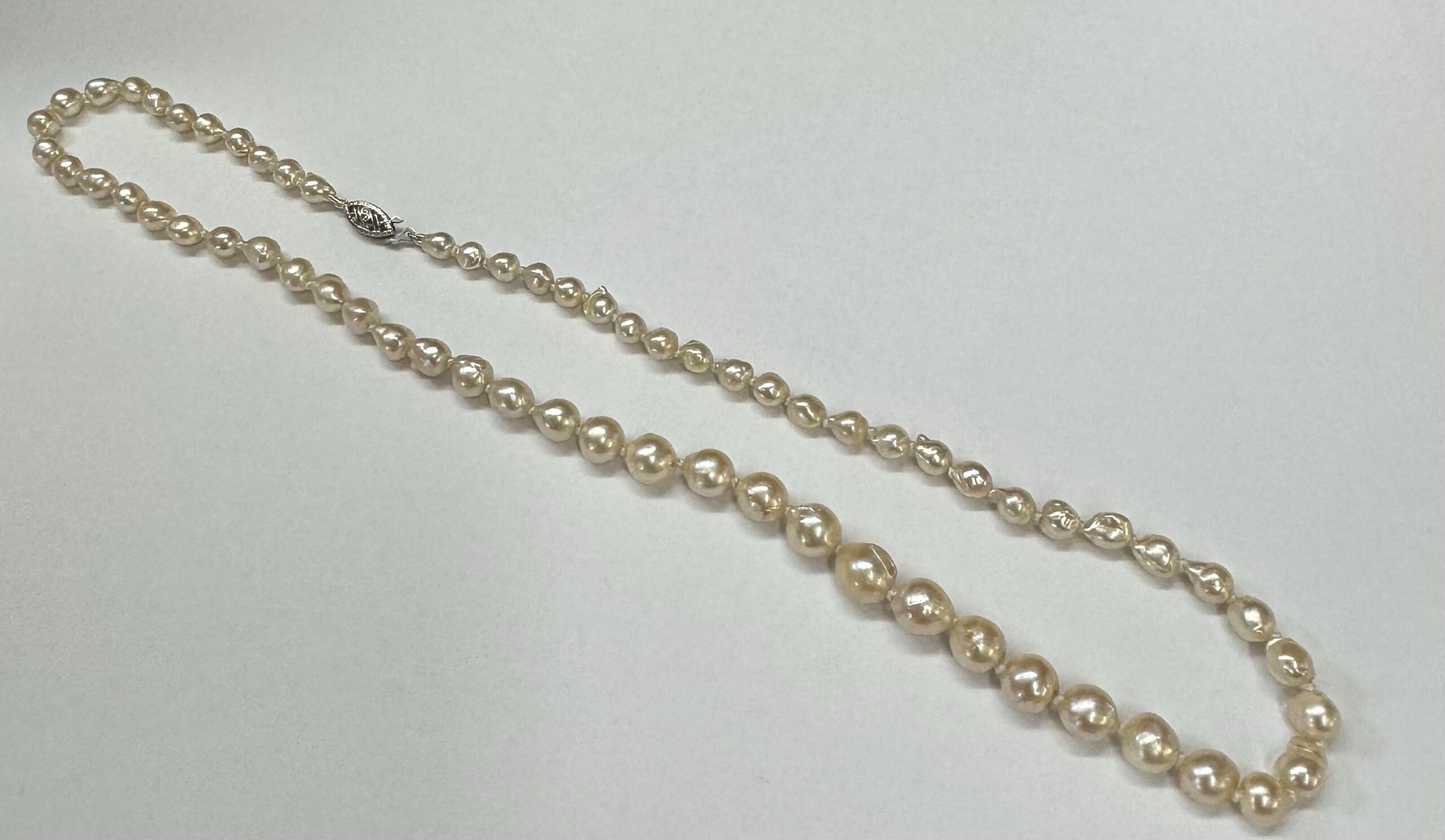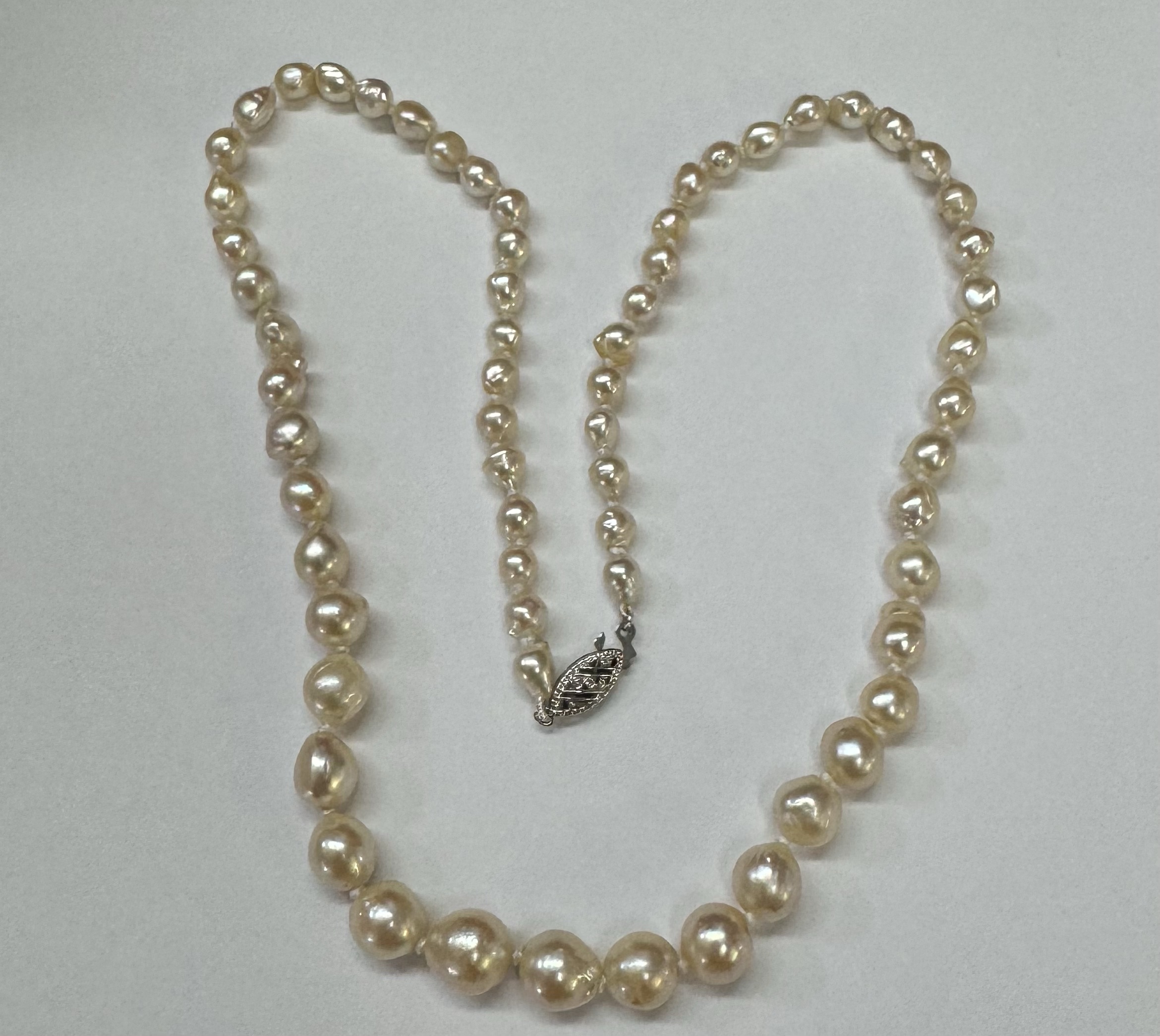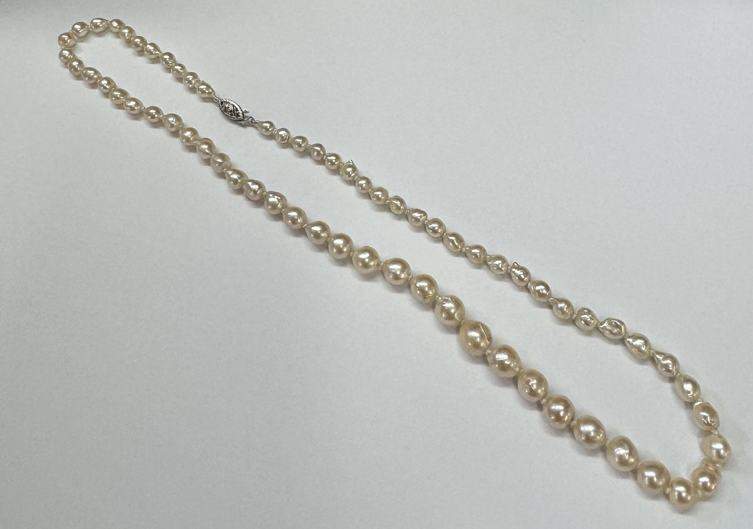 A graduated strand of freshwater baroque pearls ranging from 4.3-9 mm in size, terminated by a 10k white gold filigree clasp, 18”. Only one like this available.