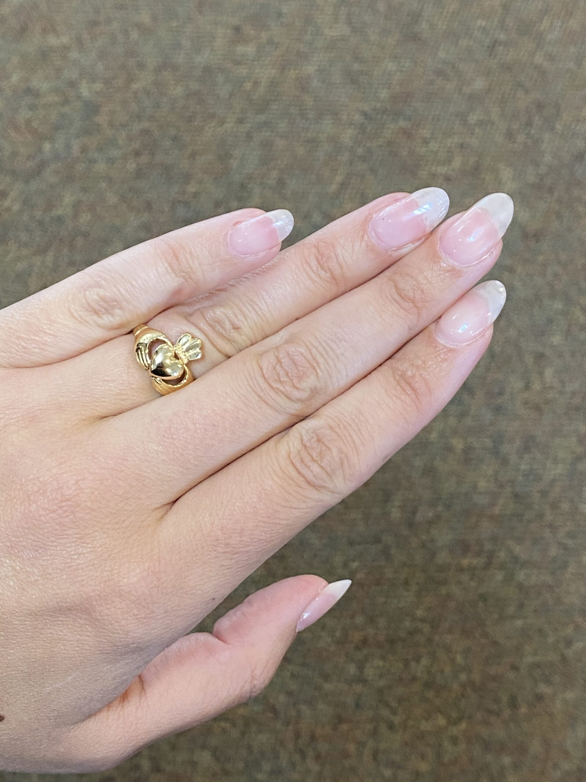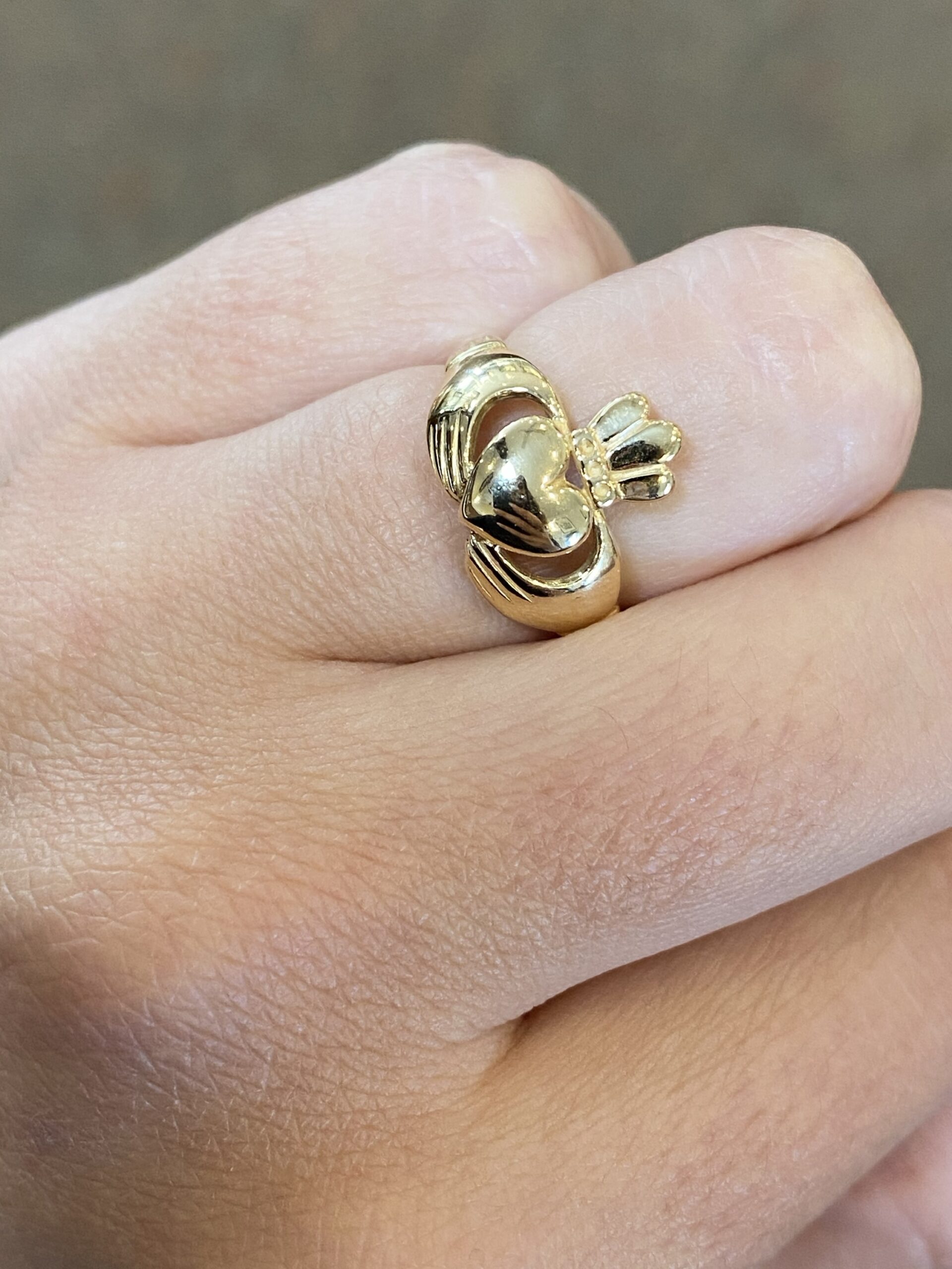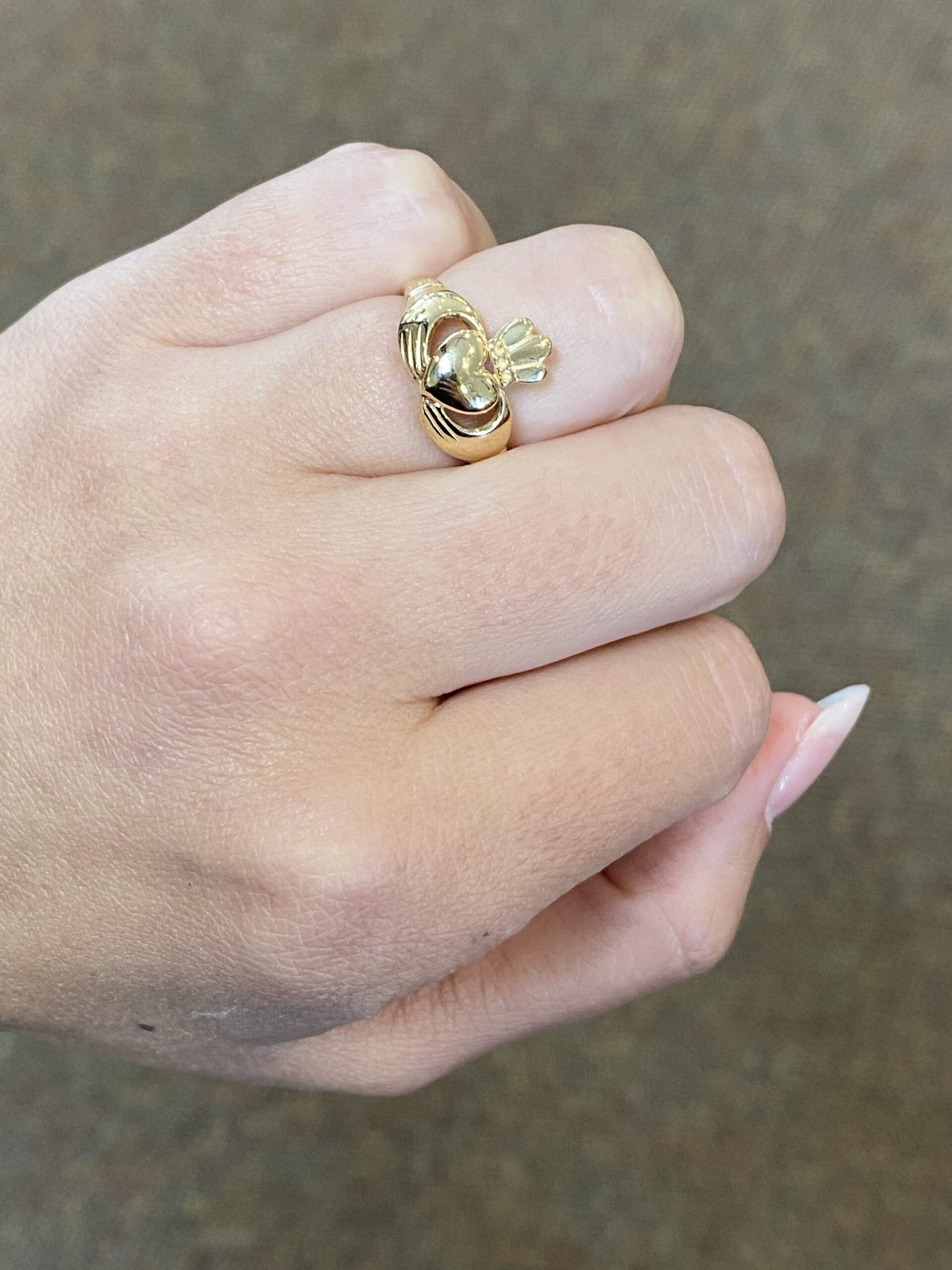 Lady’s 14k yellow gold Claddagh ring. This ring is a finger size 5, but it can be reasonably sized. This ring has an entire weight of 2.8 grams.