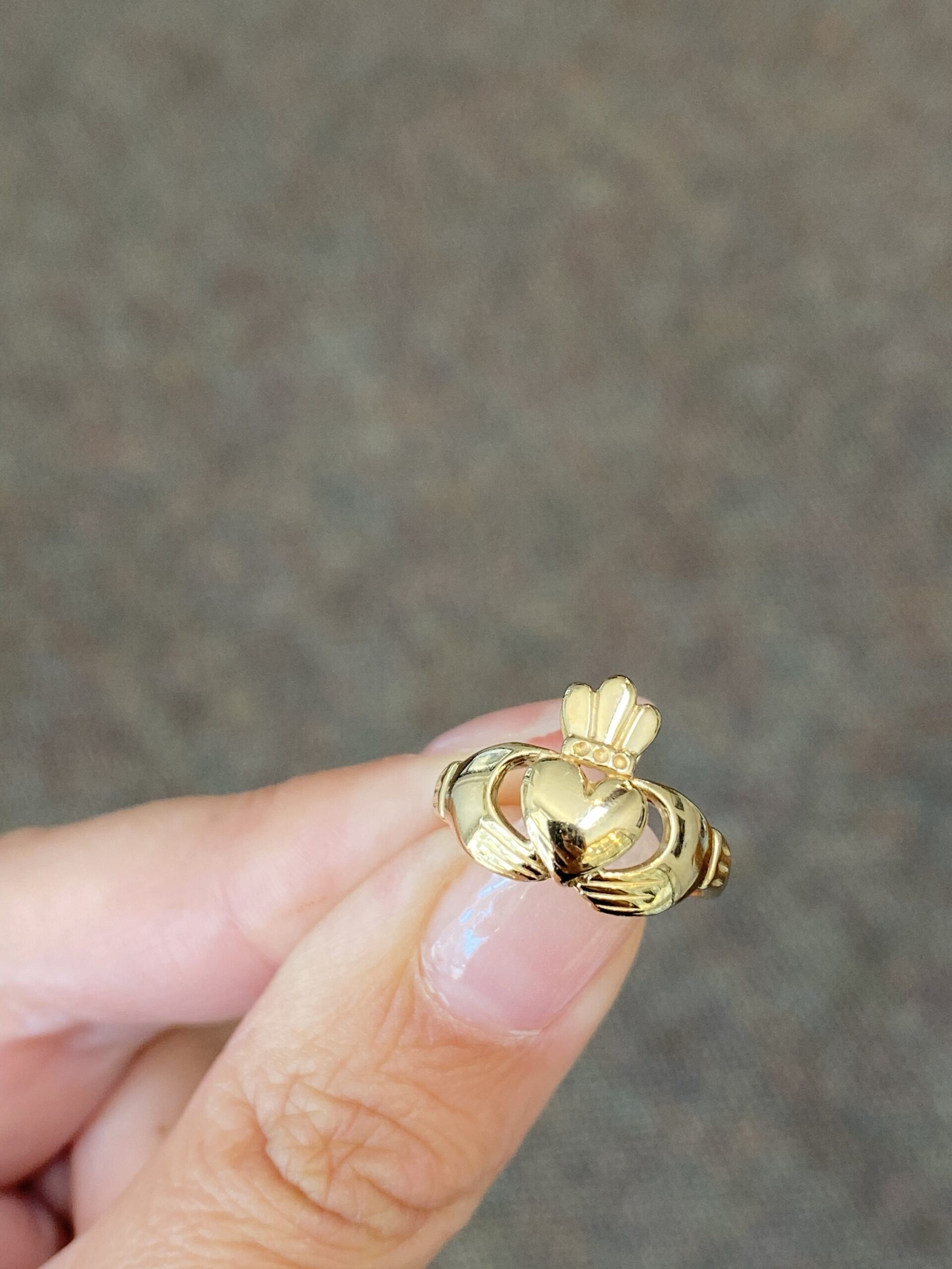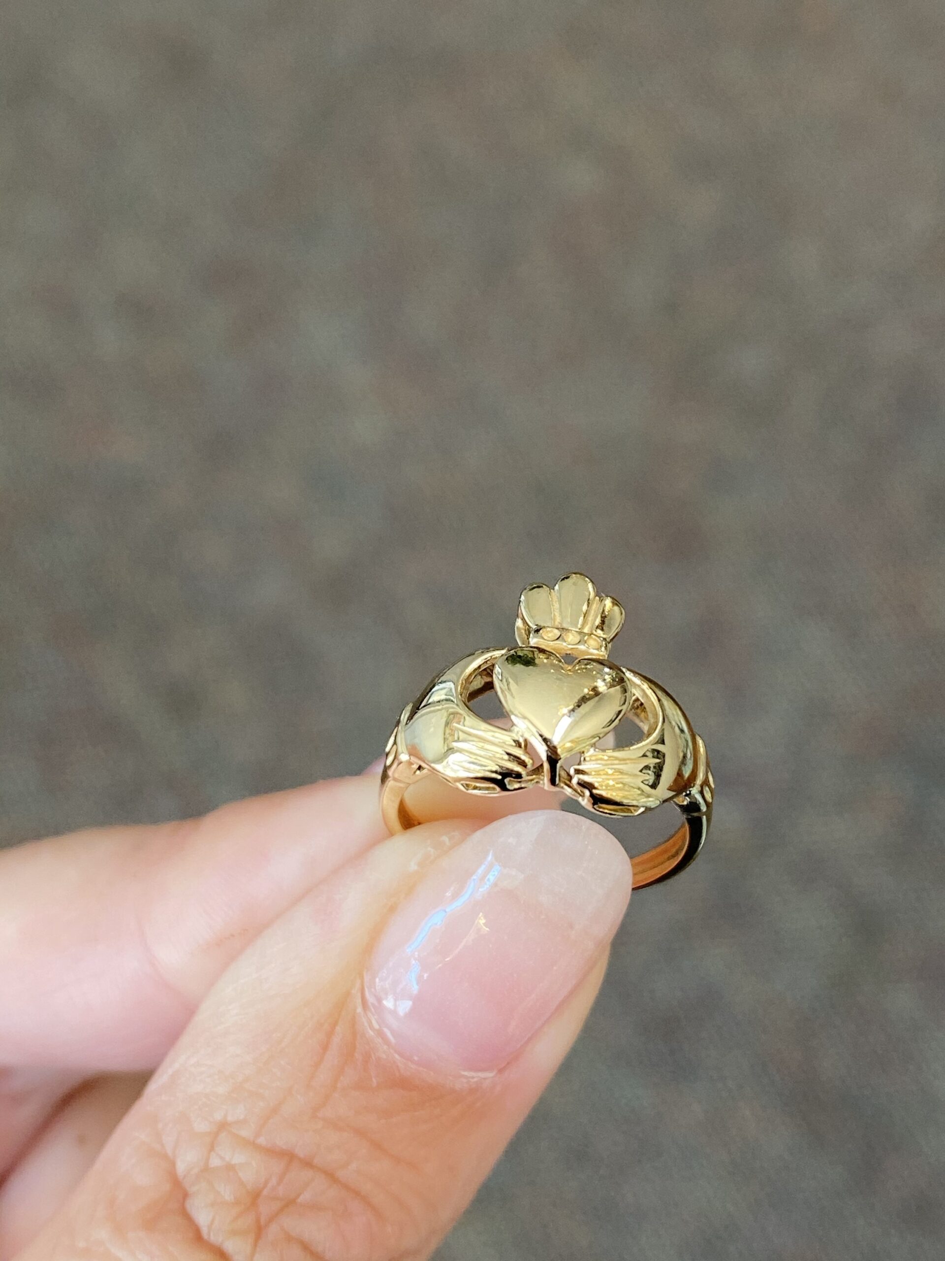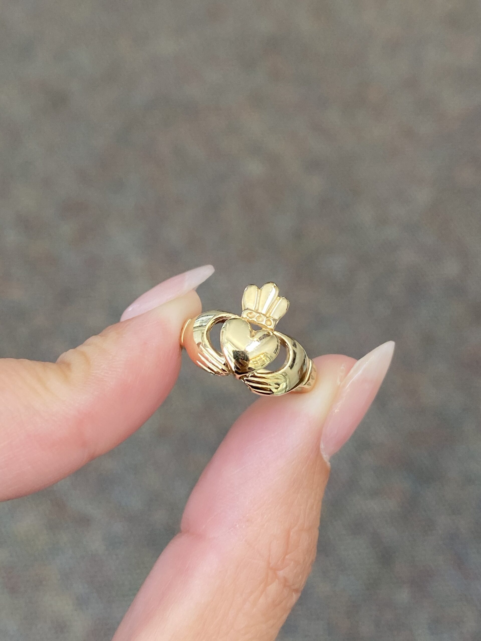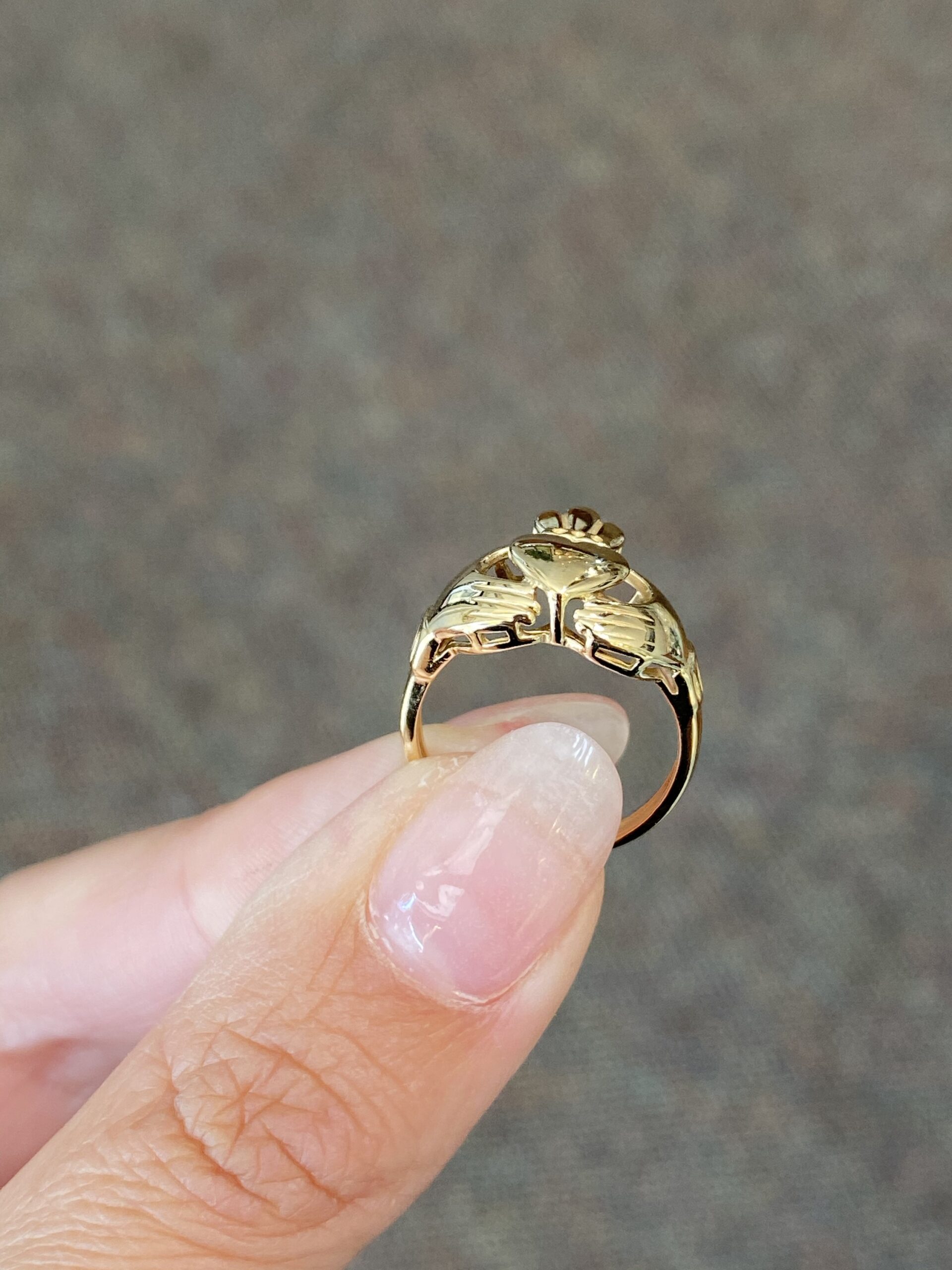 Lady’s 14k yellow gold Claddagh ring. This ring is a finger size 5, but it can be reasonably sized. This ring has an entire weight of 2.8 grams.