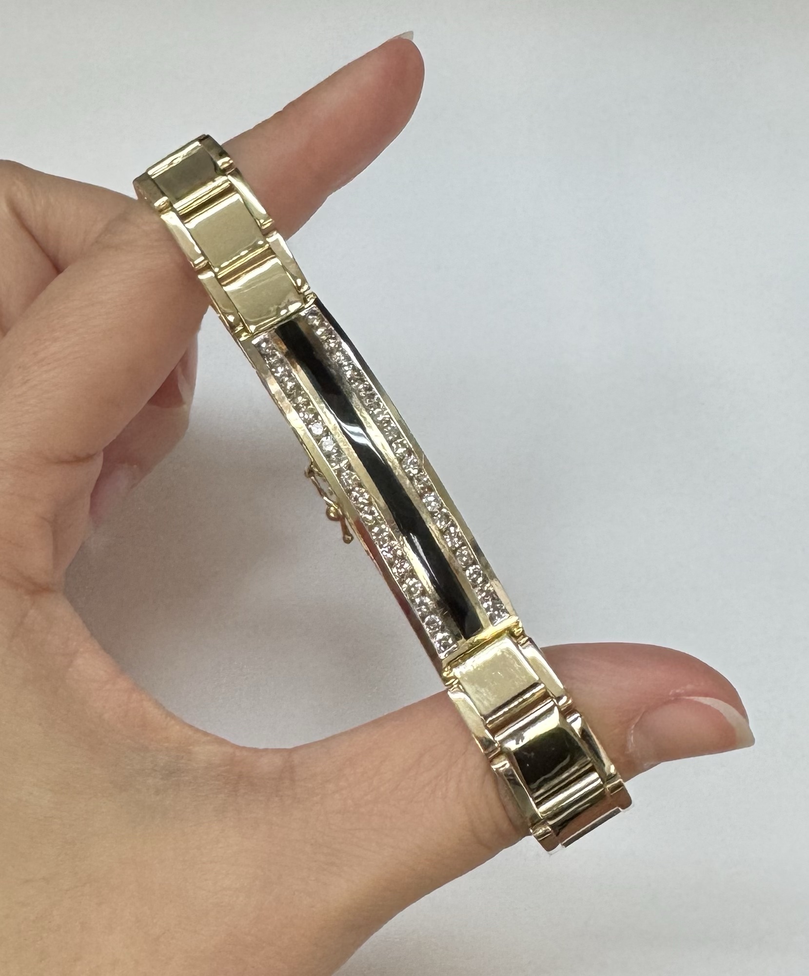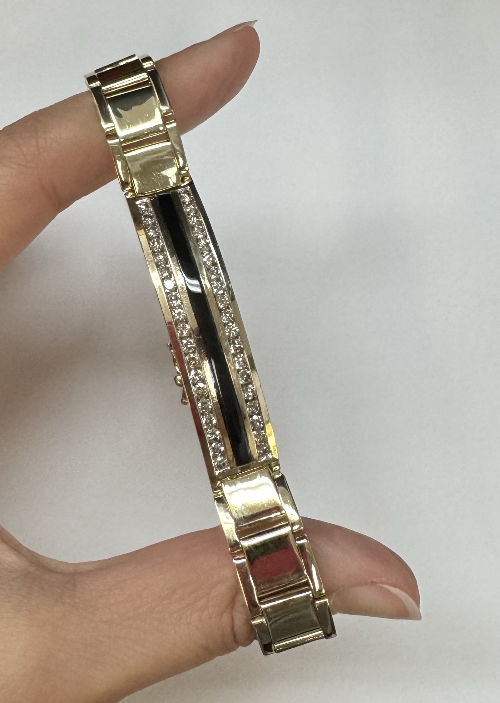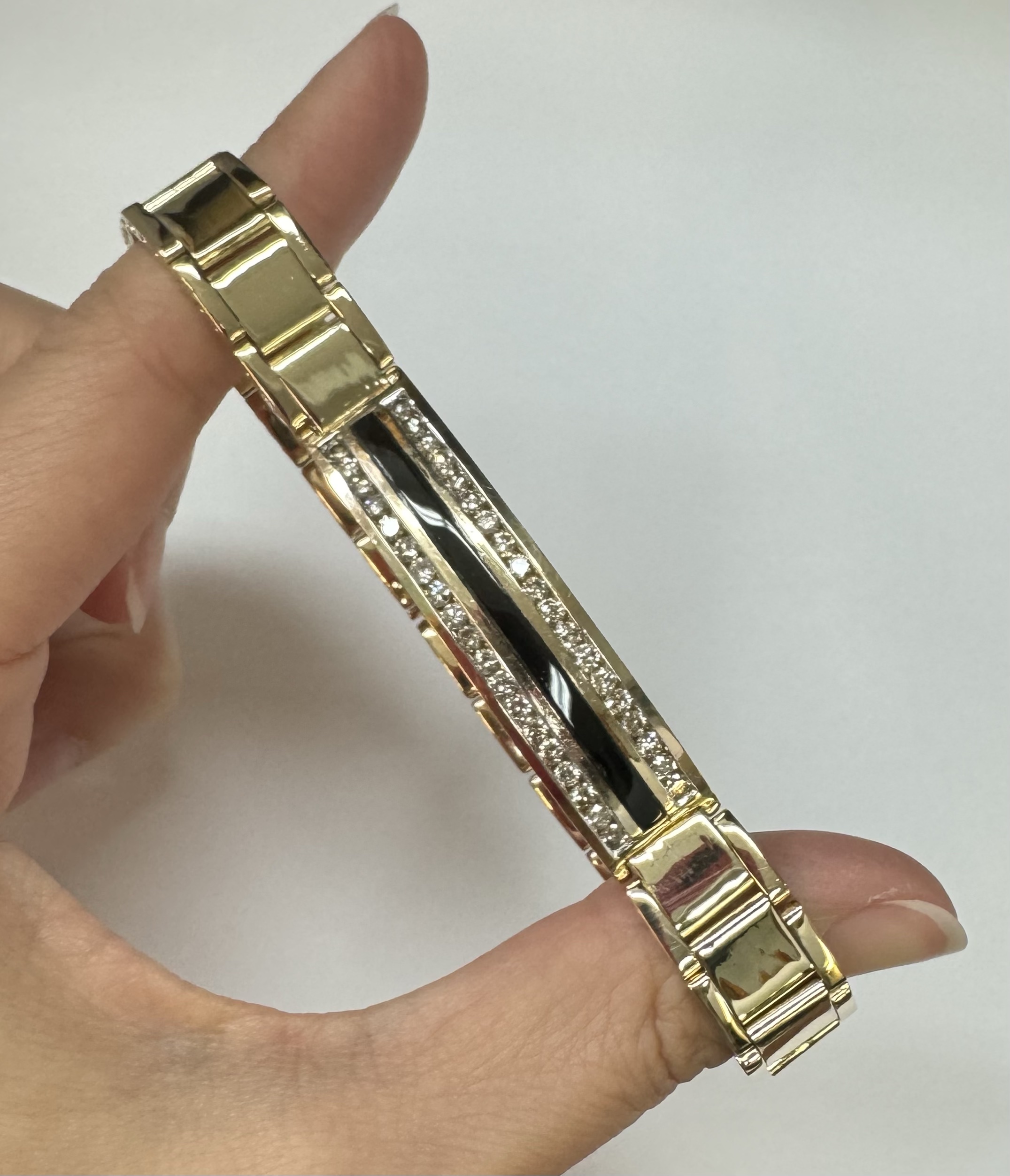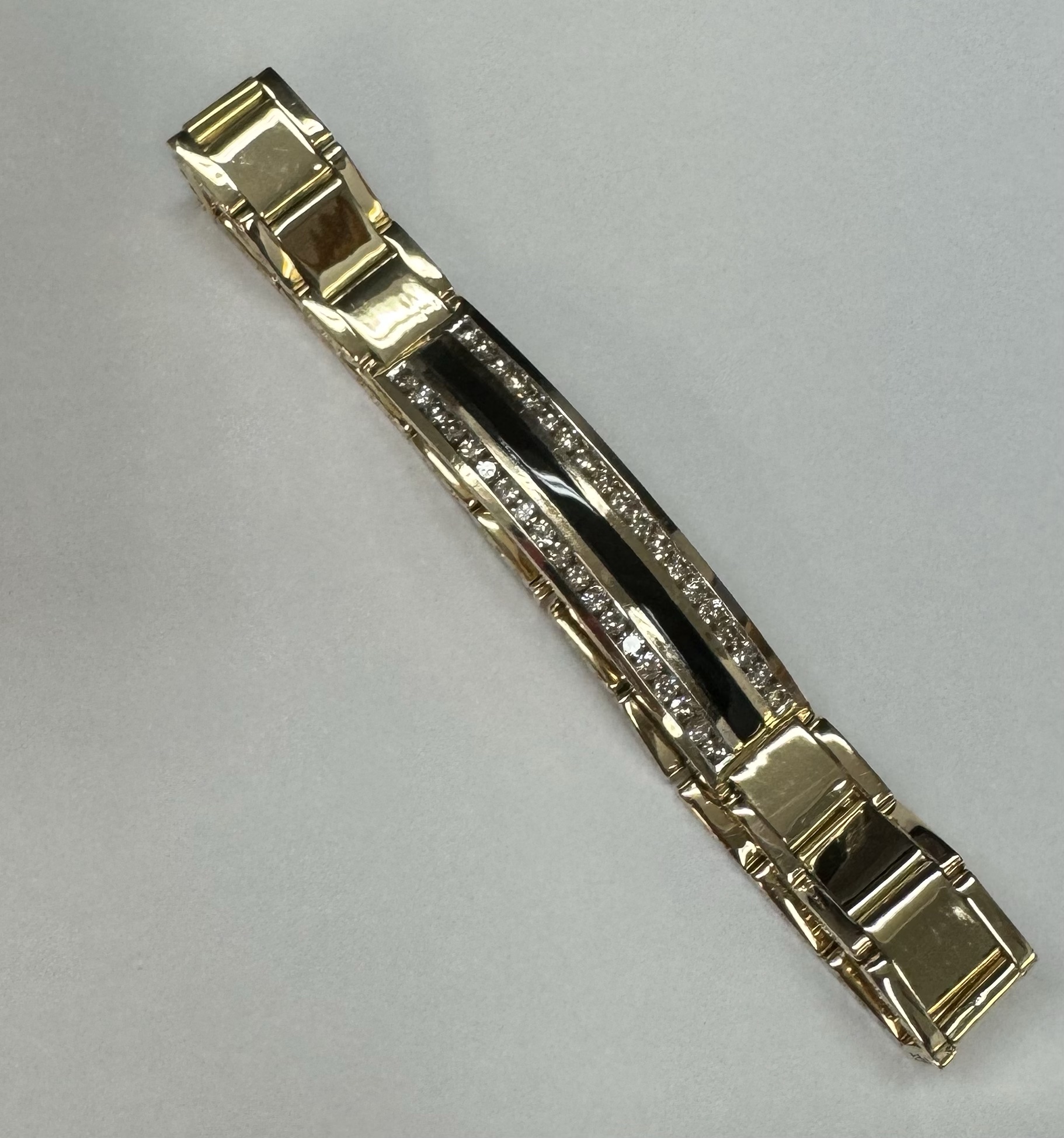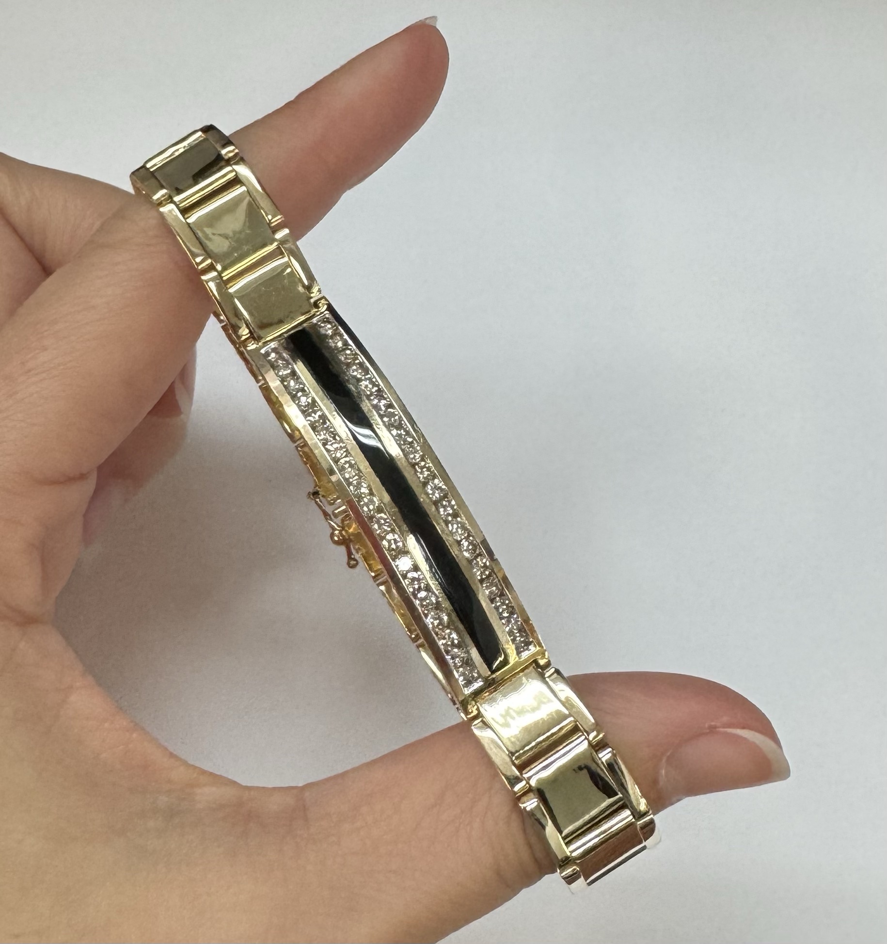Men’s 14k yellow gold ID style link bracelet with genuine Onyx inlay and 38 genuine Round Brilliant Cut diamonds, which have a total combined weight of1.14 carats. These diamonds average H-I in color, and SI1-SI2 in clarity. This bracelet measures 11 mm in width, 8 1/4″ in total length, and it has an entire weight of 43.6 grams.