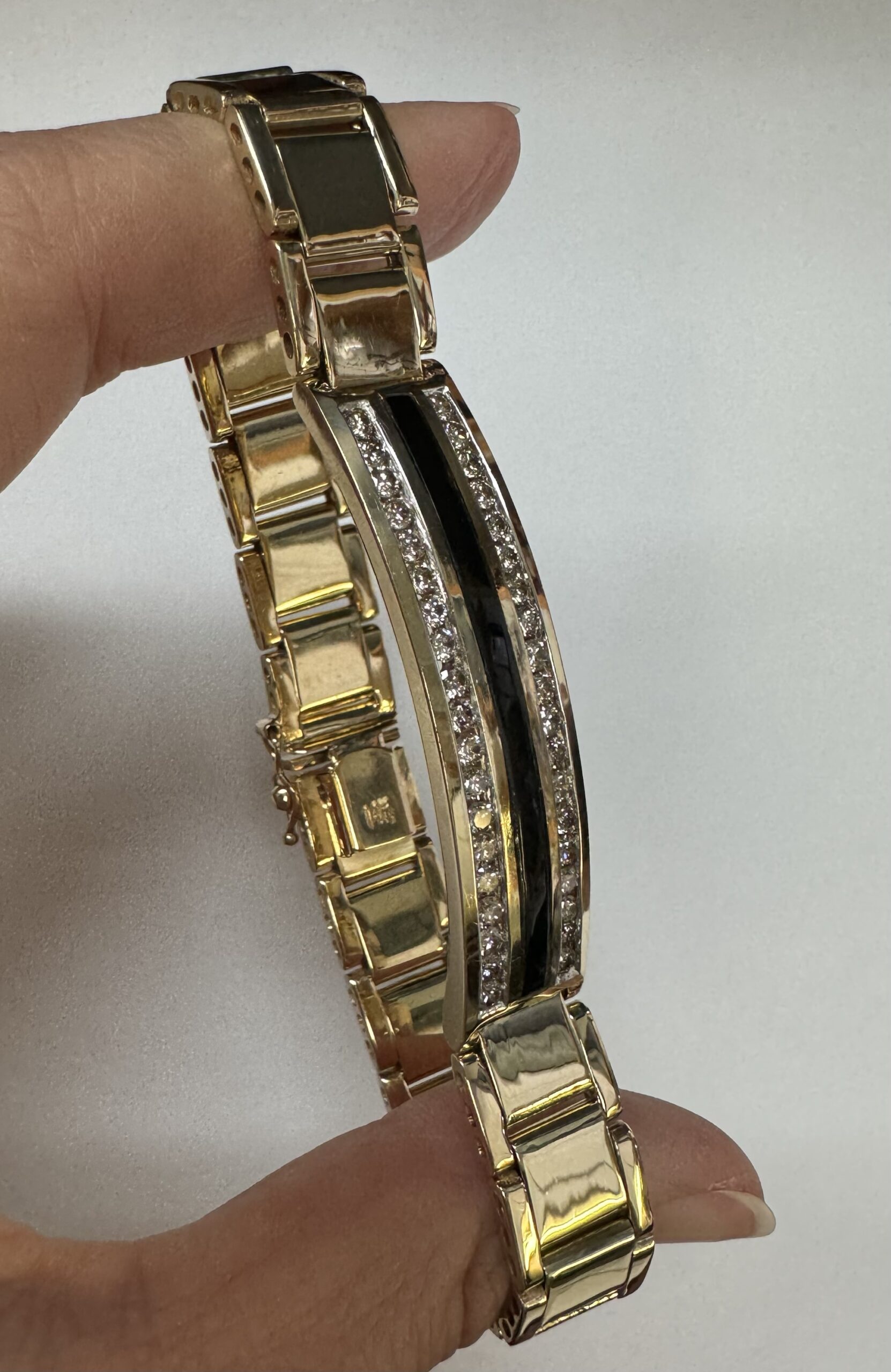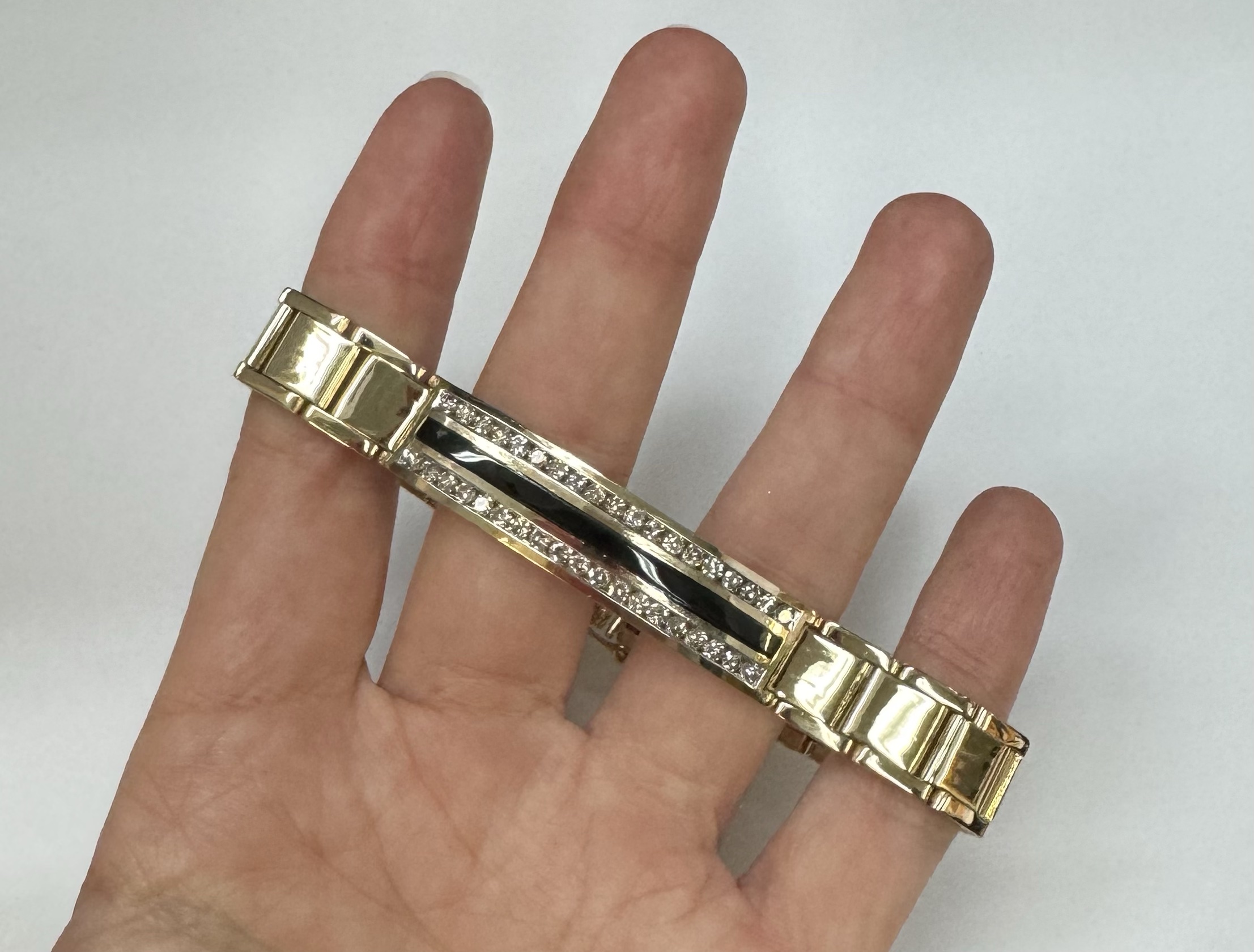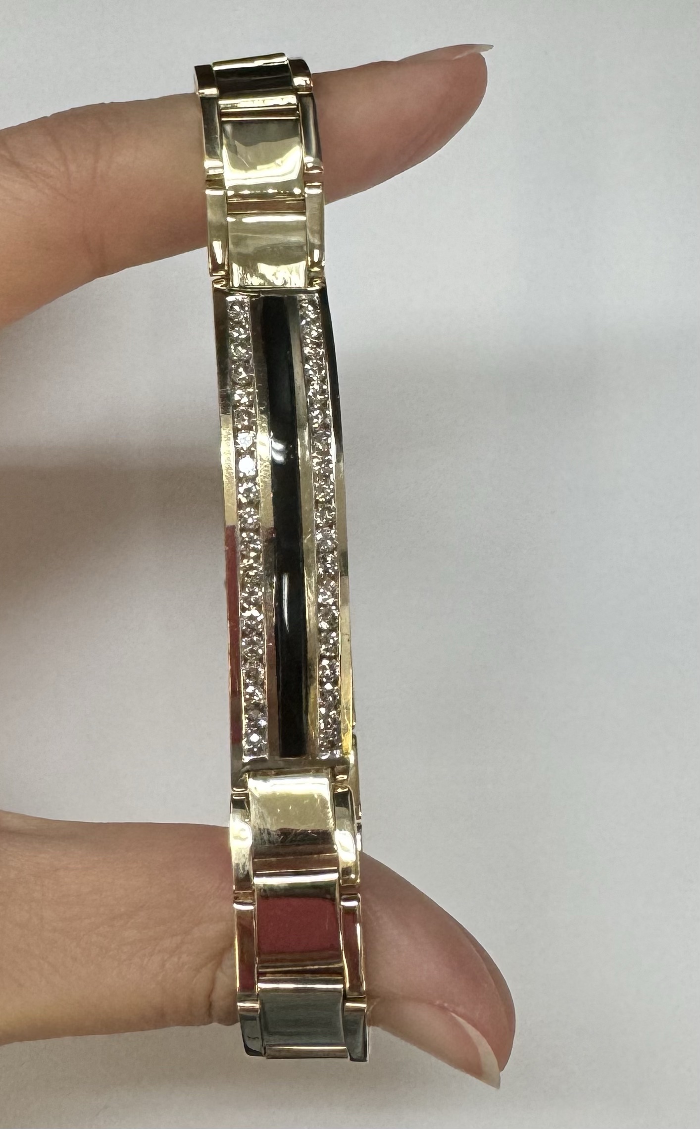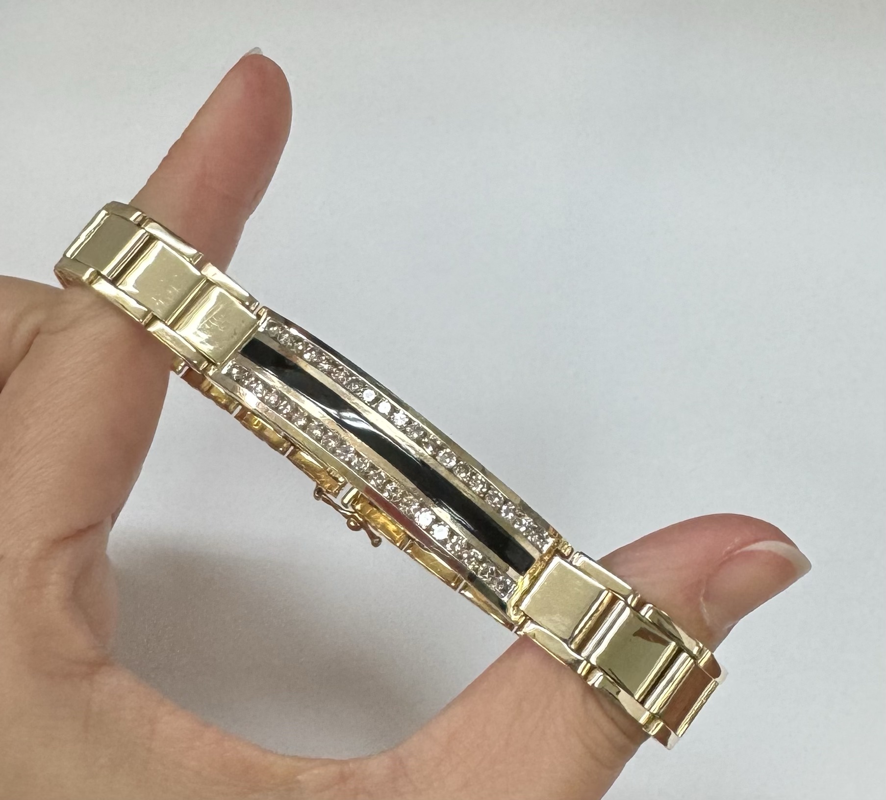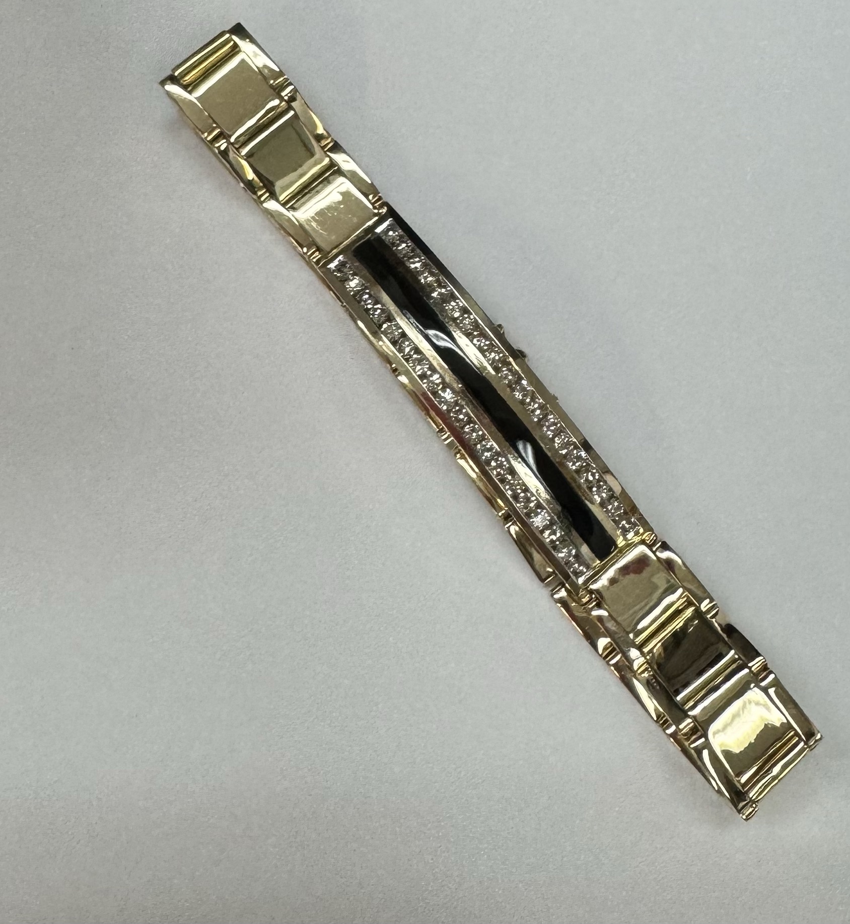 Men’s 14k yellow gold ID style link bracelet with genuine Onyx inlay and 38 genuine Round Brilliant Cut diamonds, which have a total combined weight of1.14 carats. These diamonds average H-I in color, and SI1-SI2 in clarity. This bracelet measures 11 mm in width, 8 1/4″ in total length, and it has an entire weight of 43.6 grams.