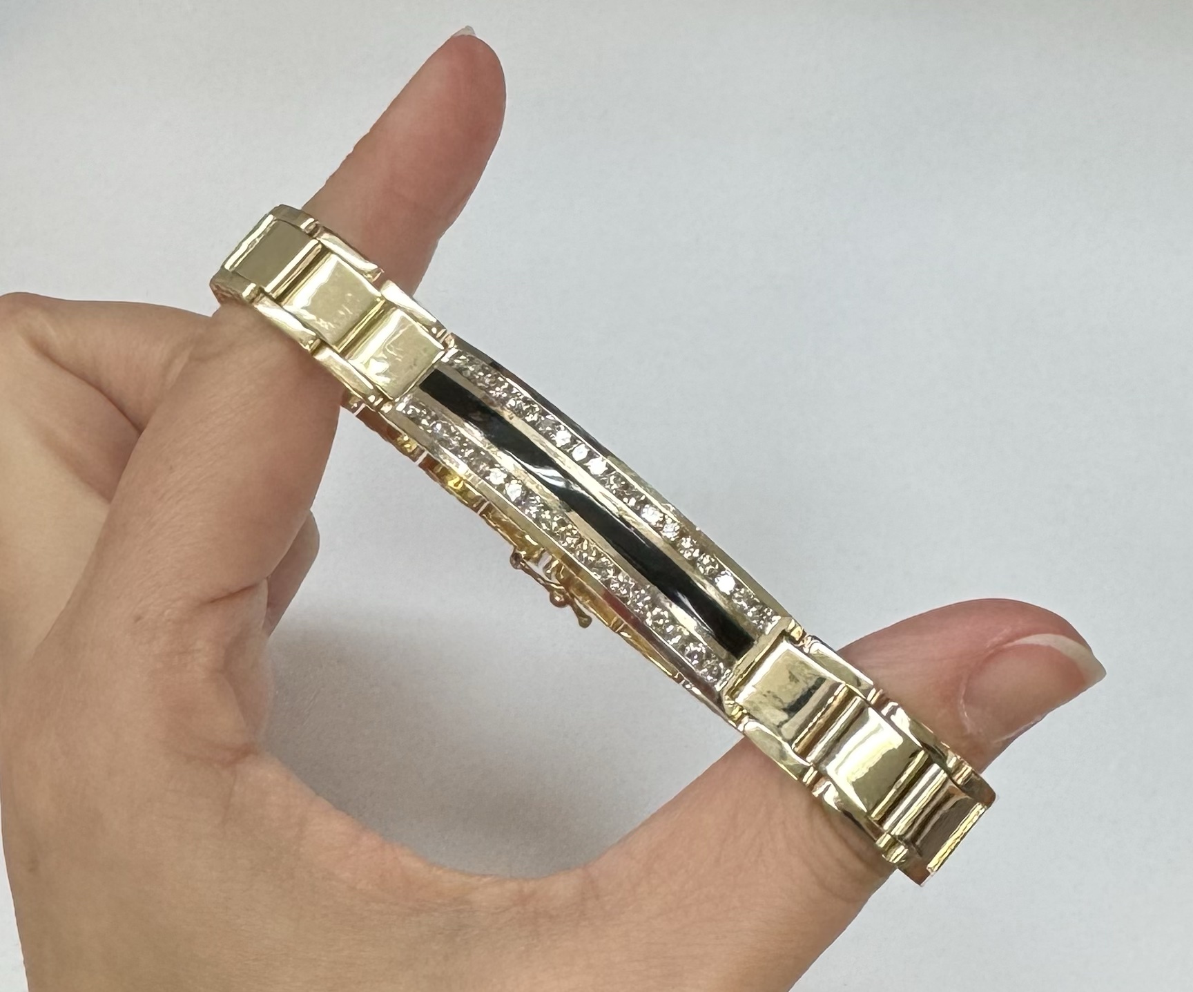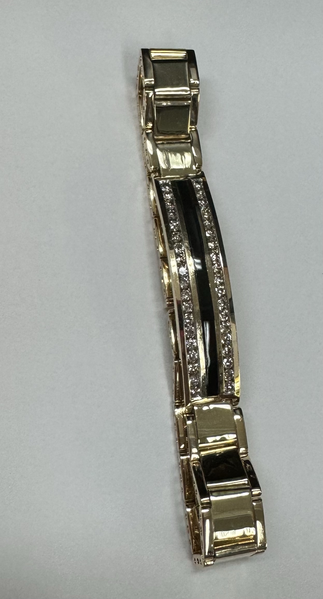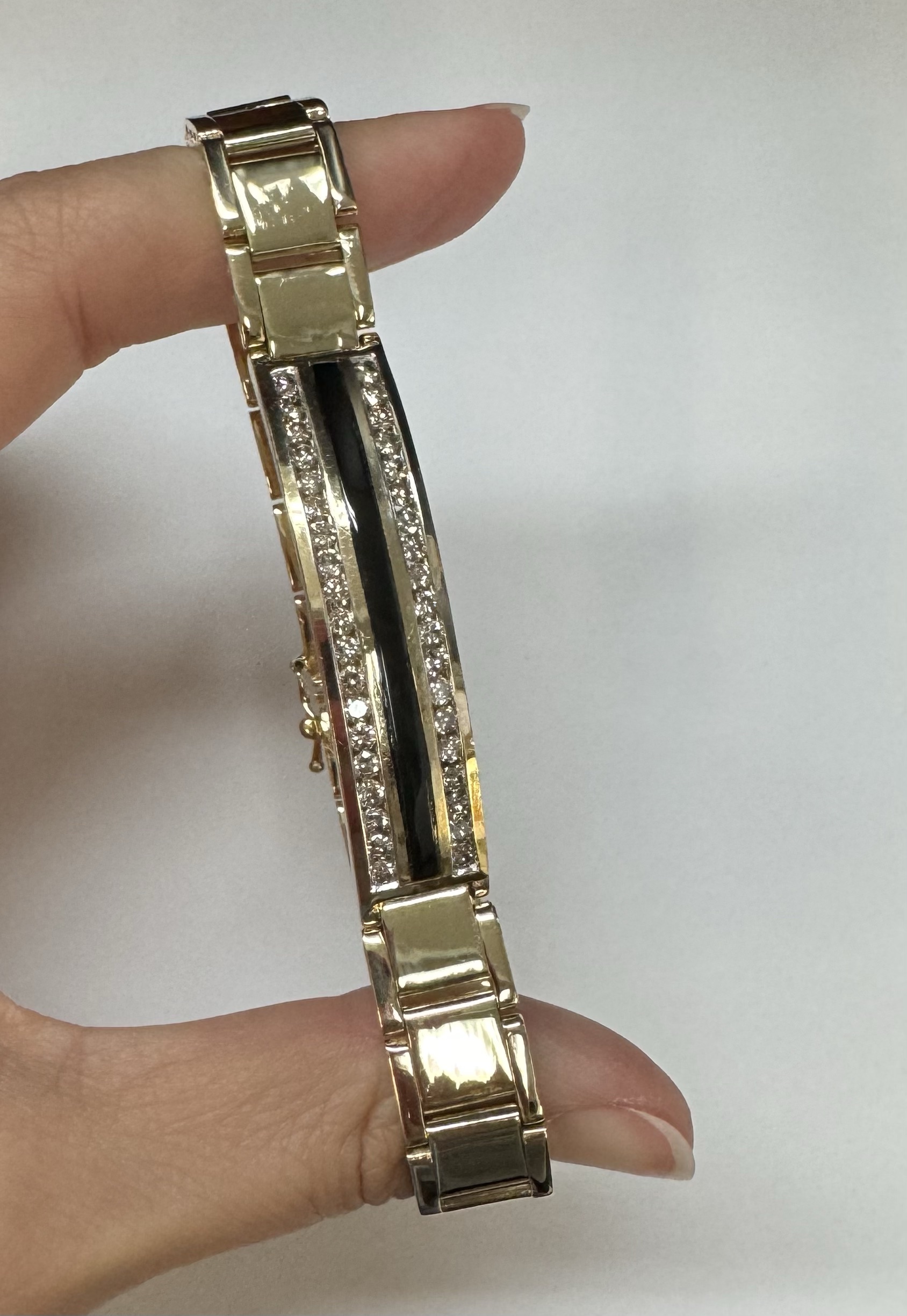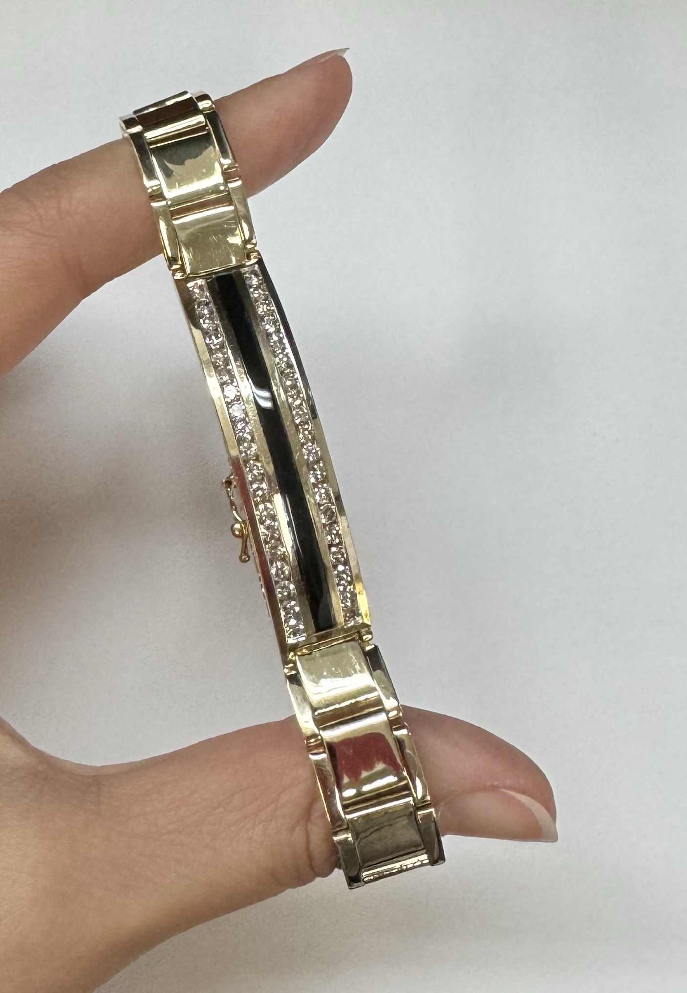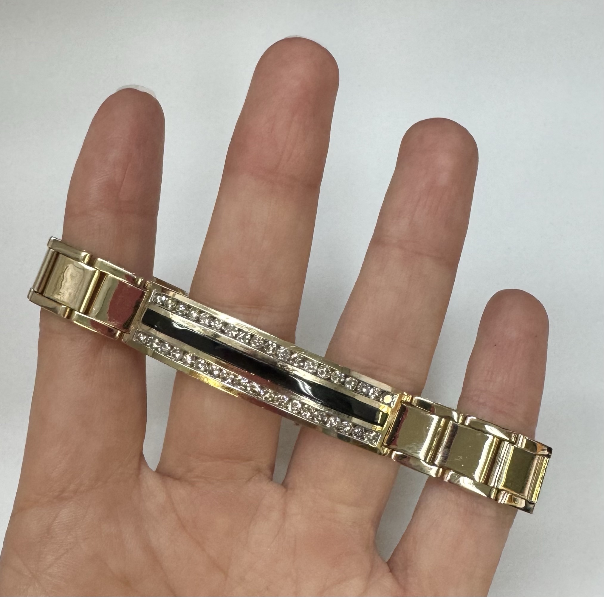 Men’s 14k yellow gold ID style link bracelet with genuine Onyx inlay and 38 genuine Round Brilliant Cut diamonds, which have a total combined weight of1.14 carats. These diamonds average H-I in color, and SI1-SI2 in clarity. This bracelet measures 11 mm in width, 8 1/4″ in total length, and it has an entire weight of 43.6 grams.