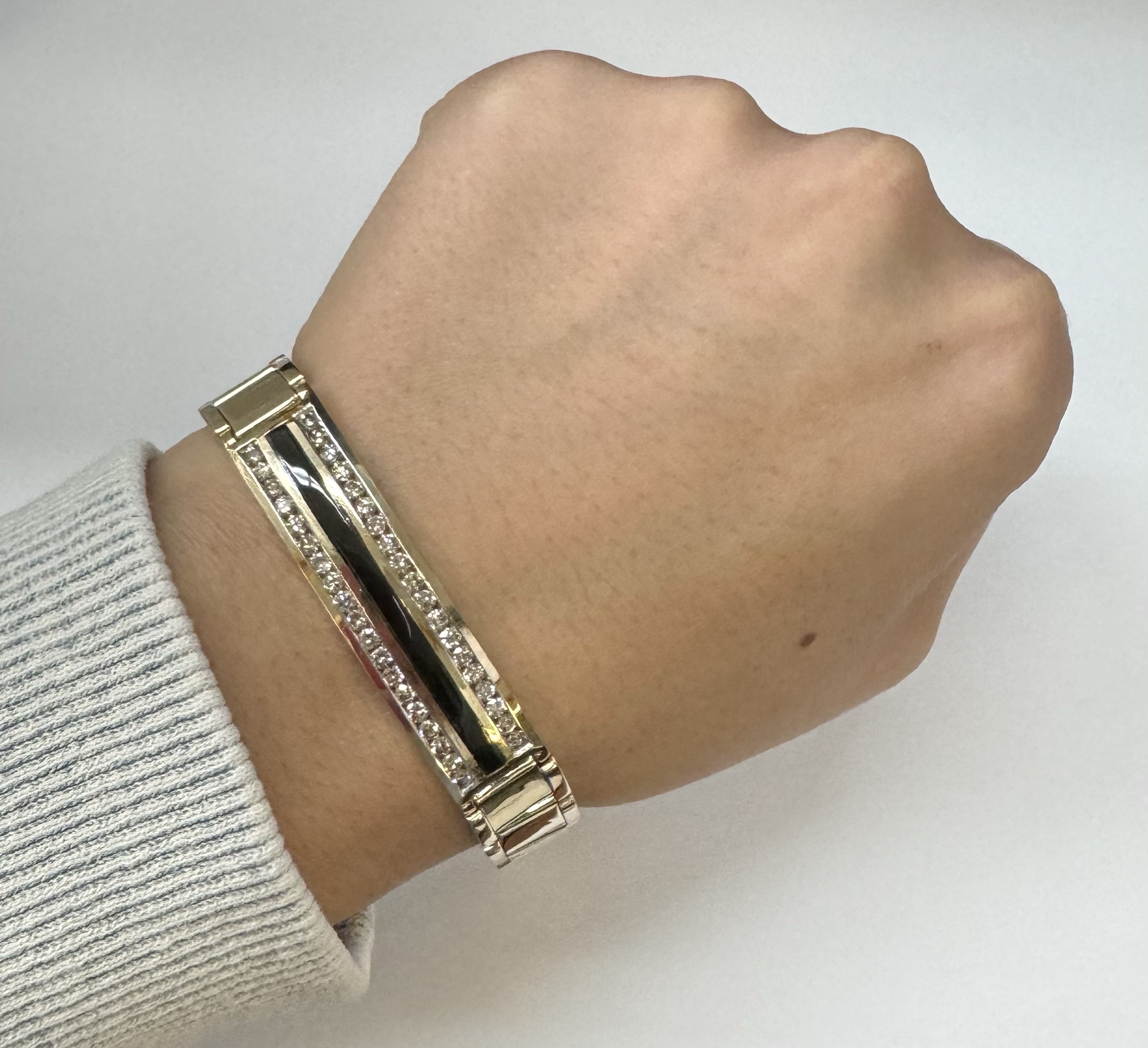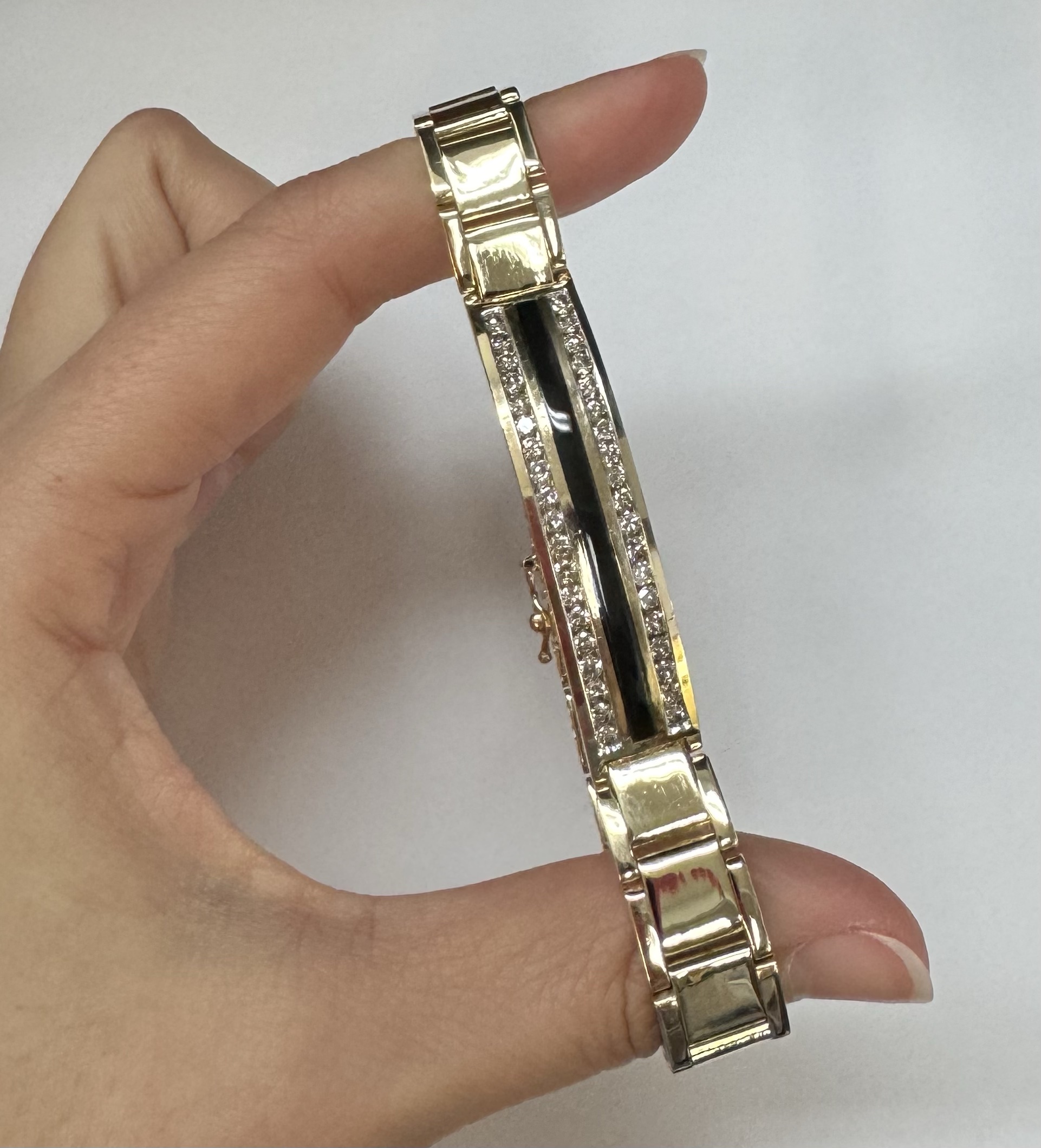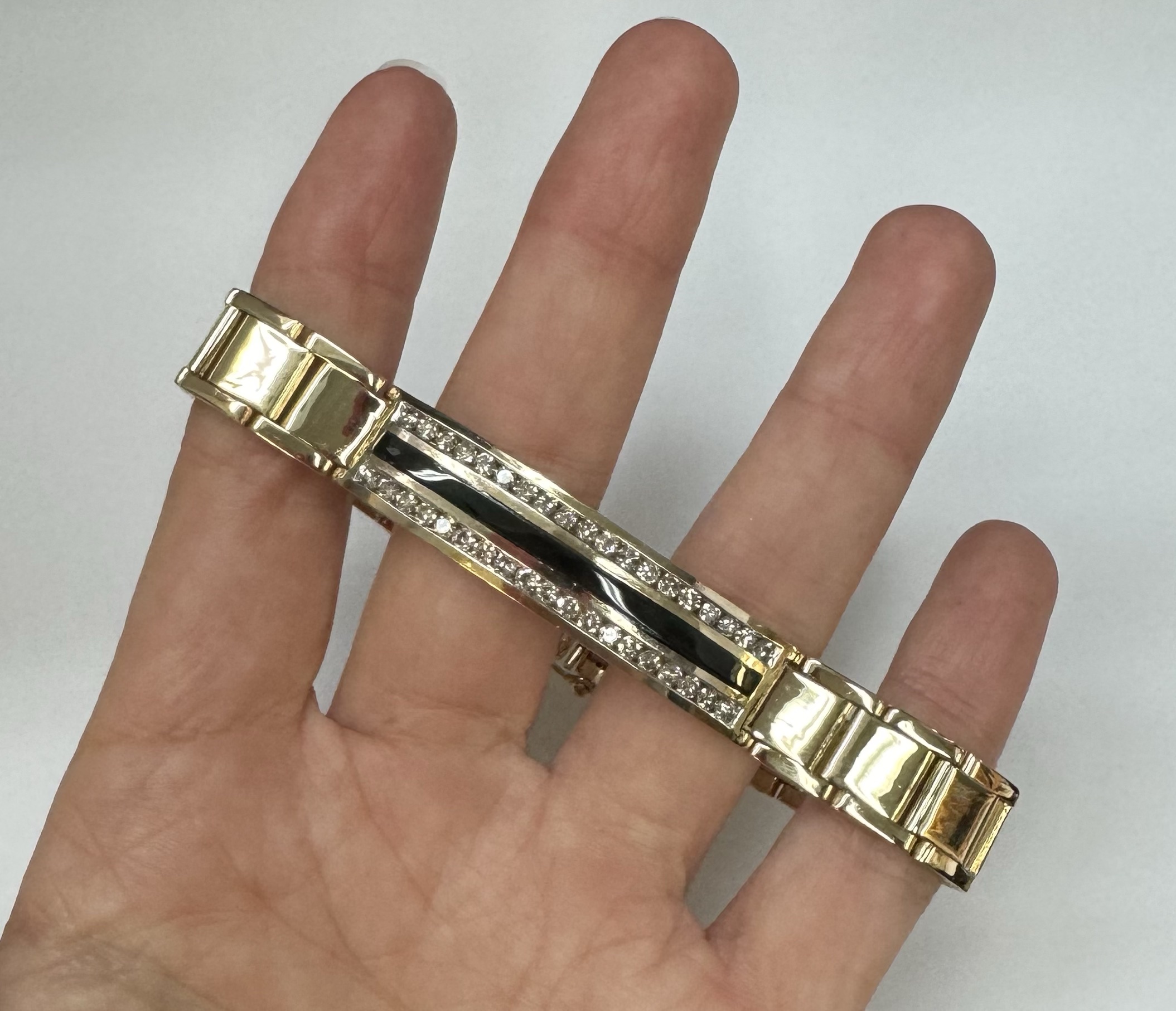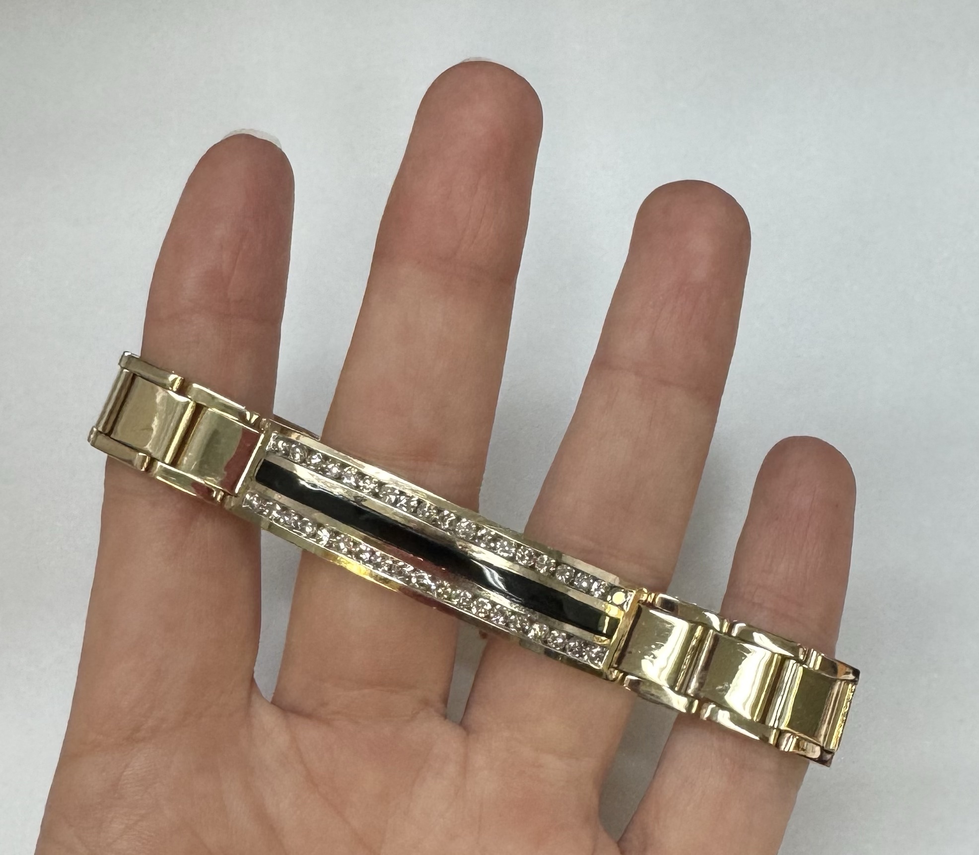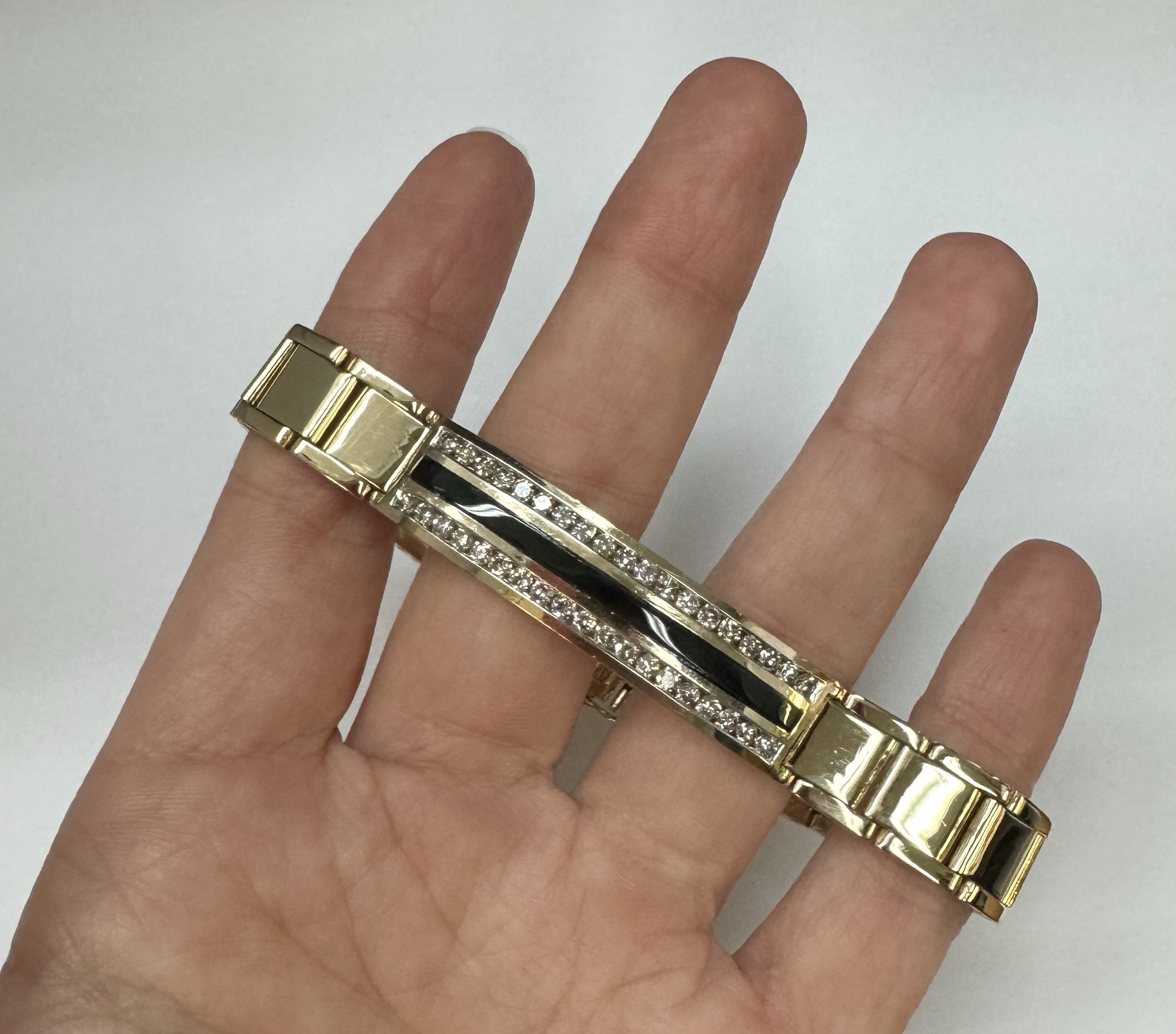 Men’s 14k yellow gold ID style link bracelet with genuine Onyx inlay and 38 genuine Round Brilliant Cut diamonds, which have a total combined weight of1.14 carats. These diamonds average H-I in color, and SI1-SI2 in clarity. This bracelet measures 11 mm in width, 8 1/4″ in total length, and it has an entire weight of 43.6 grams.