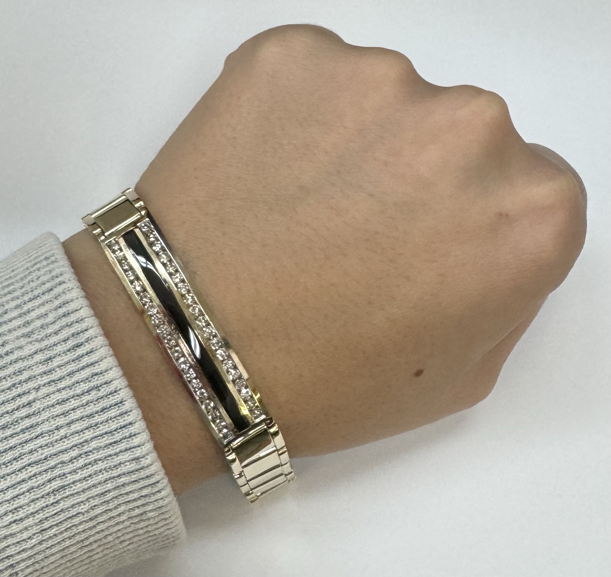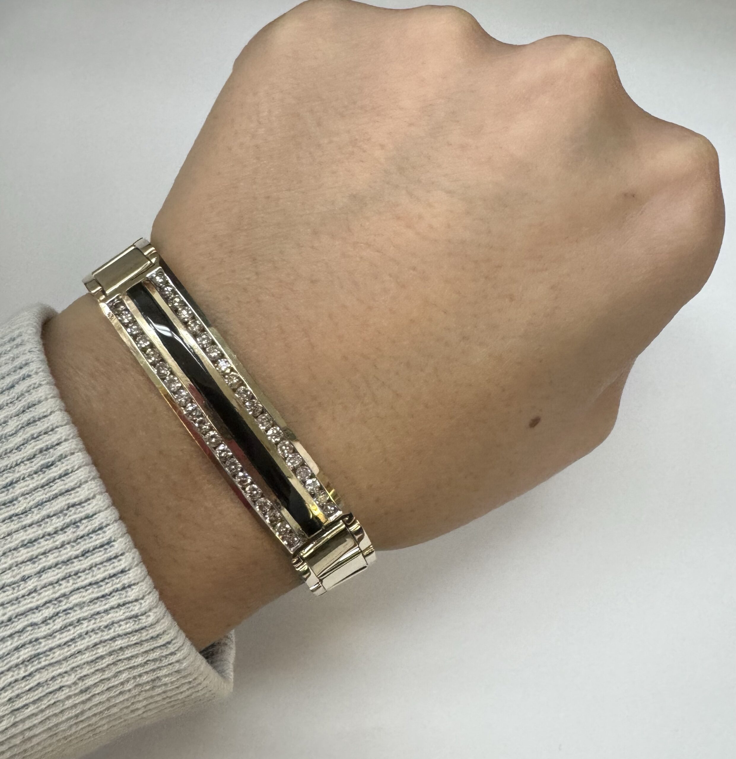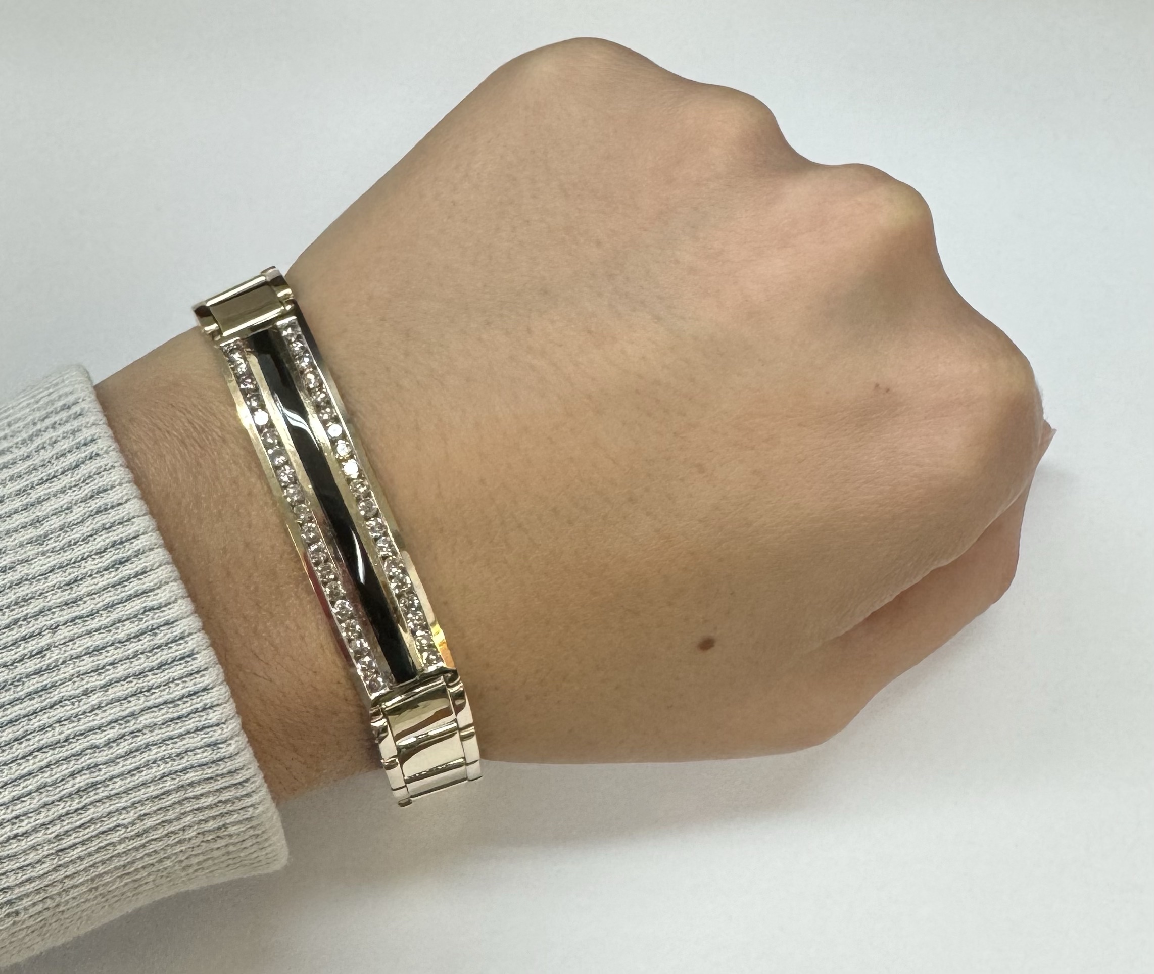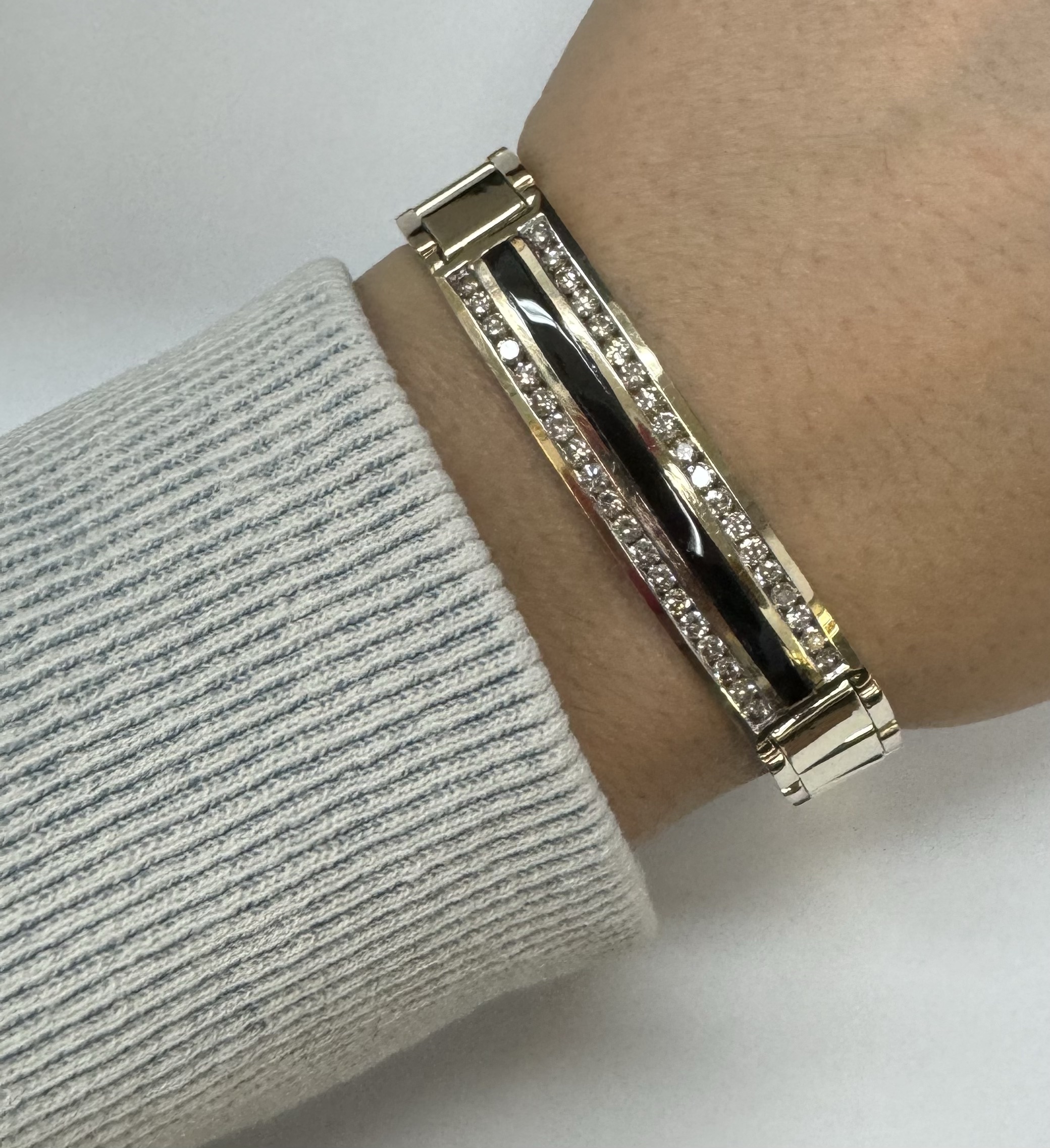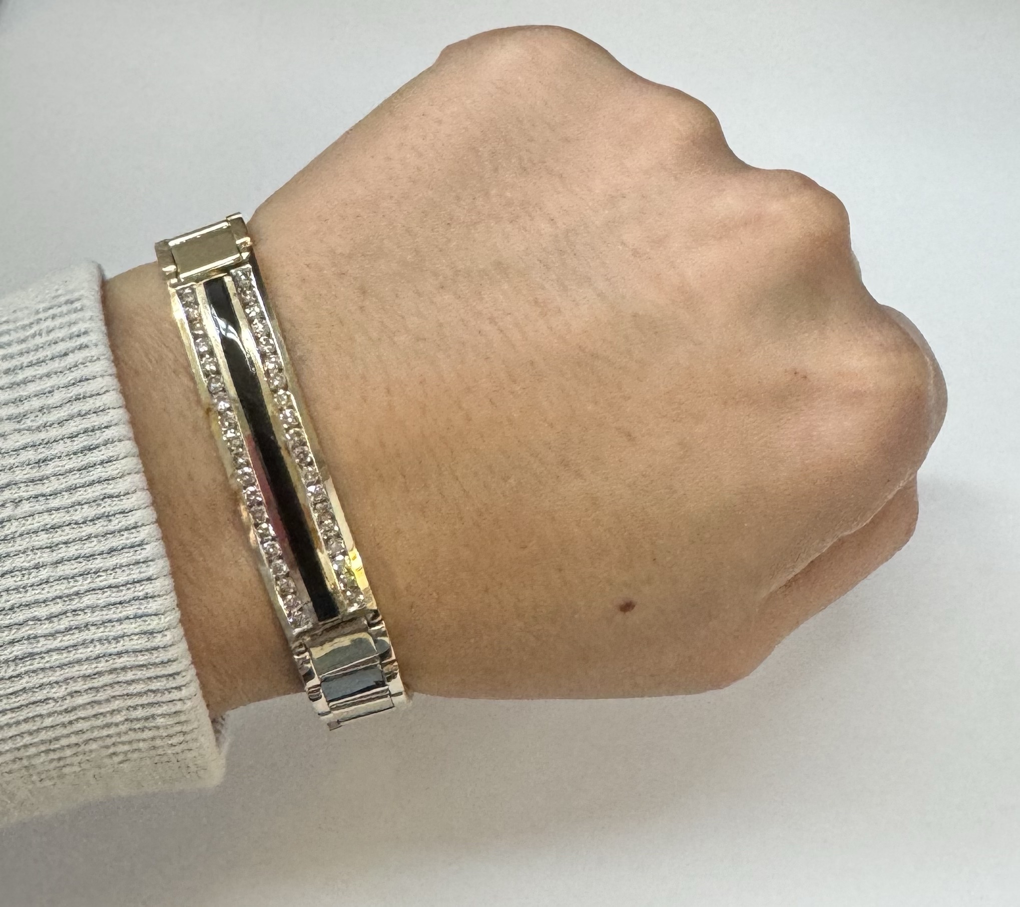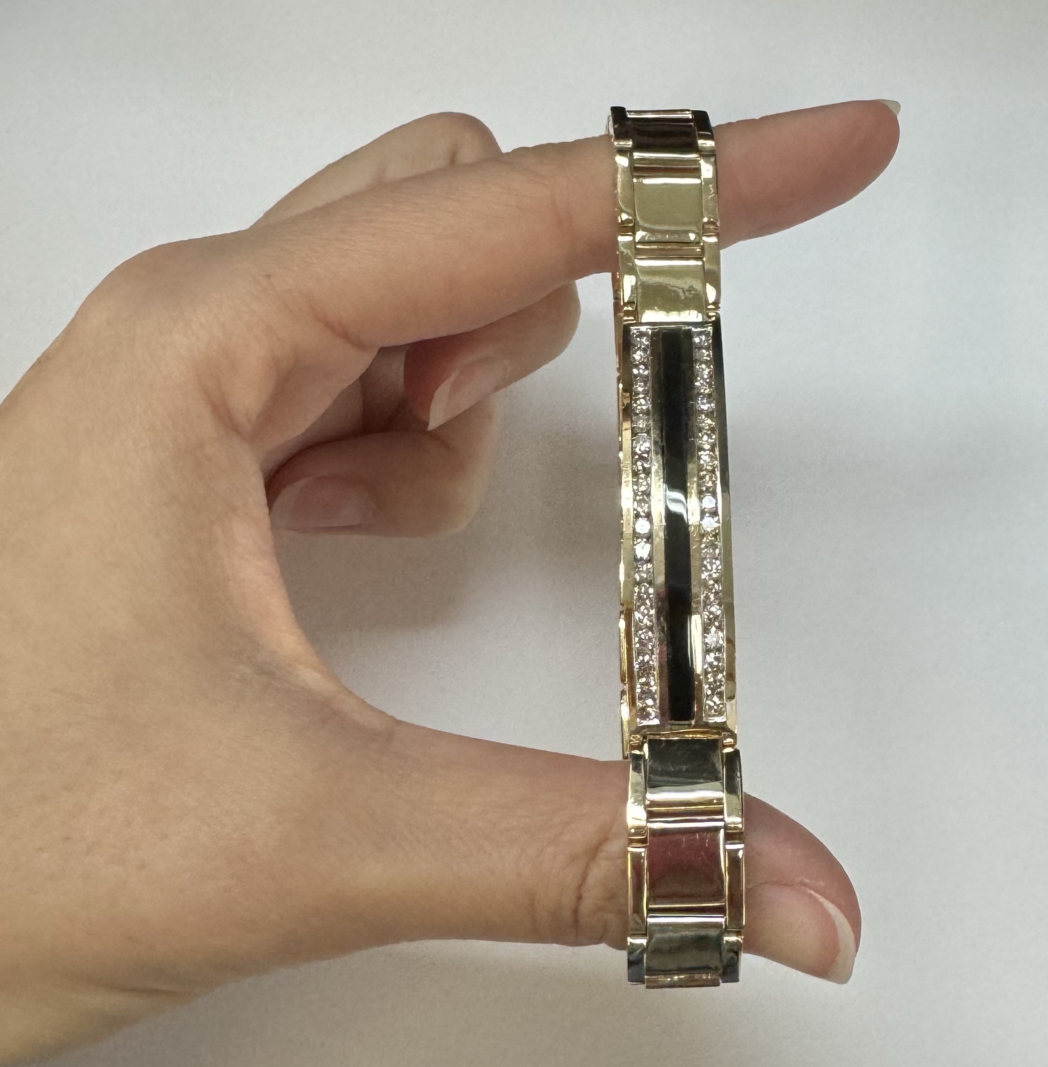 Men’s 14k yellow gold ID style link bracelet with genuine Onyx inlay and 38 genuine Round Brilliant Cut diamonds, which have a total combined weight of1.14 carats. These diamonds average H-I in color, and SI1-SI2 in clarity. This bracelet measures 11 mm in width, 8 1/4″ in total length, and it has an entire weight of 43.6 grams.