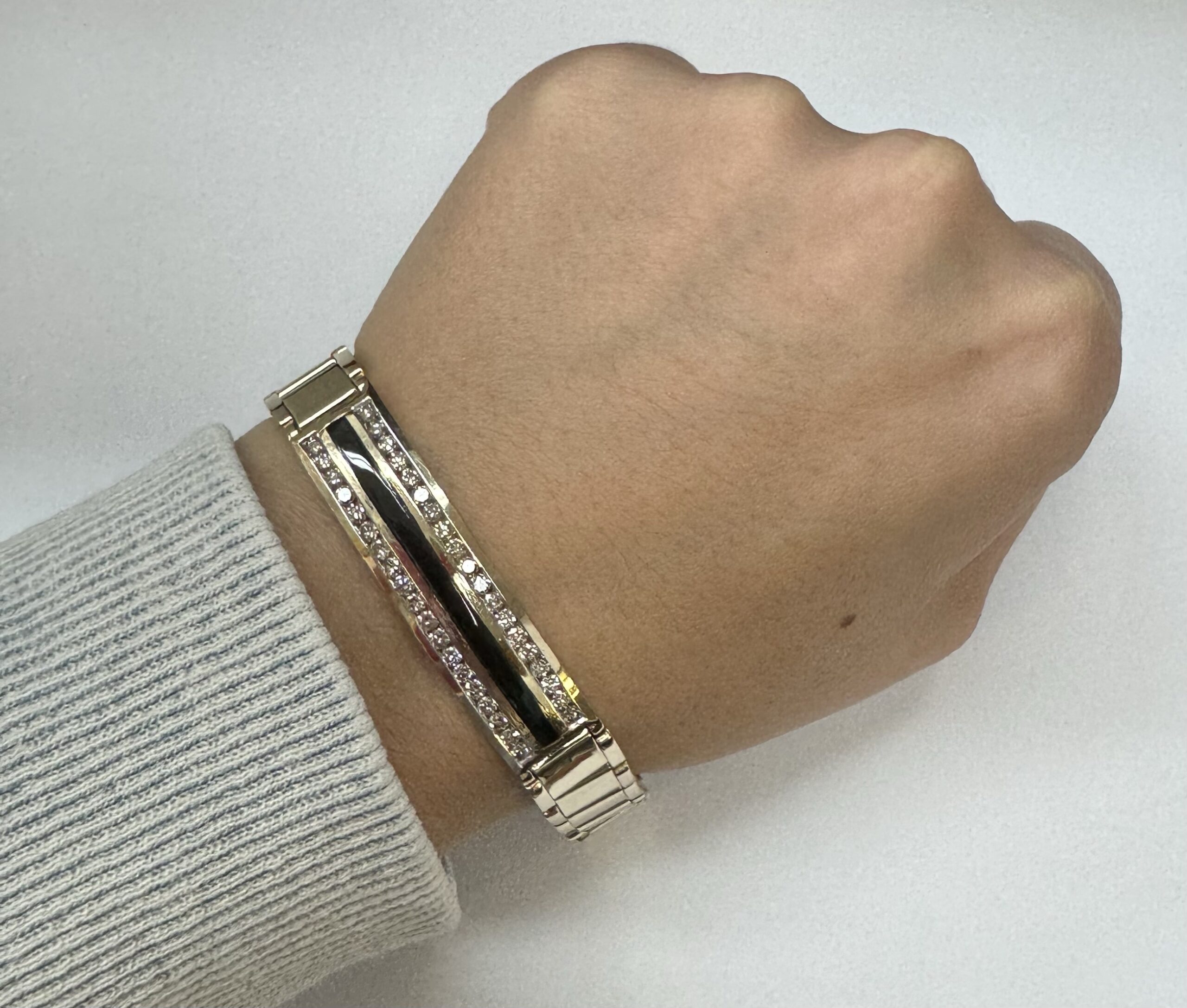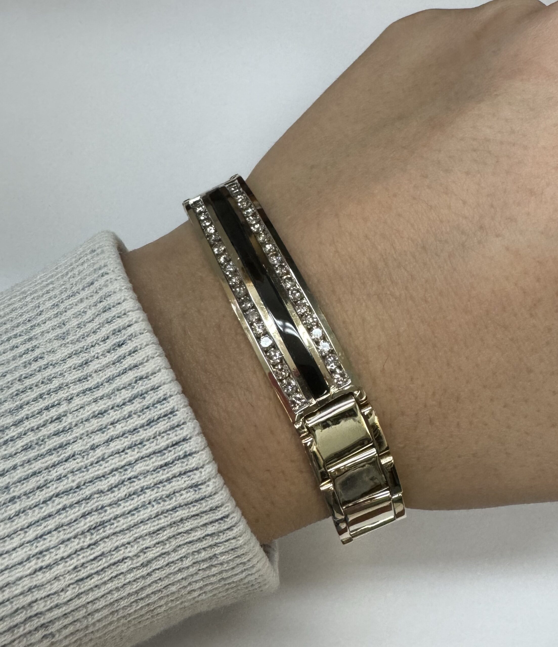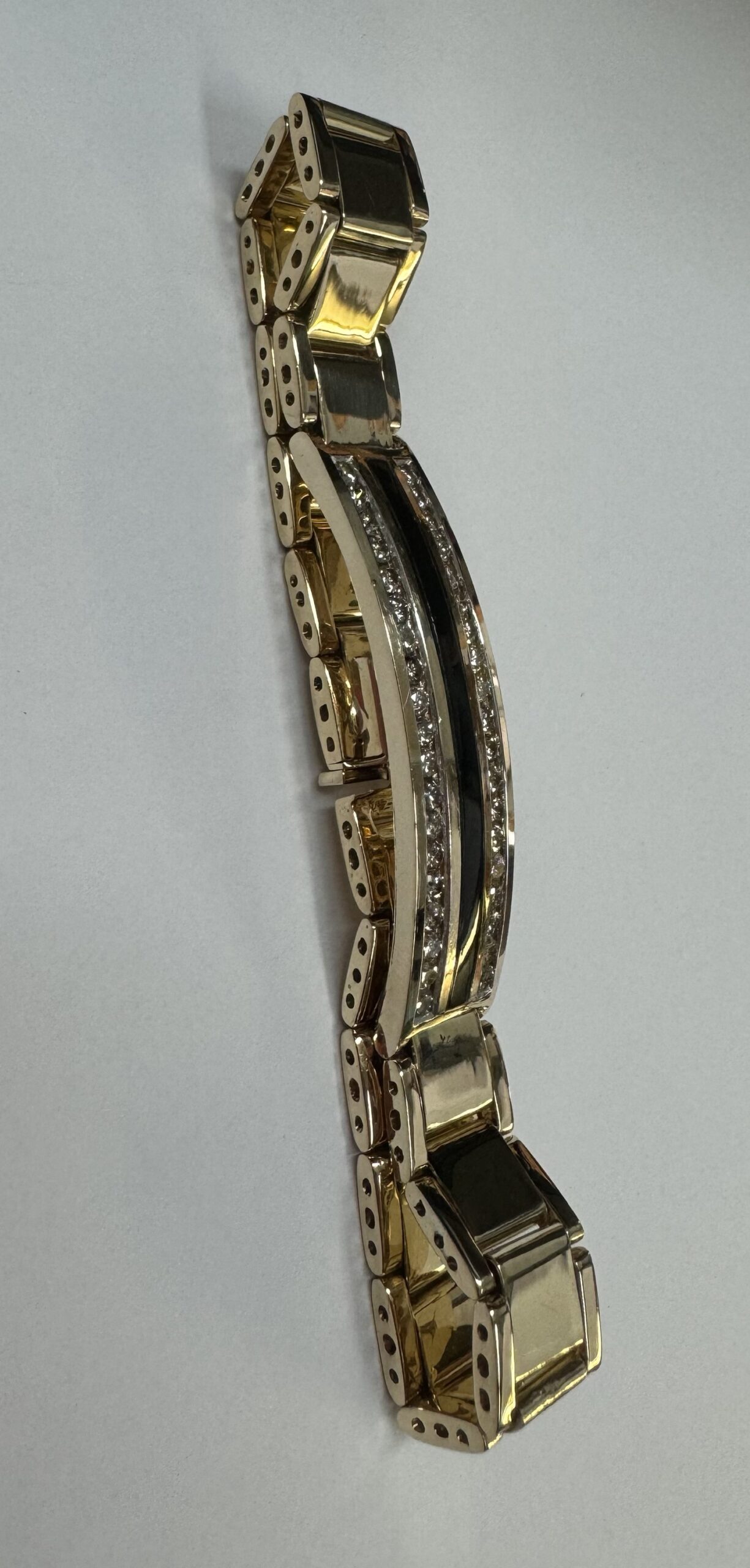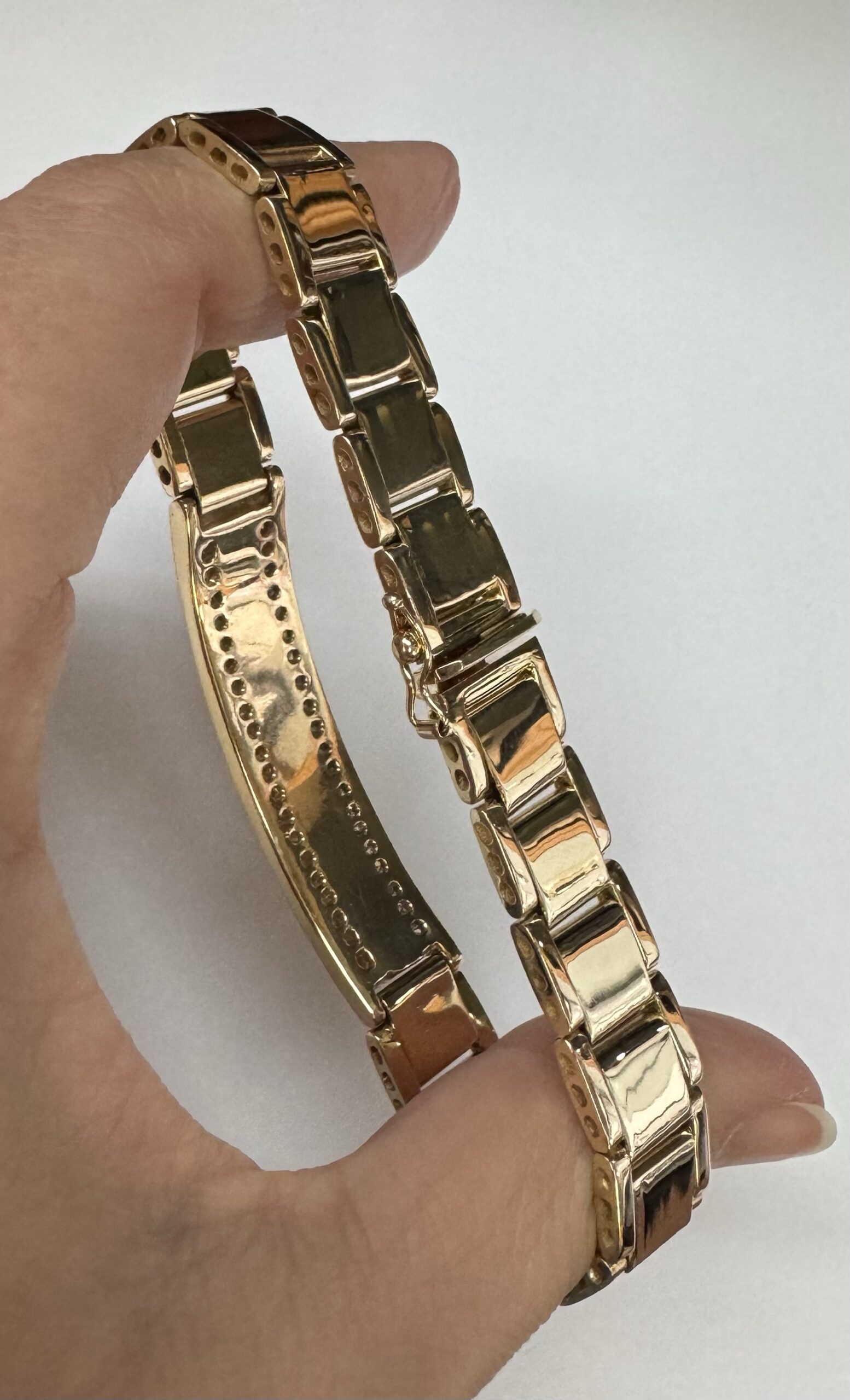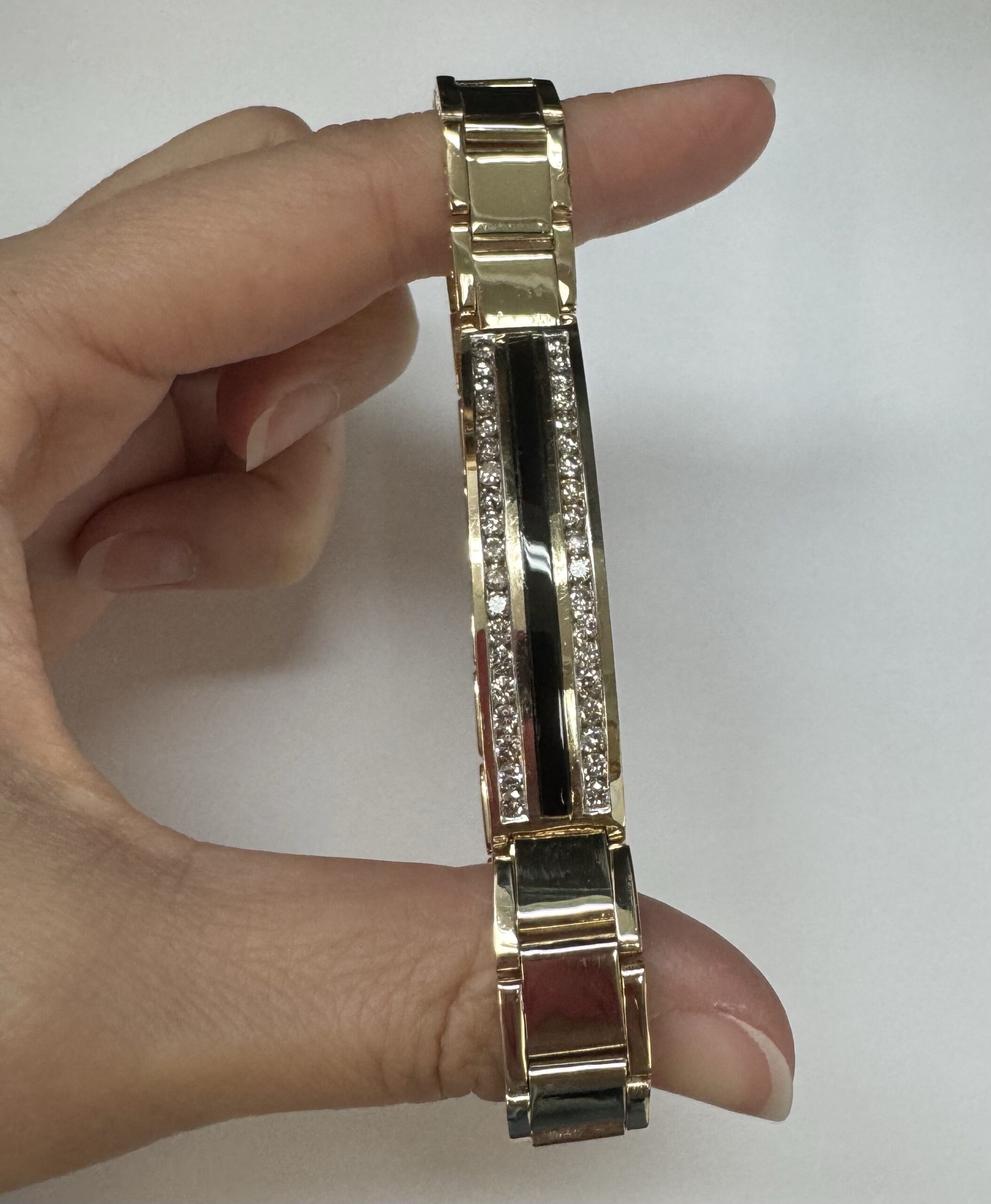 Men’s 14k yellow gold ID style link bracelet with genuine Onyx inlay and 38 genuine Round Brilliant Cut diamonds, which have a total combined weight of1.14 carats. These diamonds average H-I in color, and SI1-SI2 in clarity. This bracelet measures 11 mm in width, 8 1/4″ in total length, and it has an entire weight of 43.6 grams.