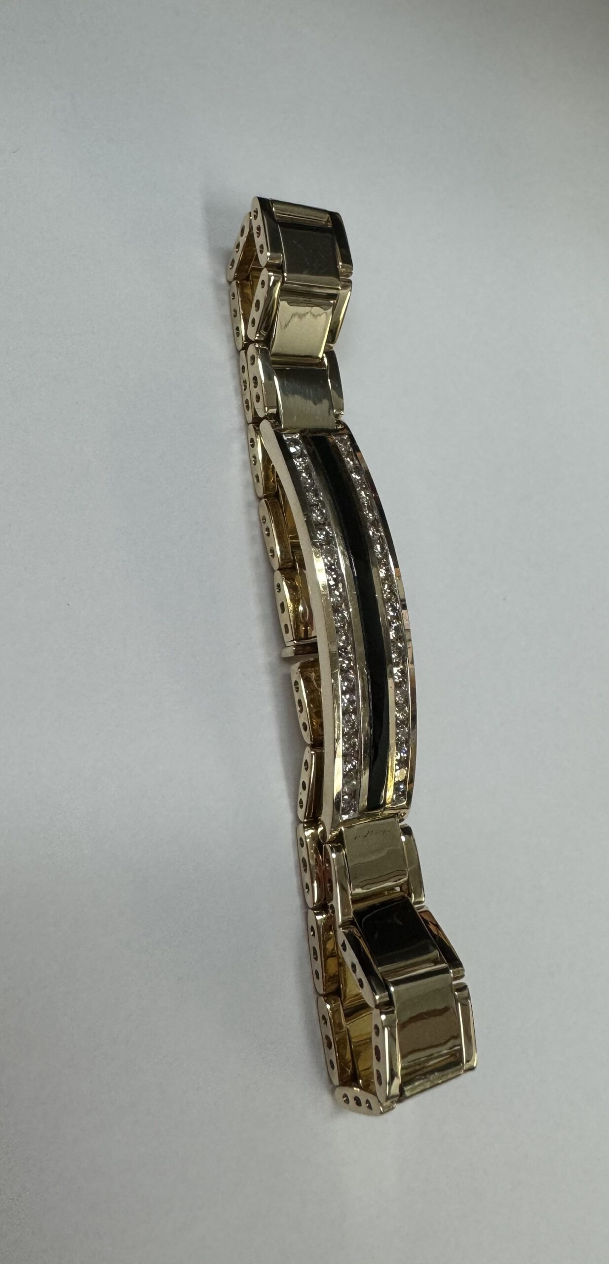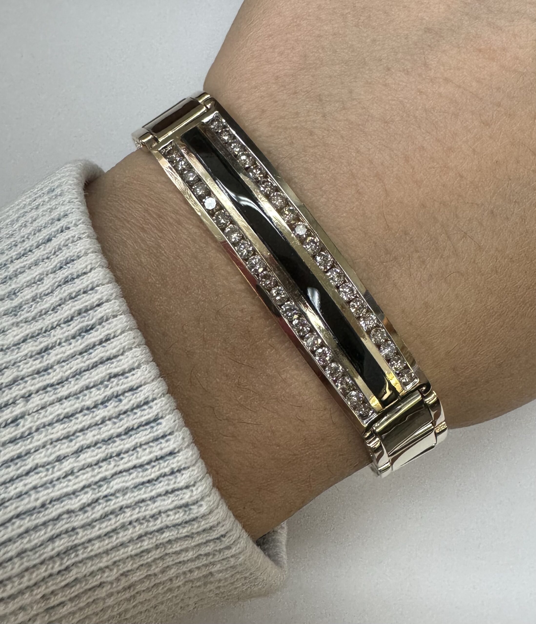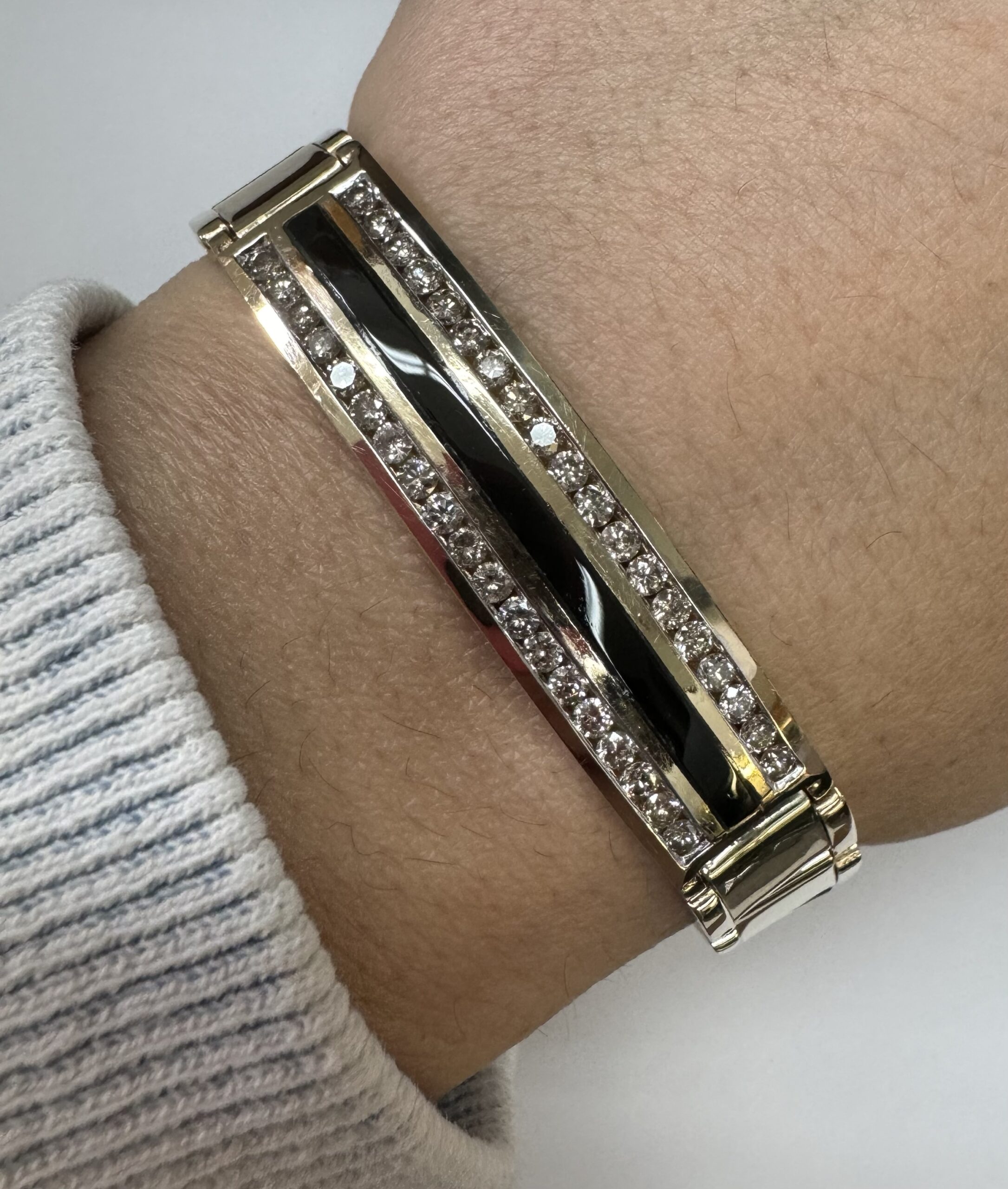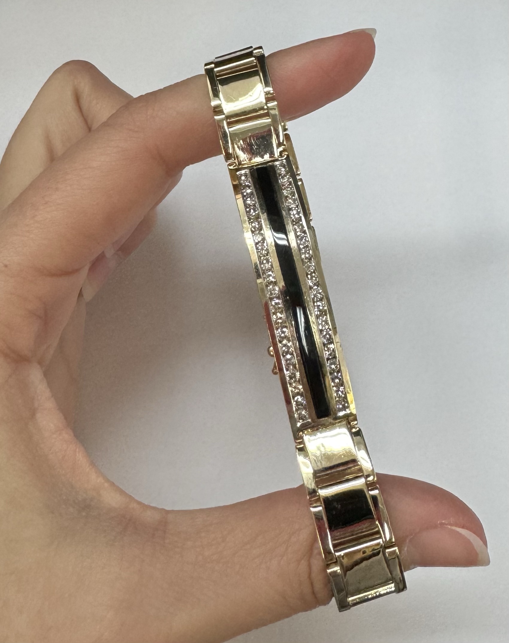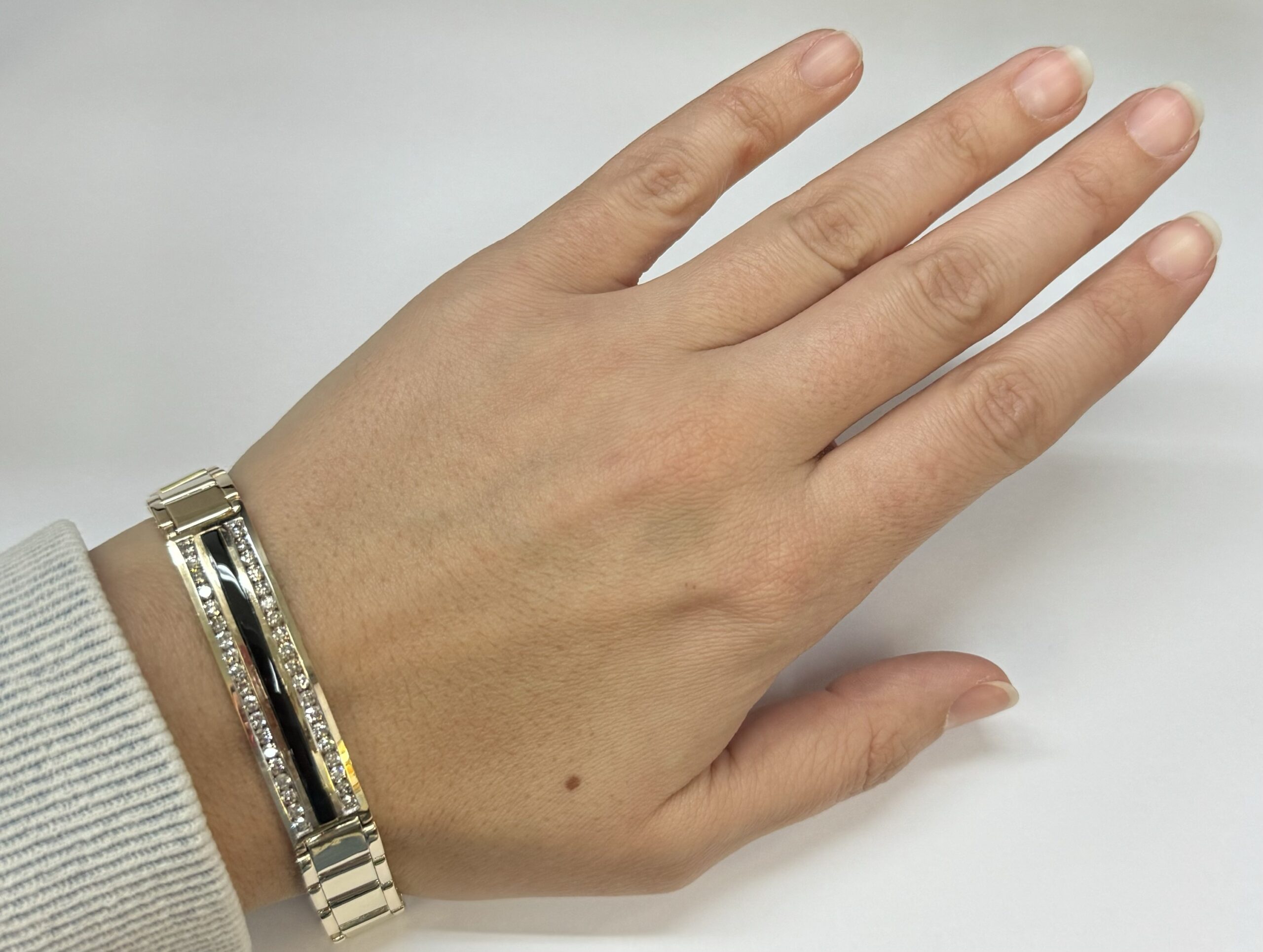 Men’s 14k yellow gold ID style link bracelet with genuine Onyx inlay and 38 genuine Round Brilliant Cut diamonds, which have a total combined weight of1.14 carats. These diamonds average H-I in color, and SI1-SI2 in clarity. This bracelet measures 11 mm in width, 8 1/4″ in total length, and it has an entire weight of 43.6 grams.