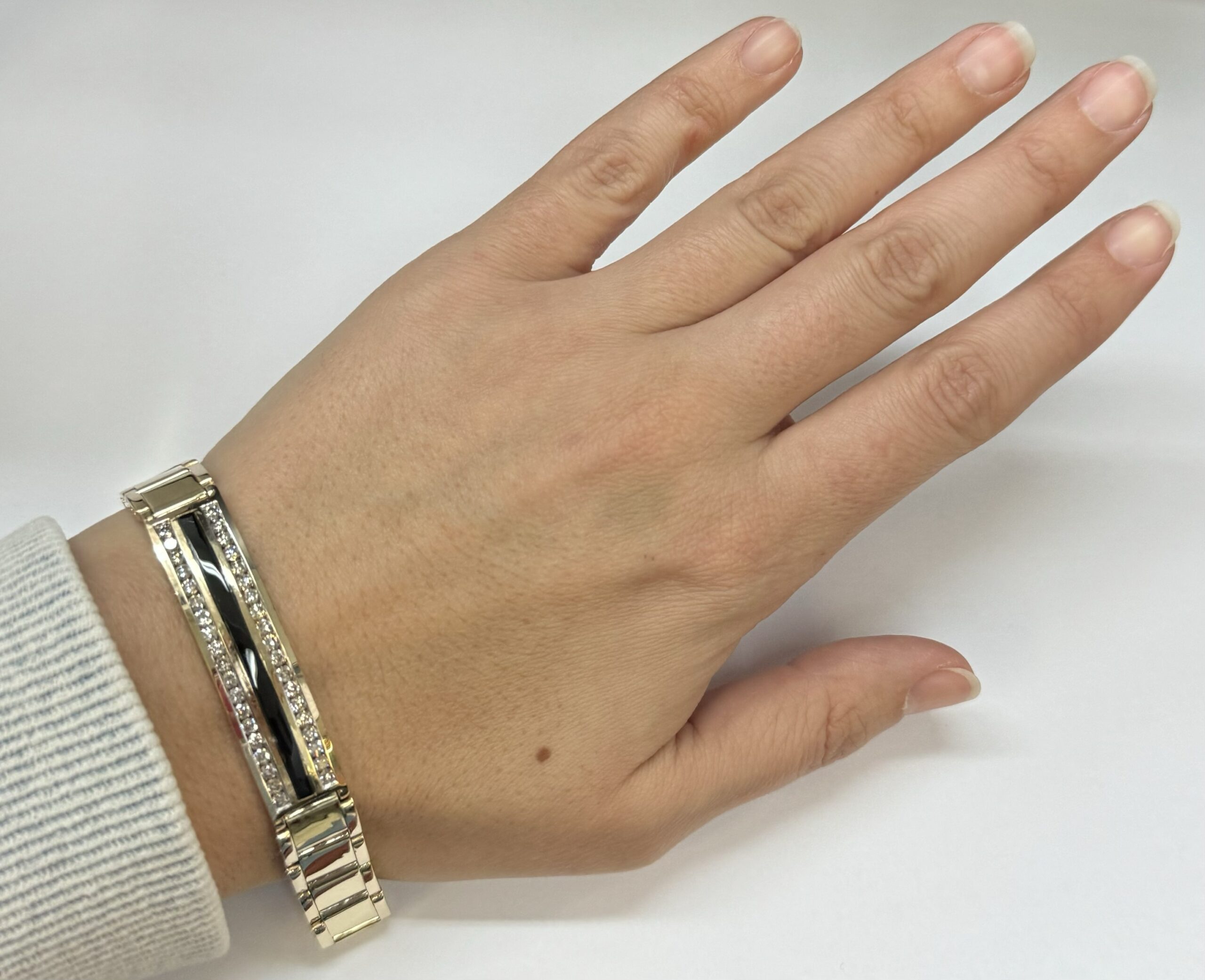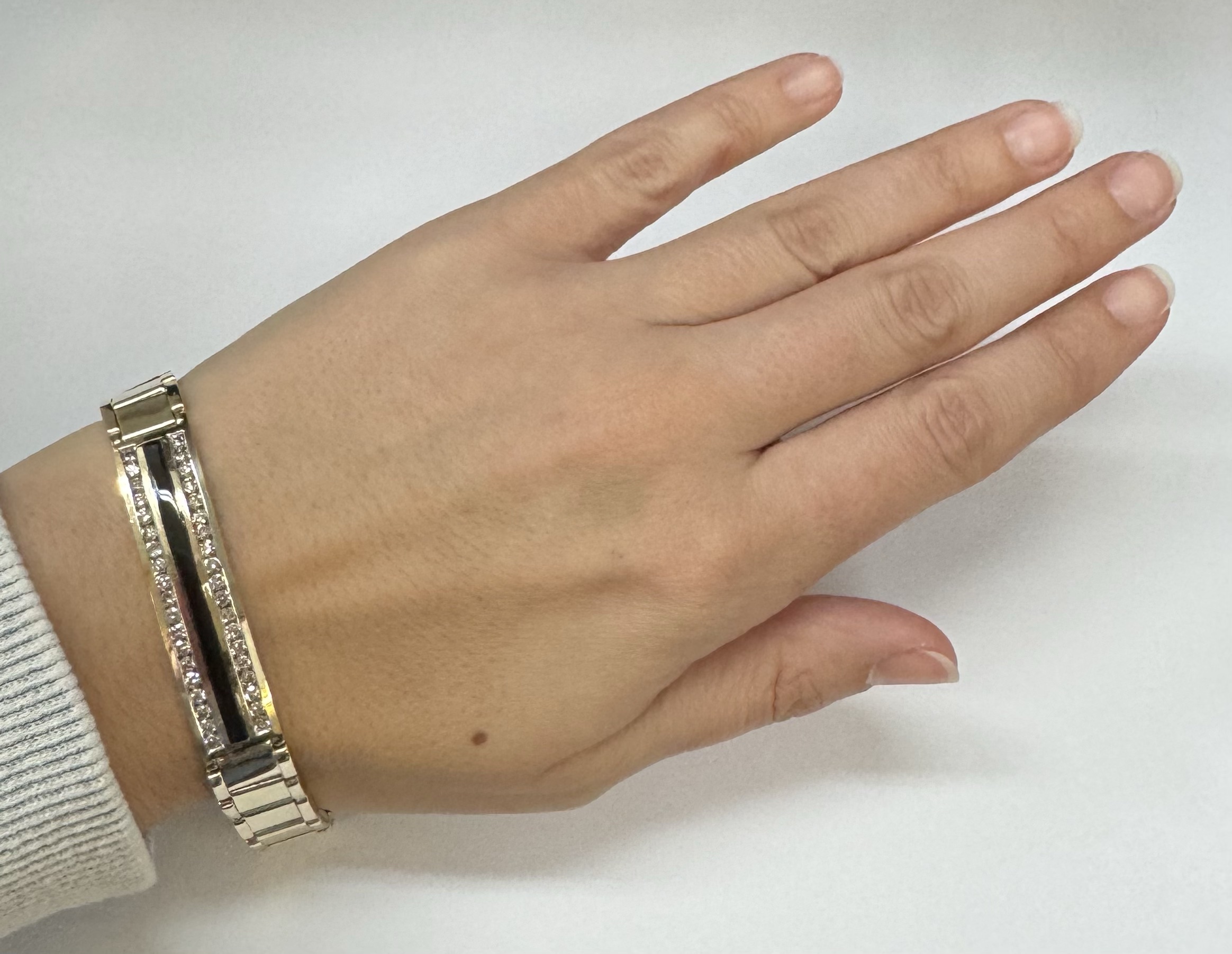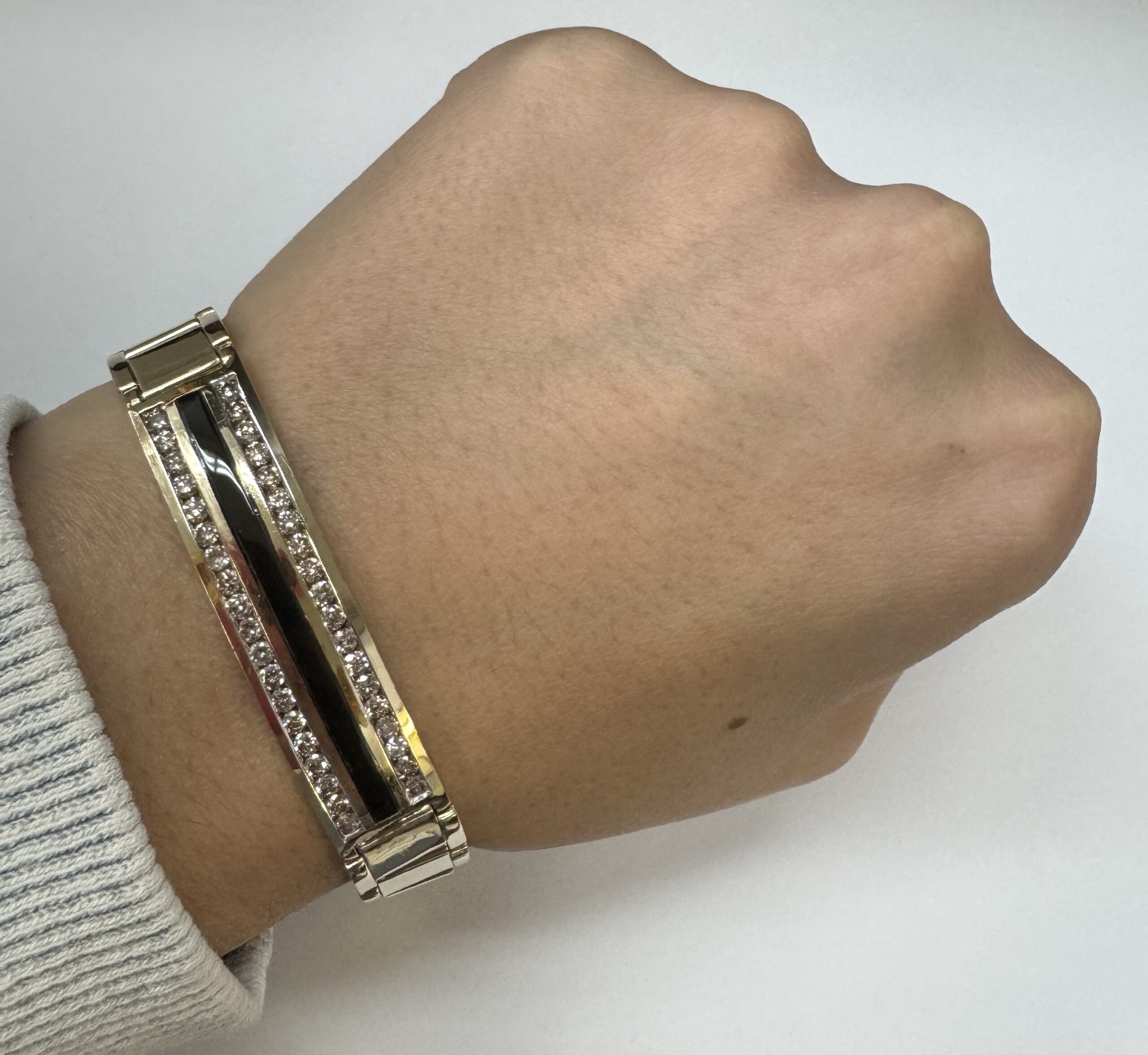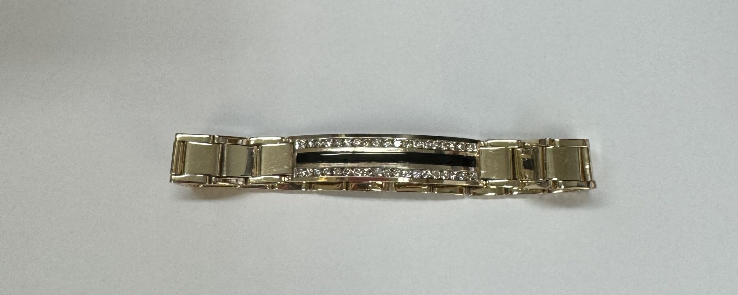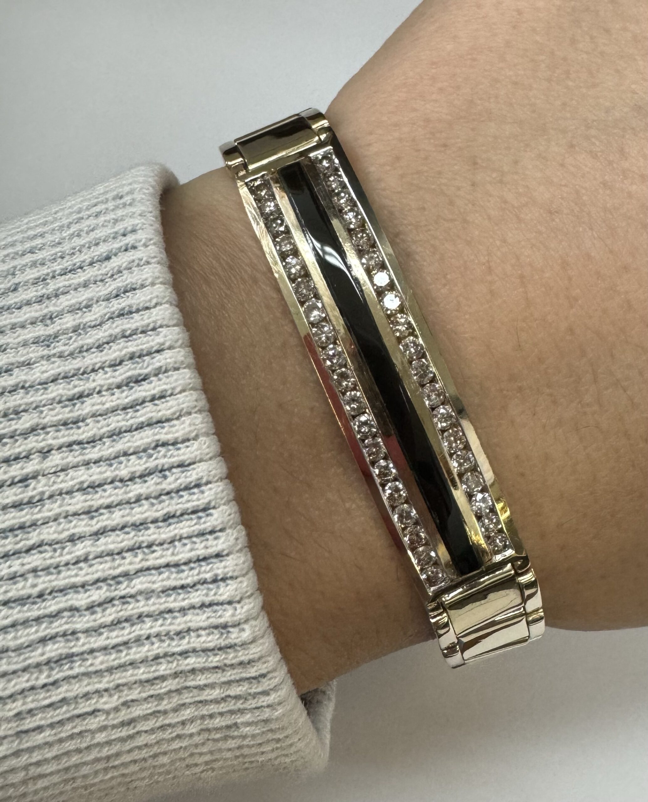 Men’s 14k yellow gold ID style link bracelet with genuine Onyx inlay and 38 genuine Round Brilliant Cut diamonds, which have a total combined weight of1.14 carats. These diamonds average H-I in color, and SI1-SI2 in clarity. This bracelet measures 11 mm in width, 8 1/4″ in total length, and it has an entire weight of 43.6 grams.