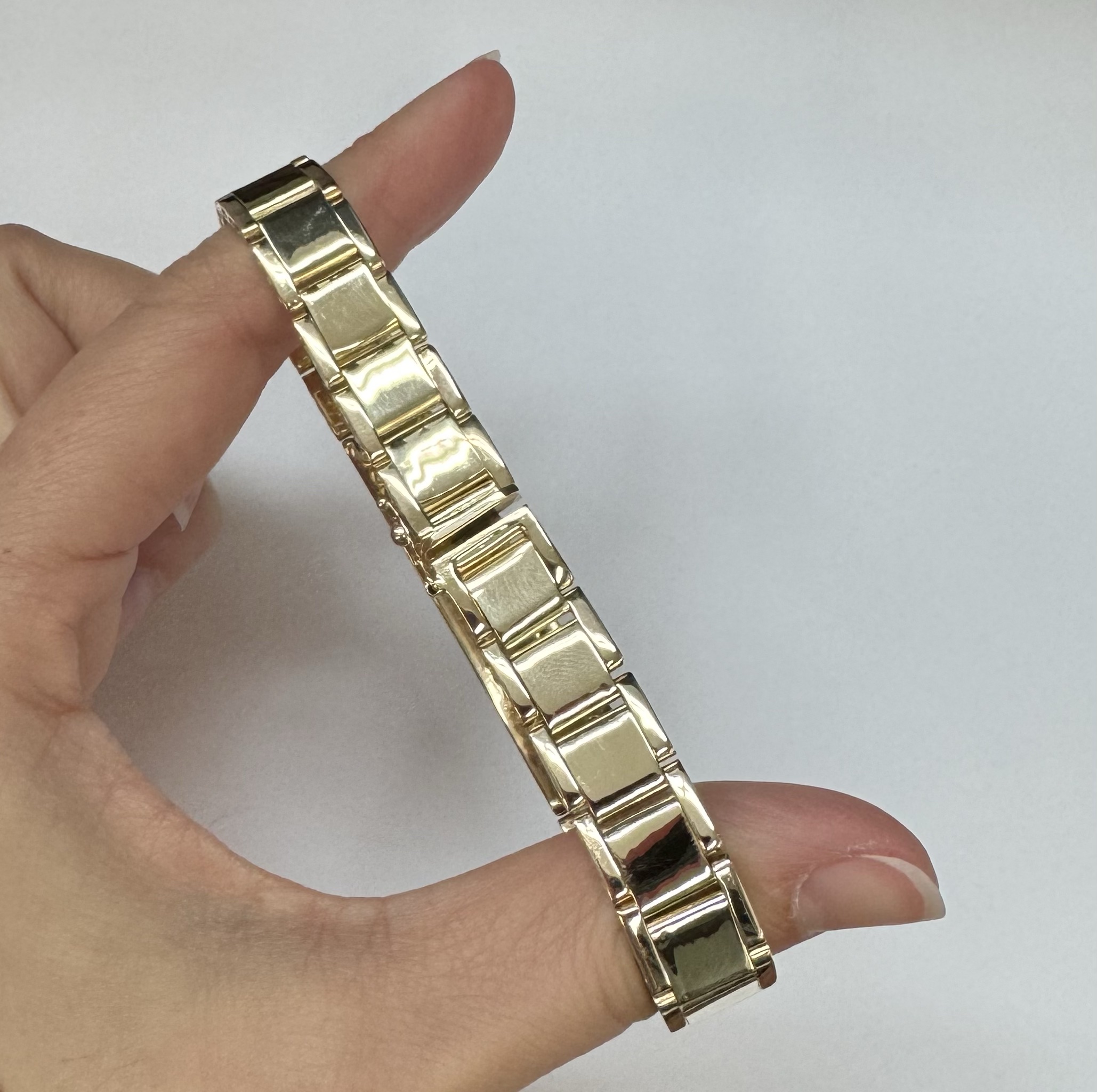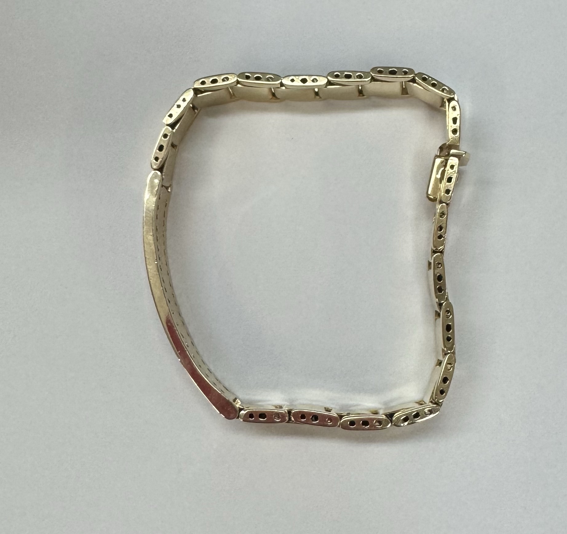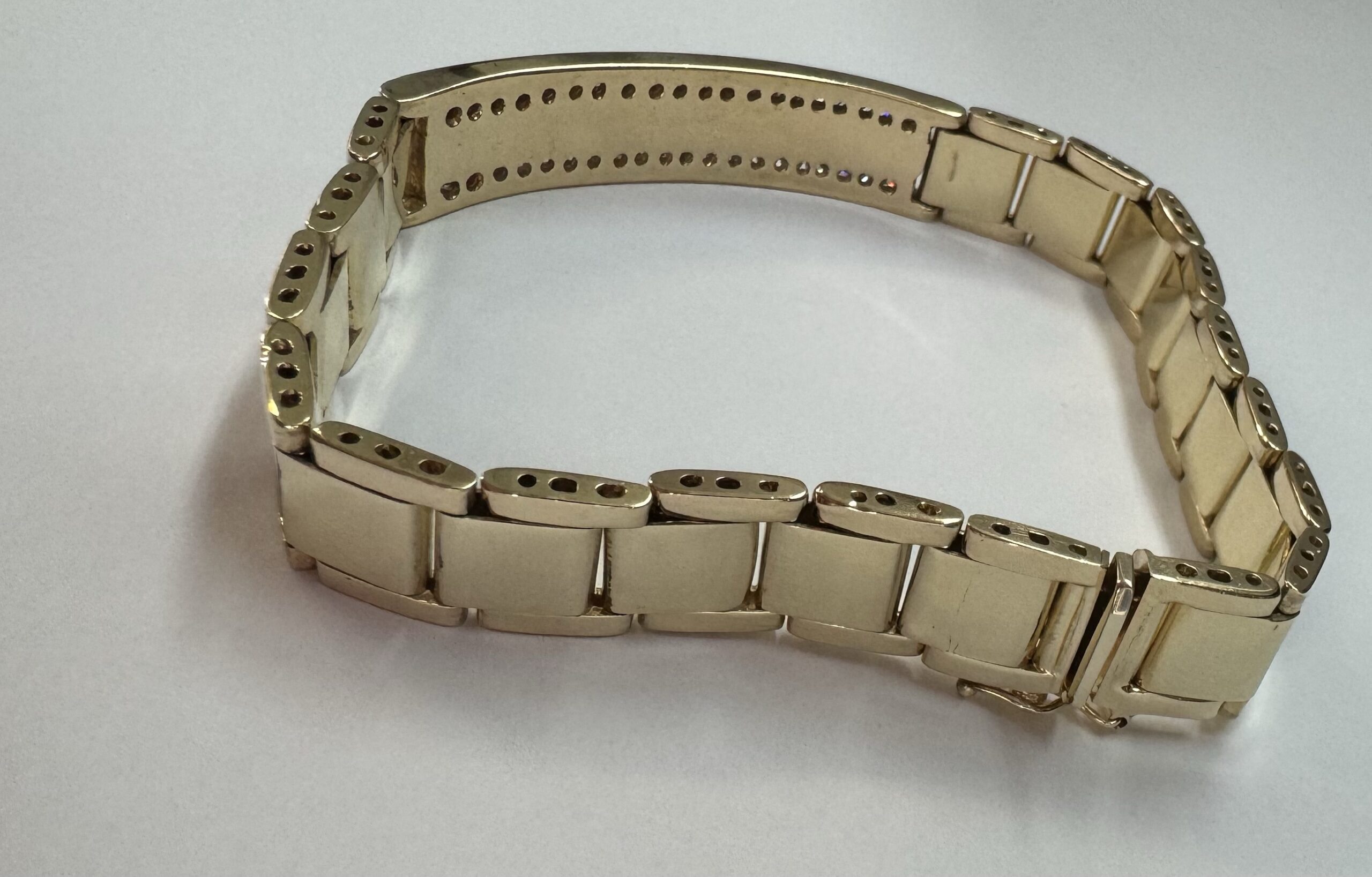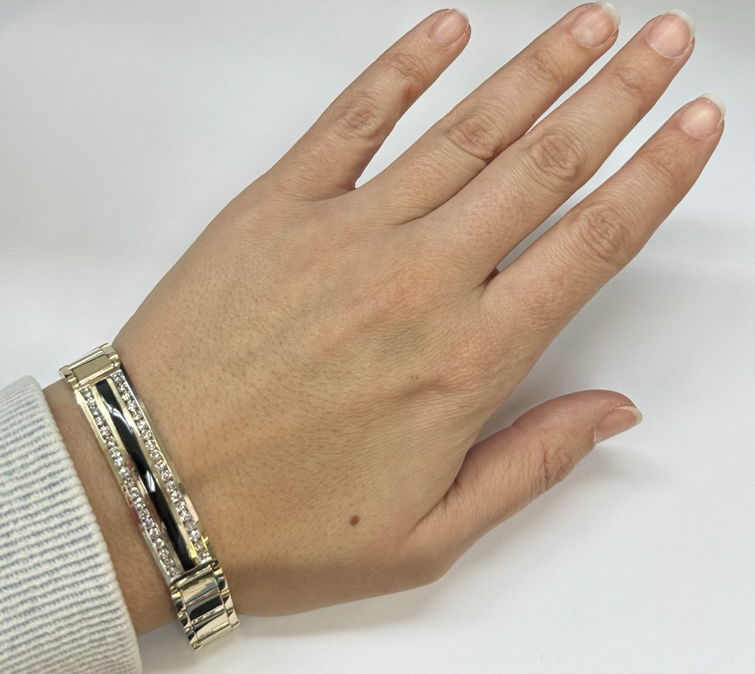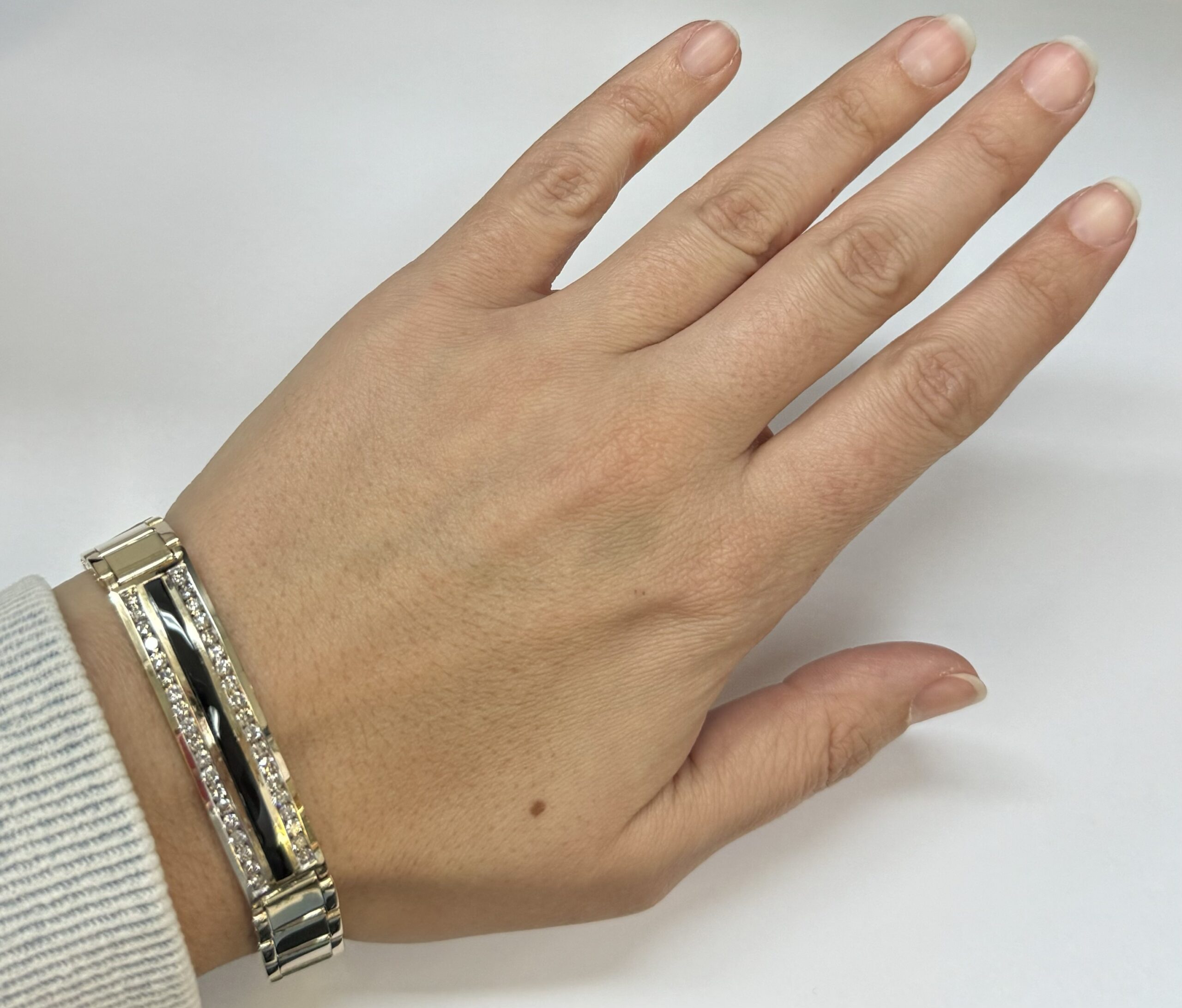 Men’s 14k yellow gold ID style link bracelet with genuine Onyx inlay and 38 genuine Round Brilliant Cut diamonds, which have a total combined weight of1.14 carats. These diamonds average H-I in color, and SI1-SI2 in clarity. This bracelet measures 11 mm in width, 8 1/4″ in total length, and it has an entire weight of 43.6 grams.