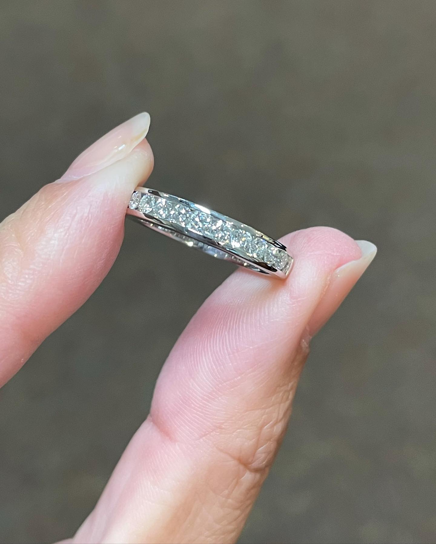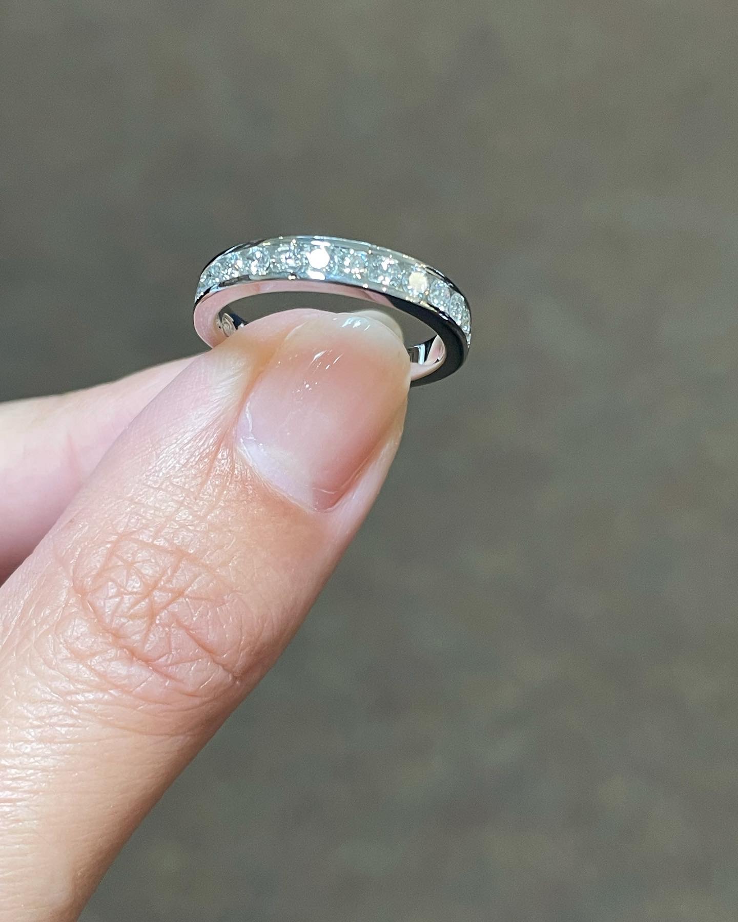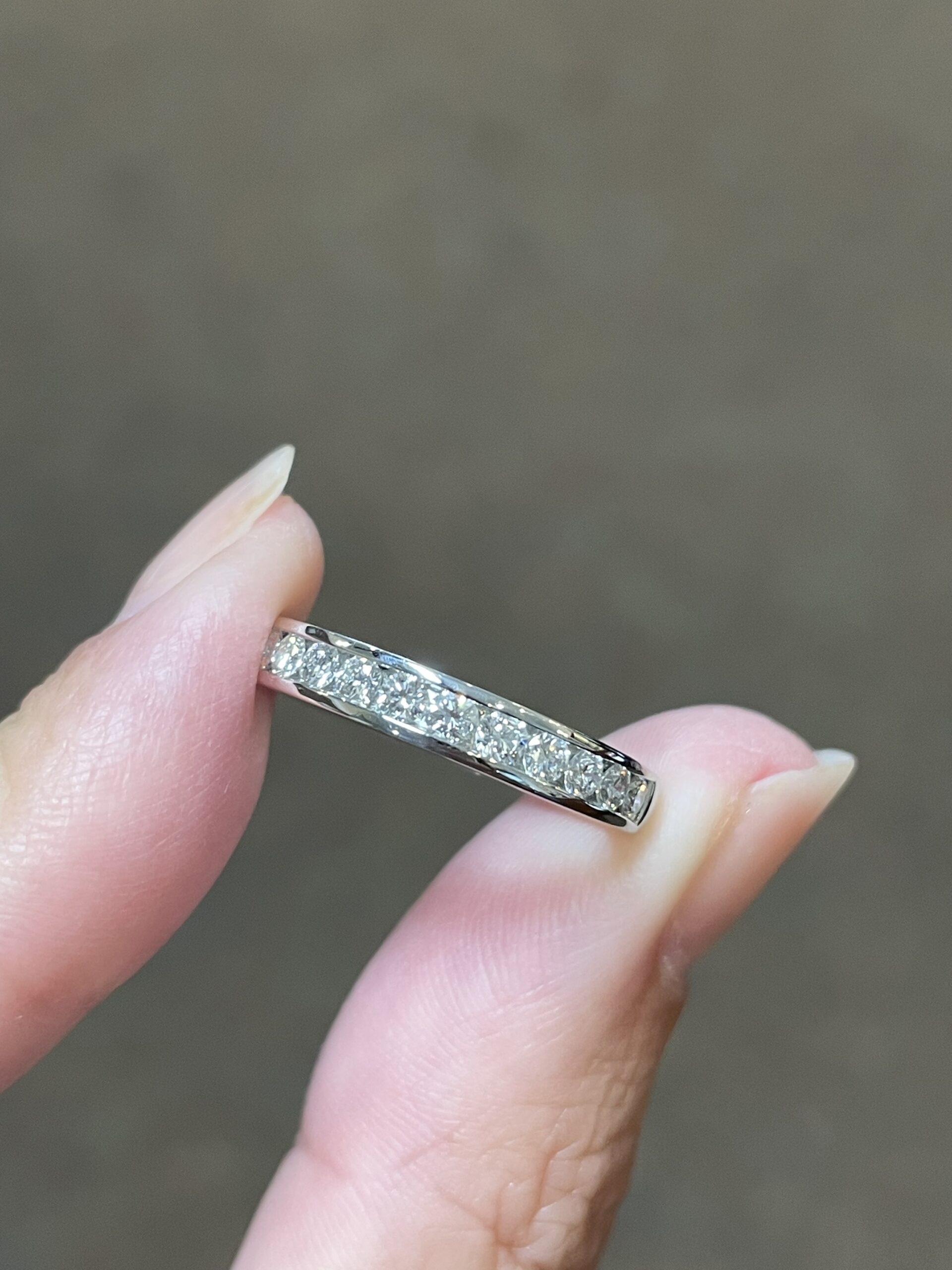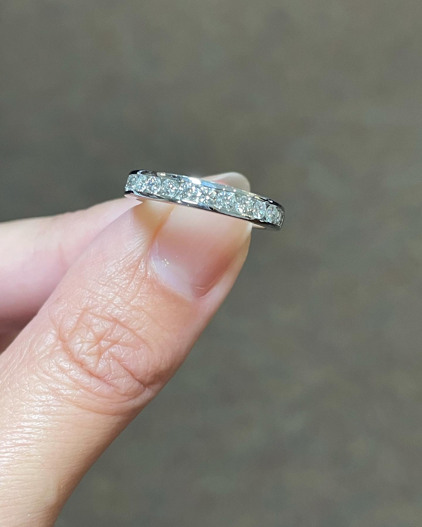 Platinum 14 stone genuine .55 Cttw Round Brilliant Cut Diamond channel set band. These diamonds average G in color, and SI1 in clarity. These diamonds are nicely proportioned and well finished. This ring measures 3.5 mm in width, and it has an entire weight of 5.7 grams. This ring is a finger size 5 3/4, but it can be reasonably sized at no additional charge. Please make note of the finger size needed in the comments section at checkout.