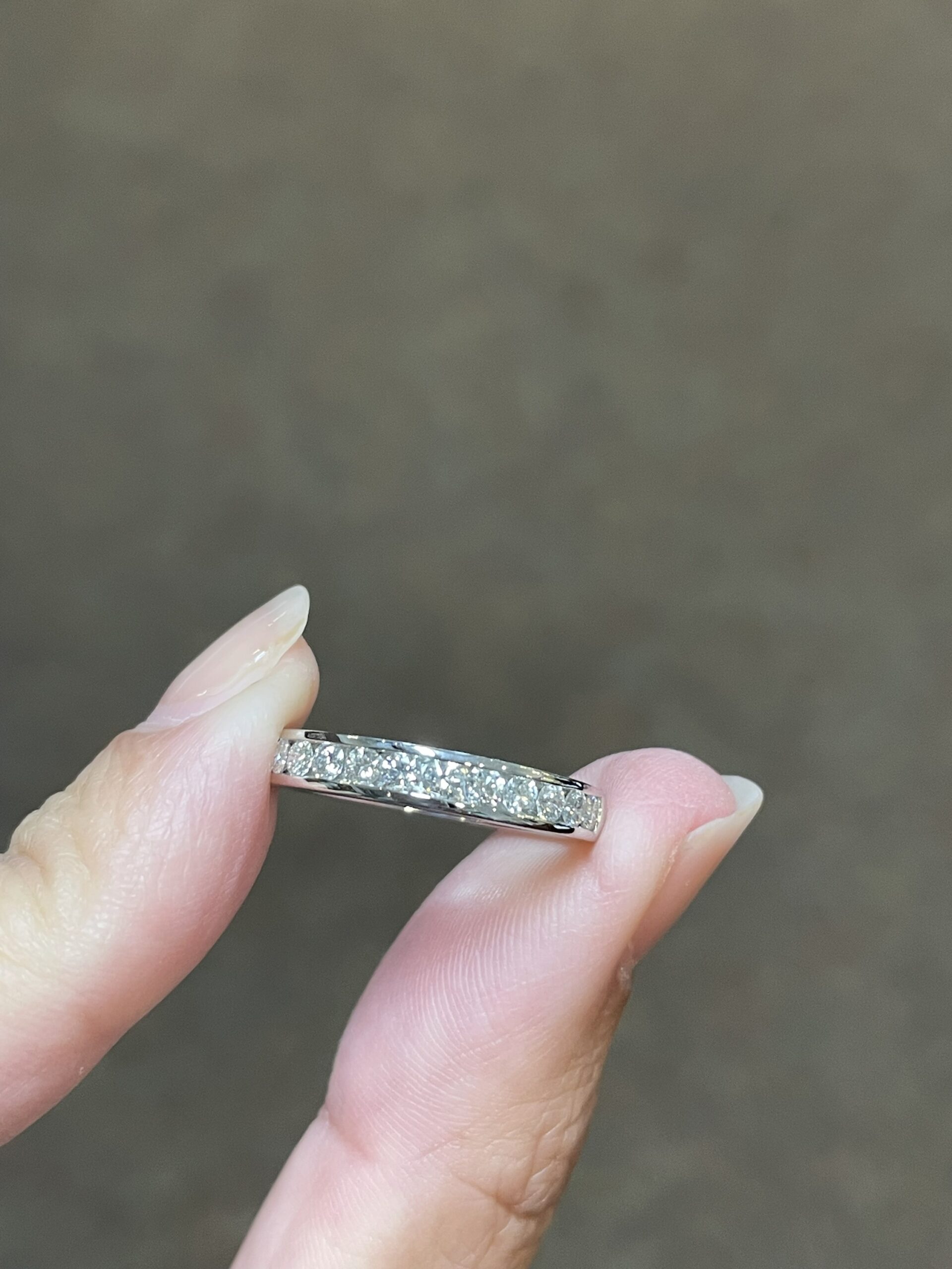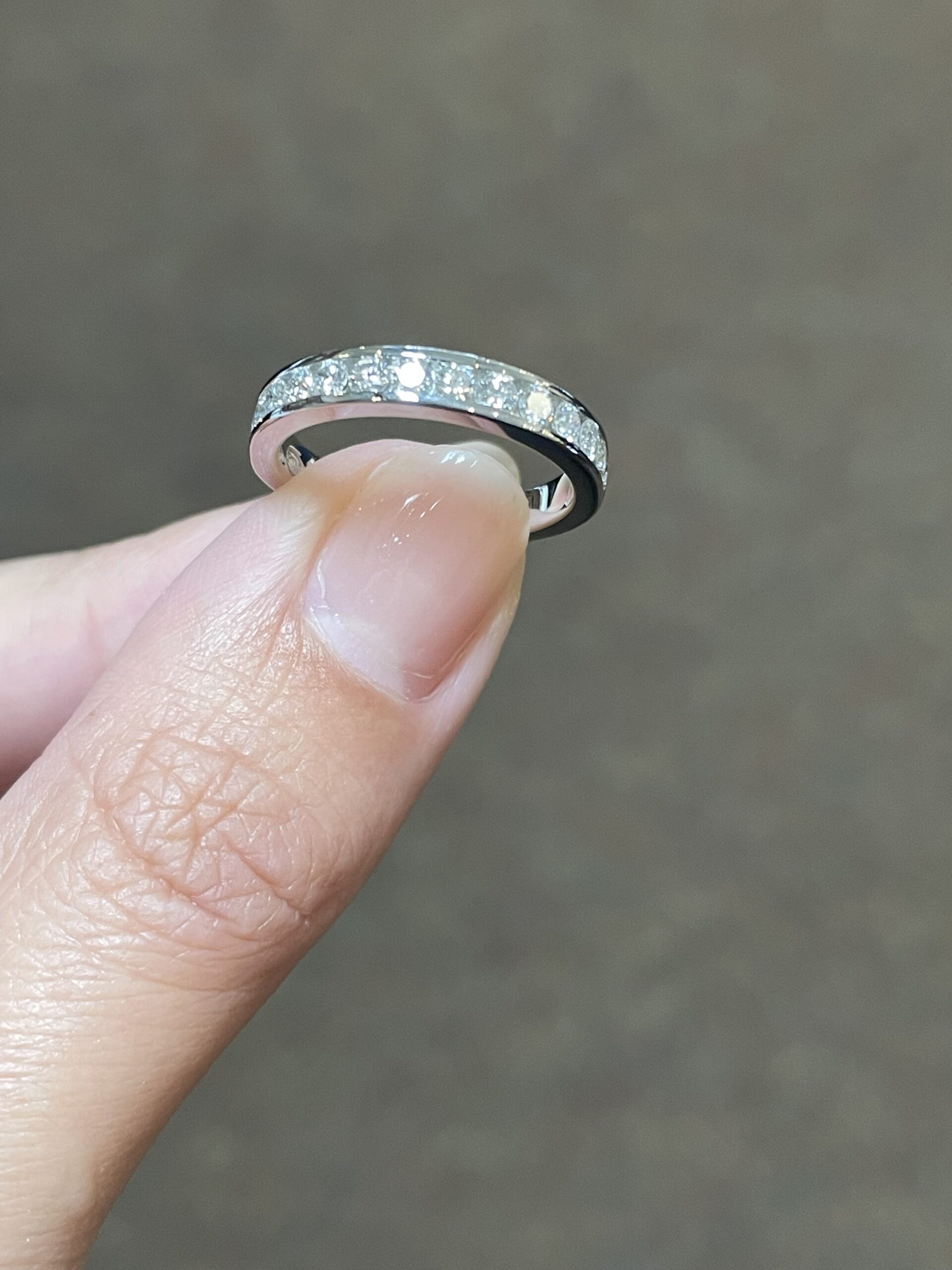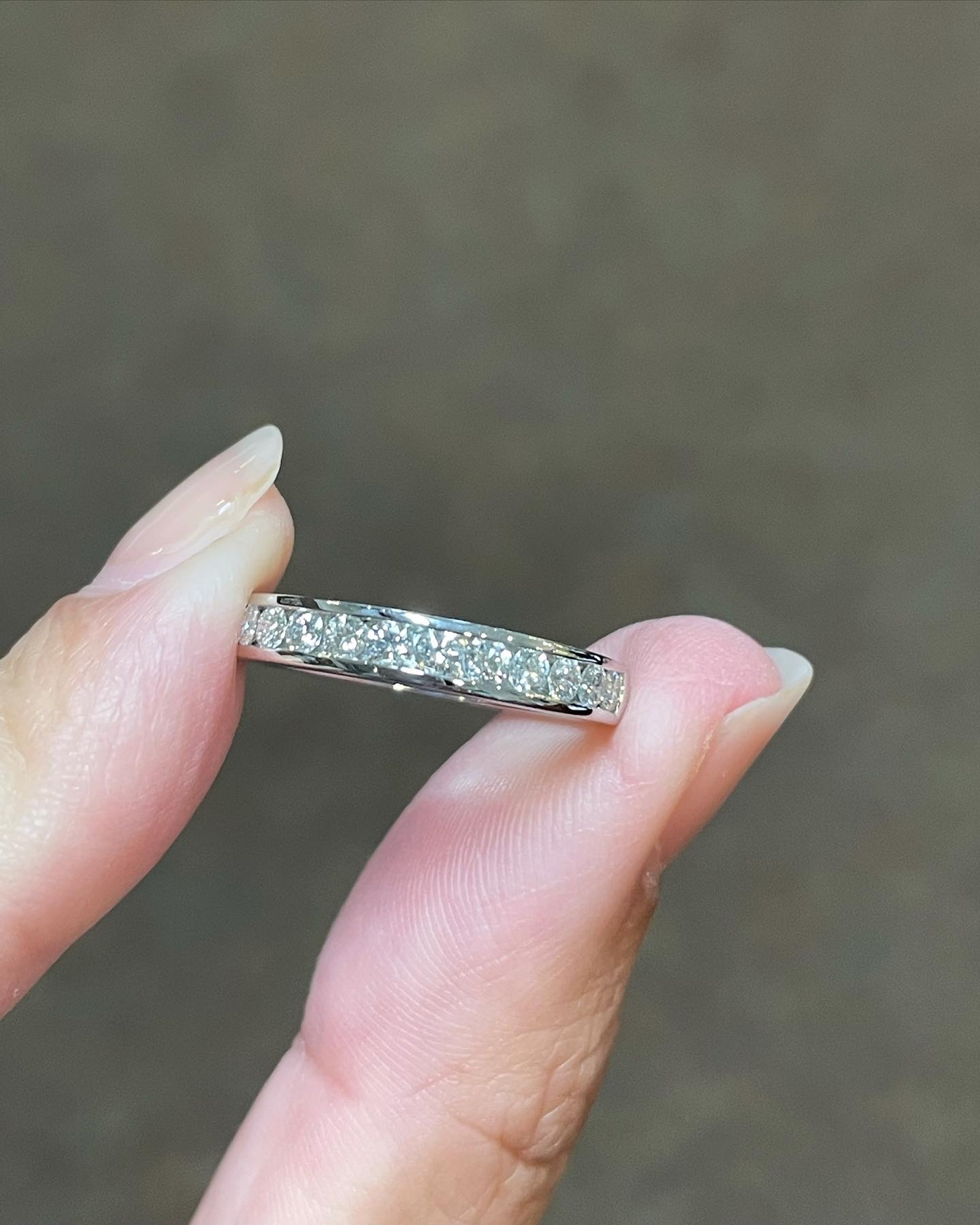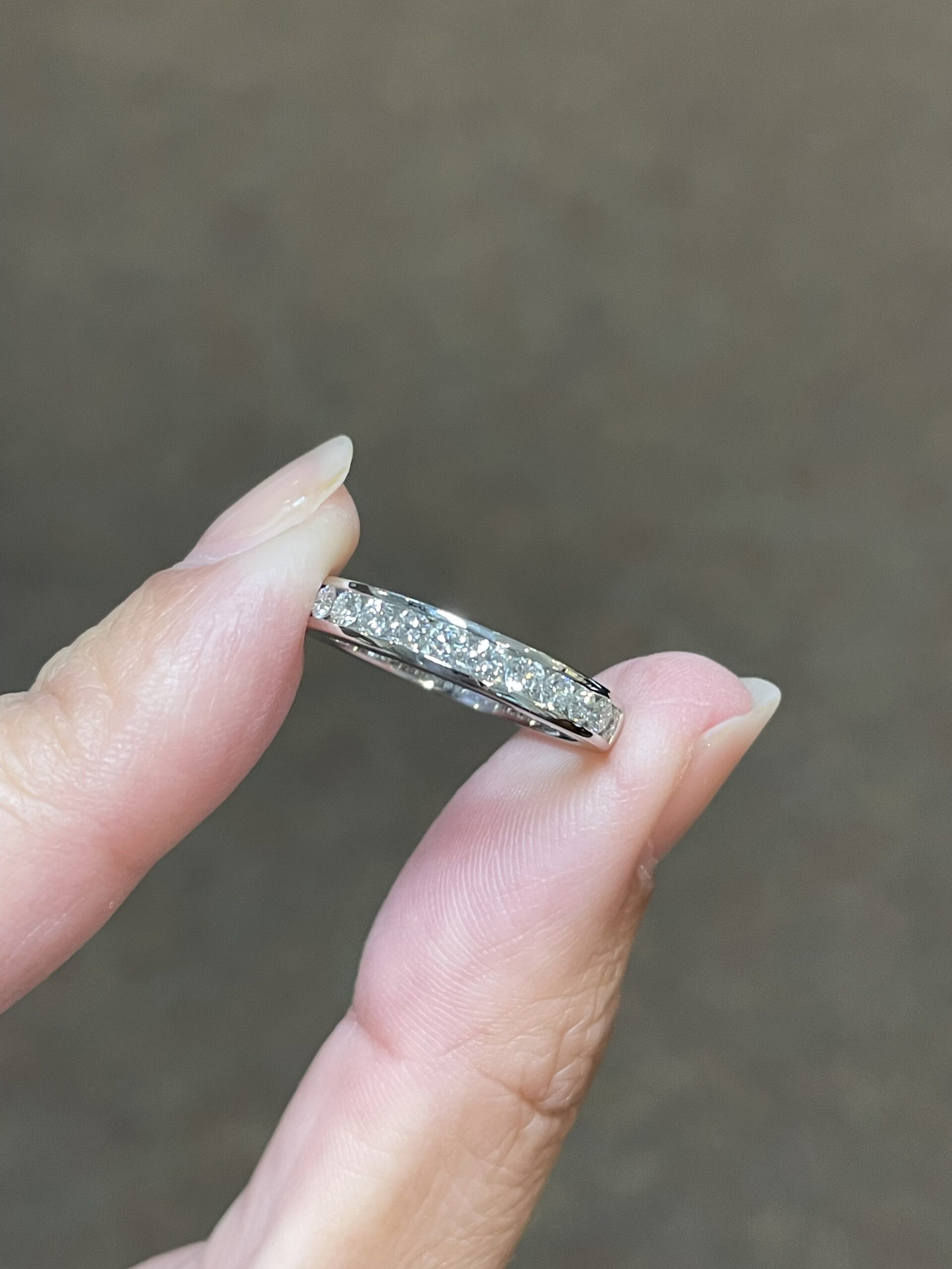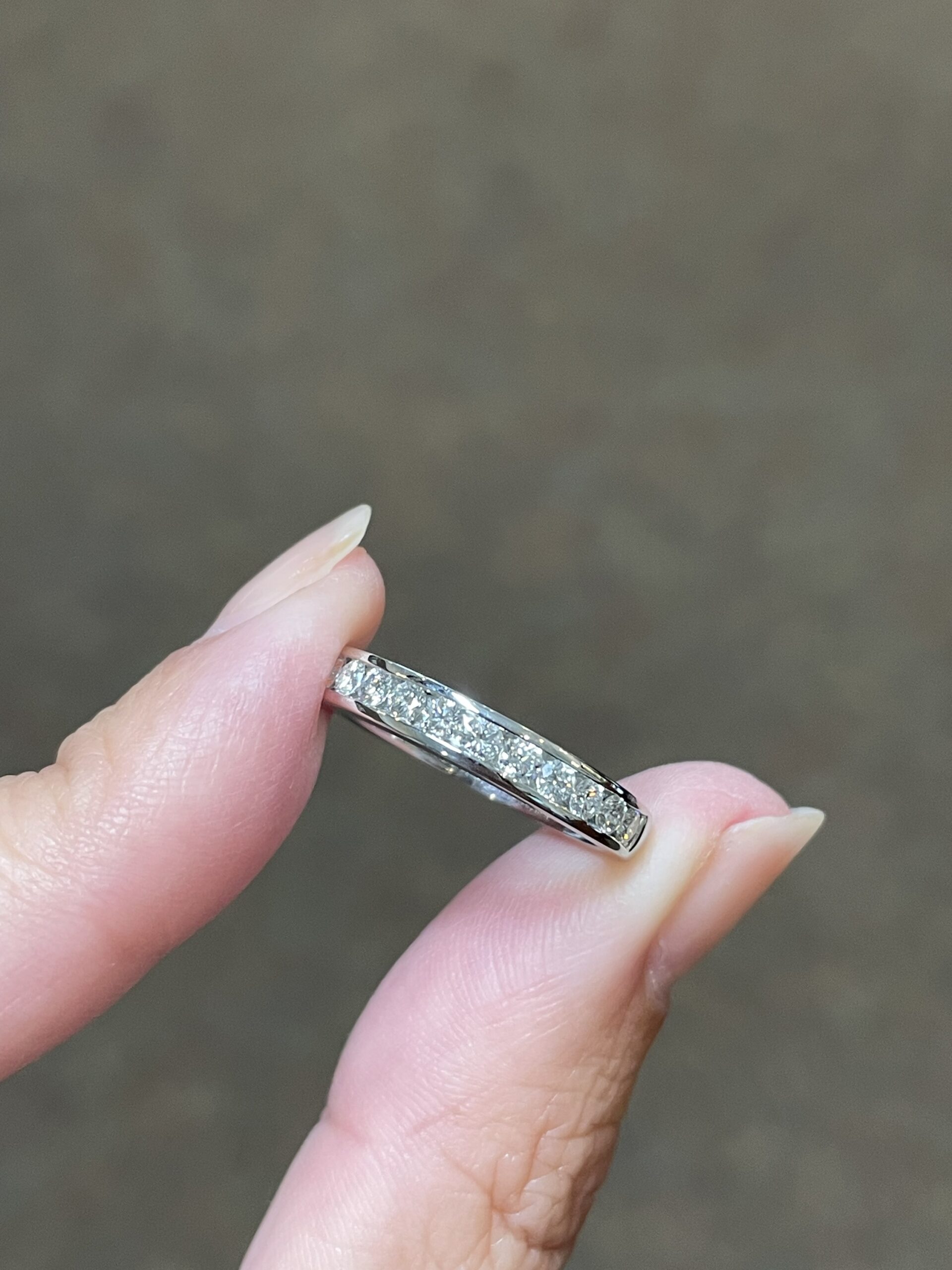 Platinum 14 stone genuine .55 Cttw Round Brilliant Cut Diamond channel set band. These diamonds average G in color, and SI1 in clarity. These diamonds are nicely proportioned and well finished. This ring measures 3.5 mm in width, and it has an entire weight of 5.7 grams. This ring is a finger size 5 3/4, but it can be reasonably sized at no additional charge. Please make note of the finger size needed in the comments section at checkout.