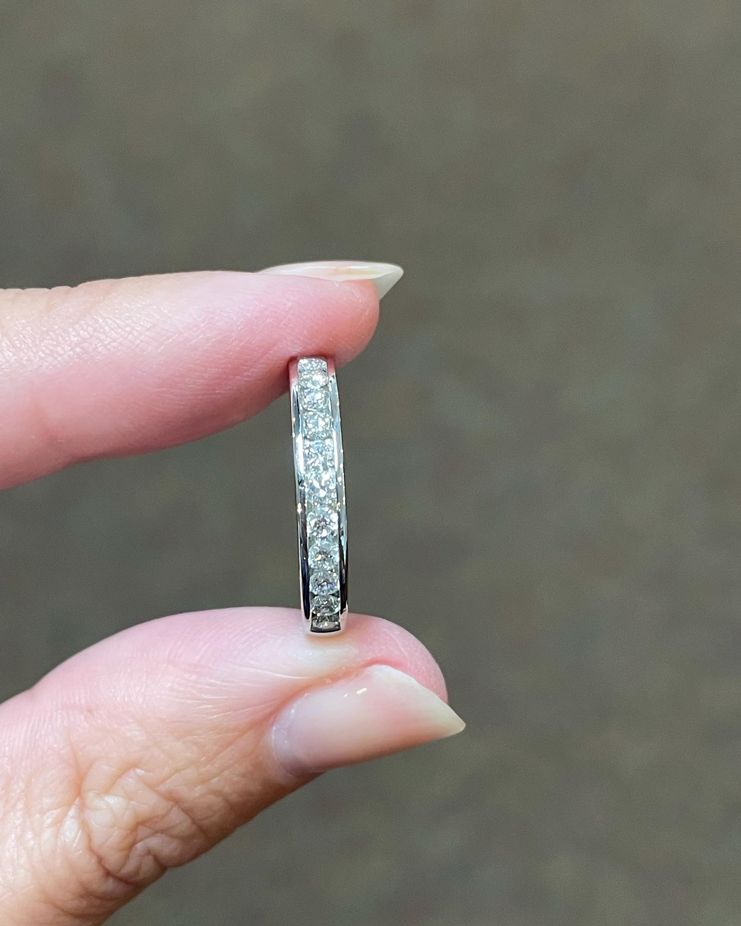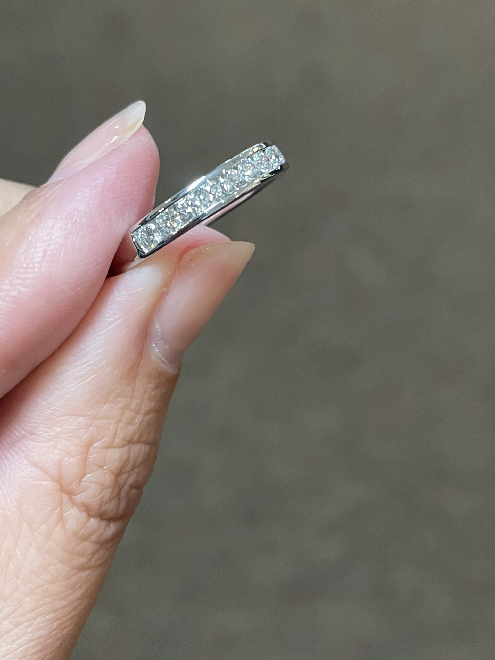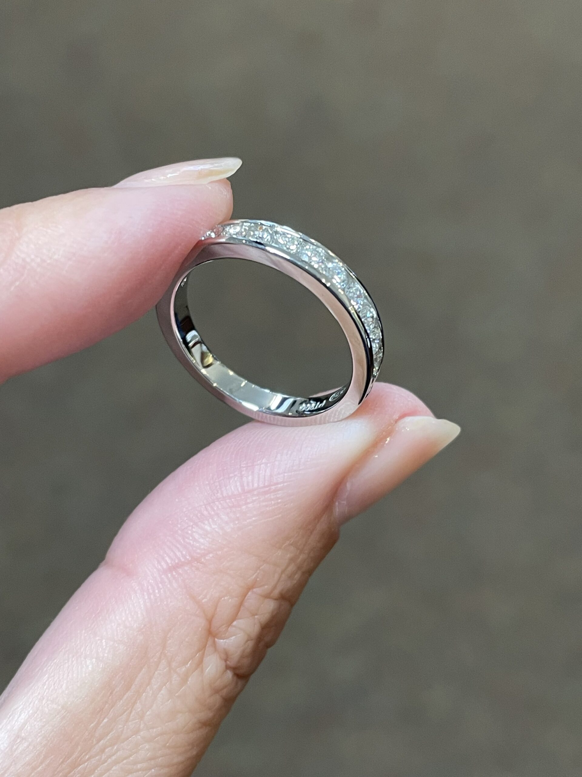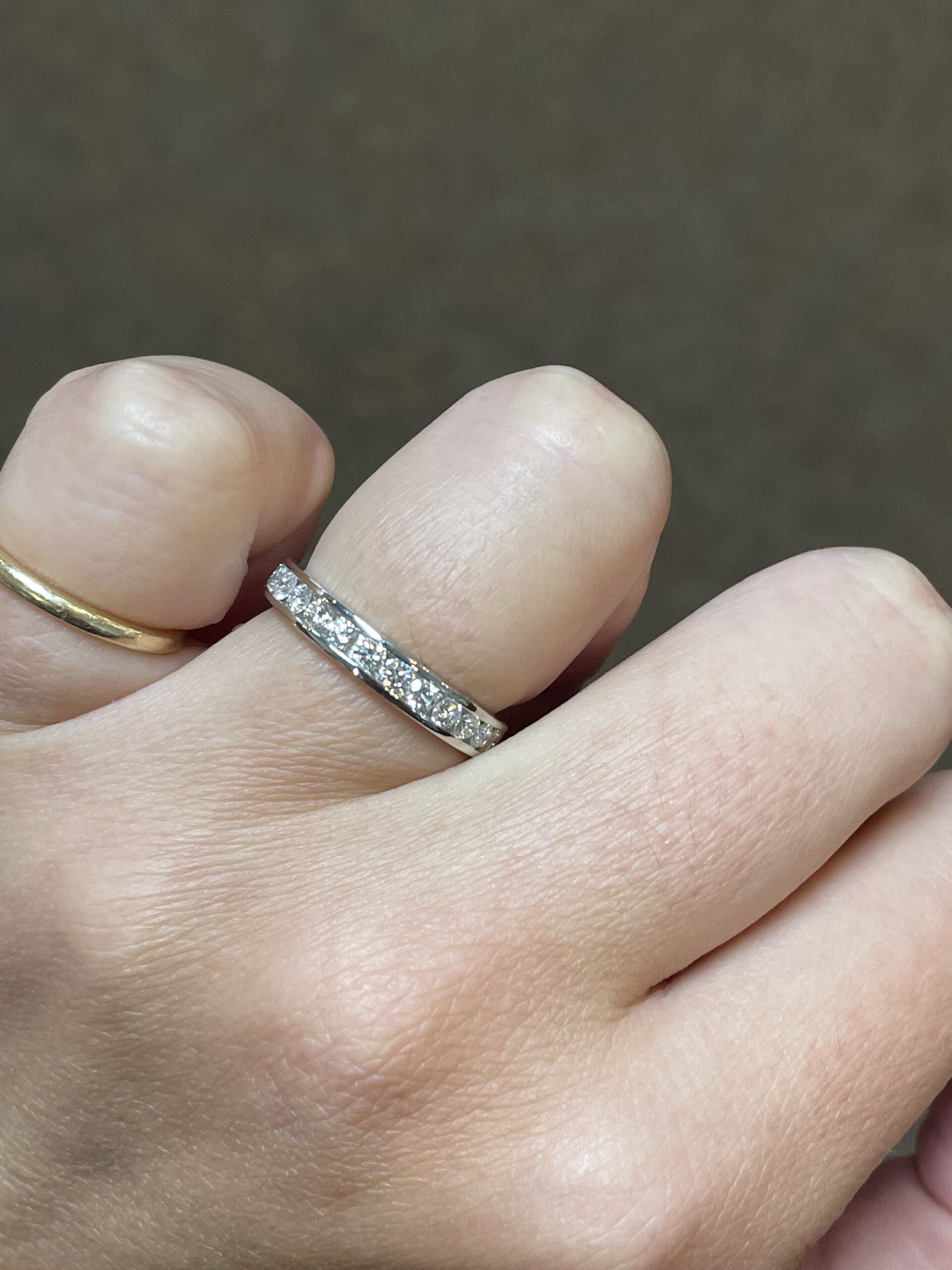 Platinum 14 stone genuine .55 Cttw Round Brilliant Cut Diamond channel set band. These diamonds average G in color, and SI1 in clarity. These diamonds are nicely proportioned and well finished. This ring measures 3.5 mm in width, and it has an entire weight of 5.7 grams. This ring is a finger size 5 3/4, but it can be reasonably sized at no additional charge. Please make note of the finger size needed in the comments section at checkout.