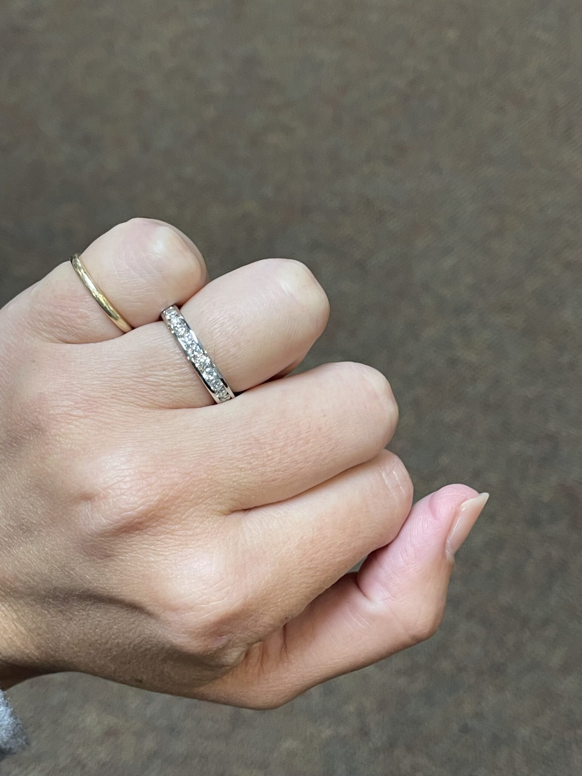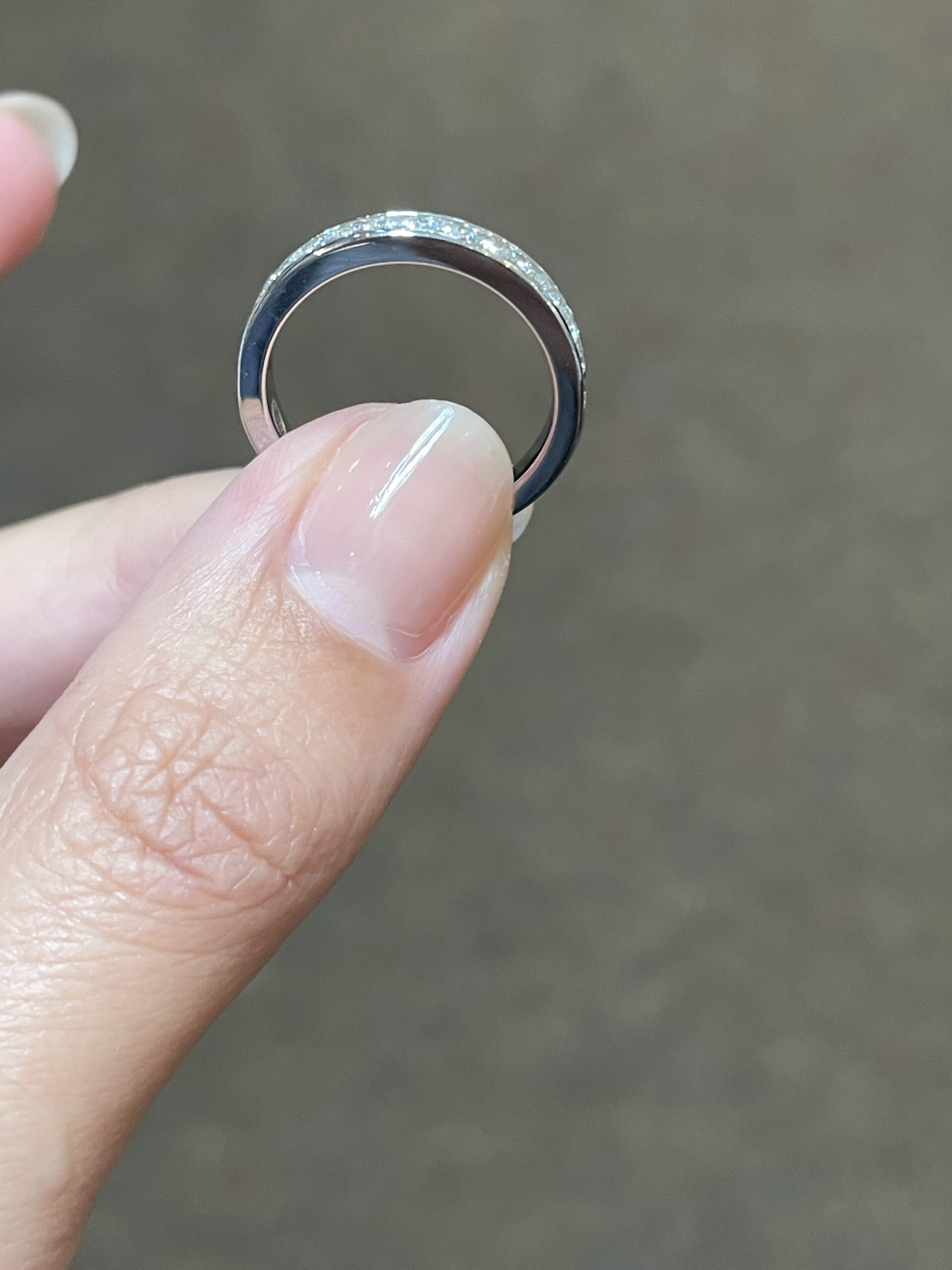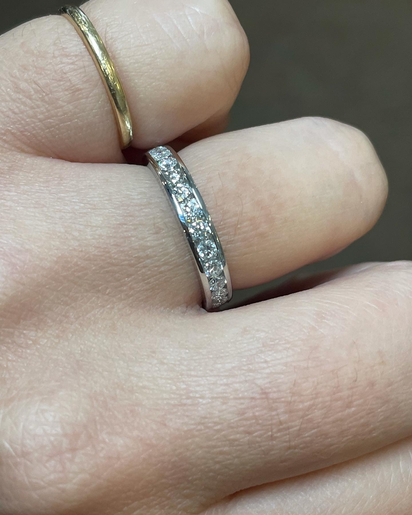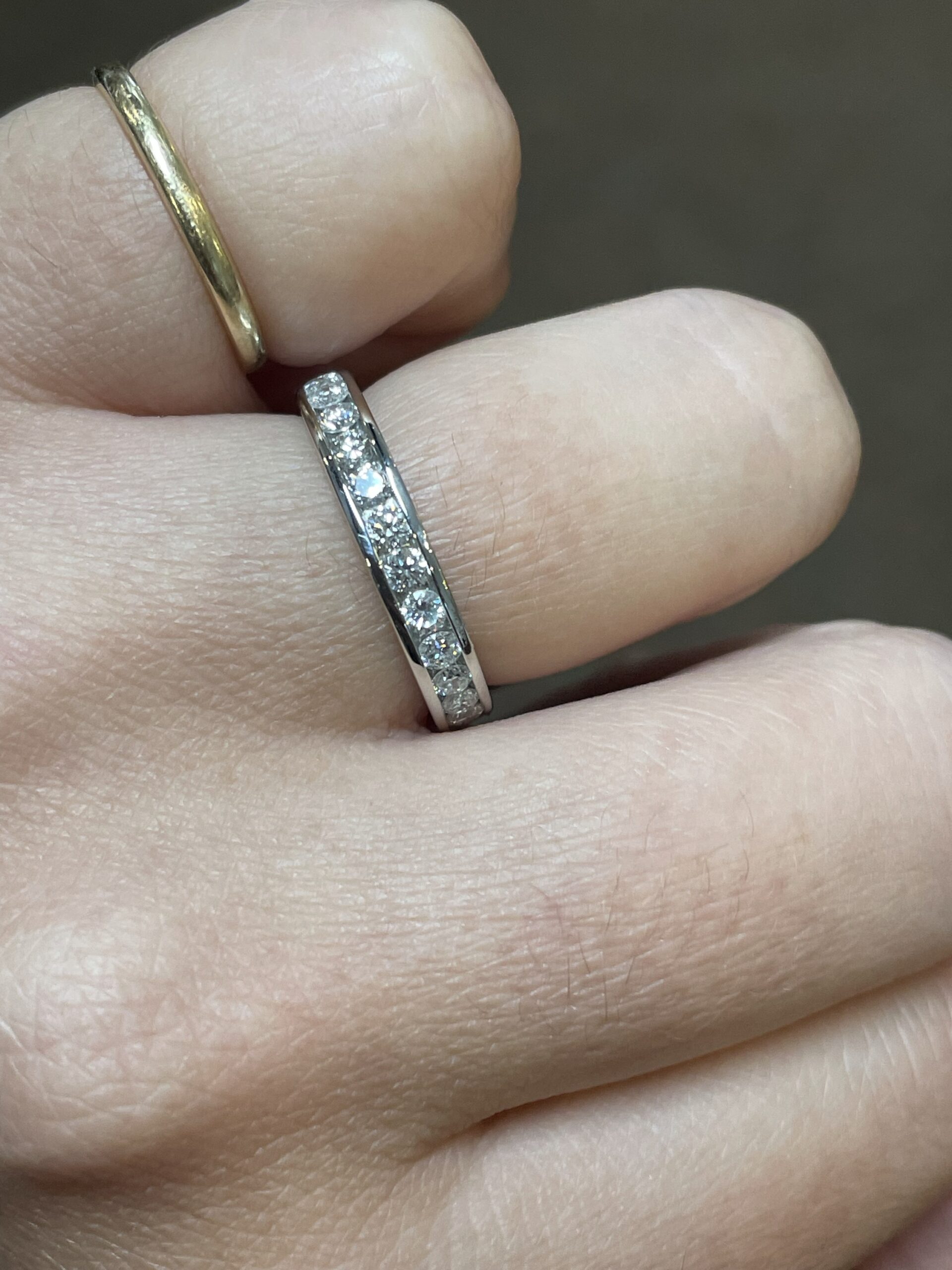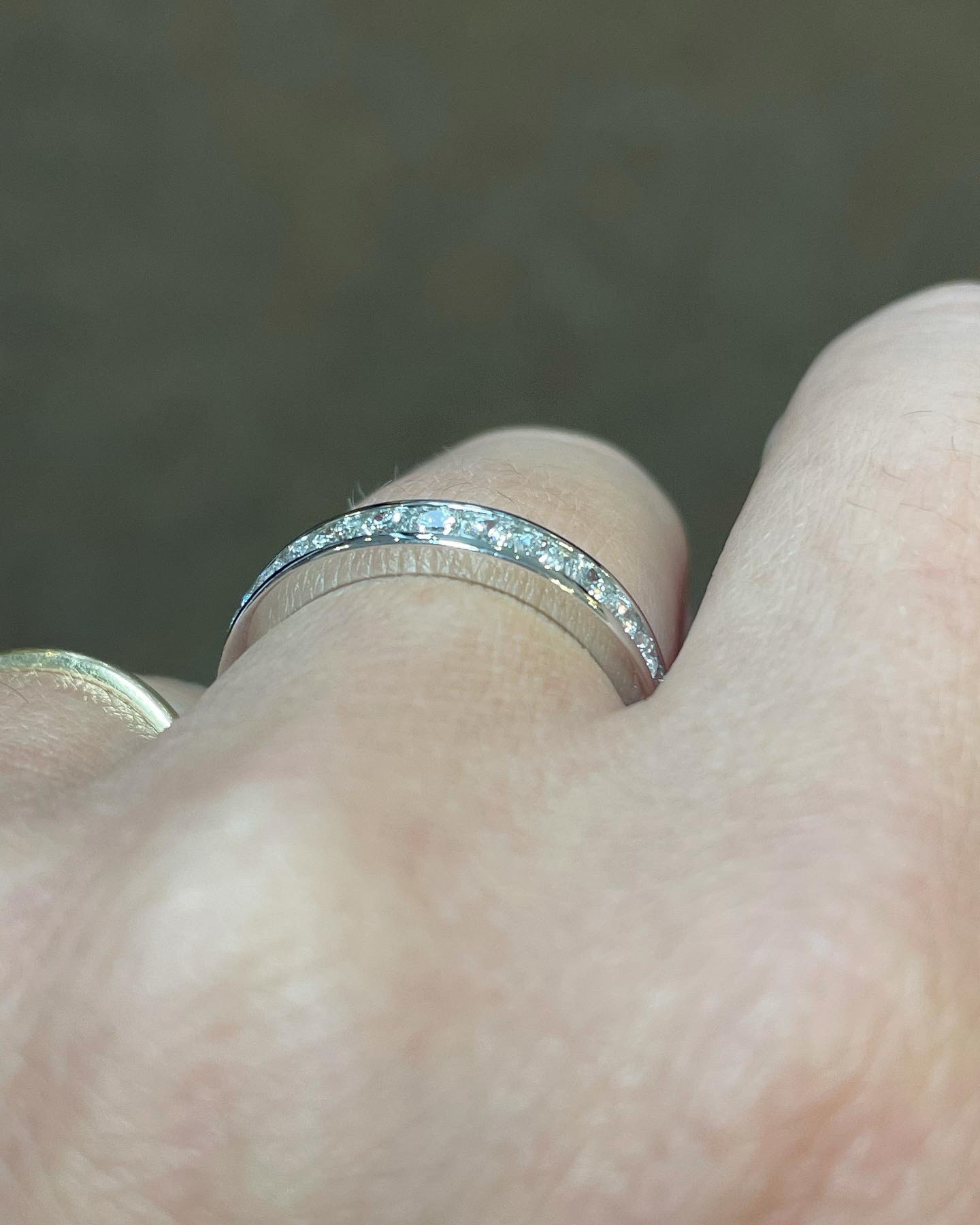 Platinum 14 stone genuine .55 Cttw Round Brilliant Cut Diamond channel set band. These diamonds average G in color, and SI1 in clarity. These diamonds are nicely proportioned and well finished. This ring measures 3.5 mm in width, and it has an entire weight of 5.7 grams. This ring is a finger size 5 3/4, but it can be reasonably sized at no additional charge. Please make note of the finger size needed in the comments section at checkout.