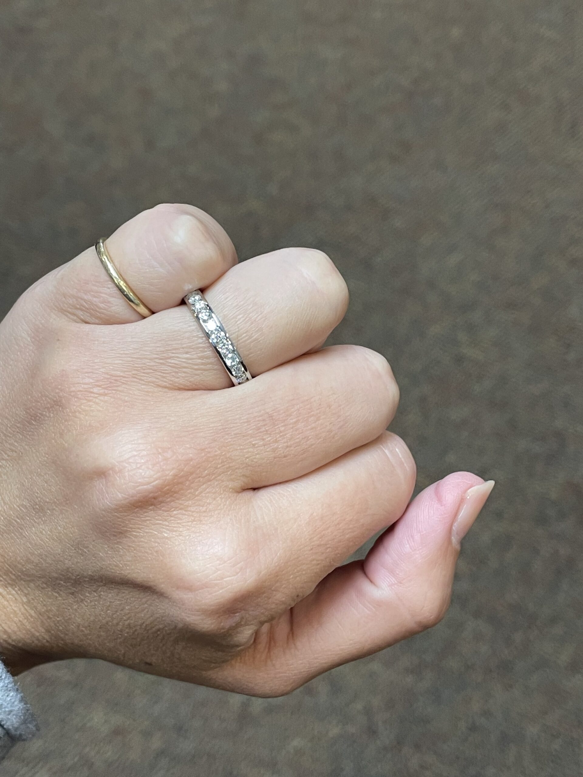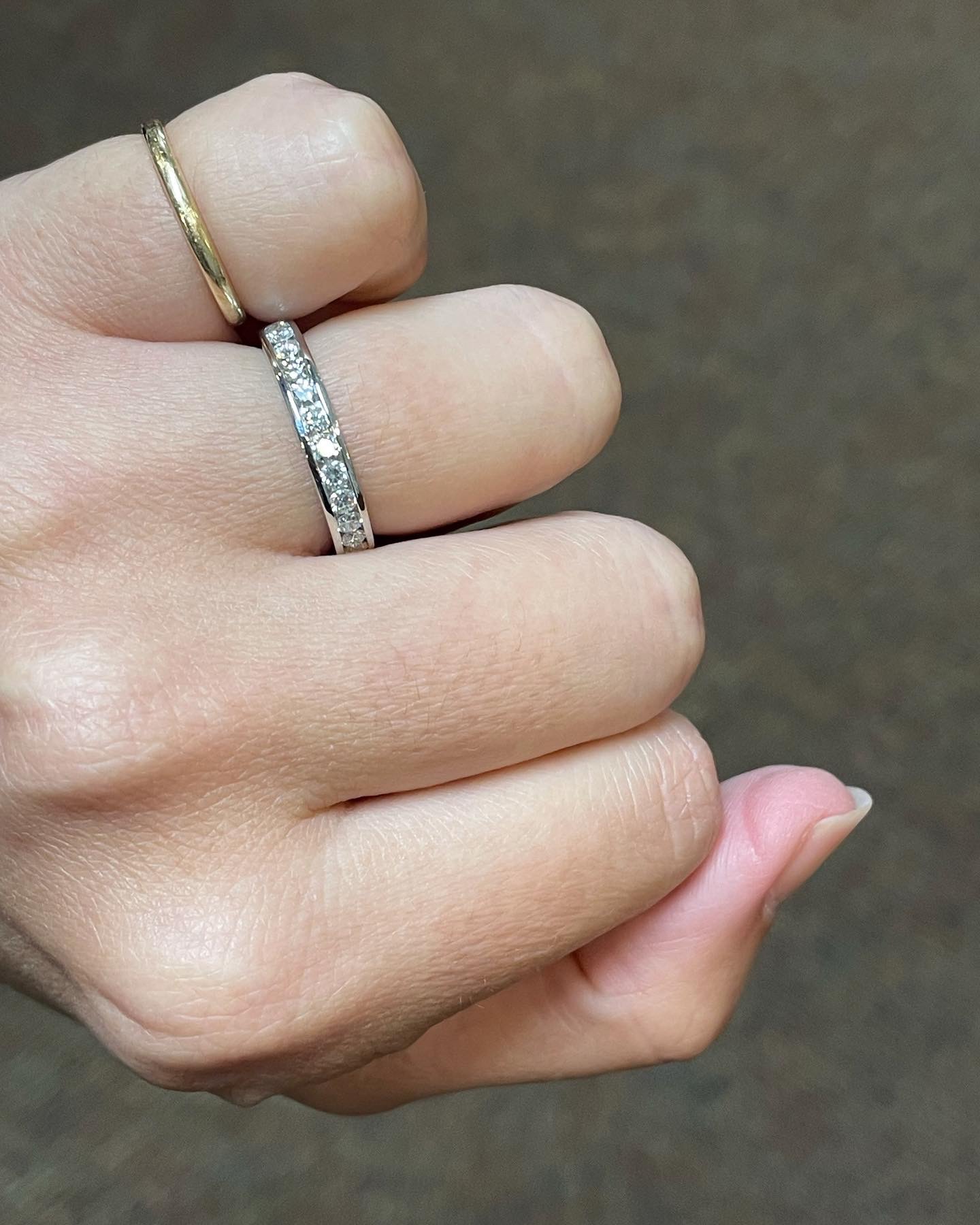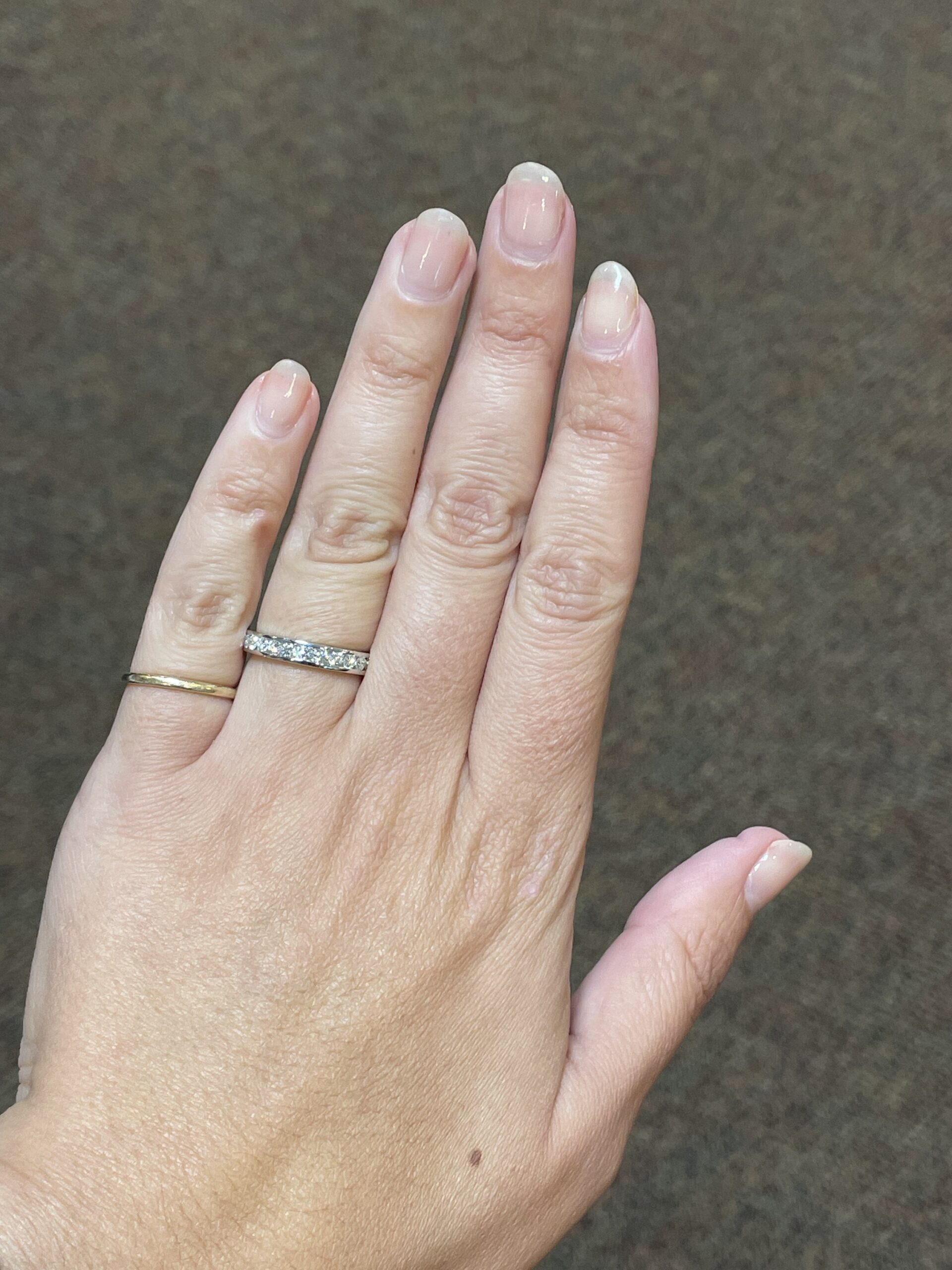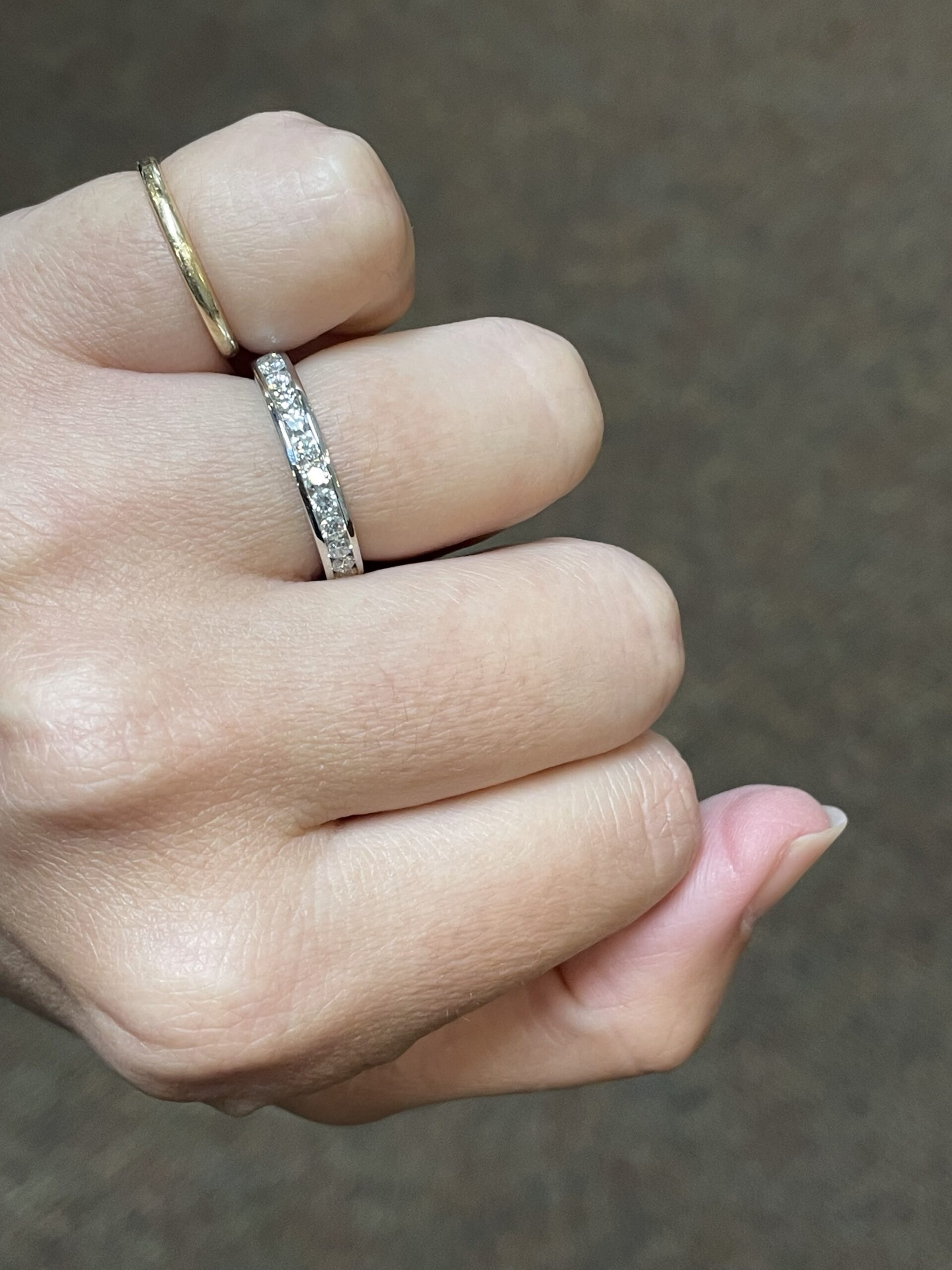 Platinum 14 stone genuine .55 Cttw Round Brilliant Cut Diamond channel set band. These diamonds average G in color, and SI1 in clarity. These diamonds are nicely proportioned and well finished. This ring measures 3.5 mm in width, and it has an entire weight of 5.7 grams. This ring is a finger size 5 3/4, but it can be reasonably sized at no additional charge. Please make note of the finger size needed in the comments section at checkout.