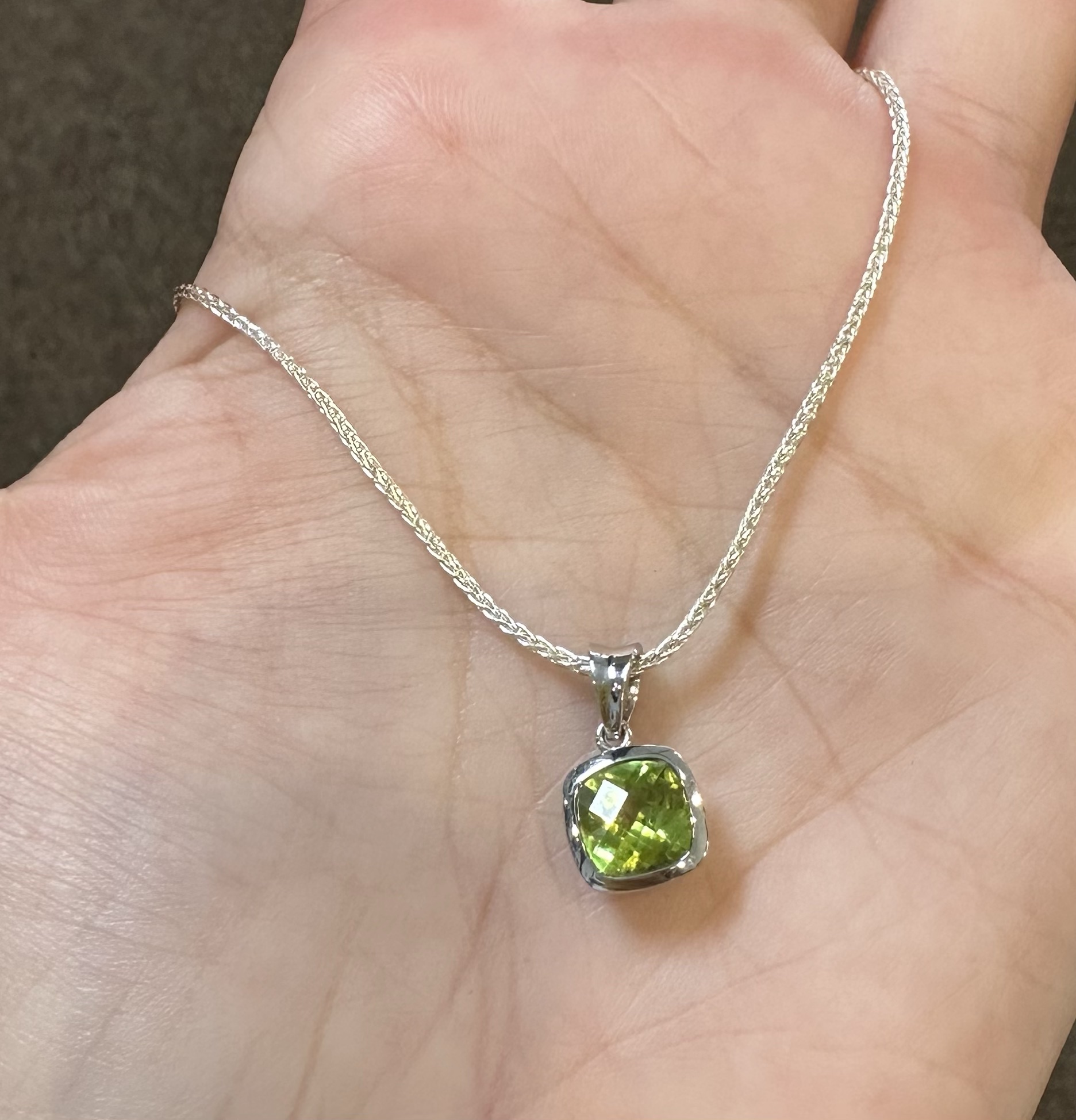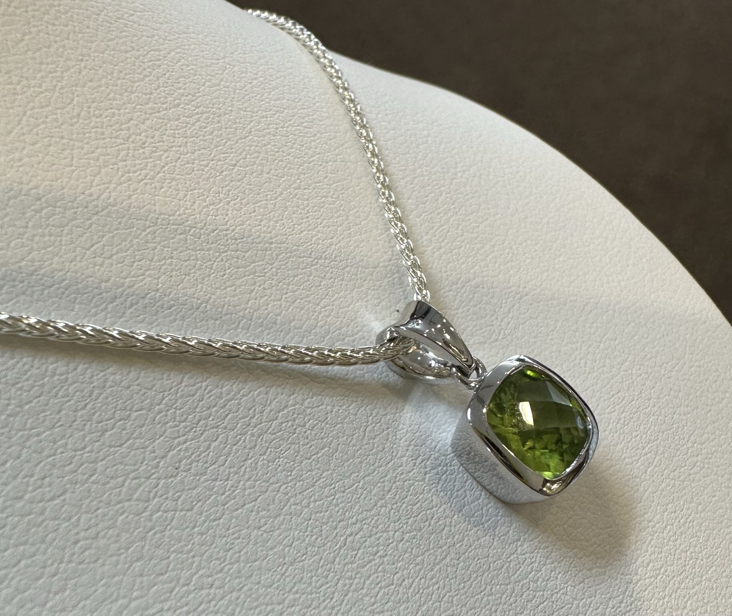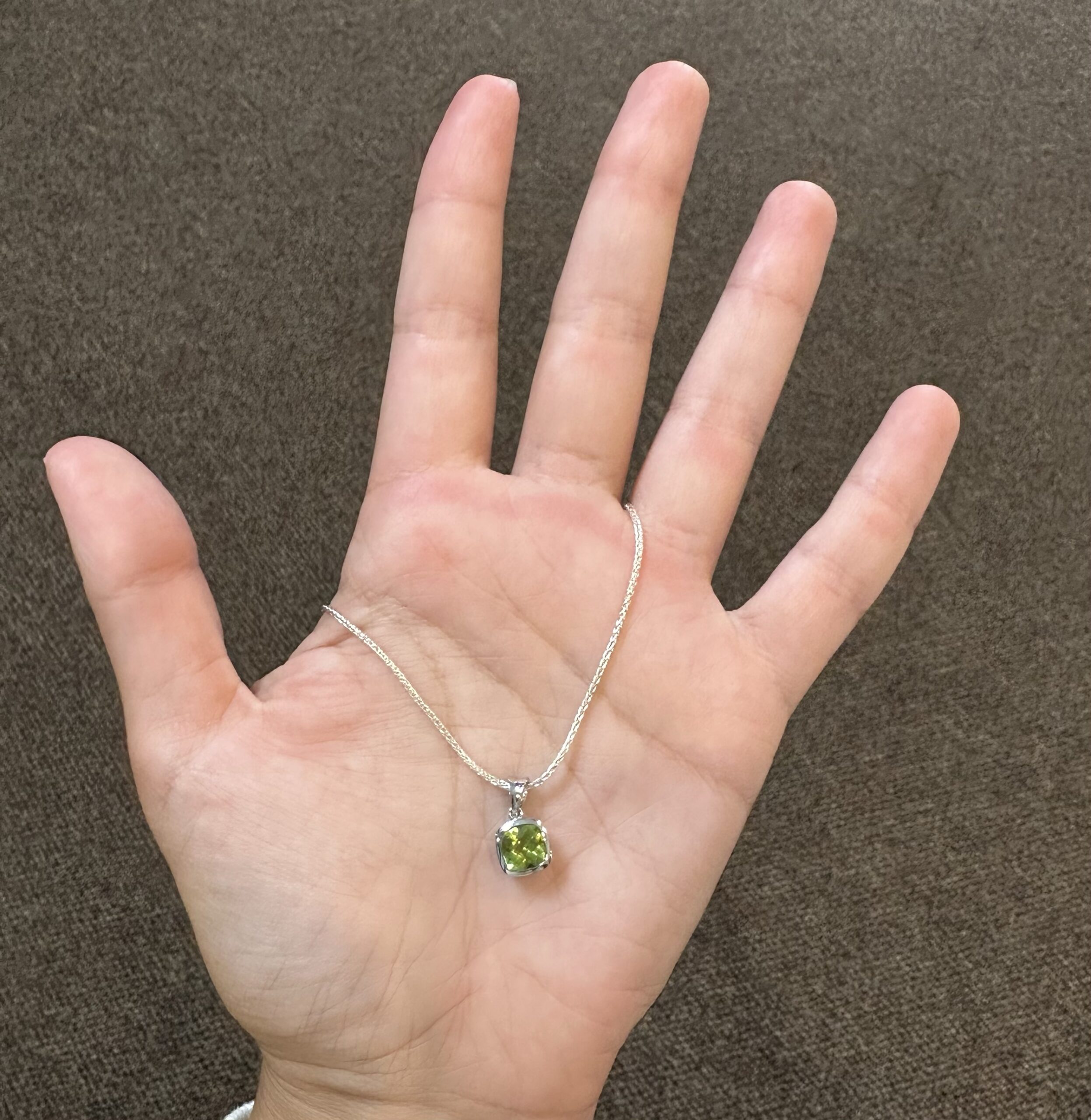 August is Peridot birthstone month! This 16” sterling silver bezel set genuine 1.47 carat cushion shaped, faceted Peridot pendant is now on sale! Only one available!