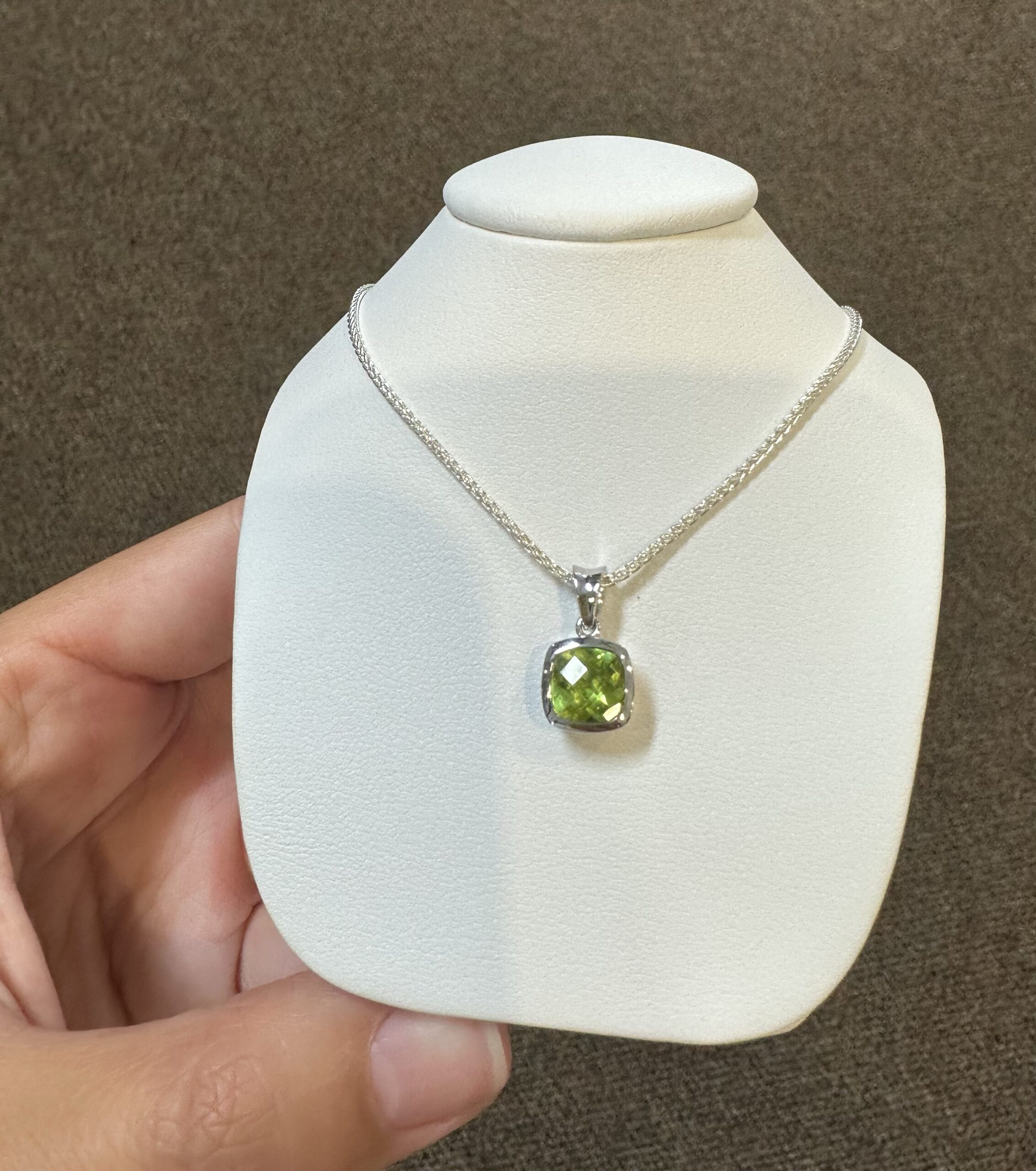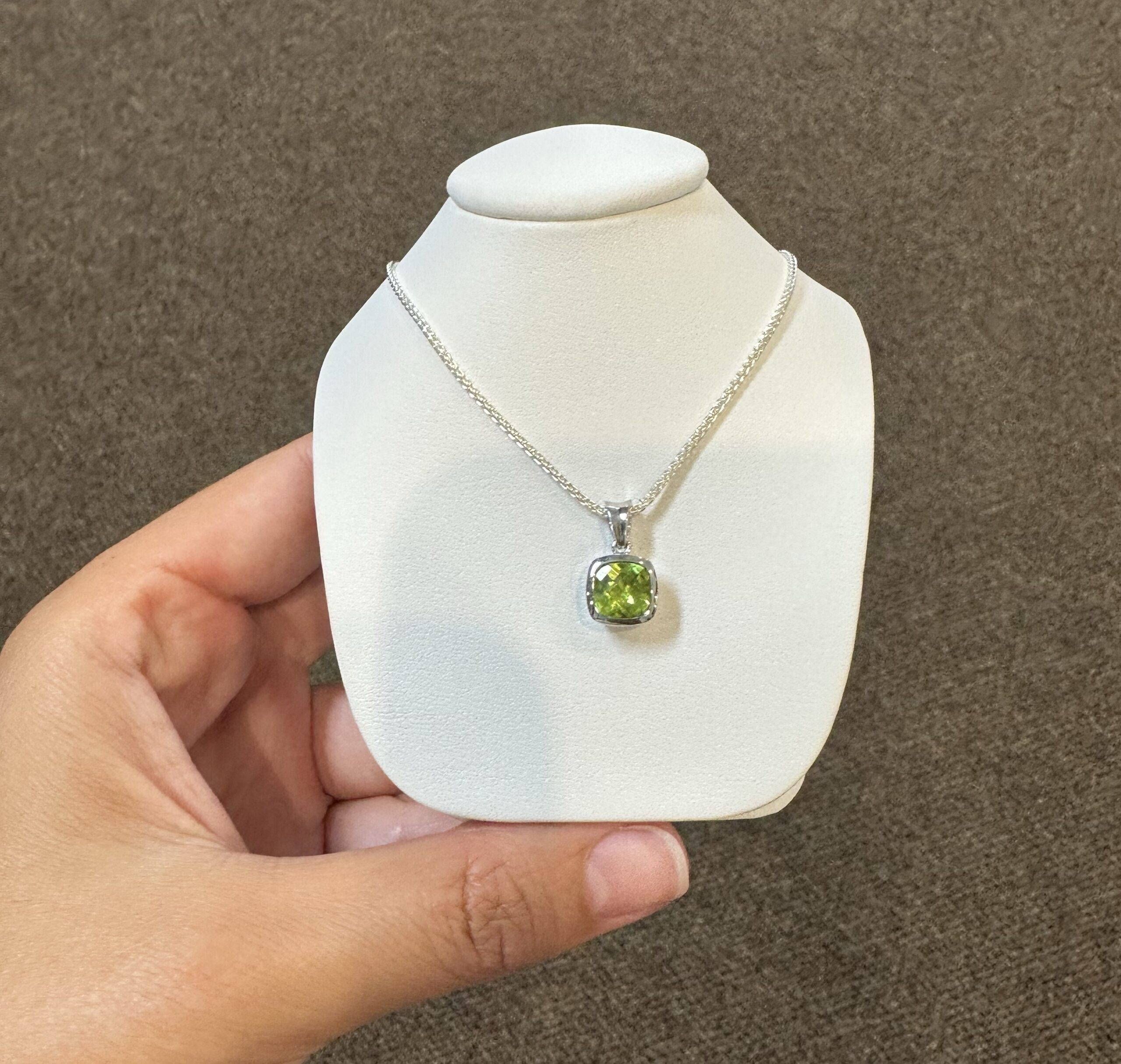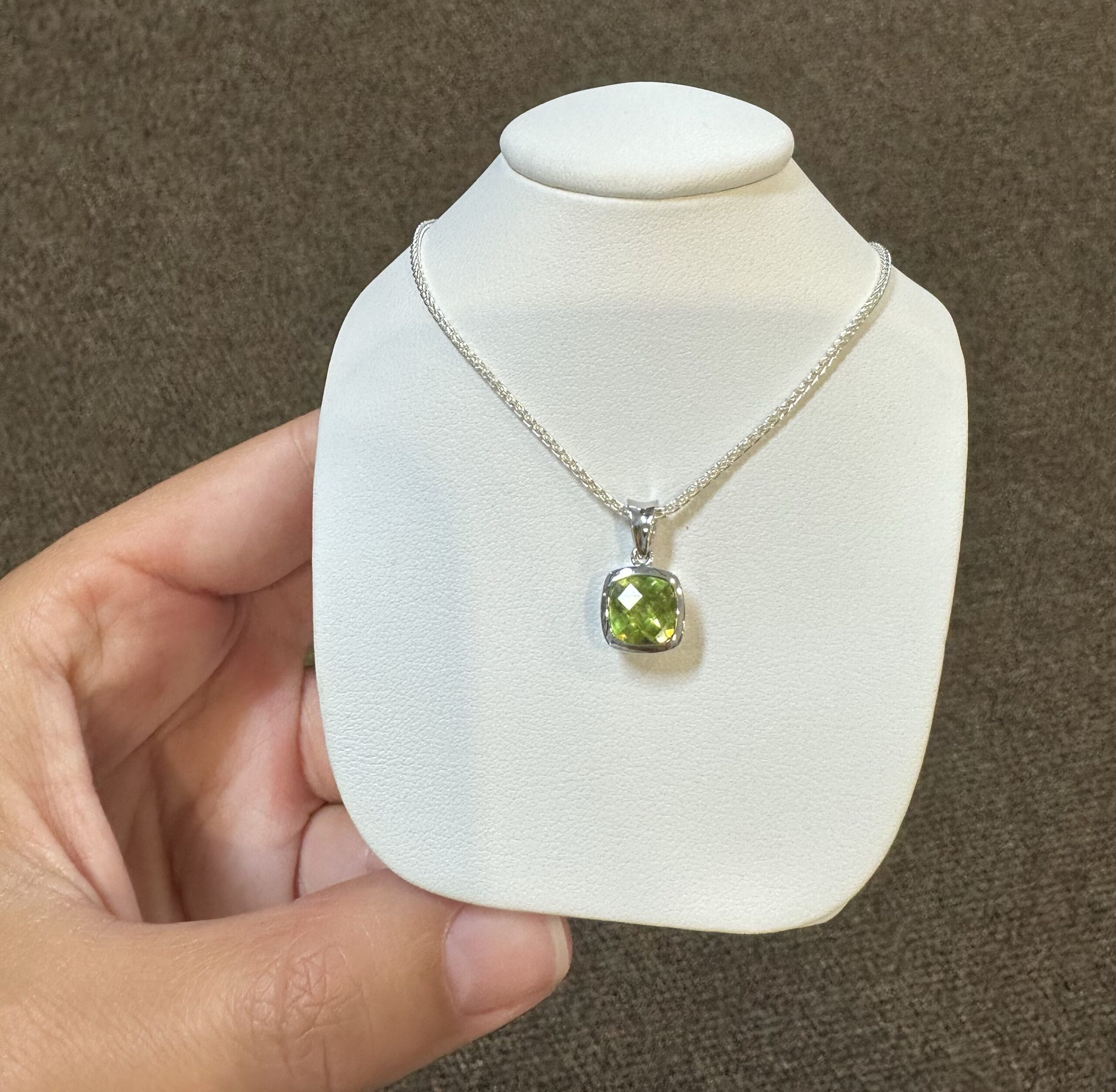 August is Peridot birthstone month! This 16” sterling silver bezel set genuine 1.47 carat cushion shaped, faceted Peridot pendant is now on sale! Only one available!
