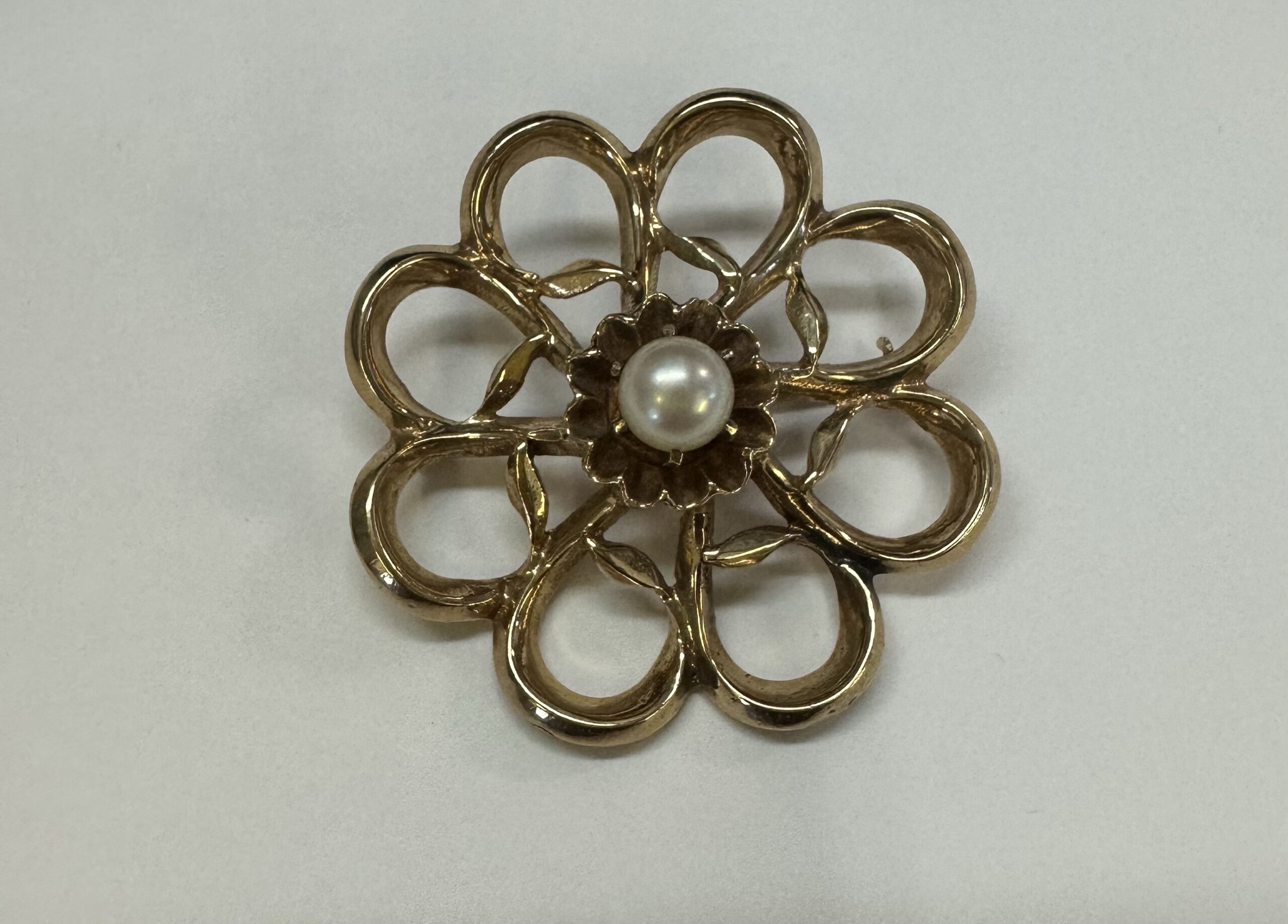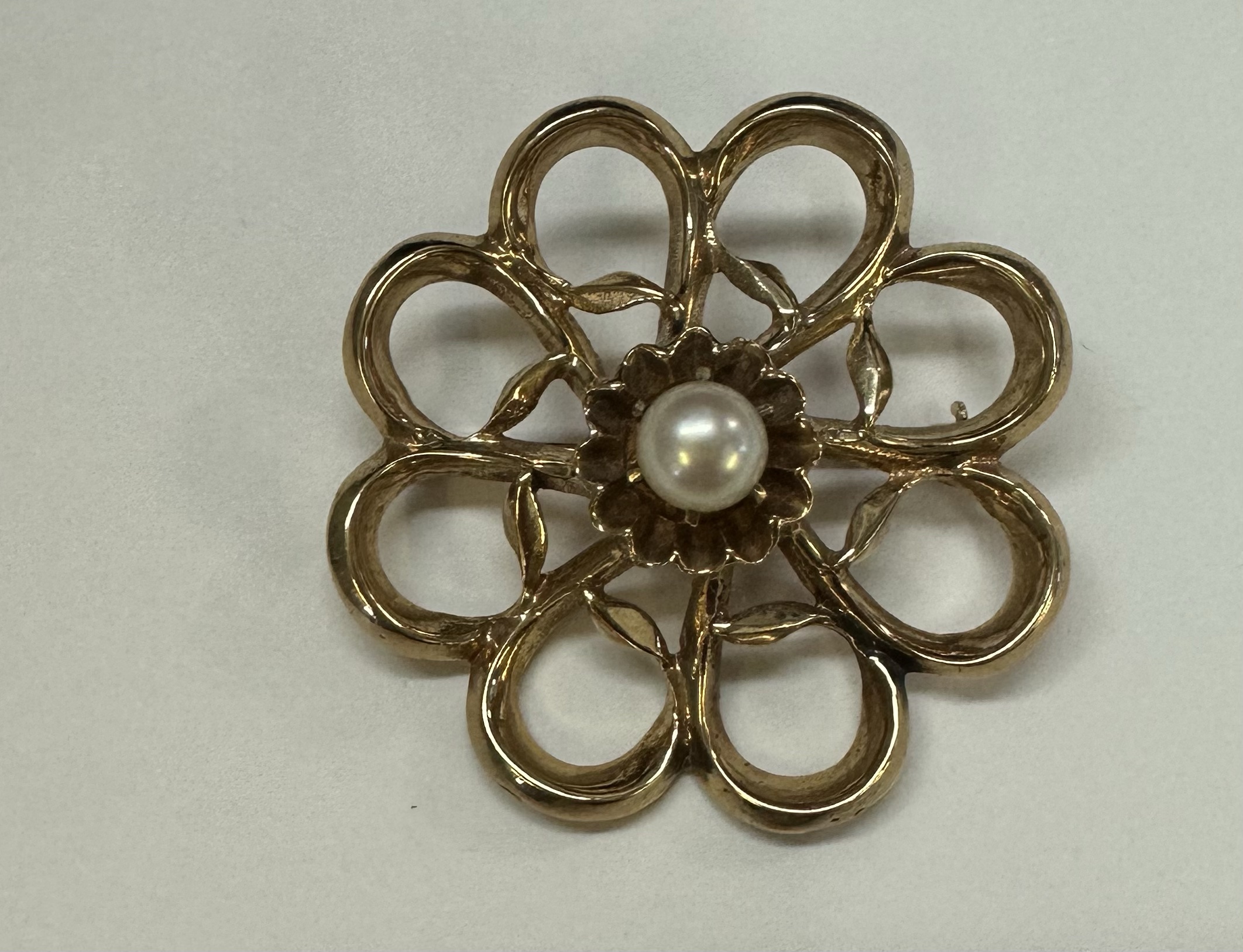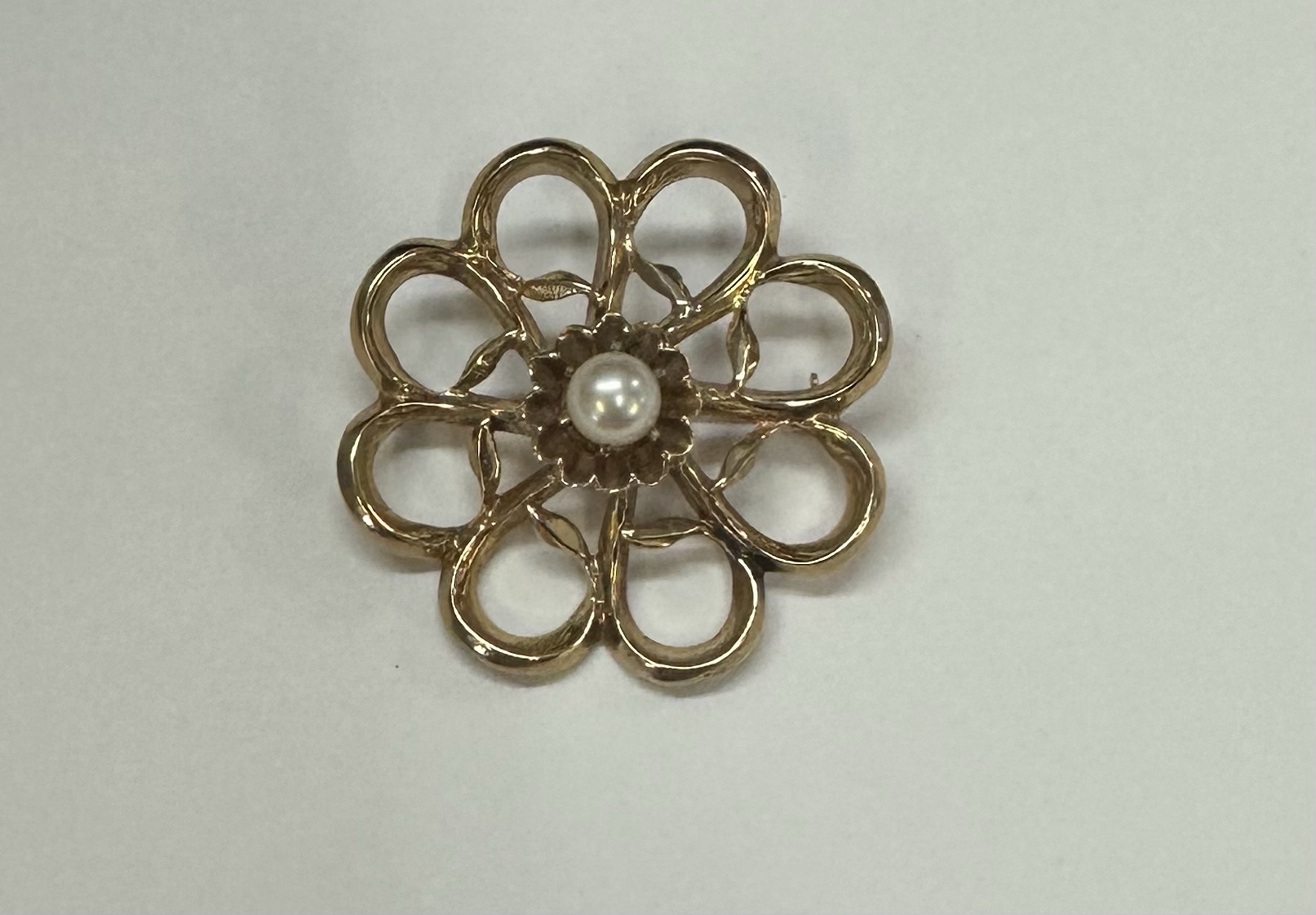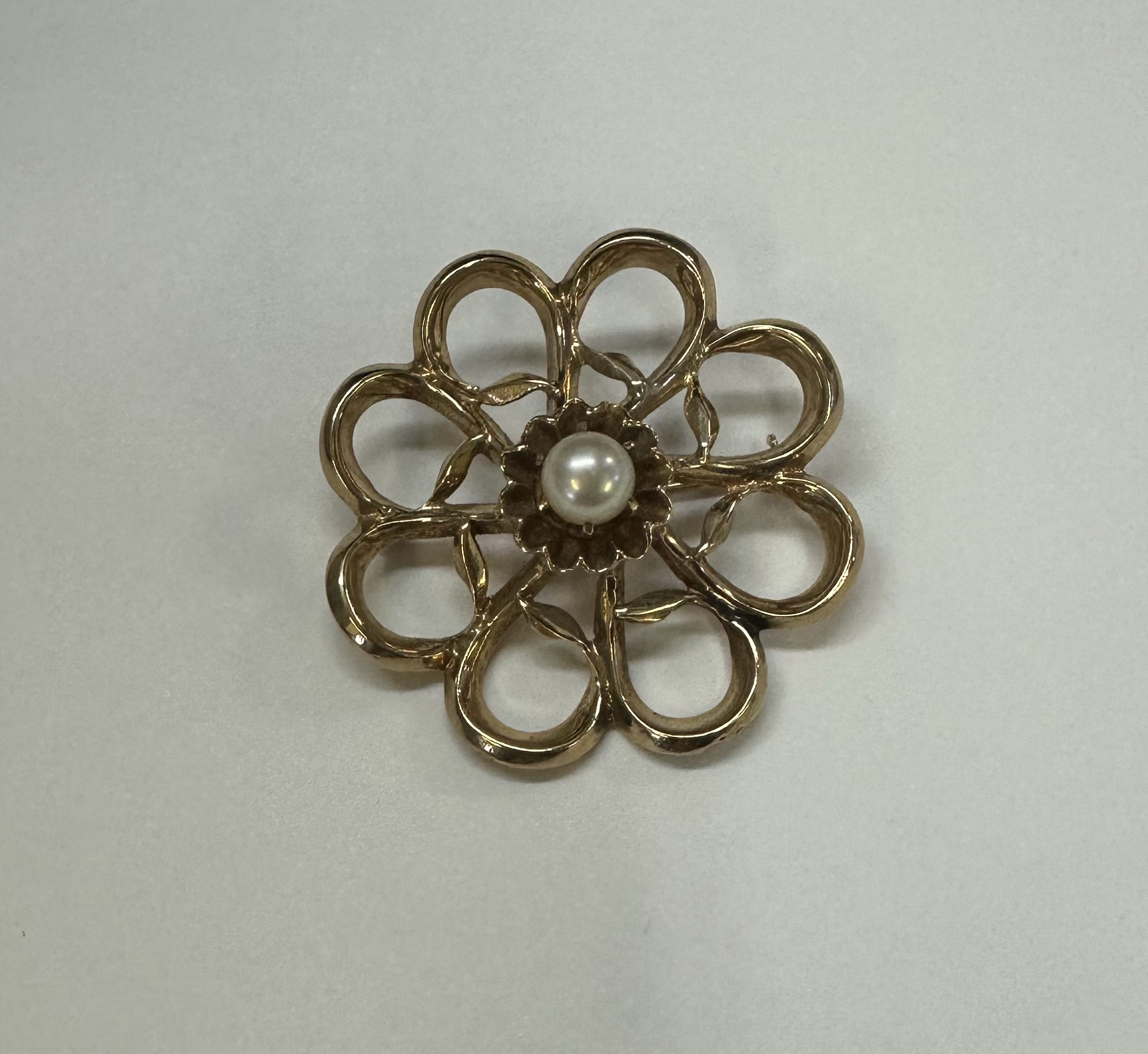Vintage 10k yellow gold openwork brooch with a 6.5 mm cultured Pearl accent. This brooch has an entire weight of 7.3 grams. The brooch measures 1 1/2″ inches in size.
