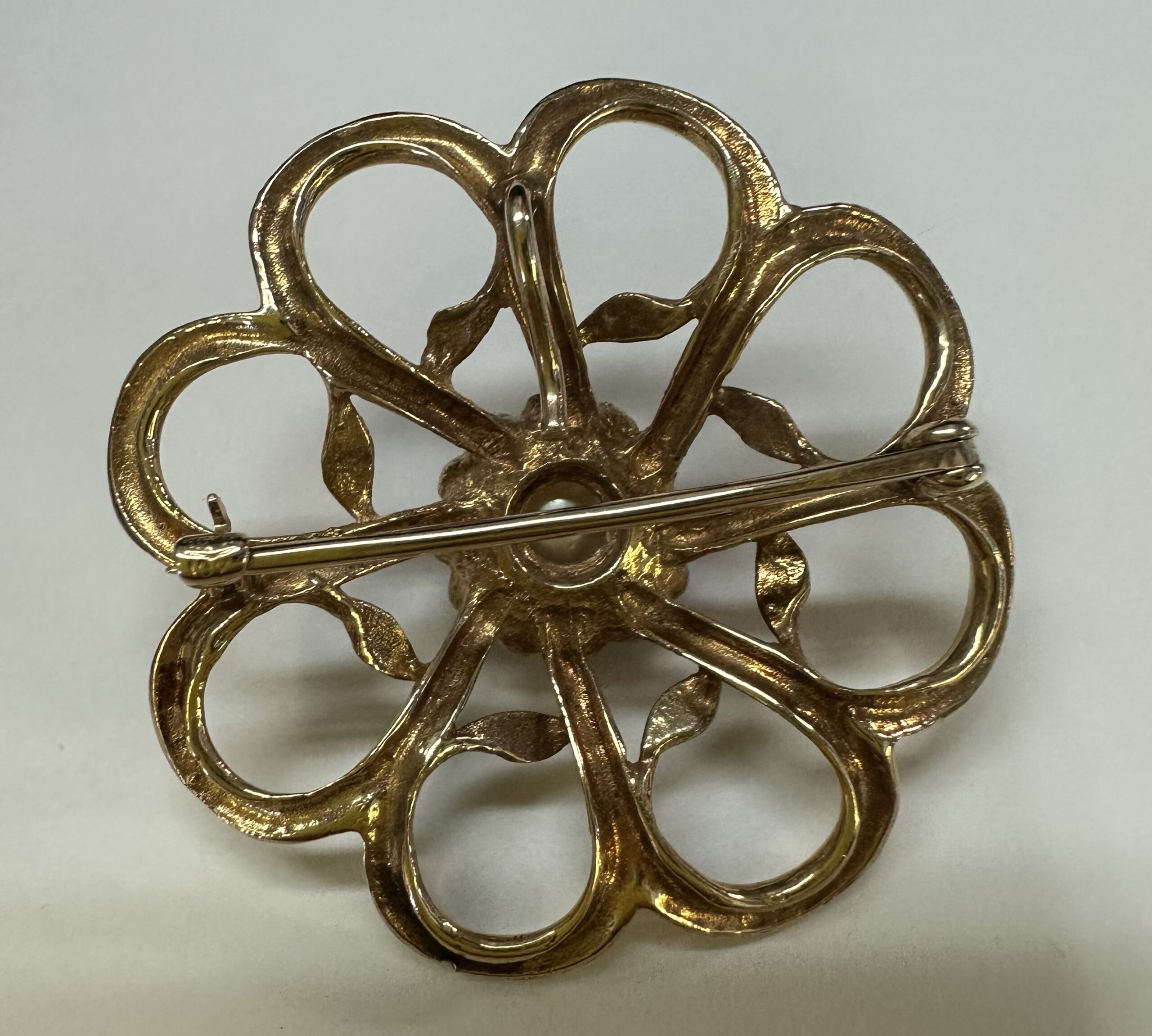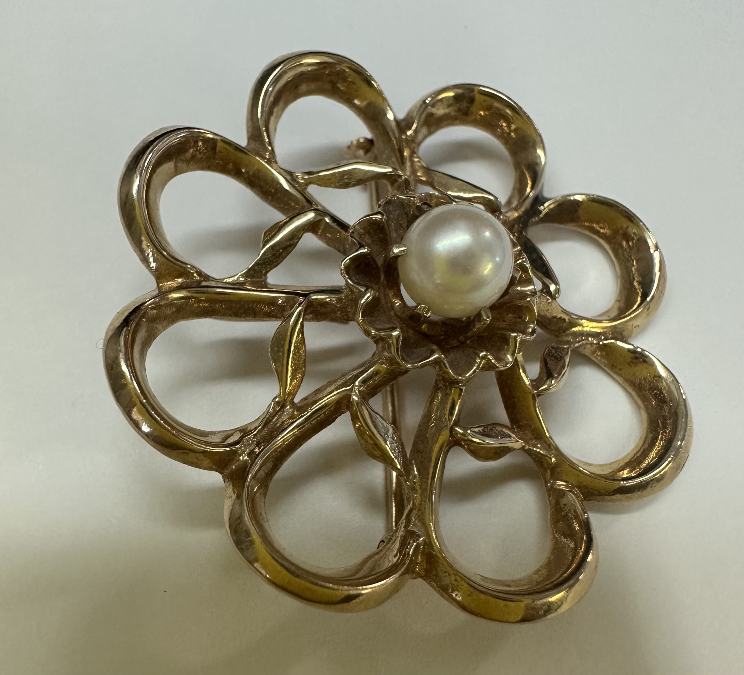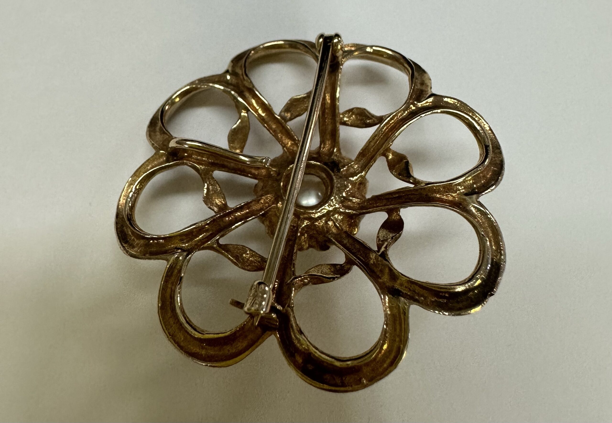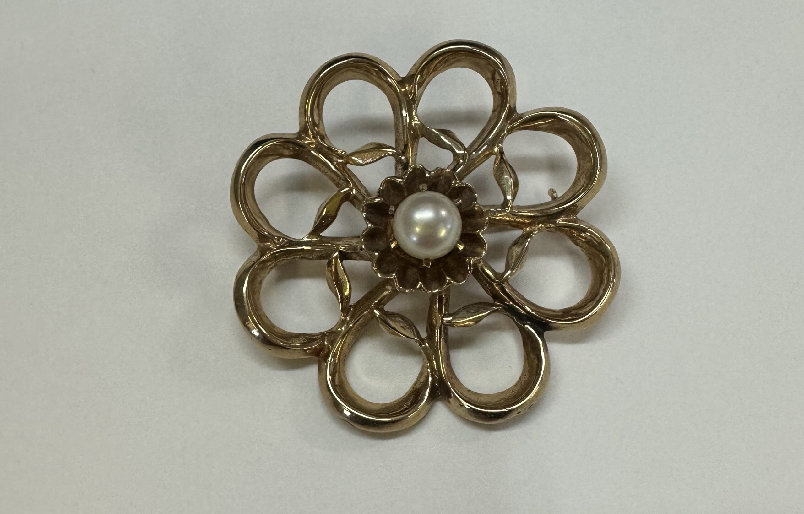 Vintage 10k yellow gold openwork brooch with a 6.5 mm cultured Pearl accent. This brooch has an entire weight of 7.3 grams. The brooch measures 1 1/2″ inches in size.