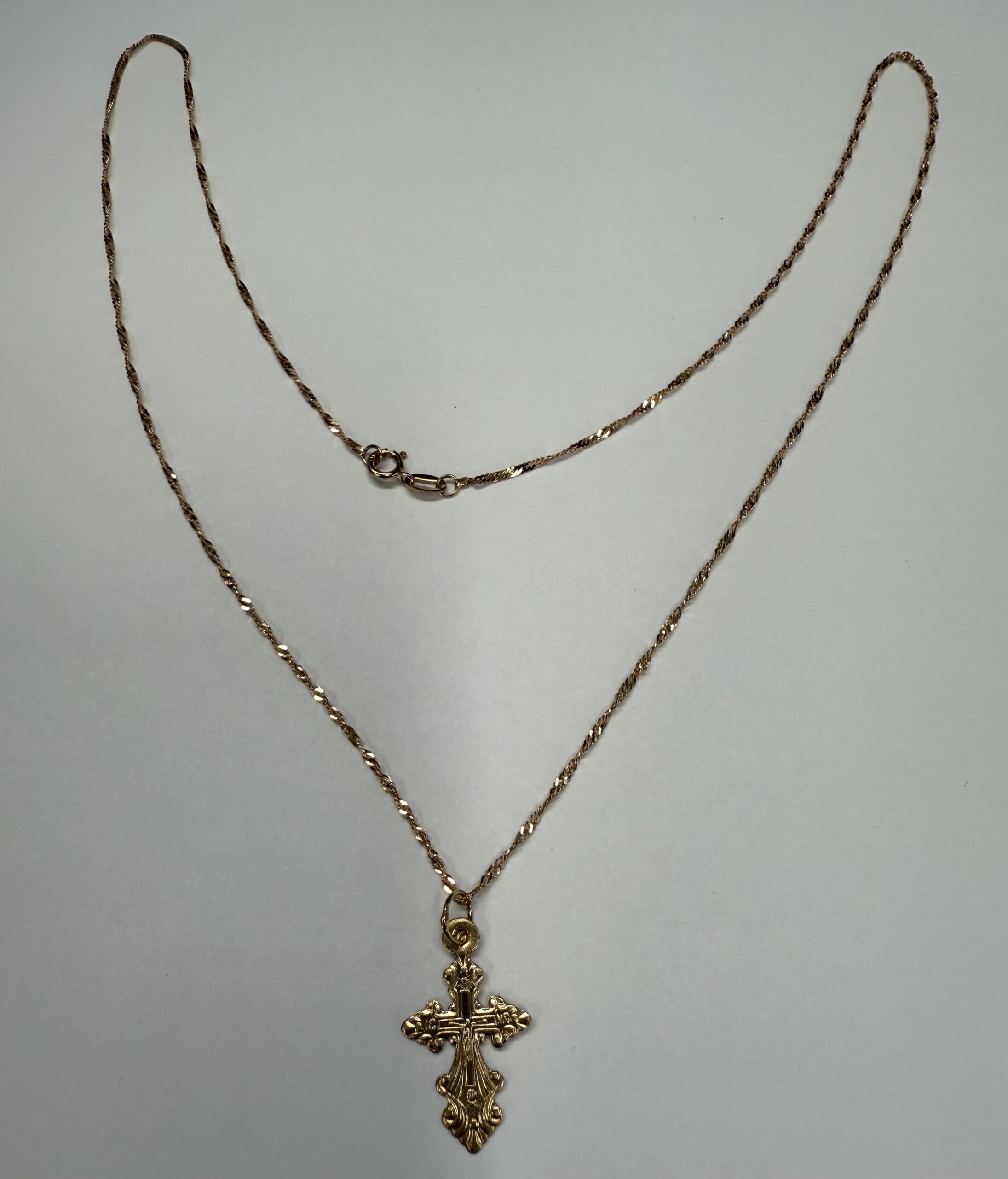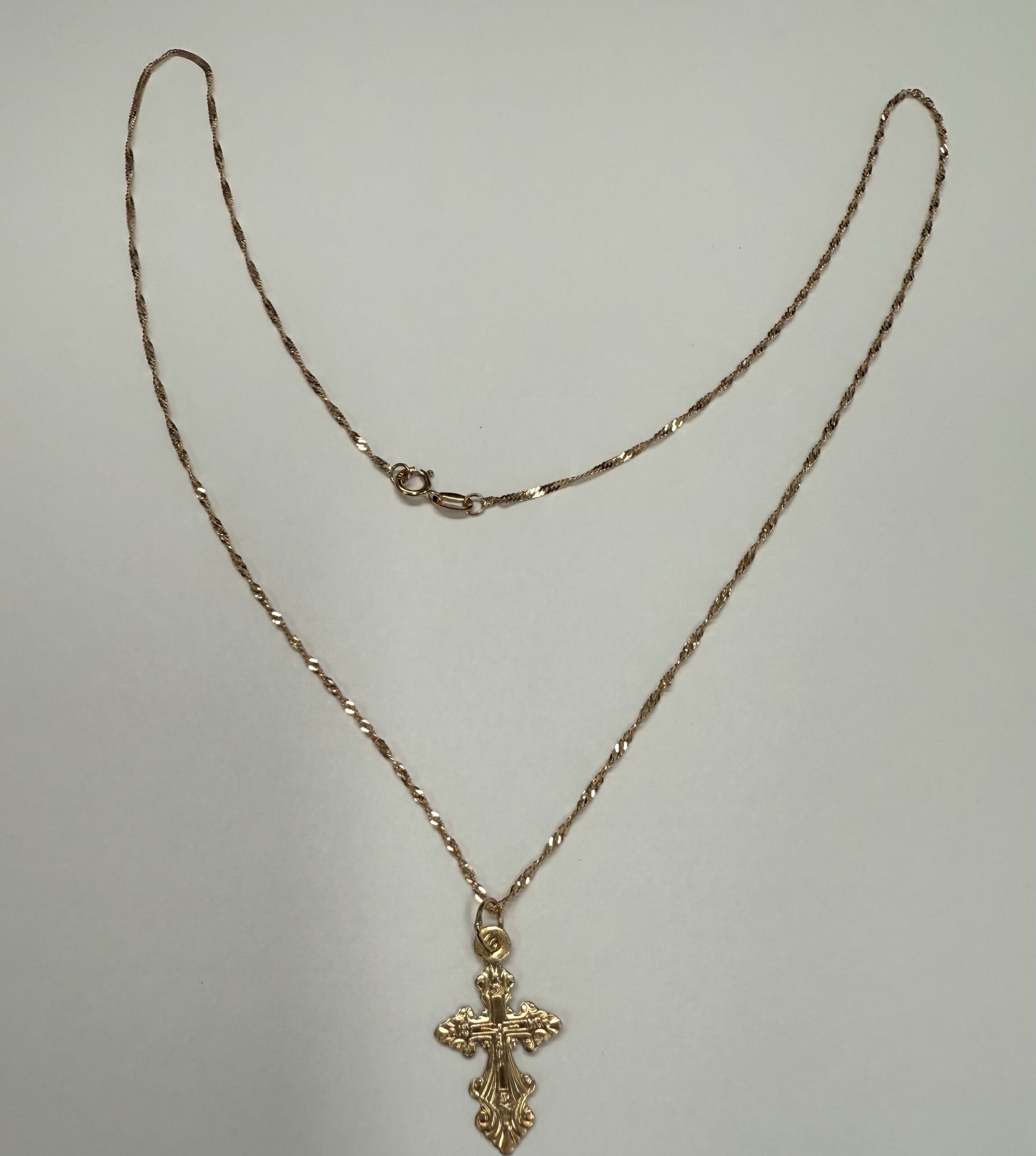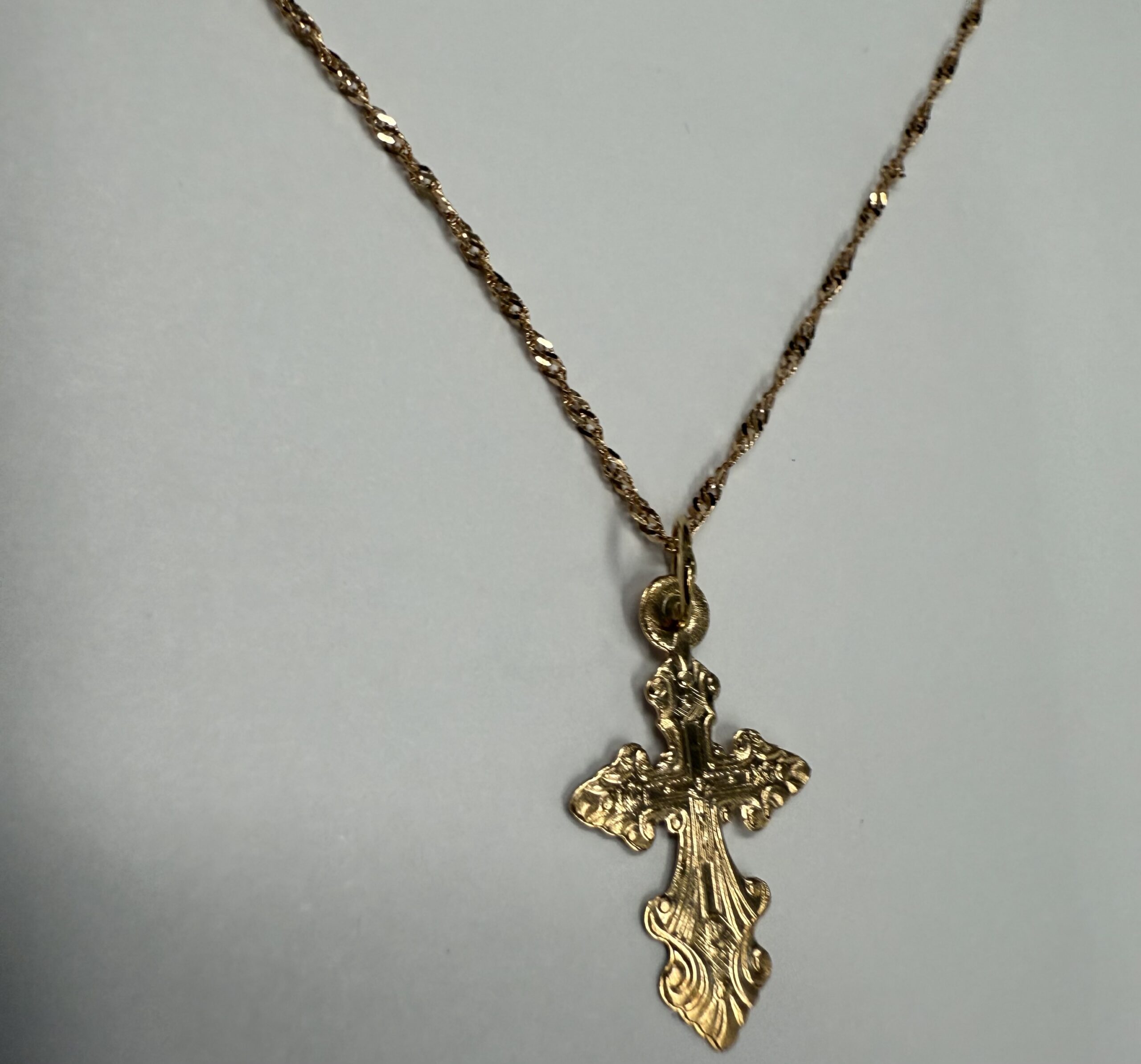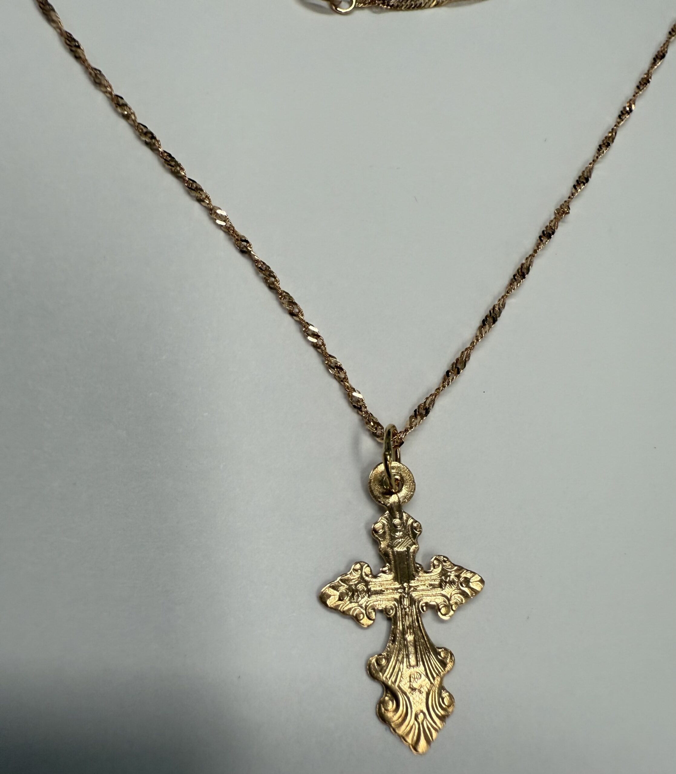 Vintage 14k rose gold engraved cross necklace. This necklace measures 18″ in length, and it has an entire weight of 1.3 grams.