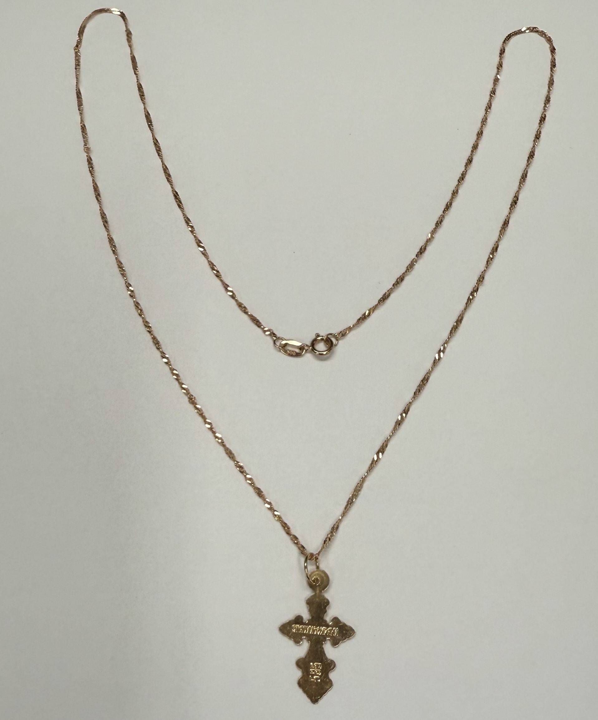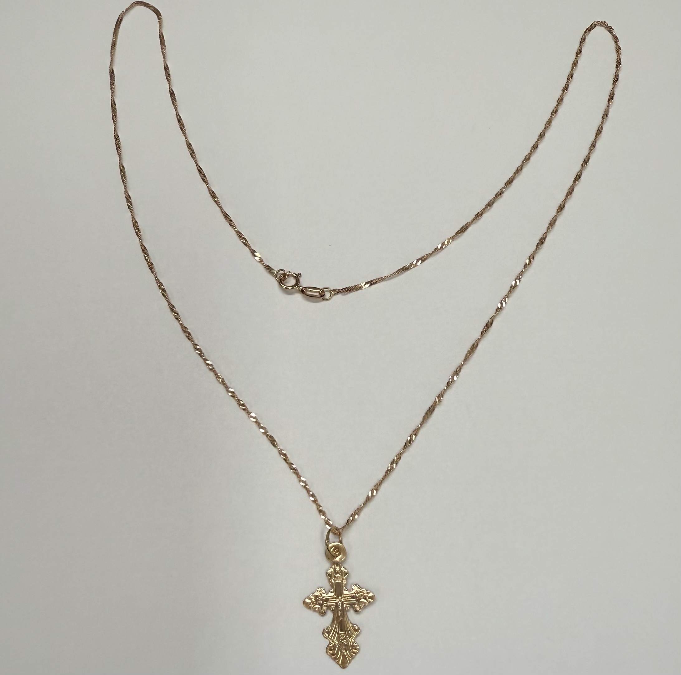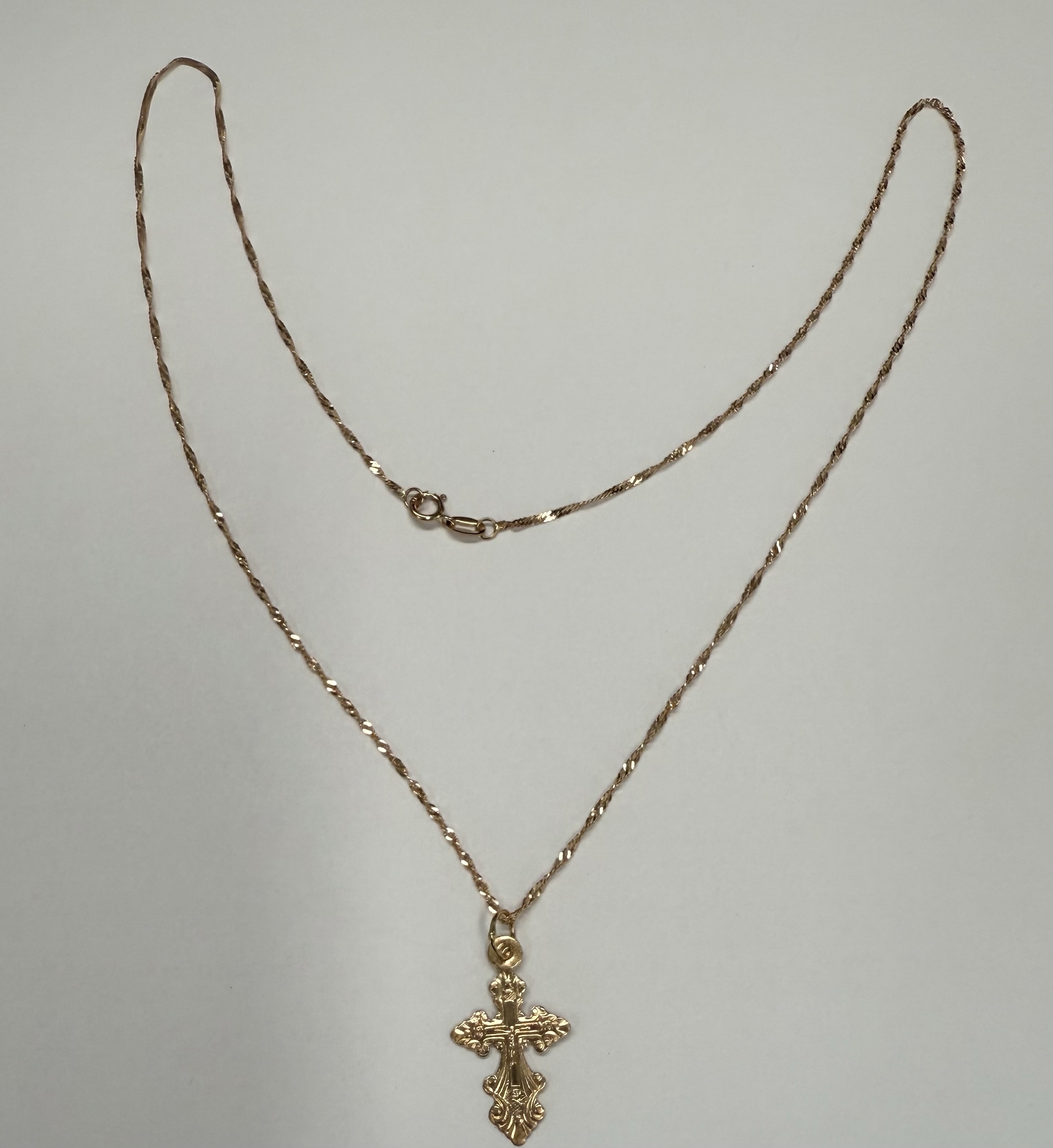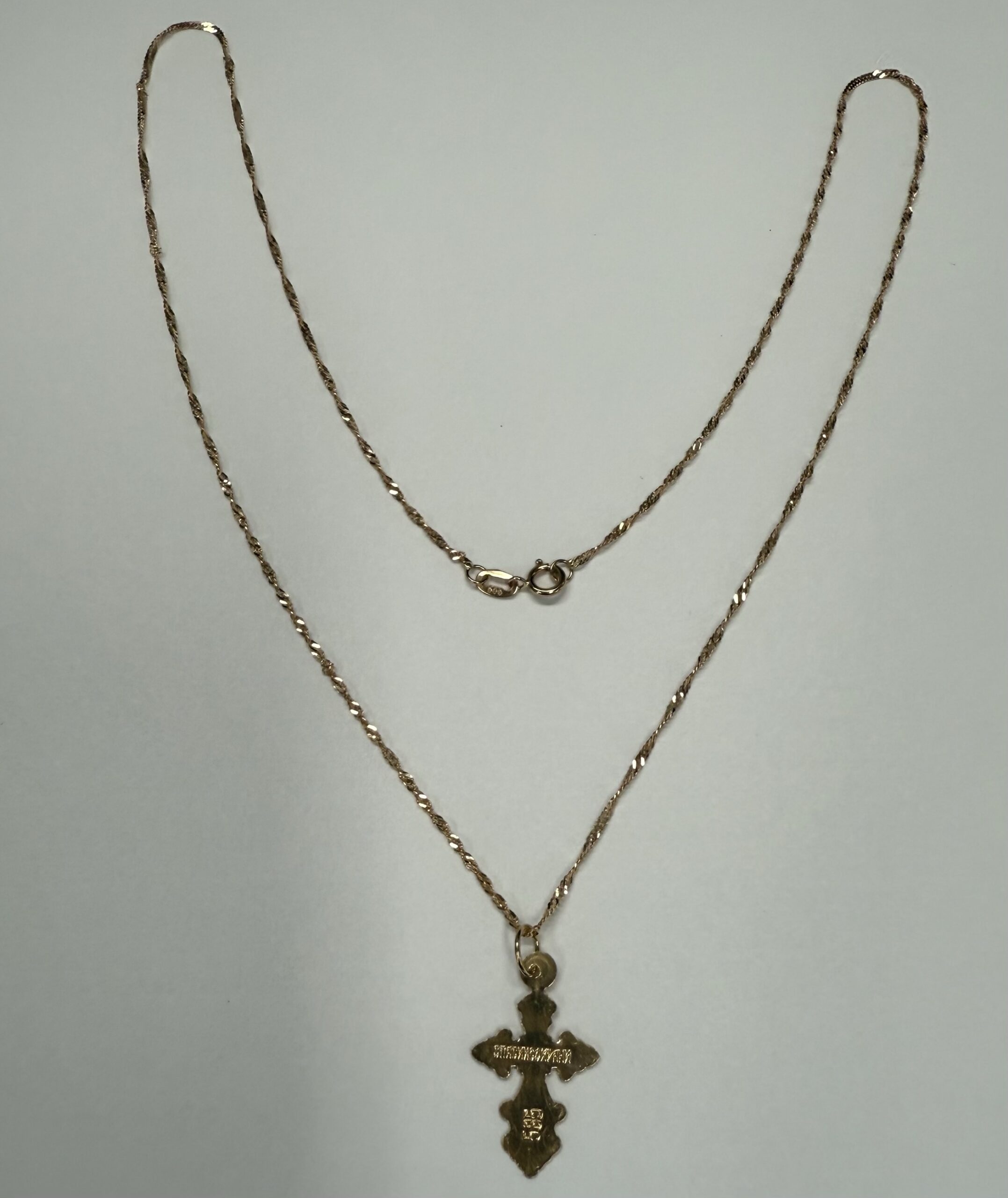 Vintage 14k rose gold engraved cross necklace. This necklace measures 18″ in length, and it has an entire weight of 1.3 grams.