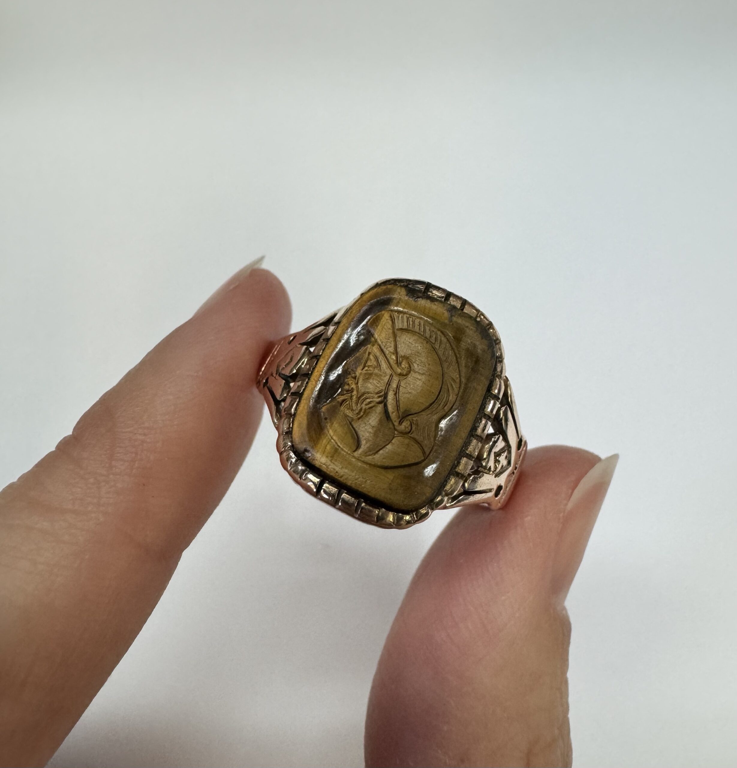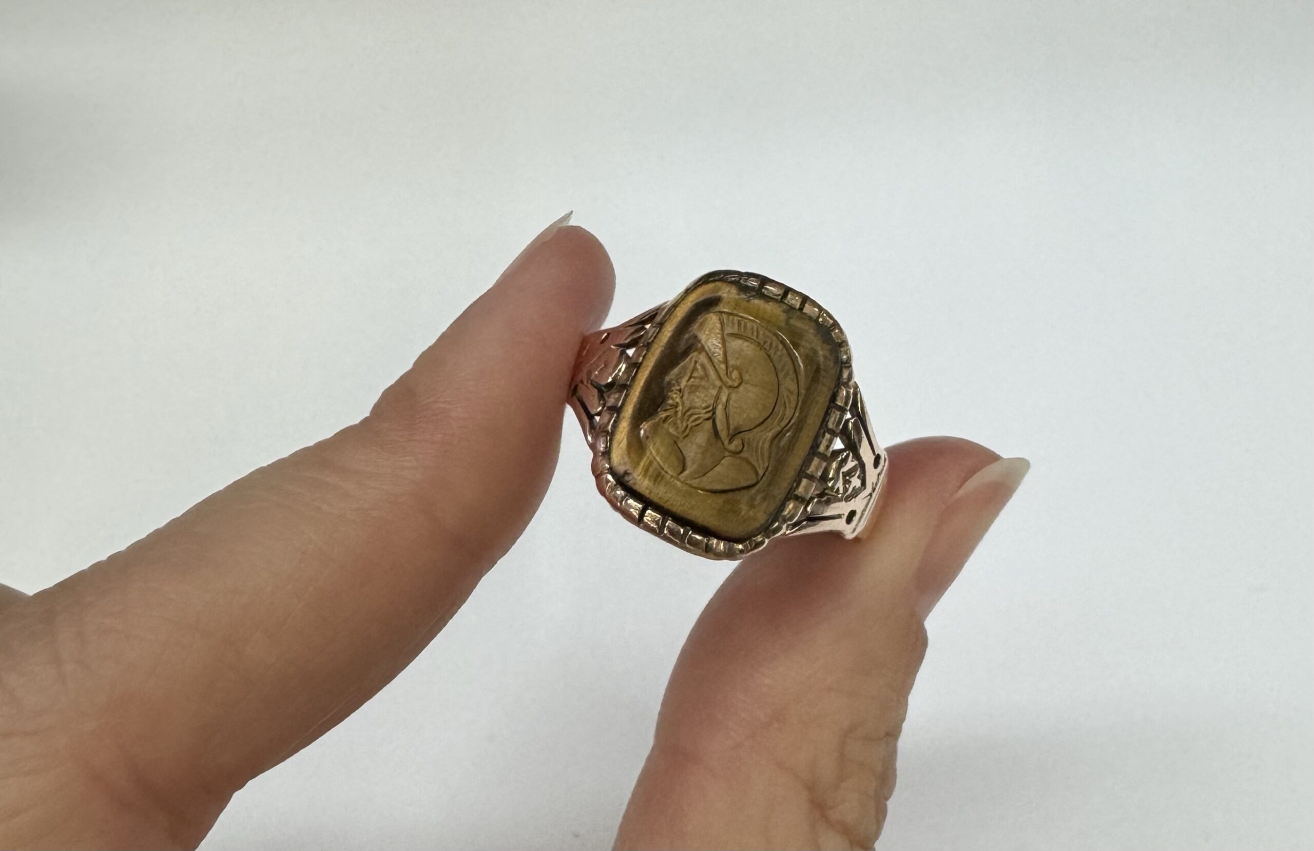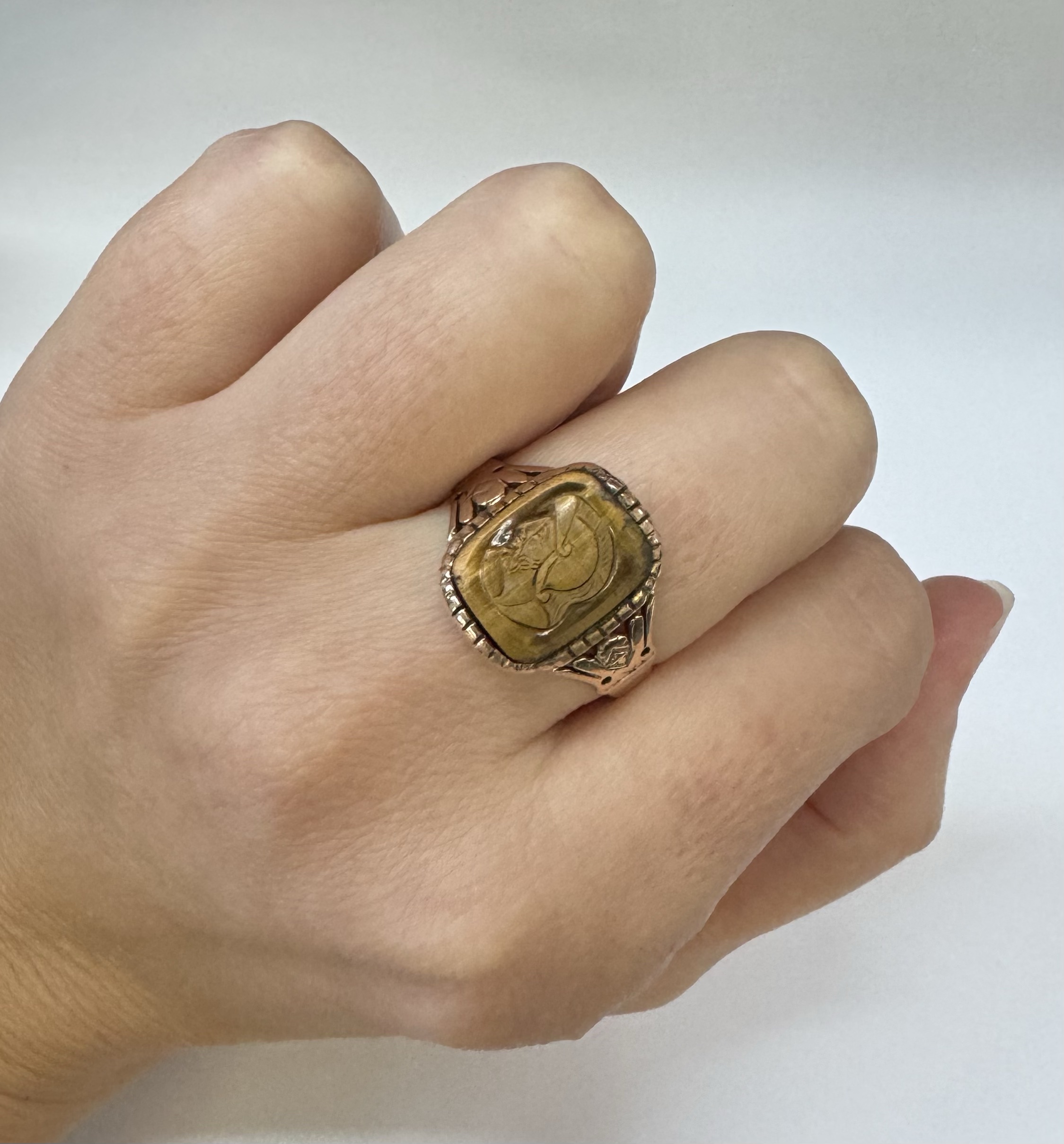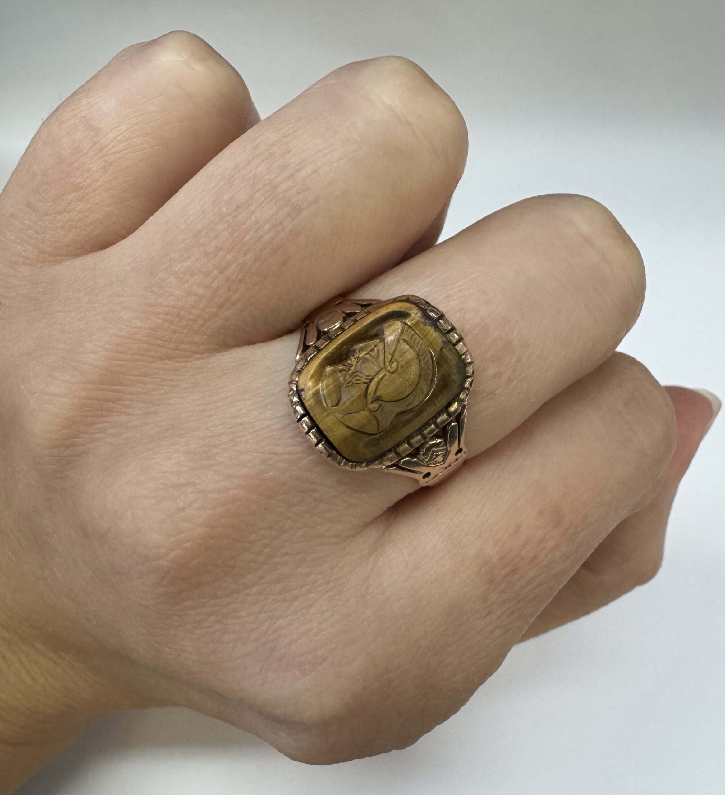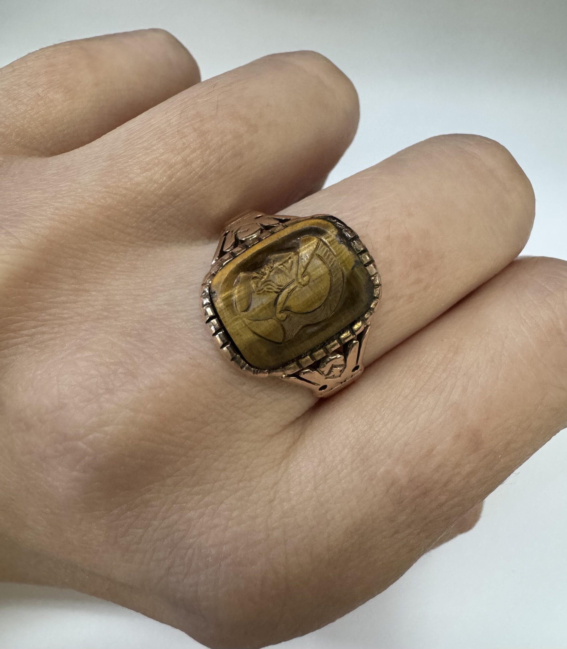 Vintage 14k rose gold genuine carved Tiger’s Eye Intaglio ring, size 13 (can be sized at no charge), 4.62 grams. Please make note of finger size desired in comments section at checkout.