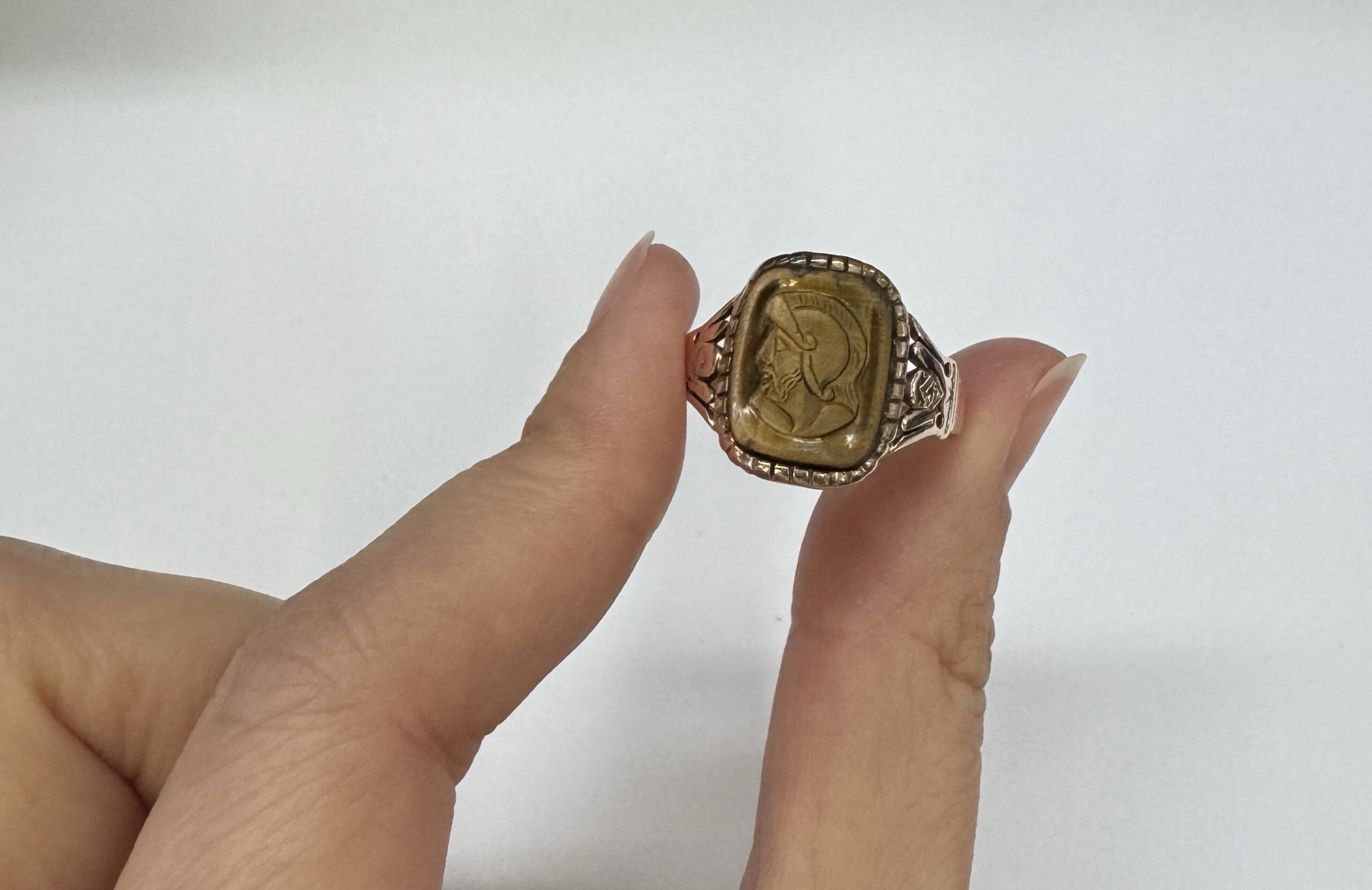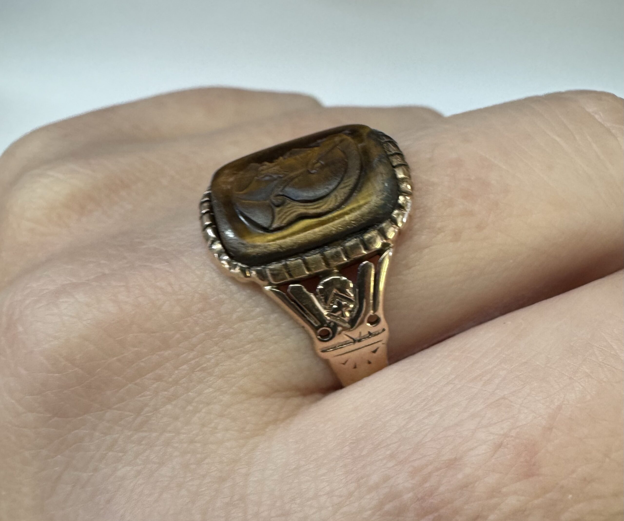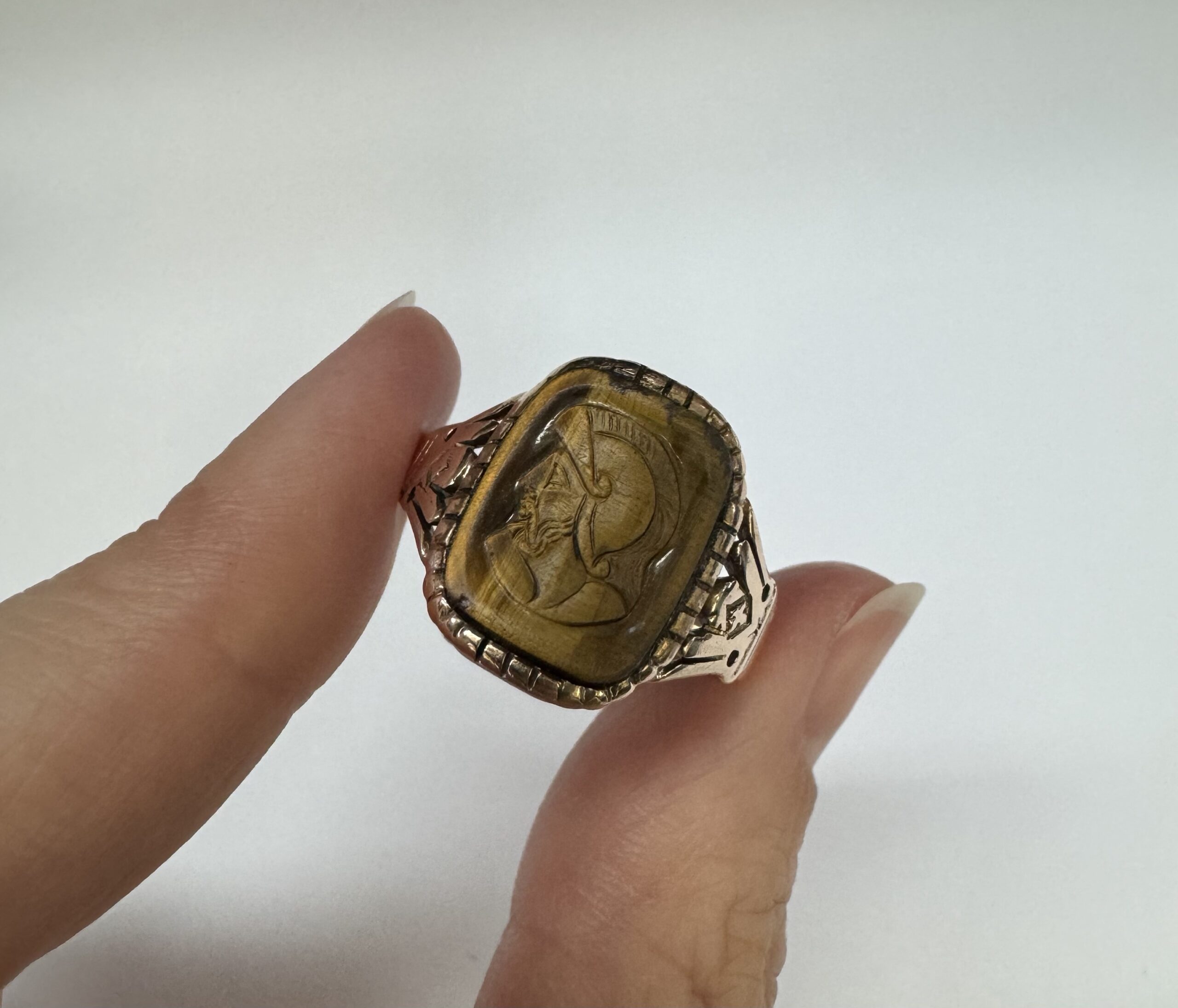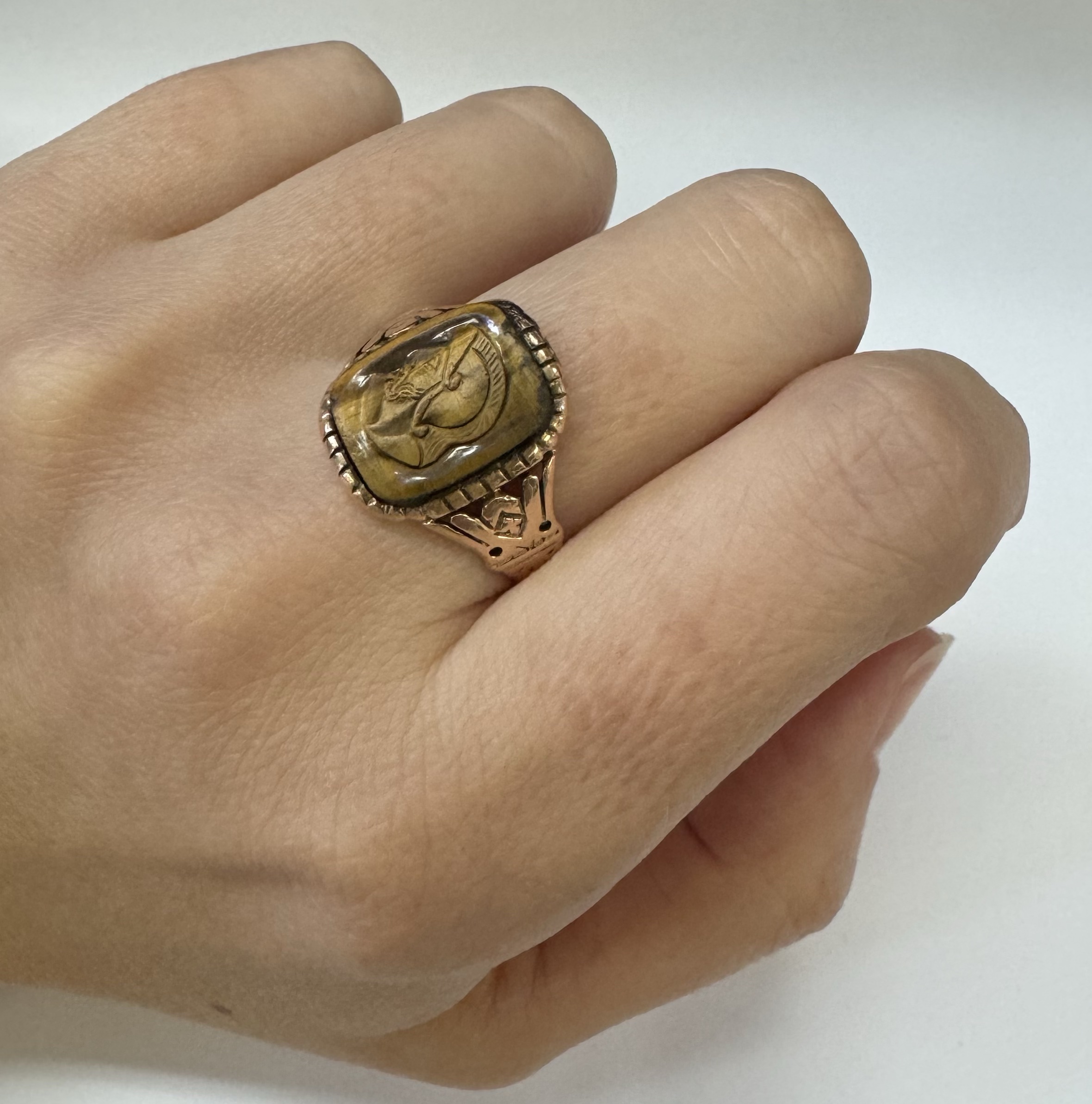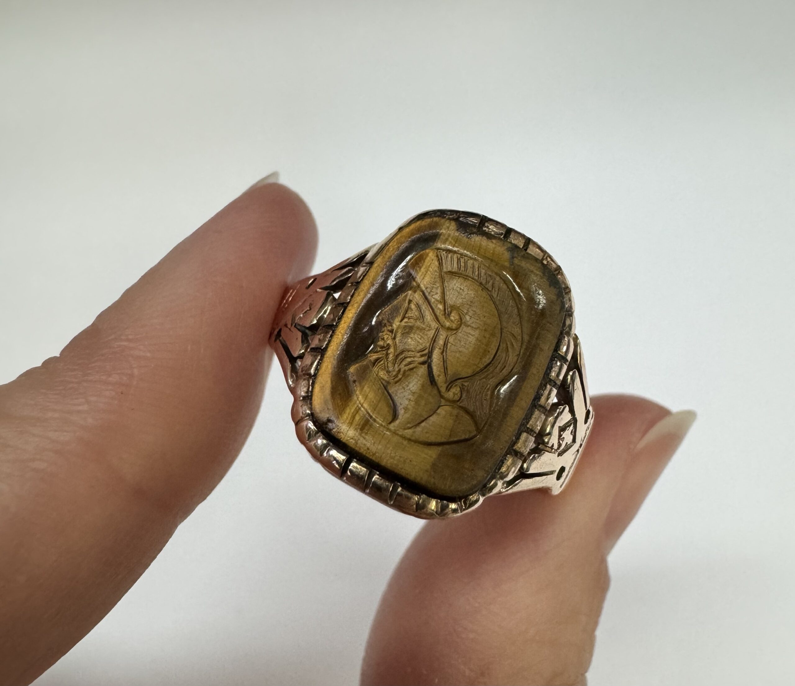 Vintage 14k rose gold genuine carved Tiger’s Eye Intaglio ring, size 13 (can be sized at no charge), 4.62 grams. Please make note of finger size desired in comments section at checkout.