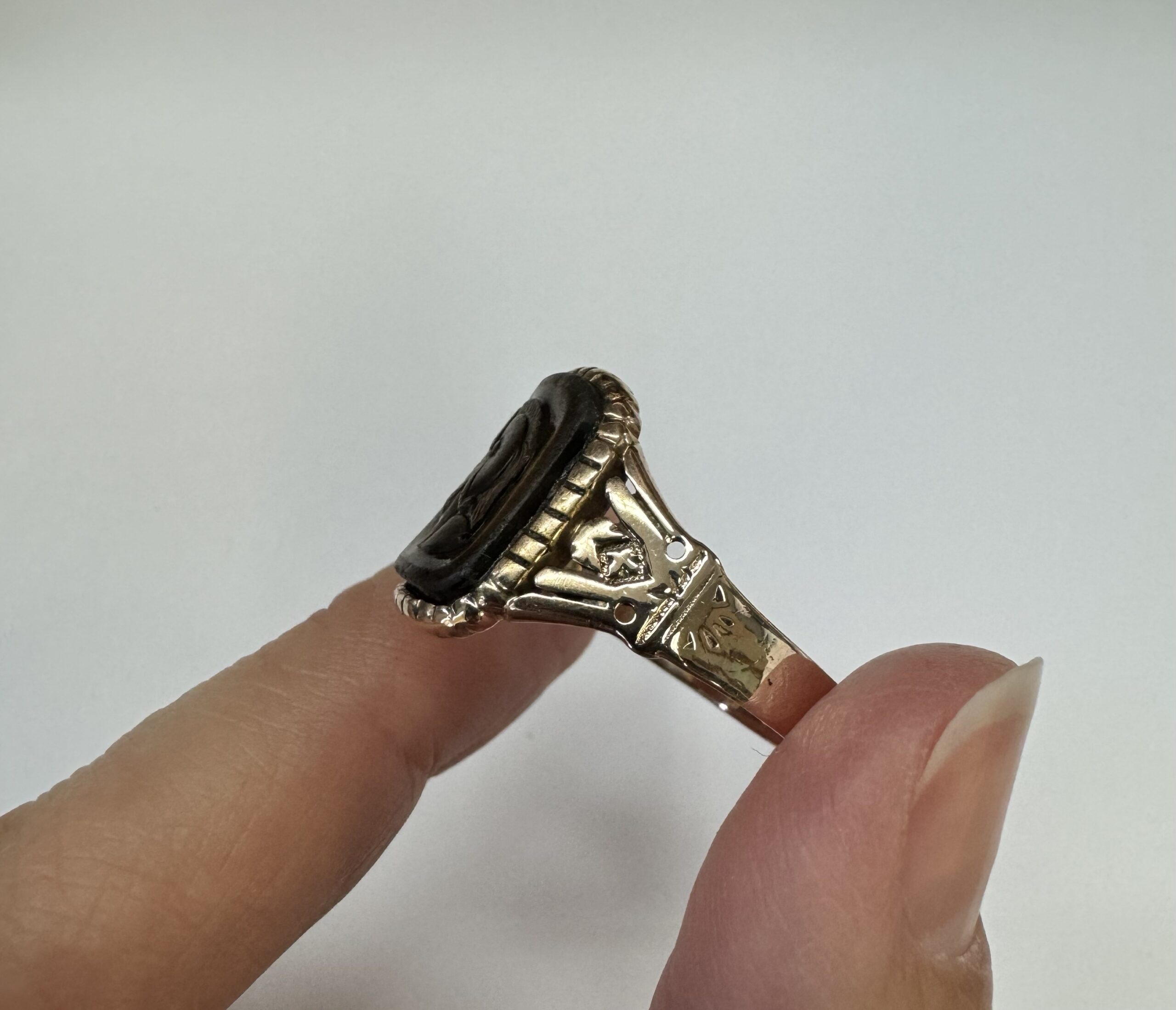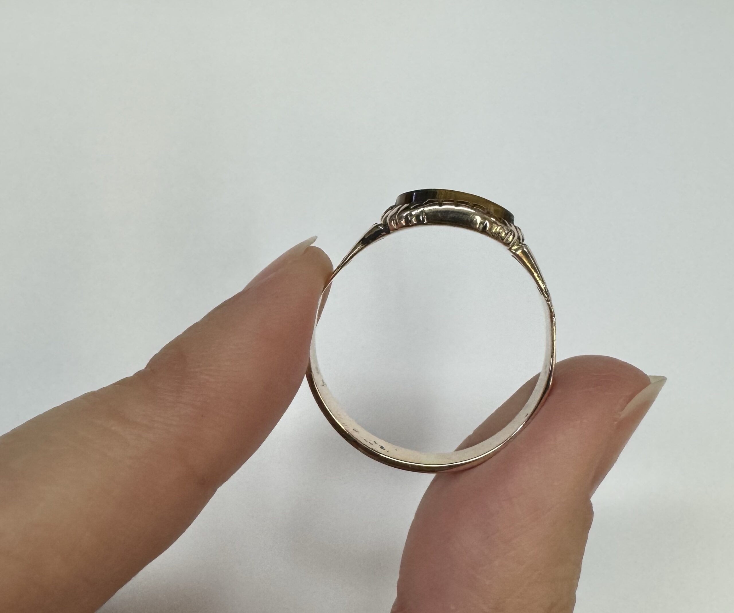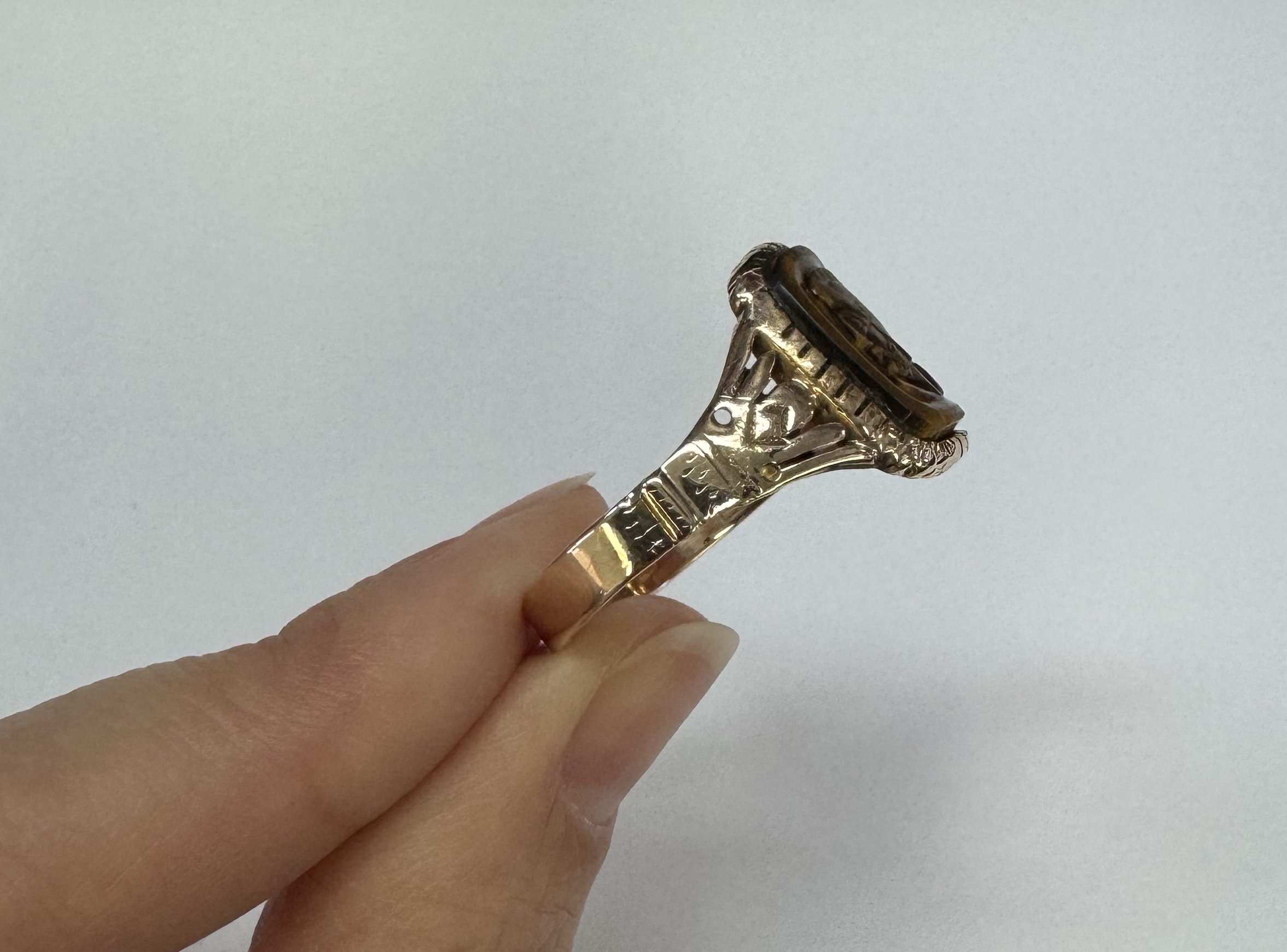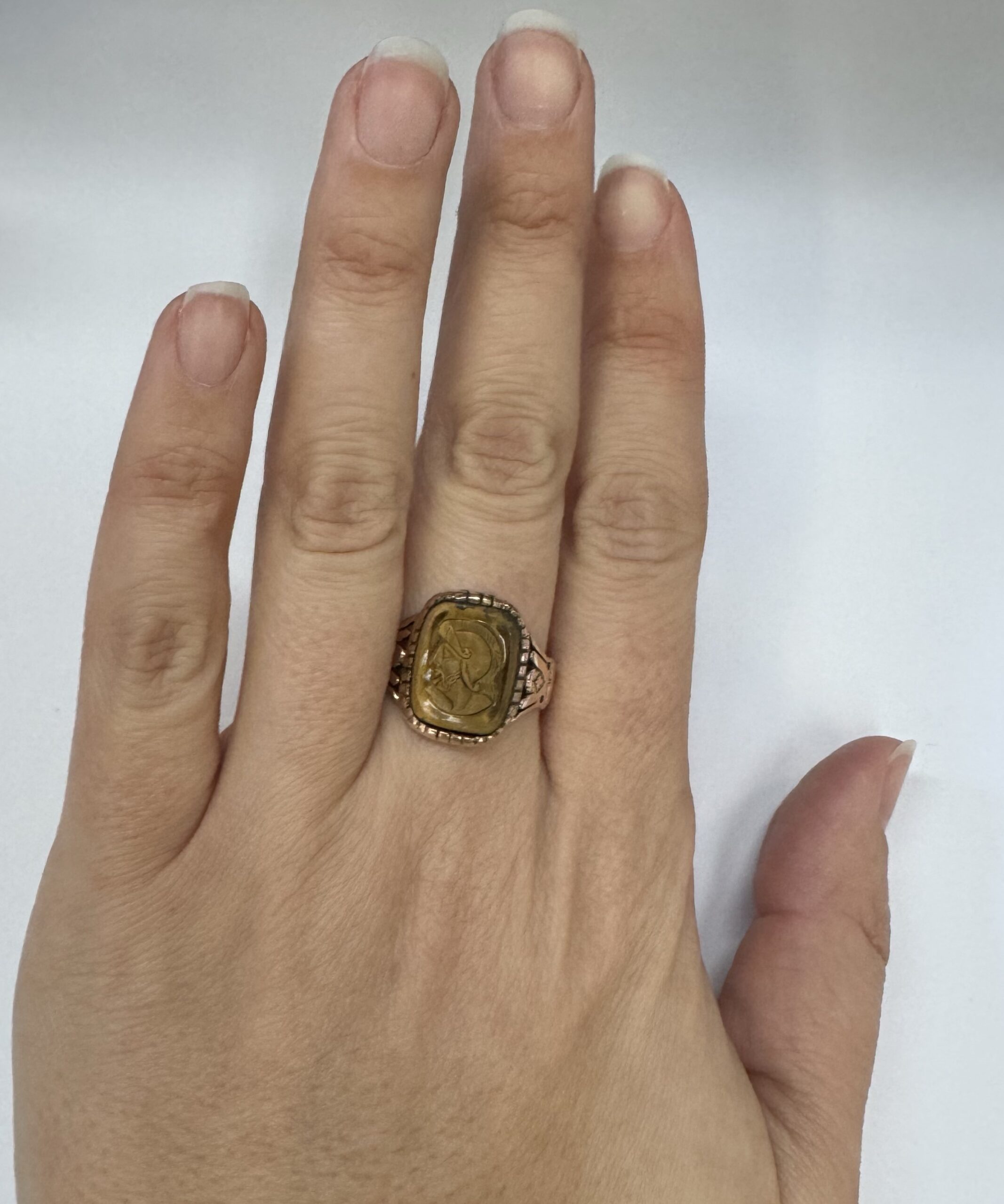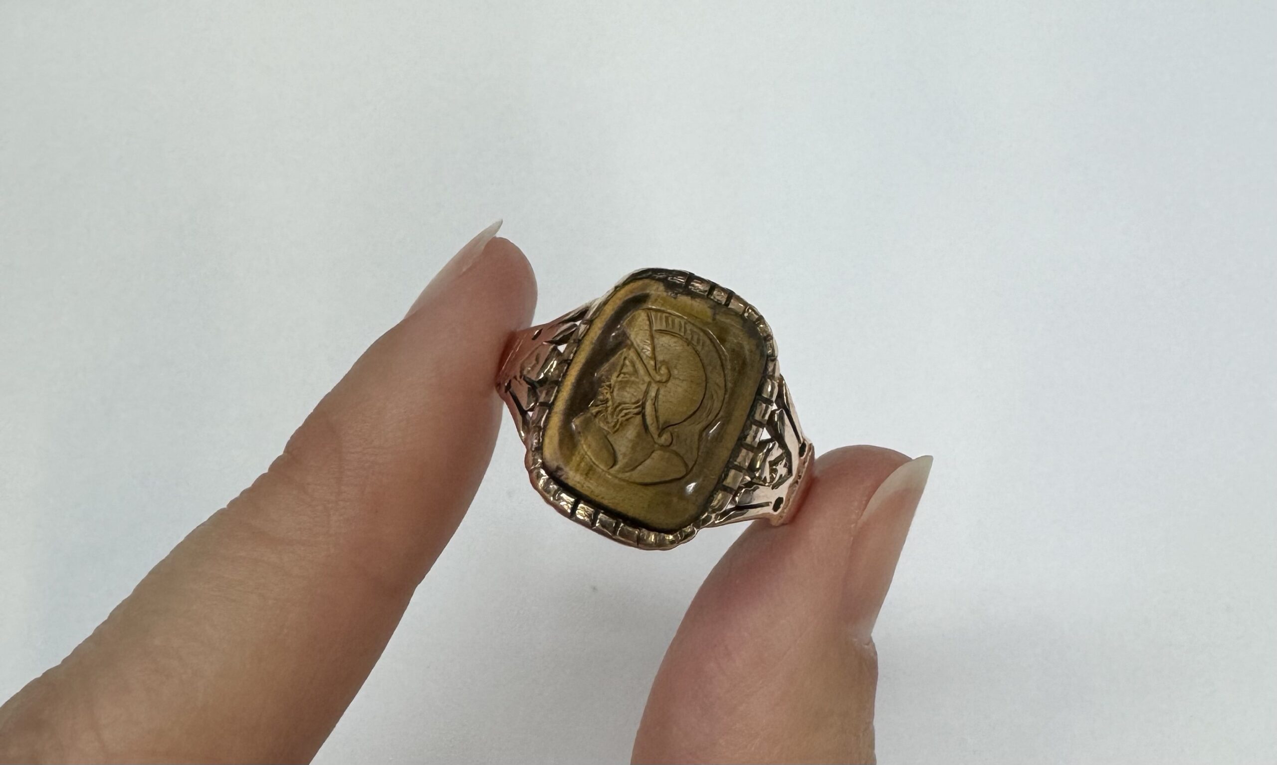 Vintage 14k rose gold genuine carved Tiger’s Eye Intaglio ring, size 13 (can be sized at no charge), 4.62 grams. Please make note of finger size desired in comments section at checkout.