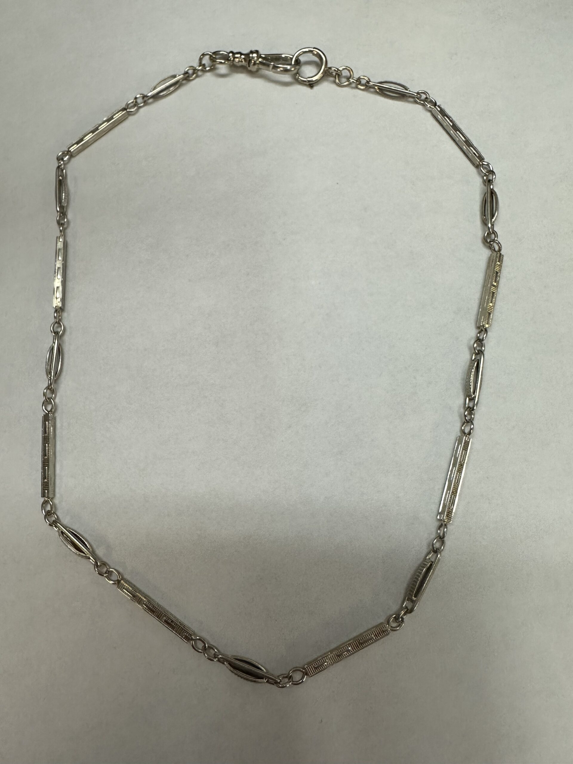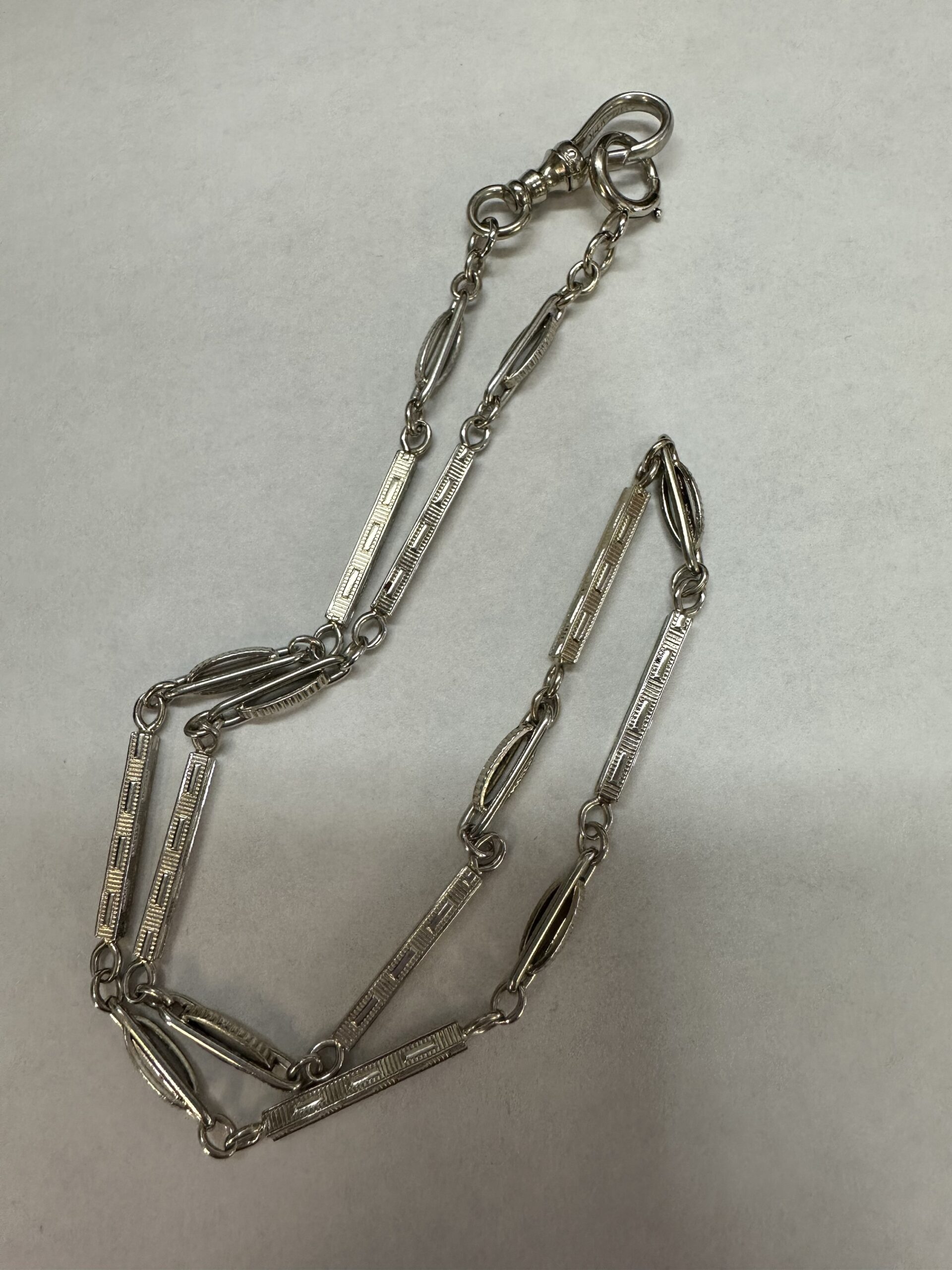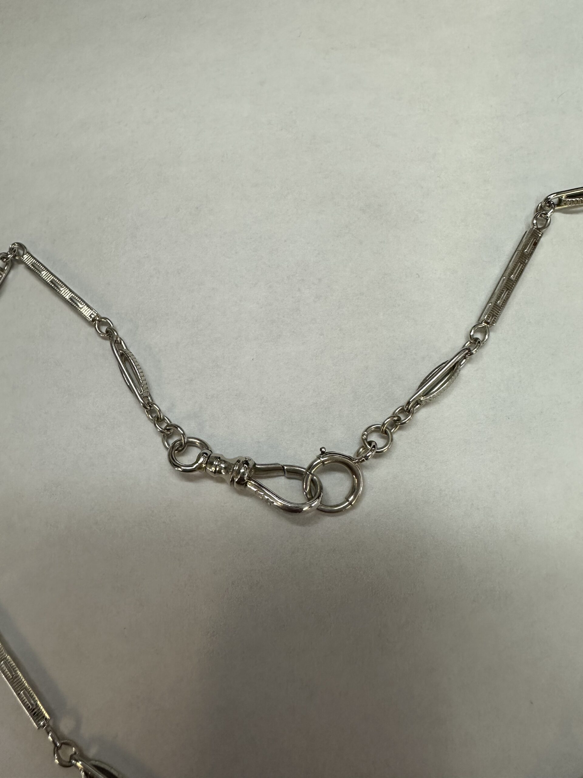 Vintage 14k white gold 14” pocket watch link chain with spring ring clasp and engraving, 10.29 grams.