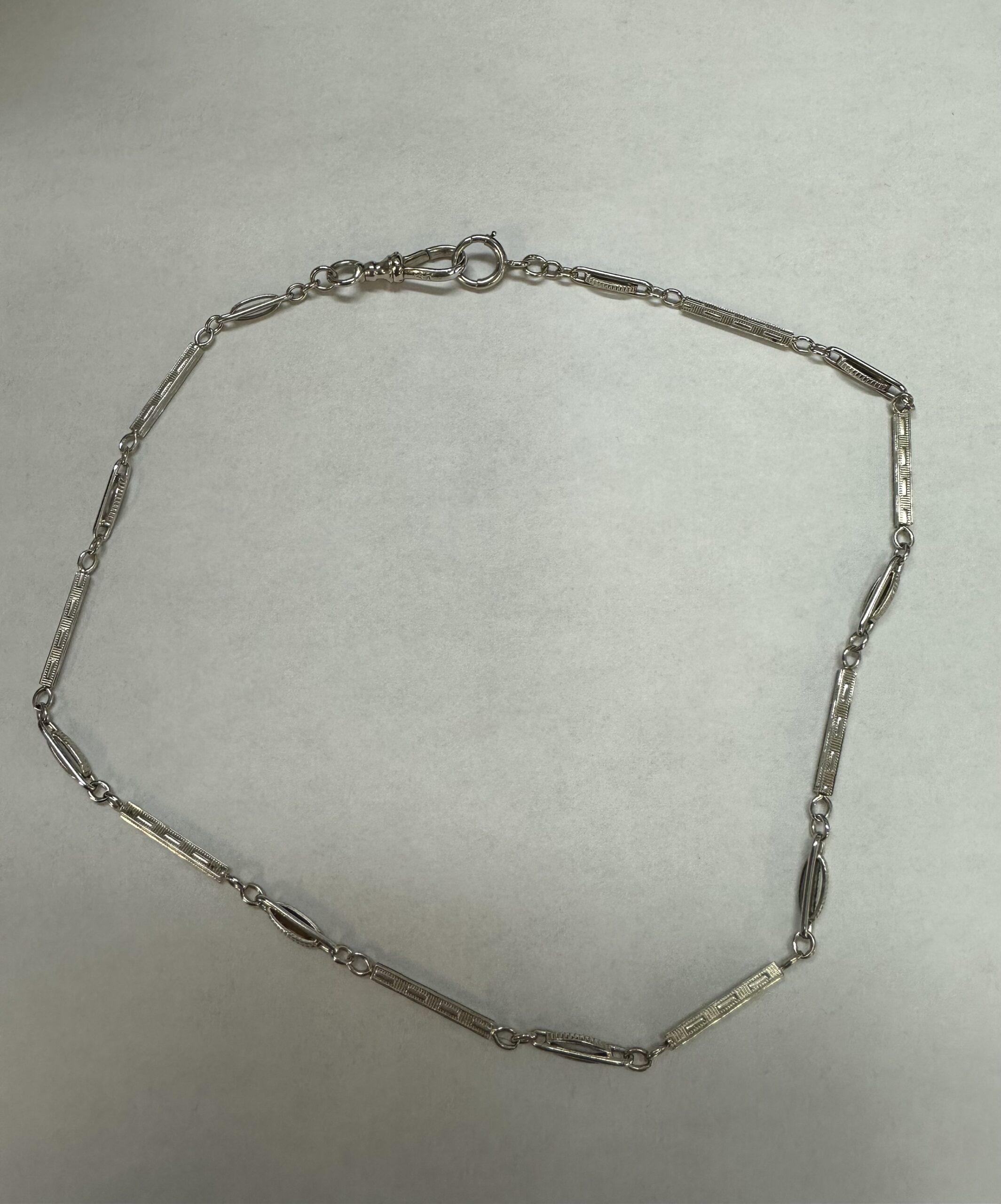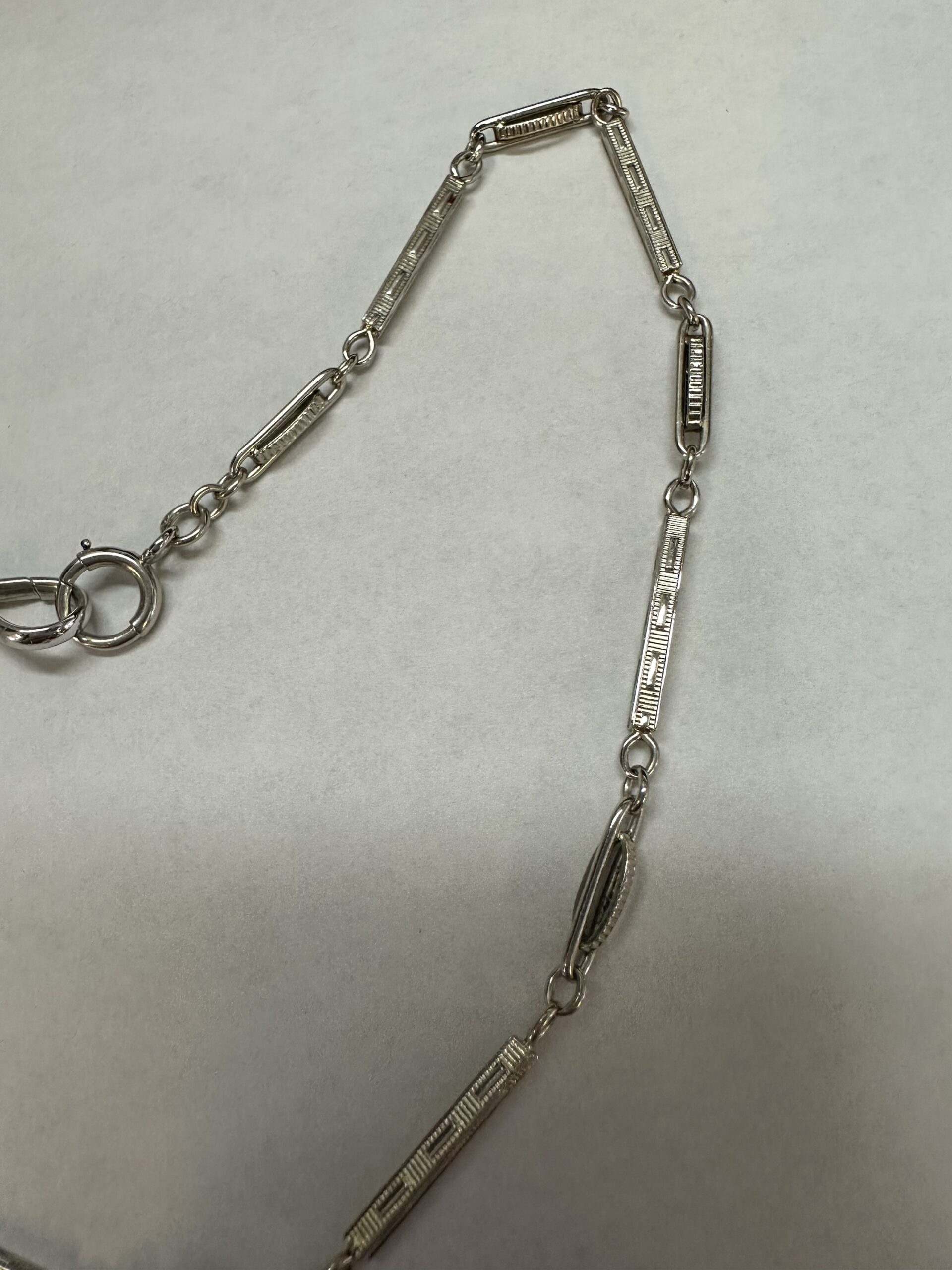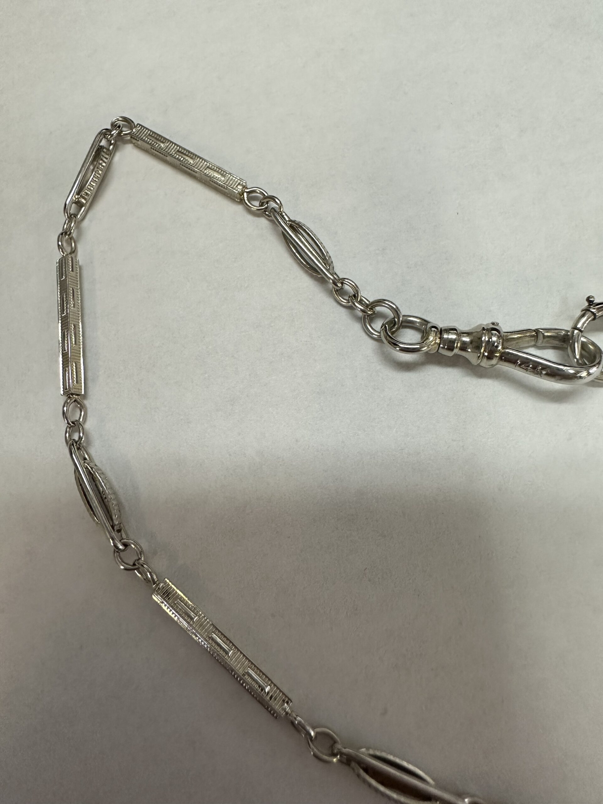 Vintage 14k white gold 14” pocket watch link chain with spring ring clasp and engraving, 10.29 grams.